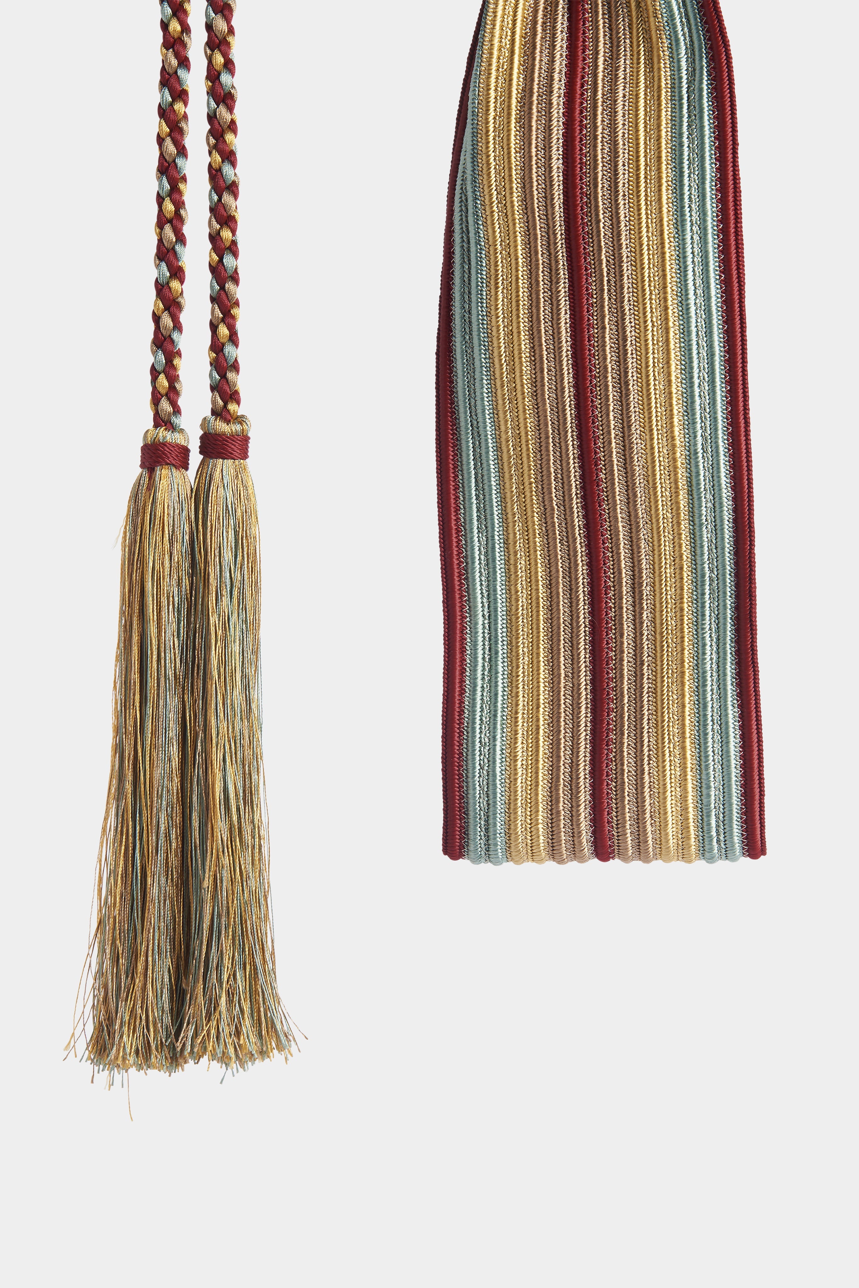 • Decorative waist sash crafted in multicolor woven fabric with intricate braided detailing. Features long tasselled cords for adjustable styling and an artisanal, bohemian flair.