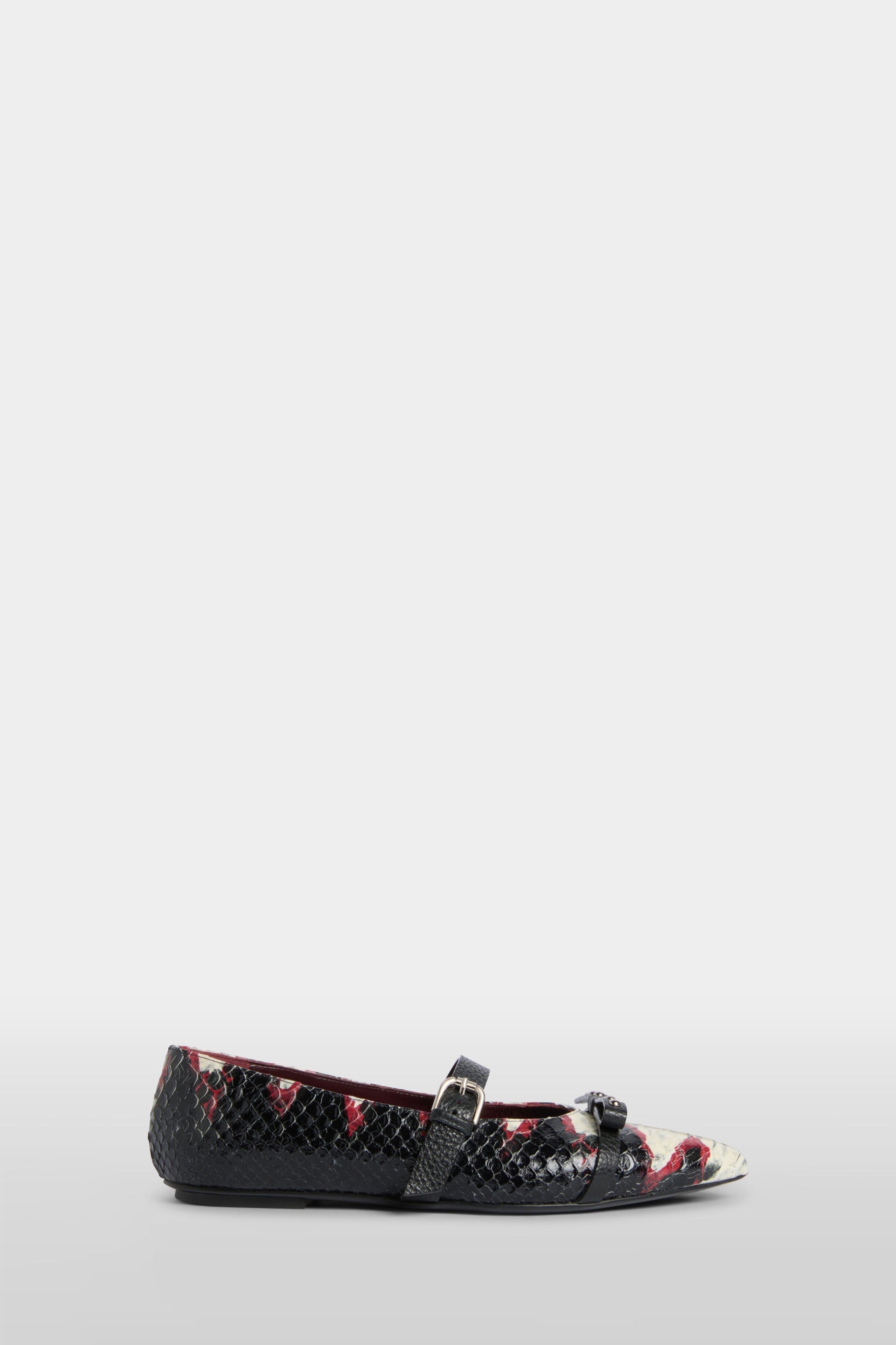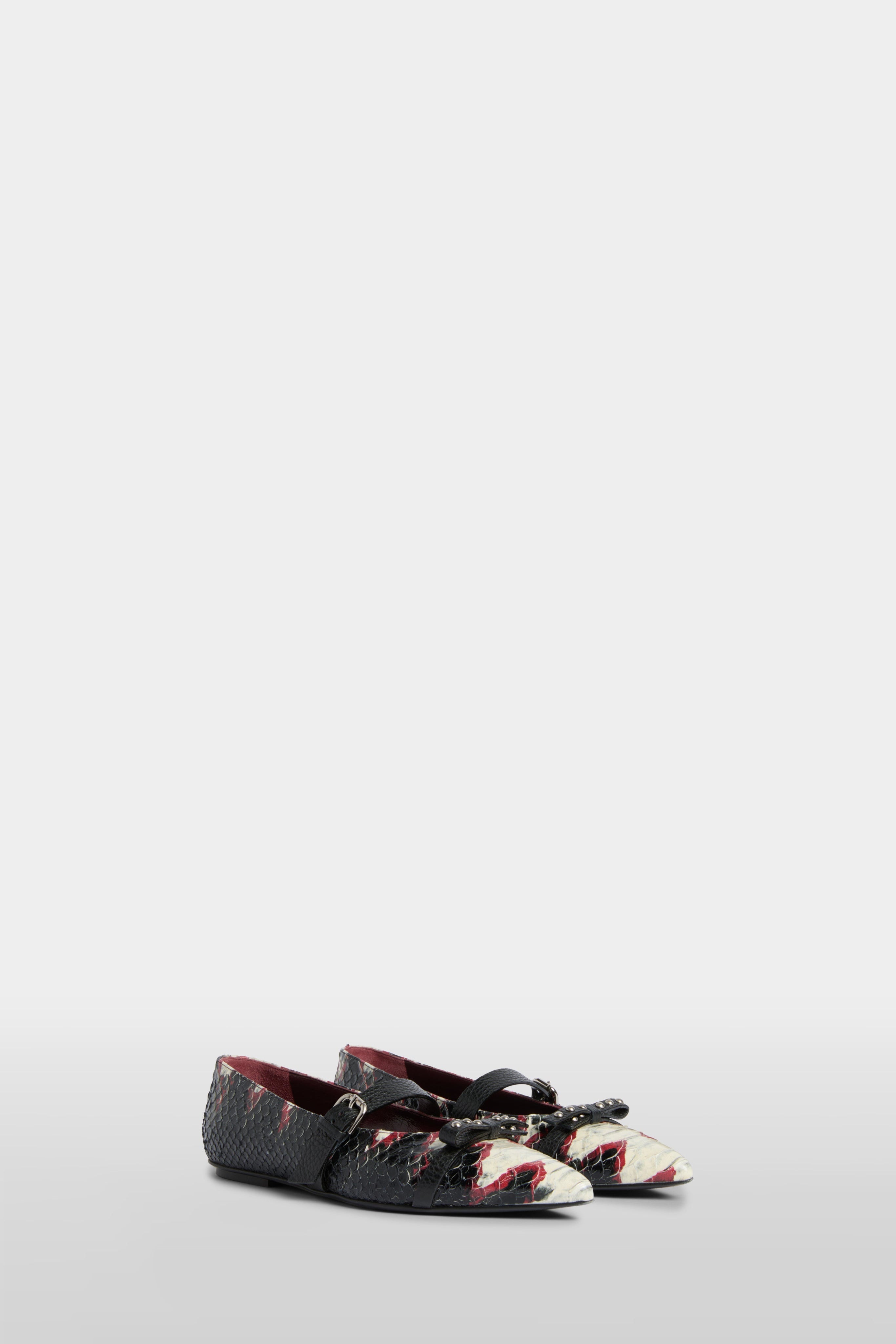 Pointed-toe ballerina shoes in python-effect leather, with a black, ivory, and bordeaux pattern. Two textured-leather straps, one studded and one with an adjustable buckle, secure the foot and add attitude. Finished with a leather lining and flat sole, they deliver day-to-night comfort with a sharp, modern edge.
