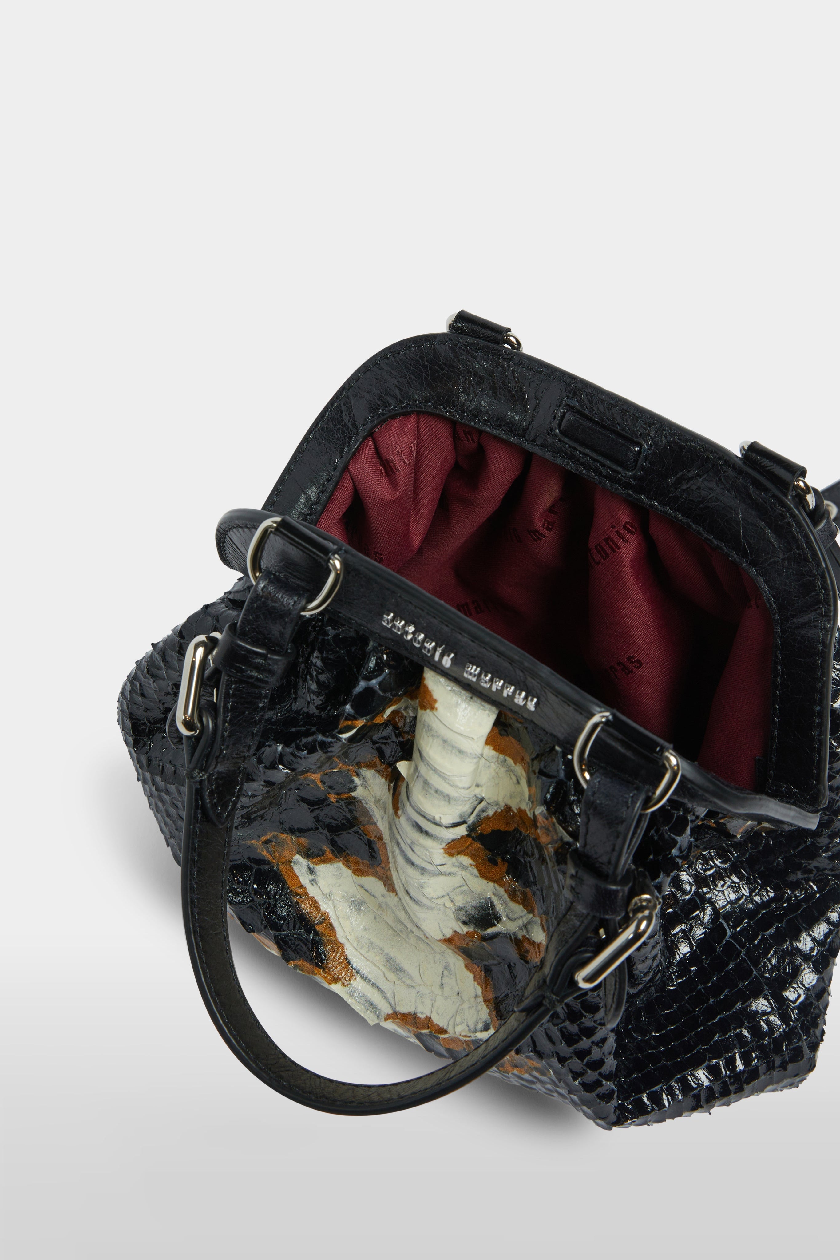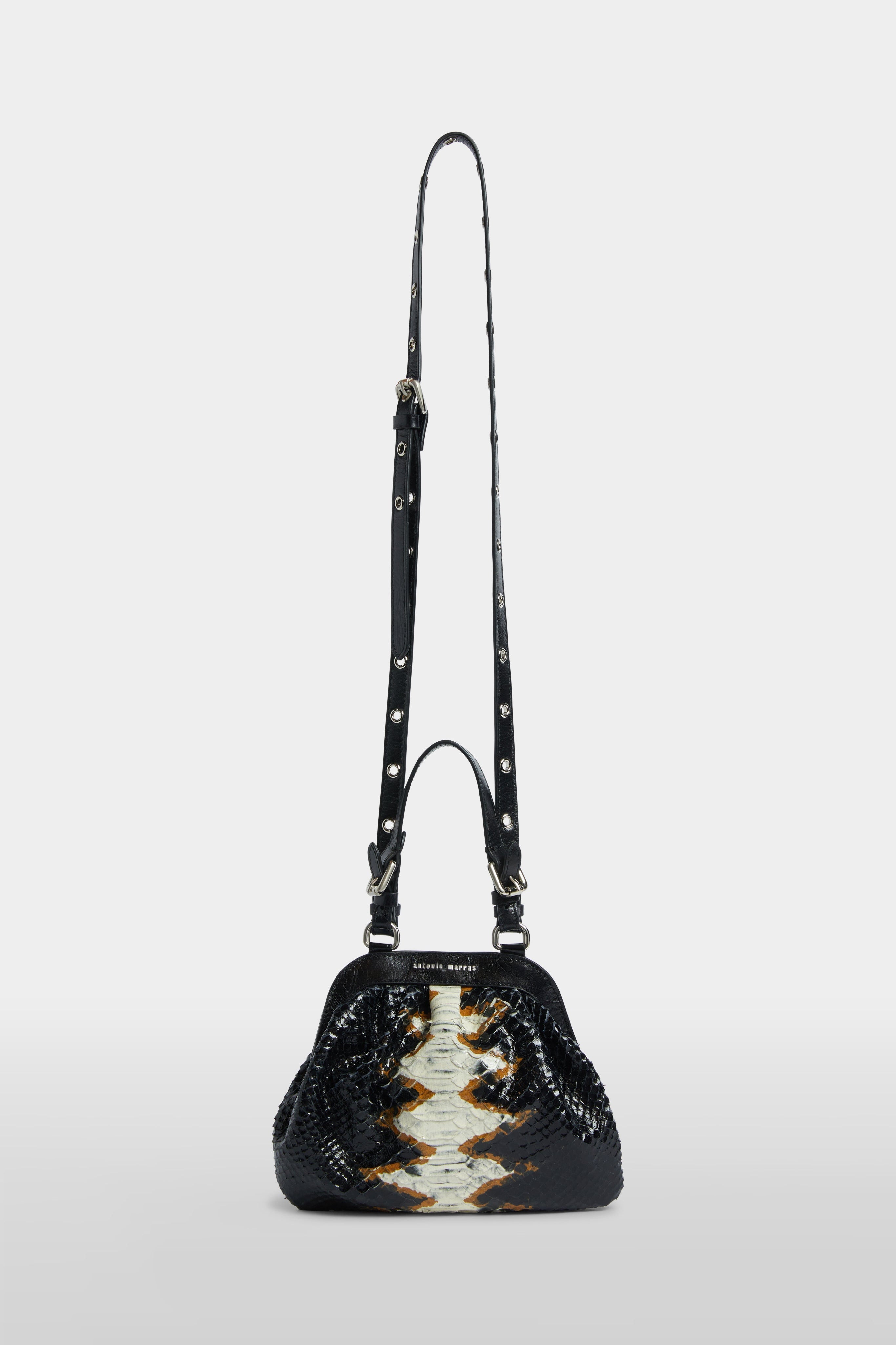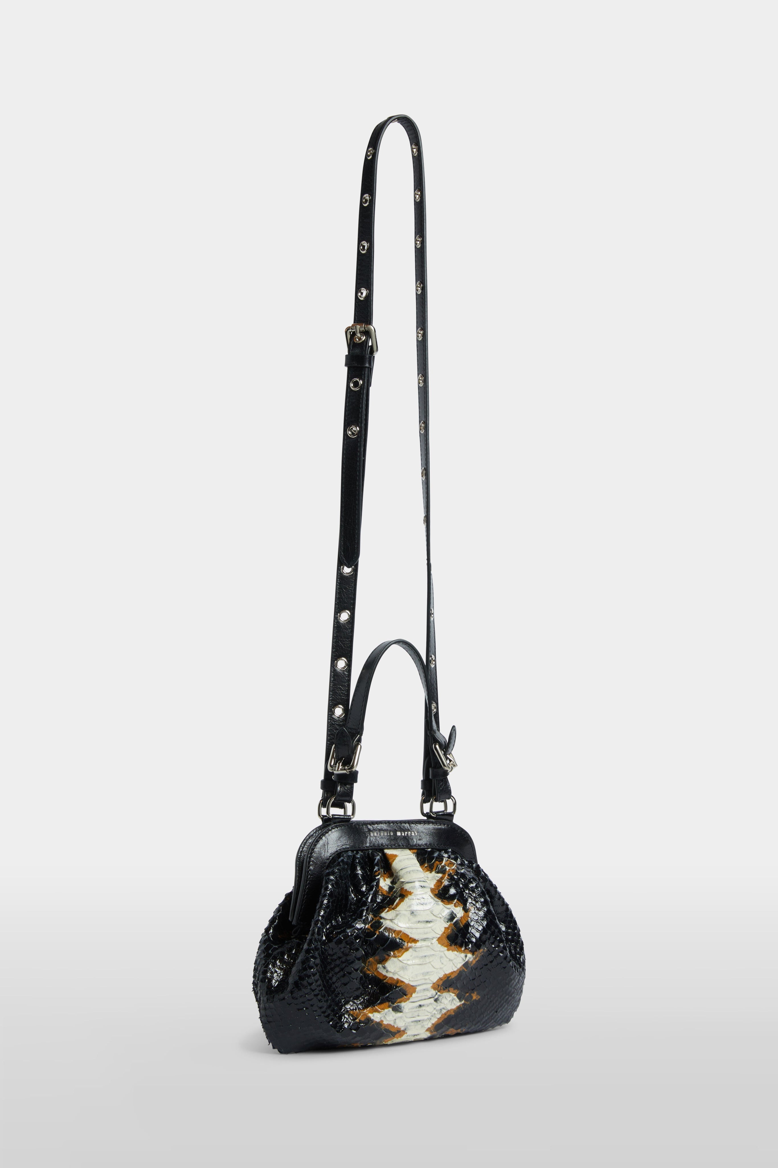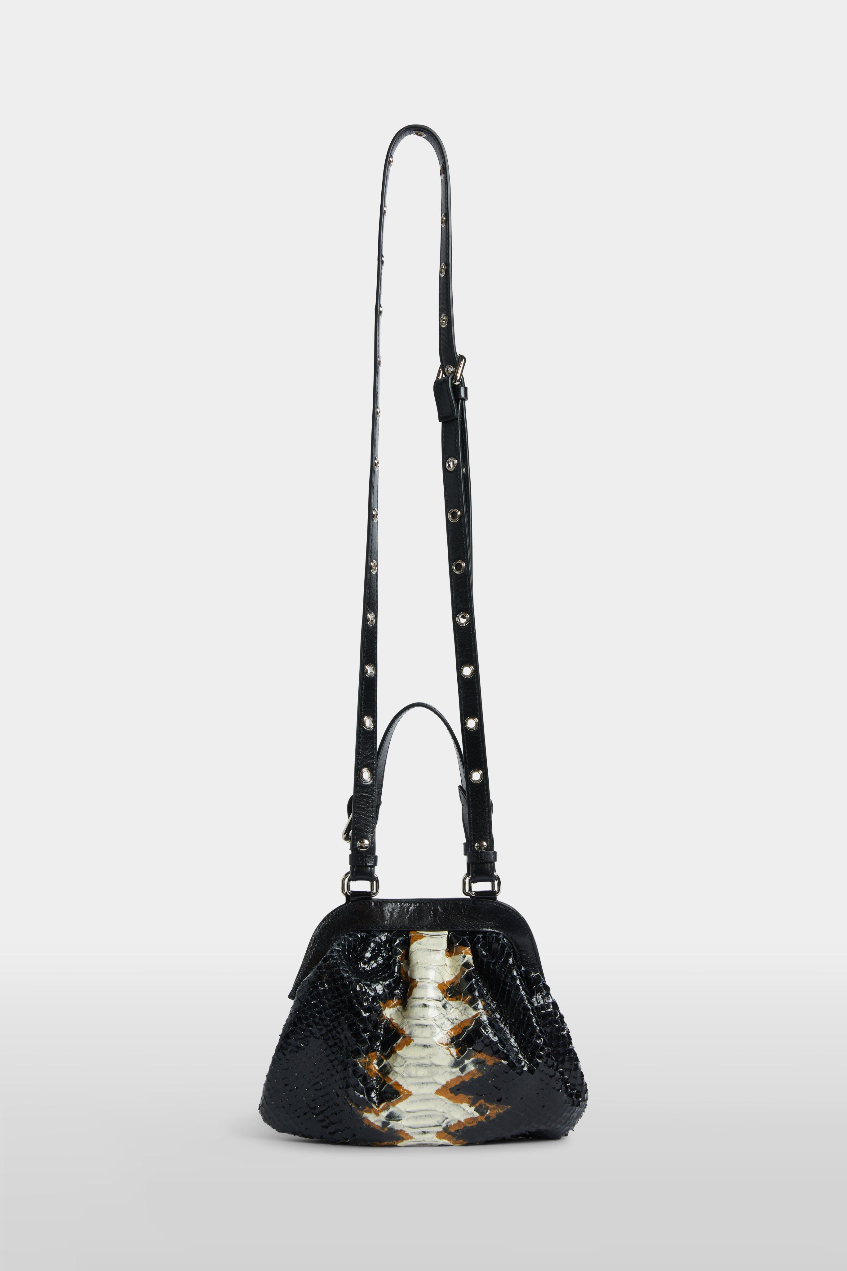 The Rosalia Bag is a luxury mini bag crafted in glossy python-effect leather with bold contrasting patterns. Designed with top handles and an adjustable shoulder strap, it doubles as a chic shoulder bag. A statement accessory that elevates any look with elegance and edge.