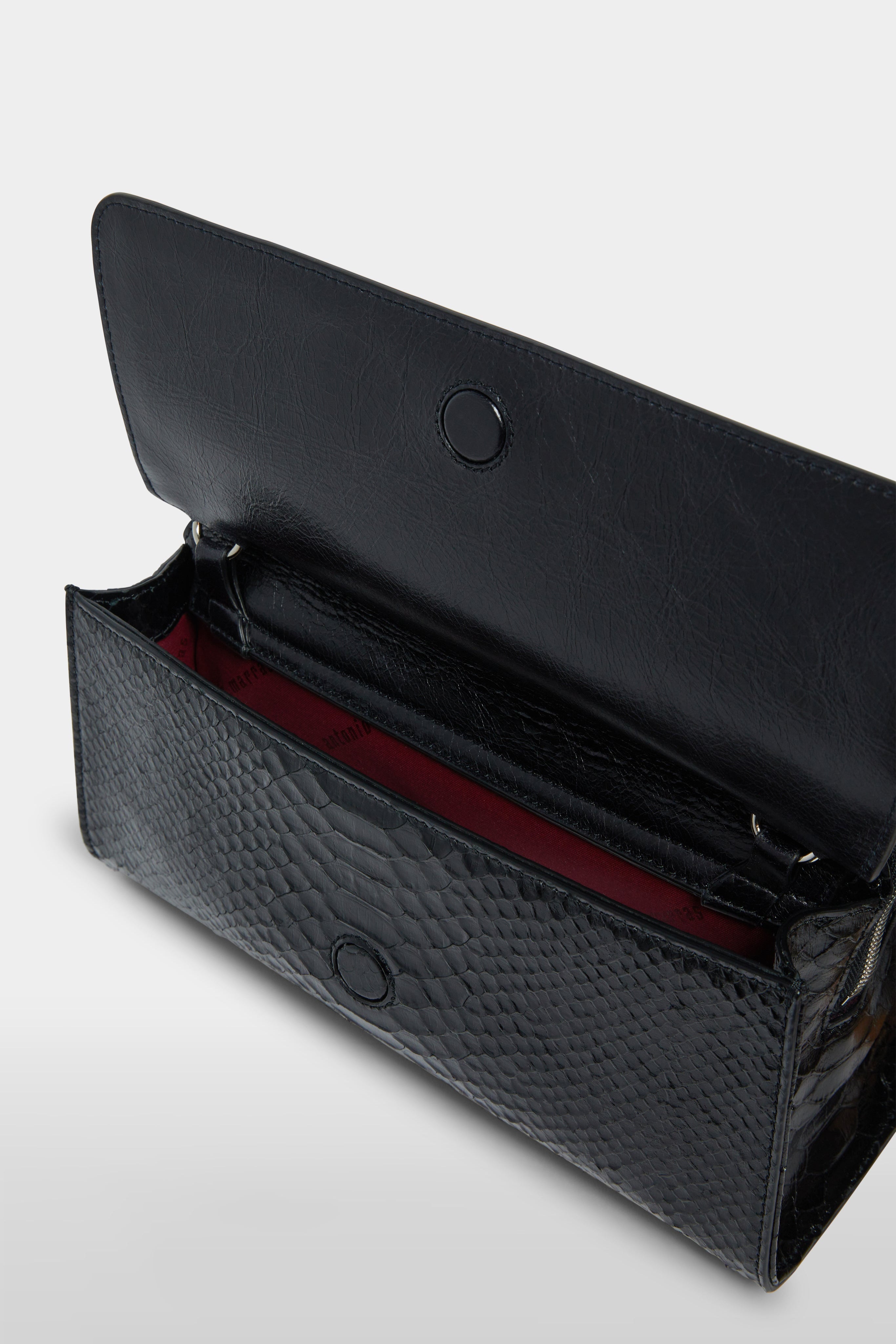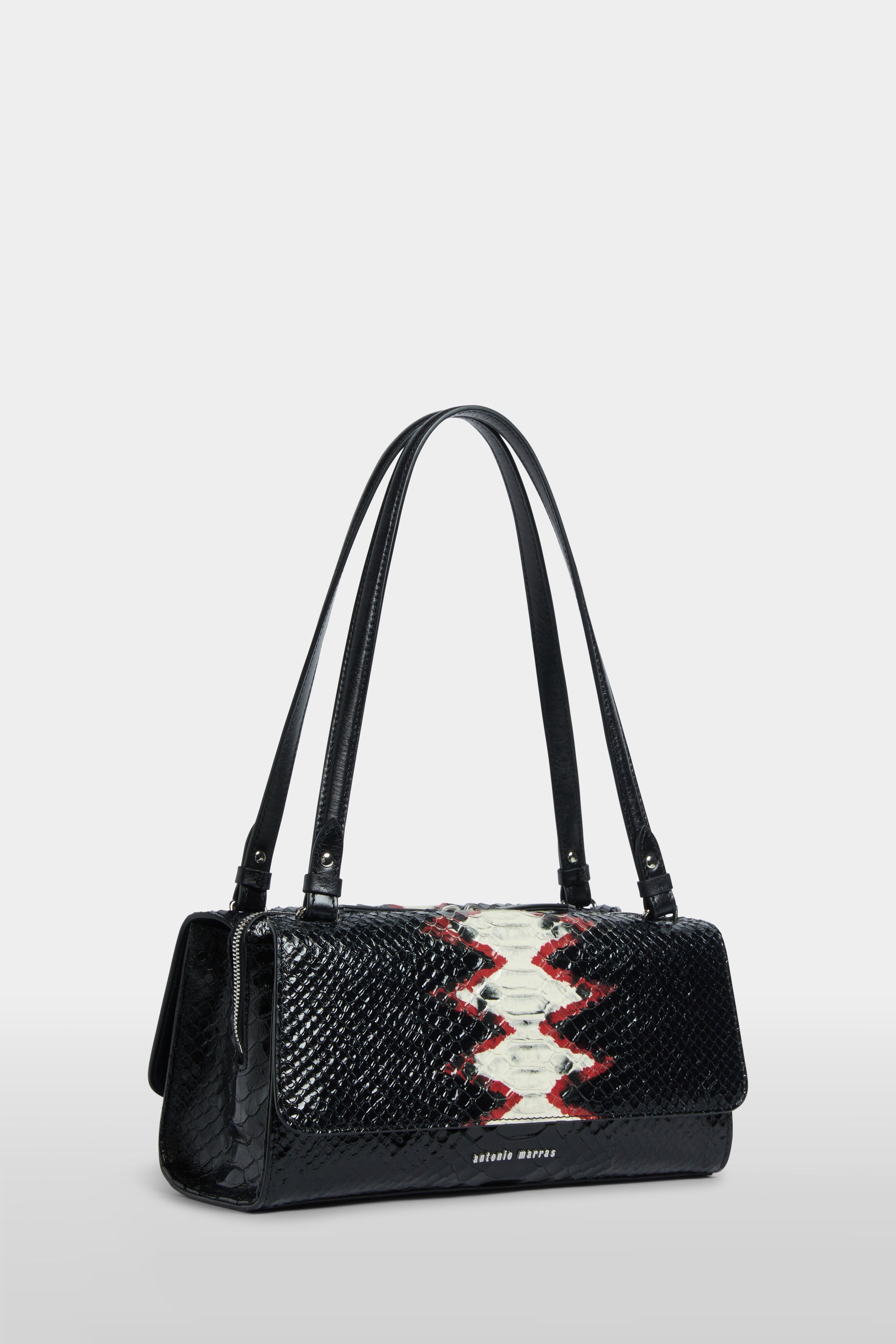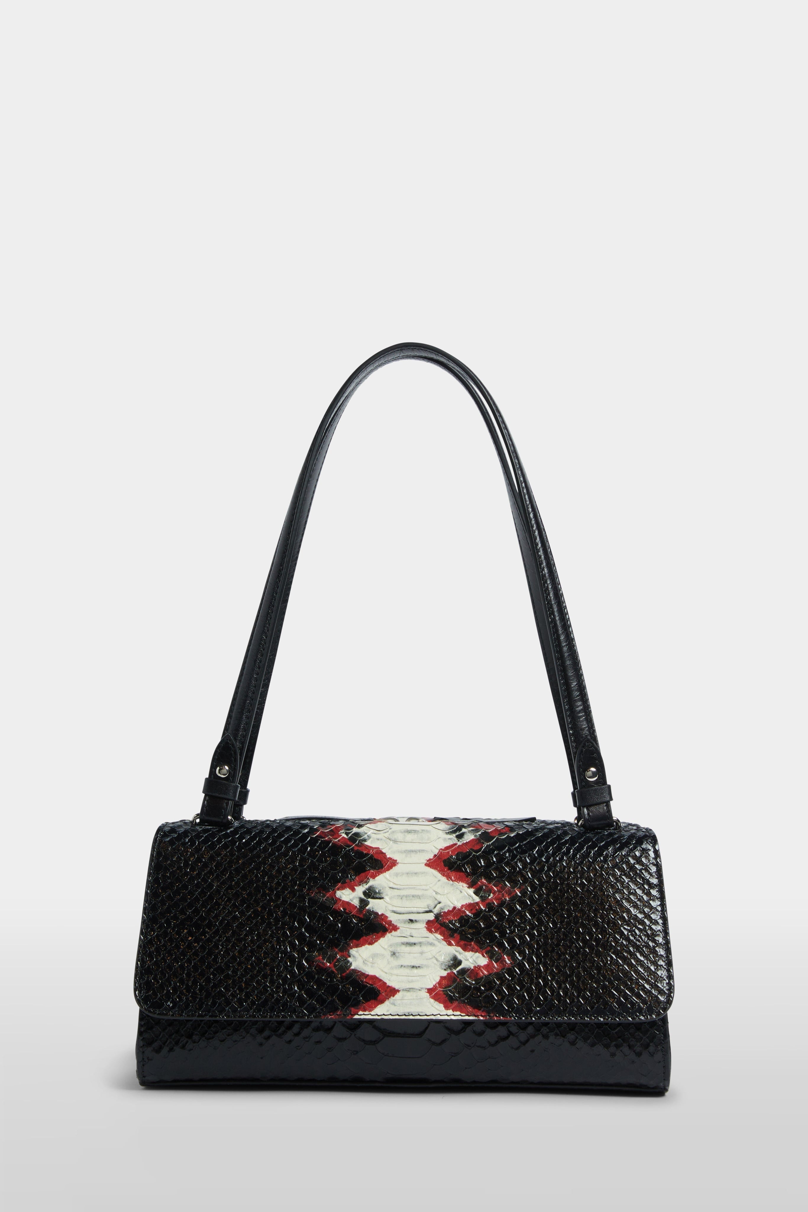 Elegant shoulder bag in glossy black leather with a python-effect texture, featuring a bold central motif in red and ivory. Designed with a structured silhouette, flap closure, and dual handles for versatile styling. A refined accessory that adds statement character to any look.
