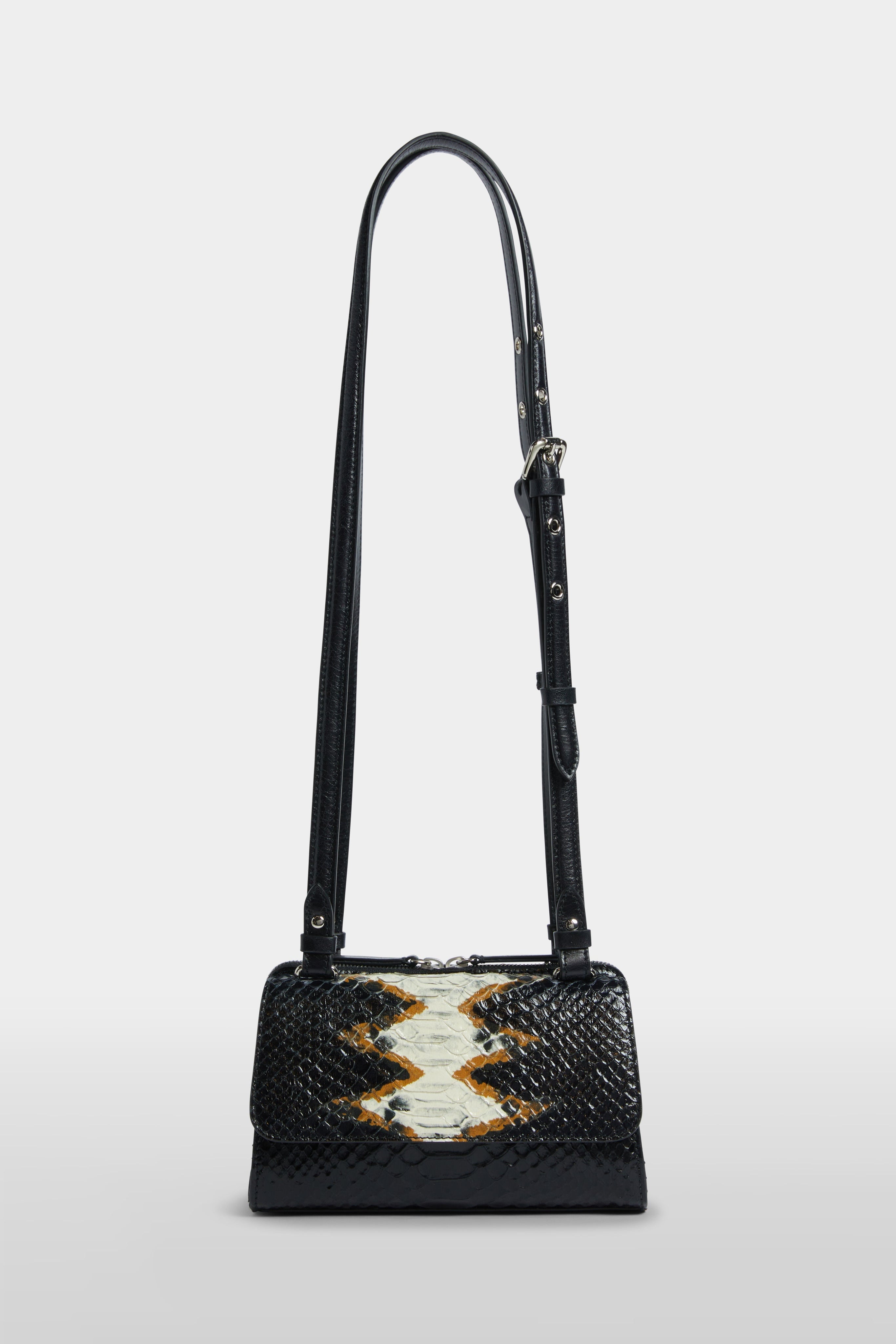 Elegant shoulder bag in glossy black leather with a python-effect texture, featuring a bold central motif in amber and ivory. Designed with a structured silhouette, flap closure, and dual handles for versatile styling. A refined accessory that adds statement character to any look.