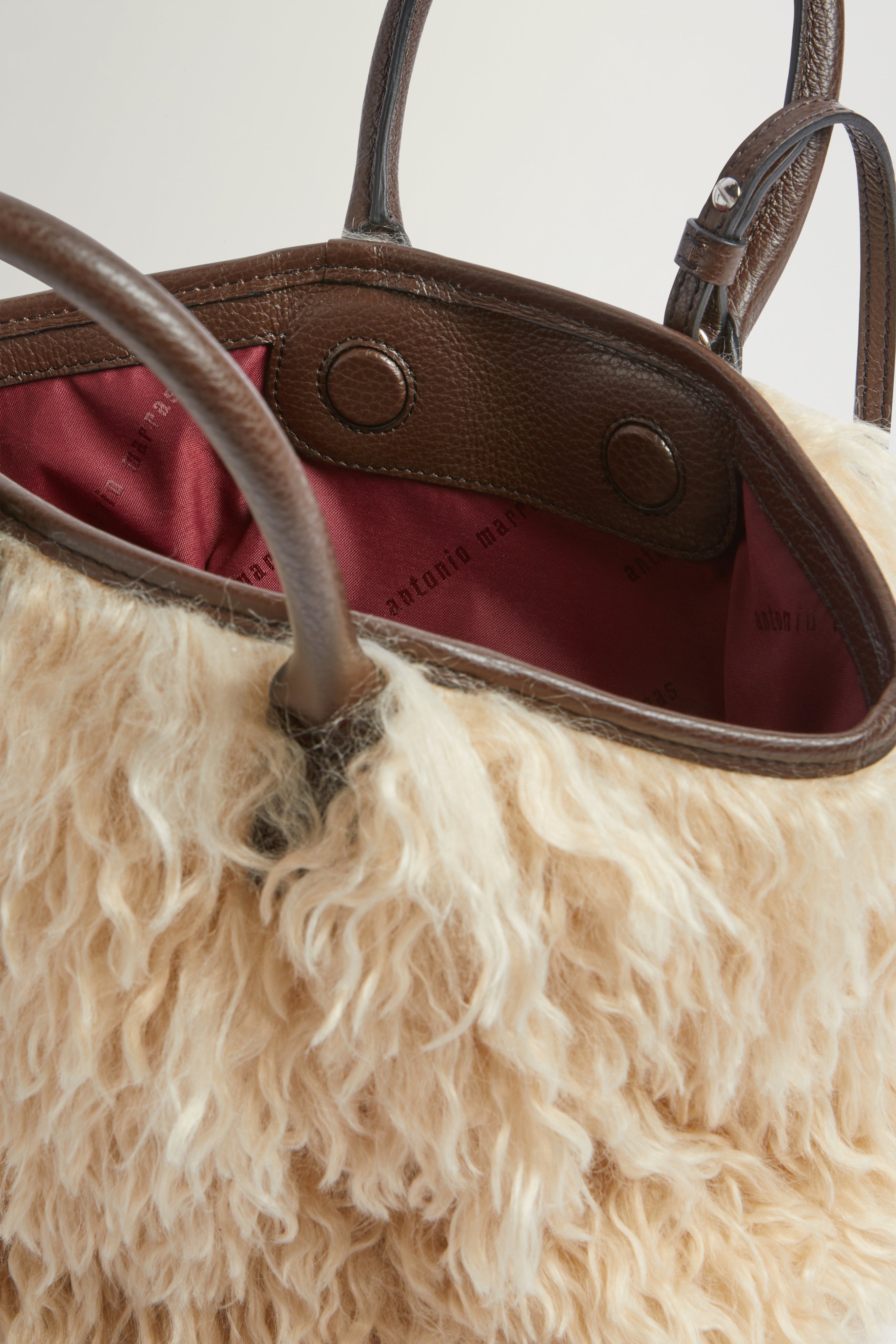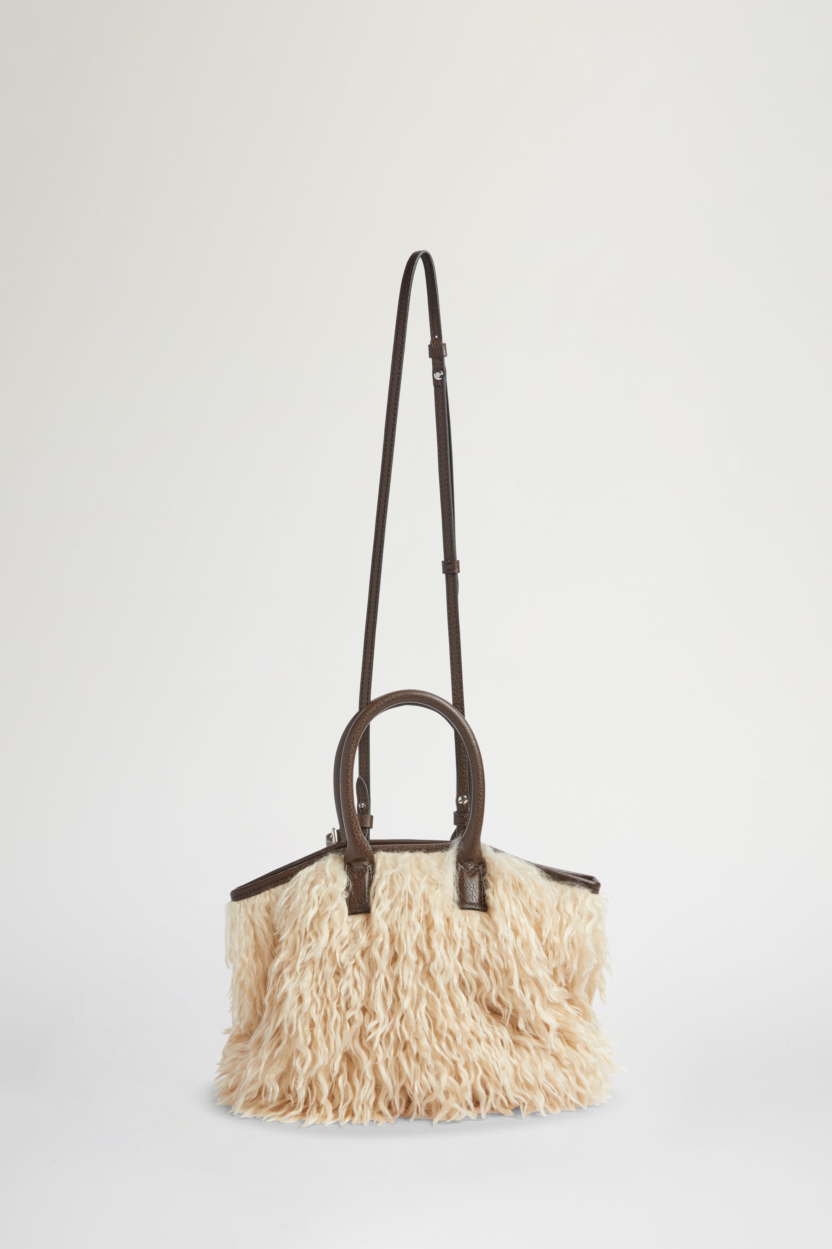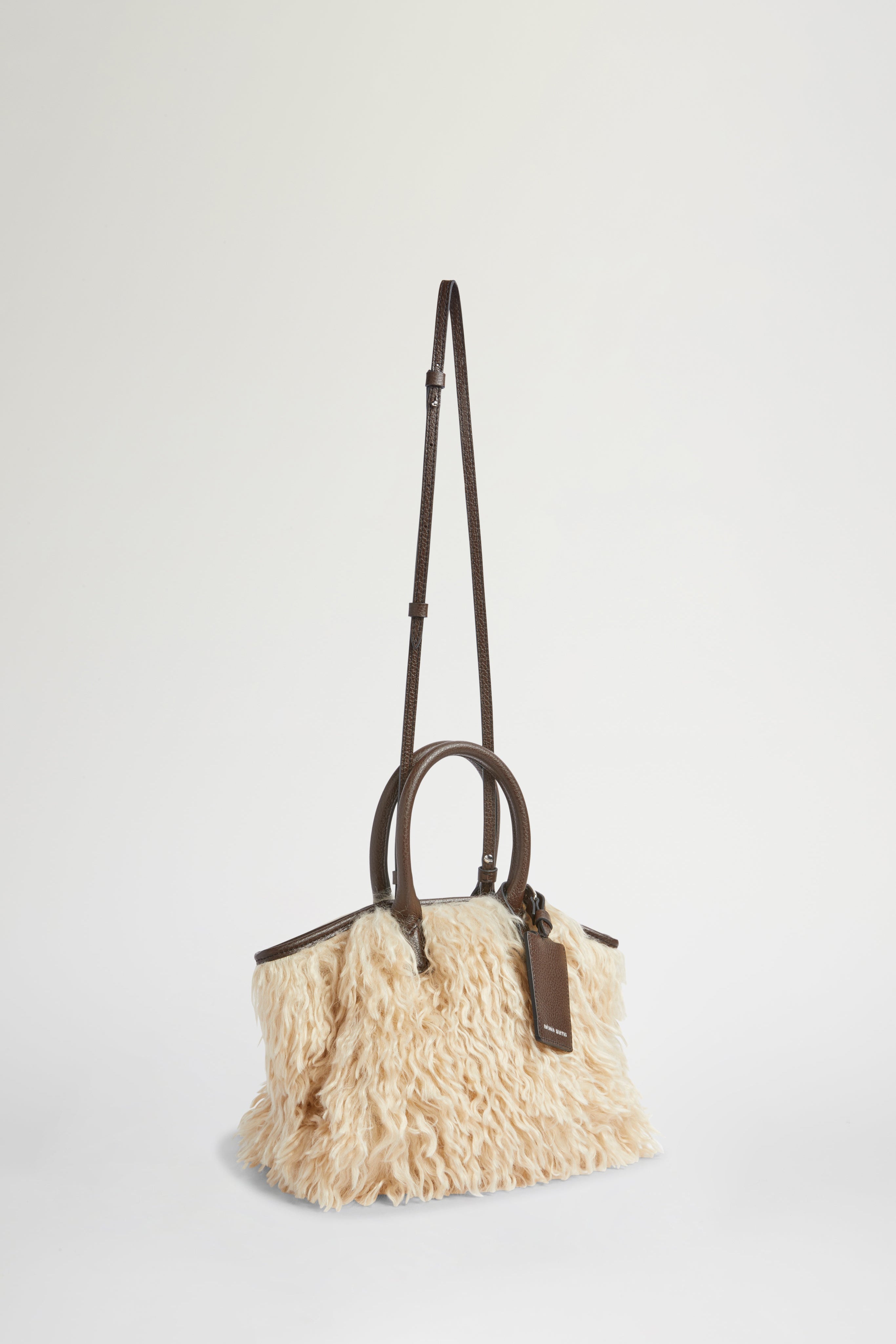 The Alma Mini bag blends refined design with artisanal detail. Made from soft beige eco fur with a contrasting dark brown leather handles and trim. Features a detachable strap and signature branded tag.