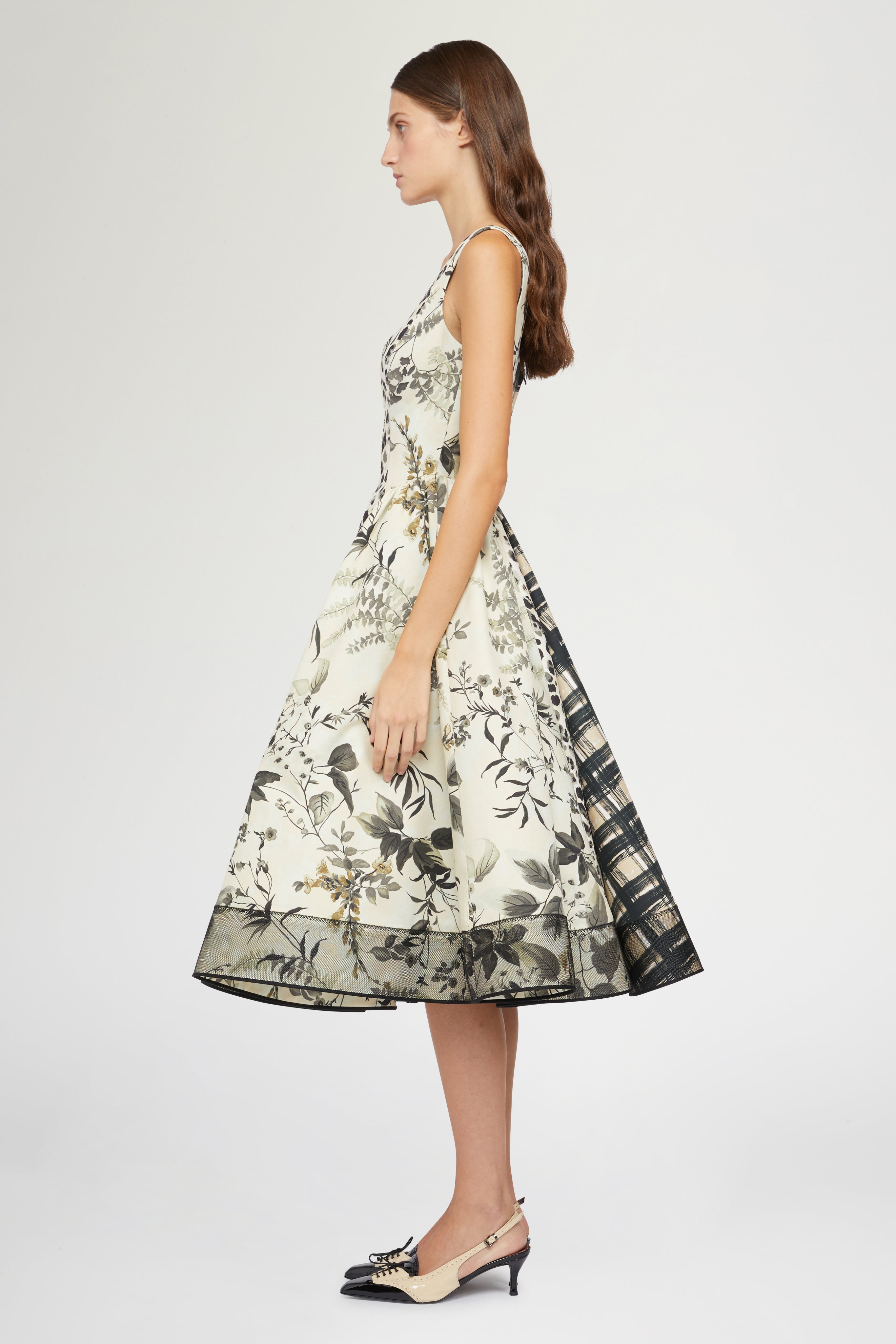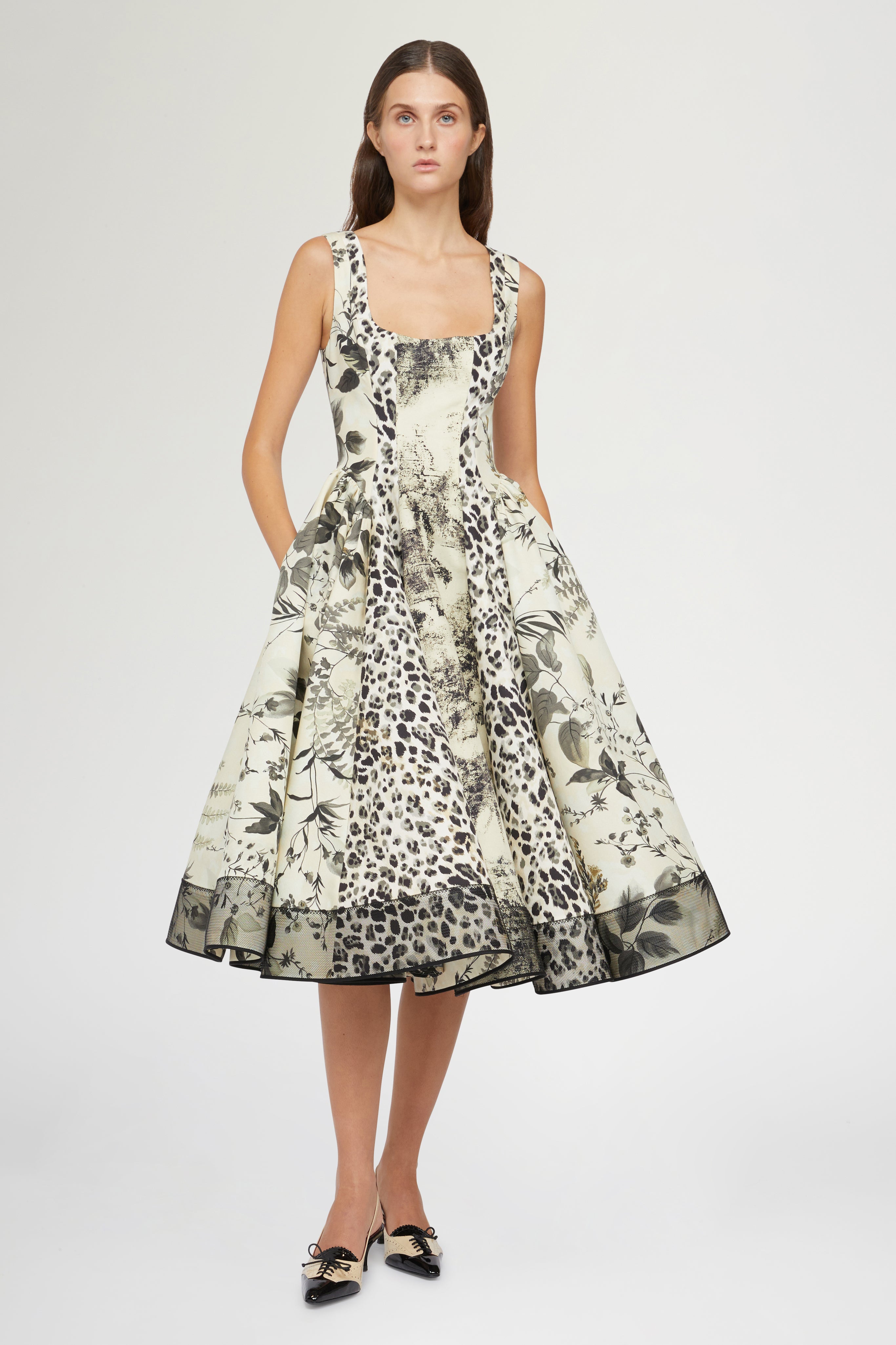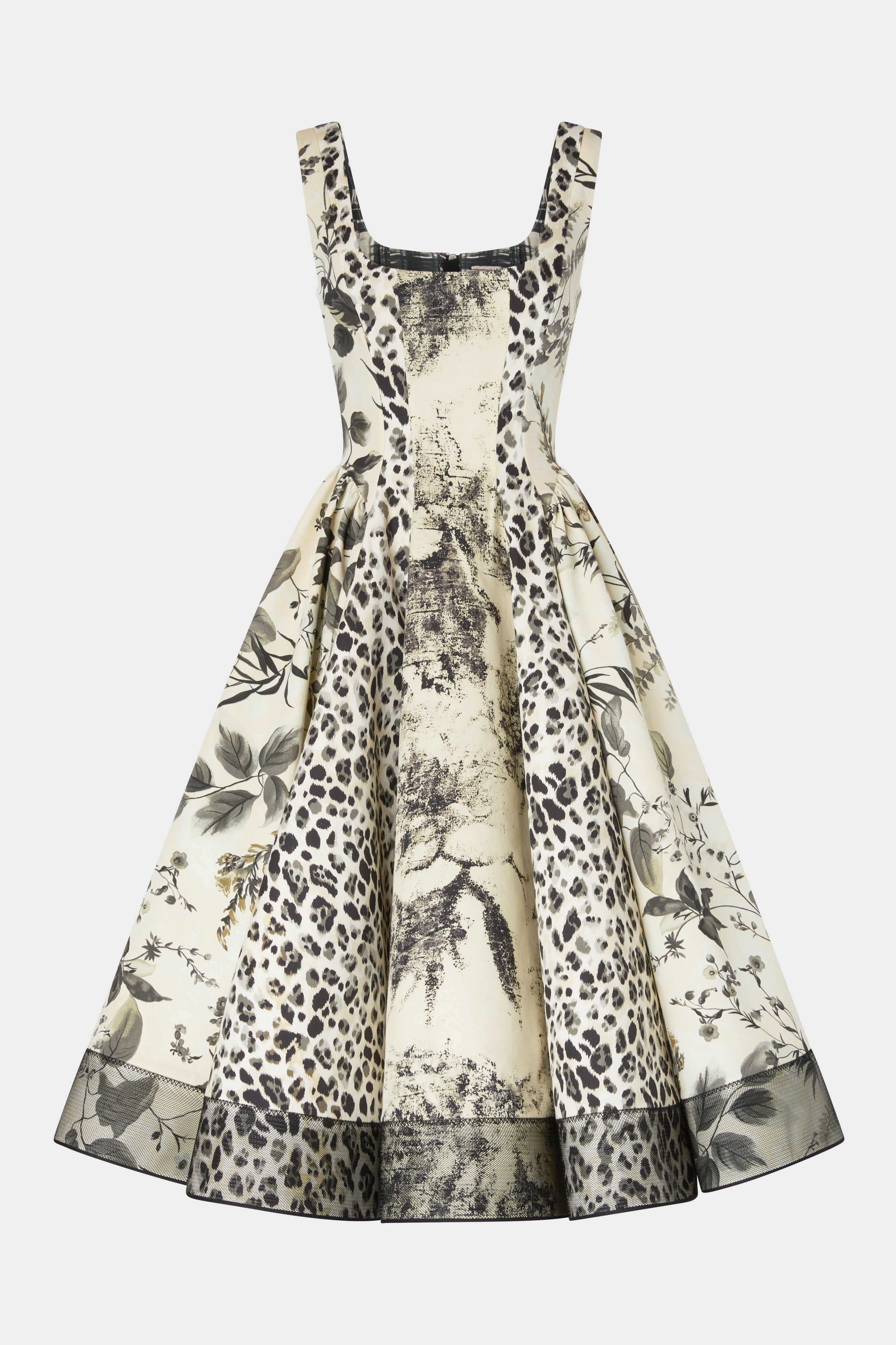 Midi dress with a square neckline, pleated skirt, and leopard print.