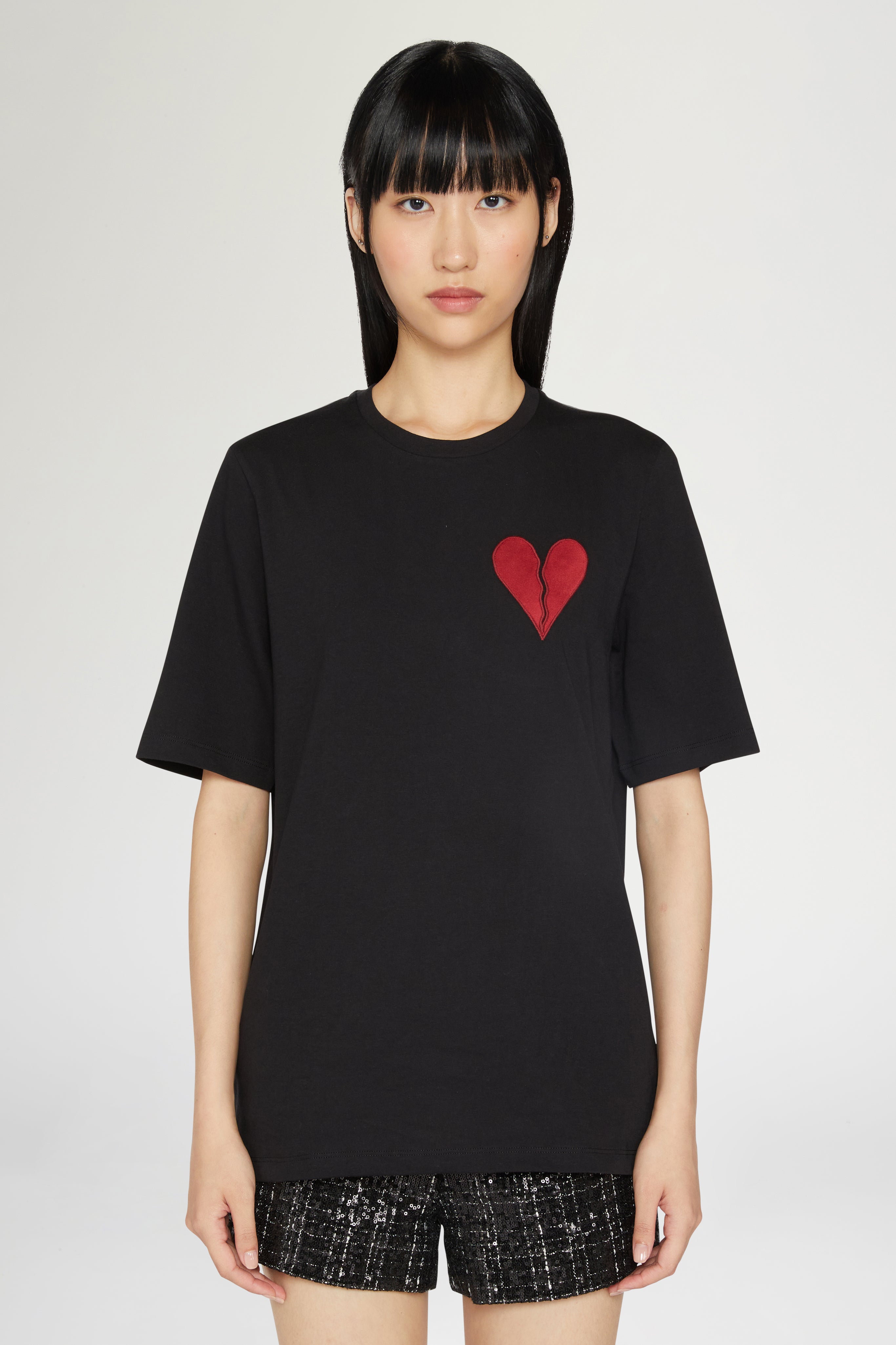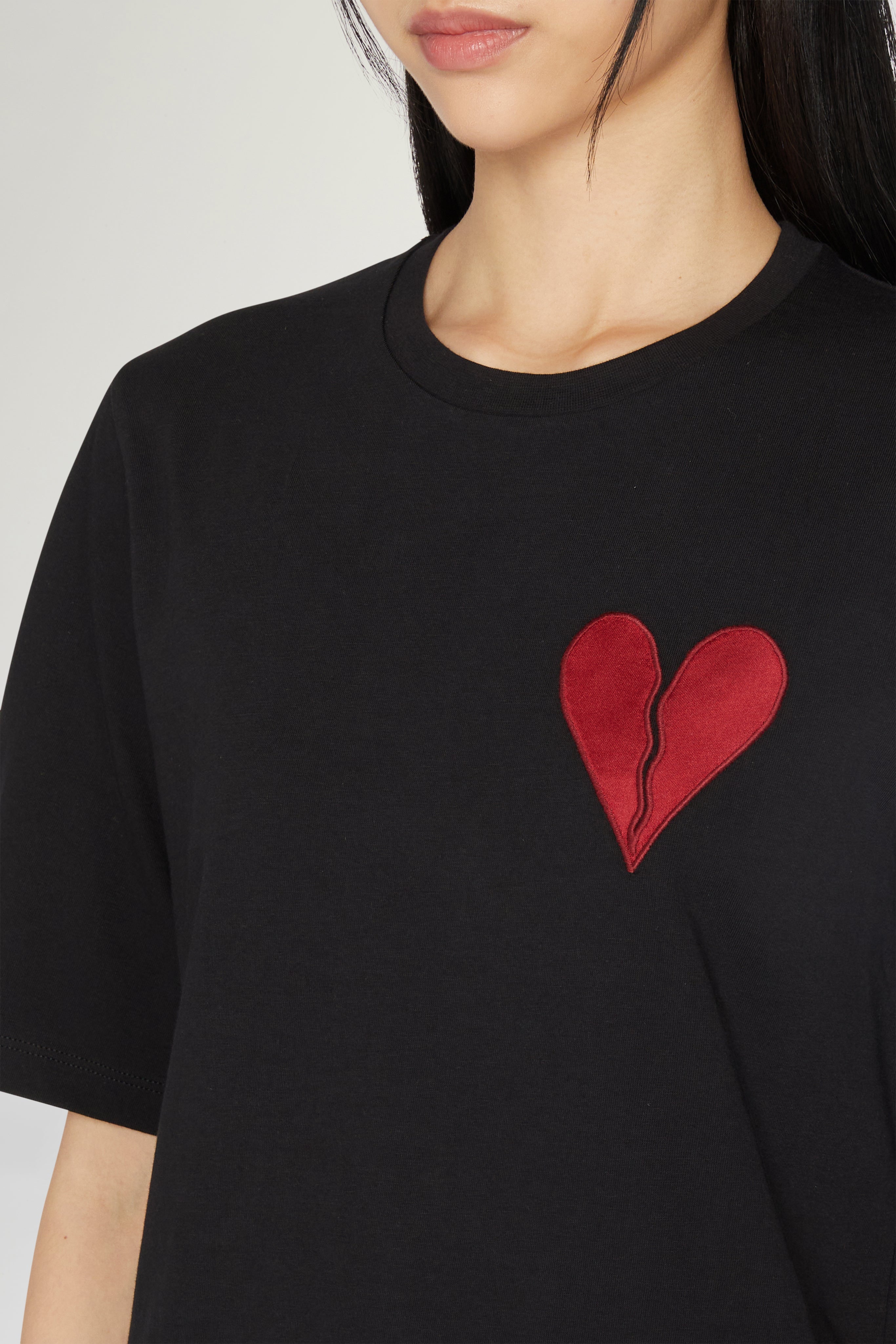 Unisex black t-shirt in 100% cotton adorned with a broken heart appliqué.