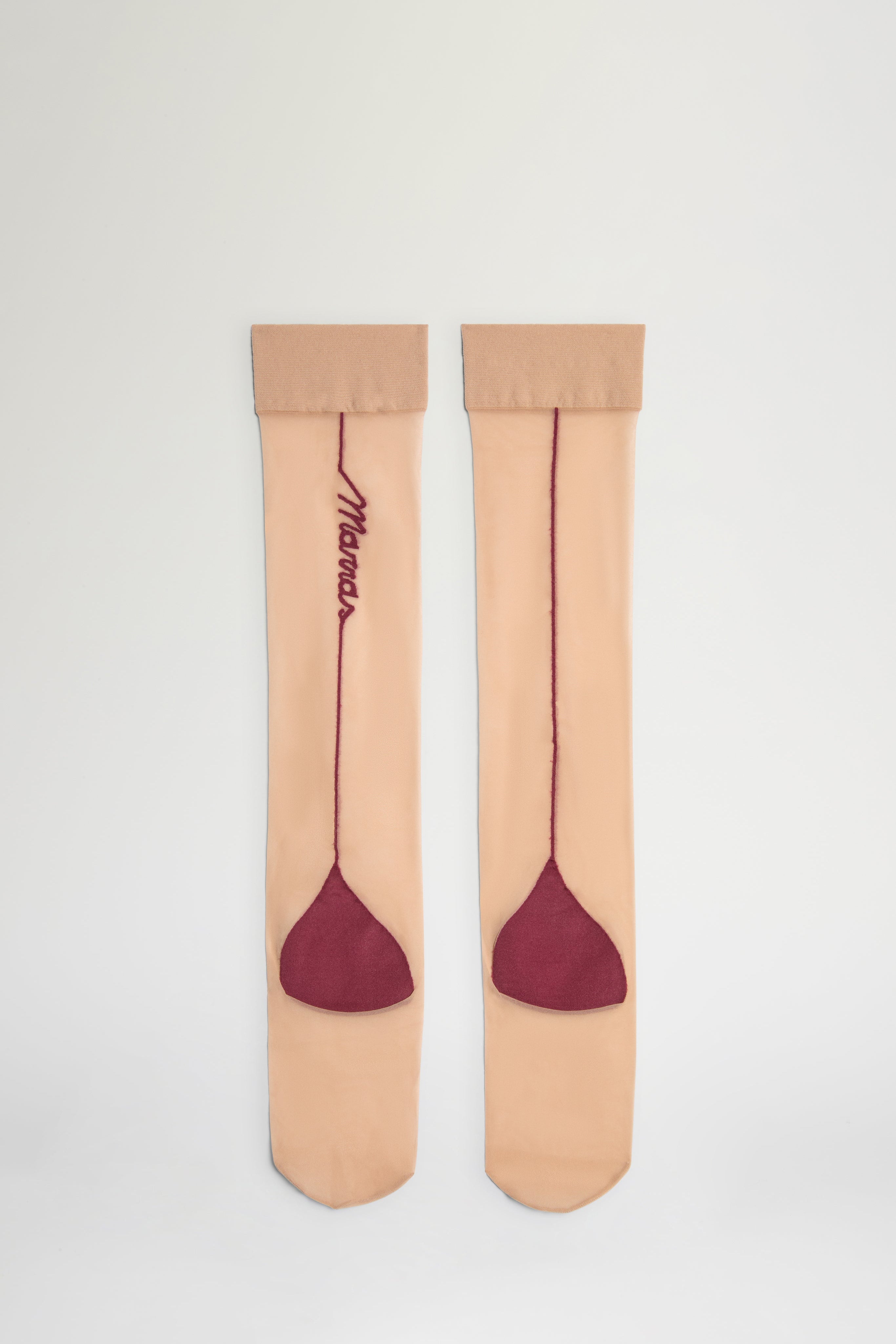 • Nude sheer knee-high socks with bordeaux Marras logo and line on the back.