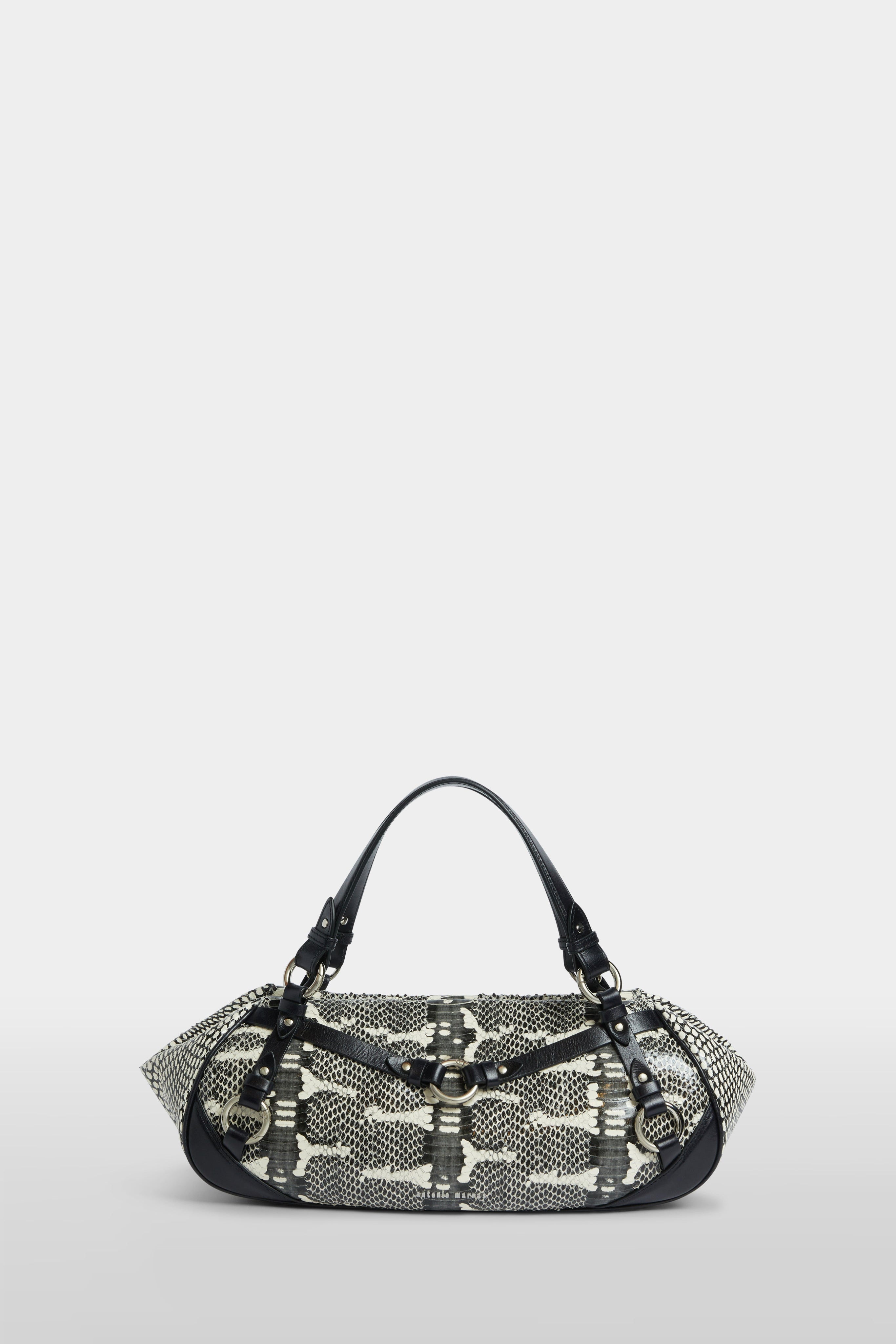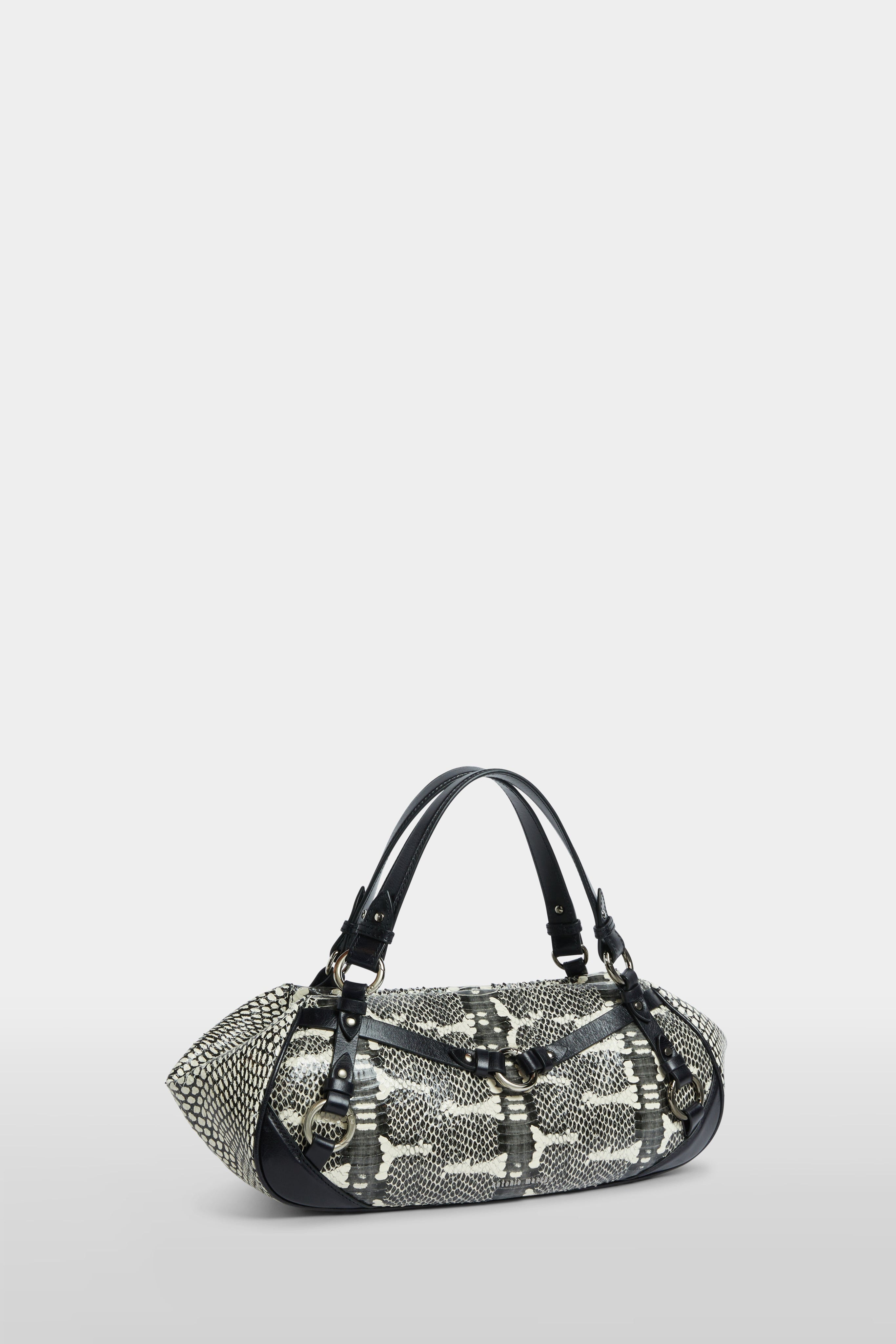 • Women’s bowling bag crafted in 100% python-effect bovine leather. Features double top handles, leather strap detailing with metal rings, and a spacious interior with zip closure. A striking accessory that combines elegance with an edgy twist.