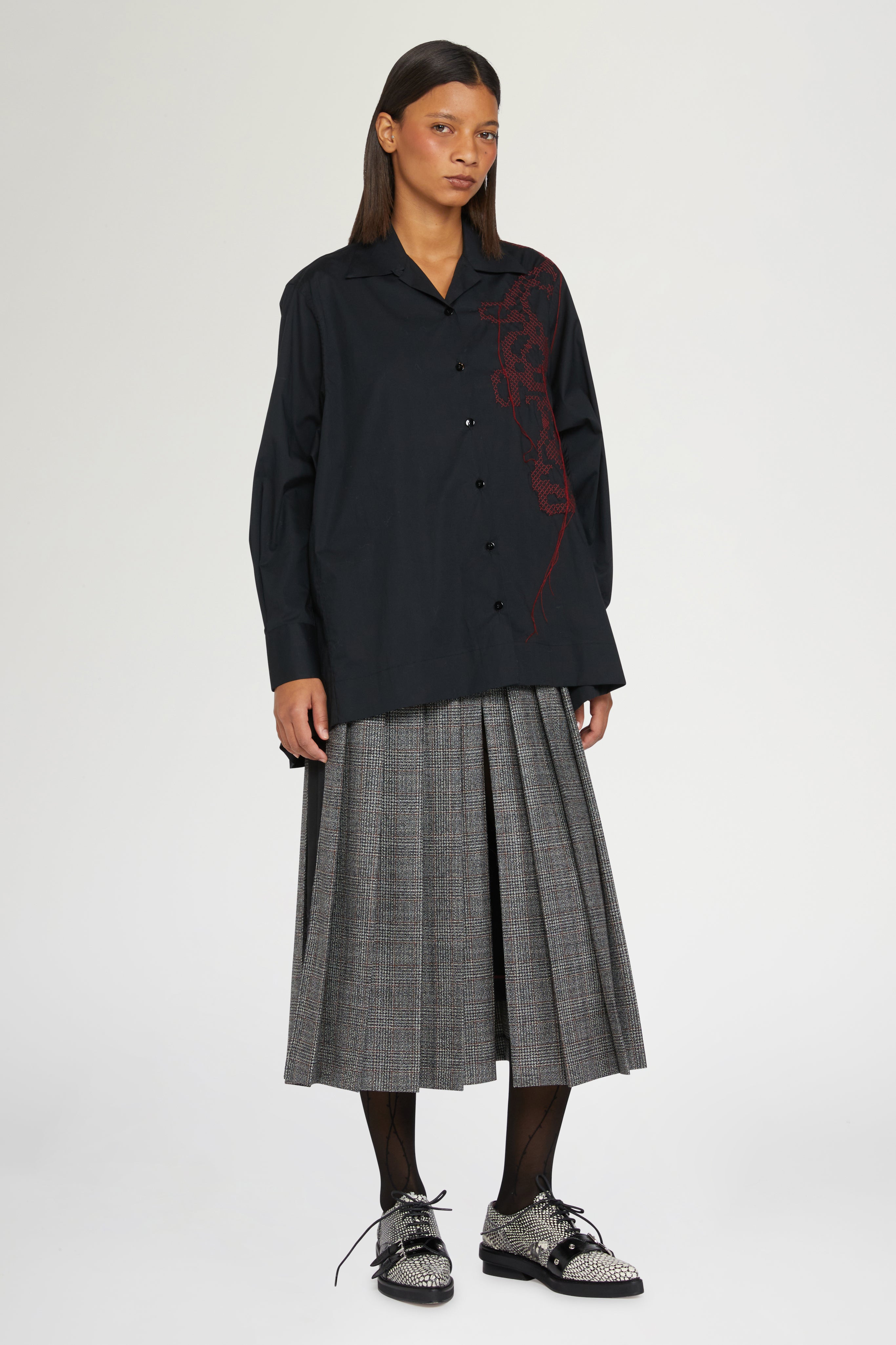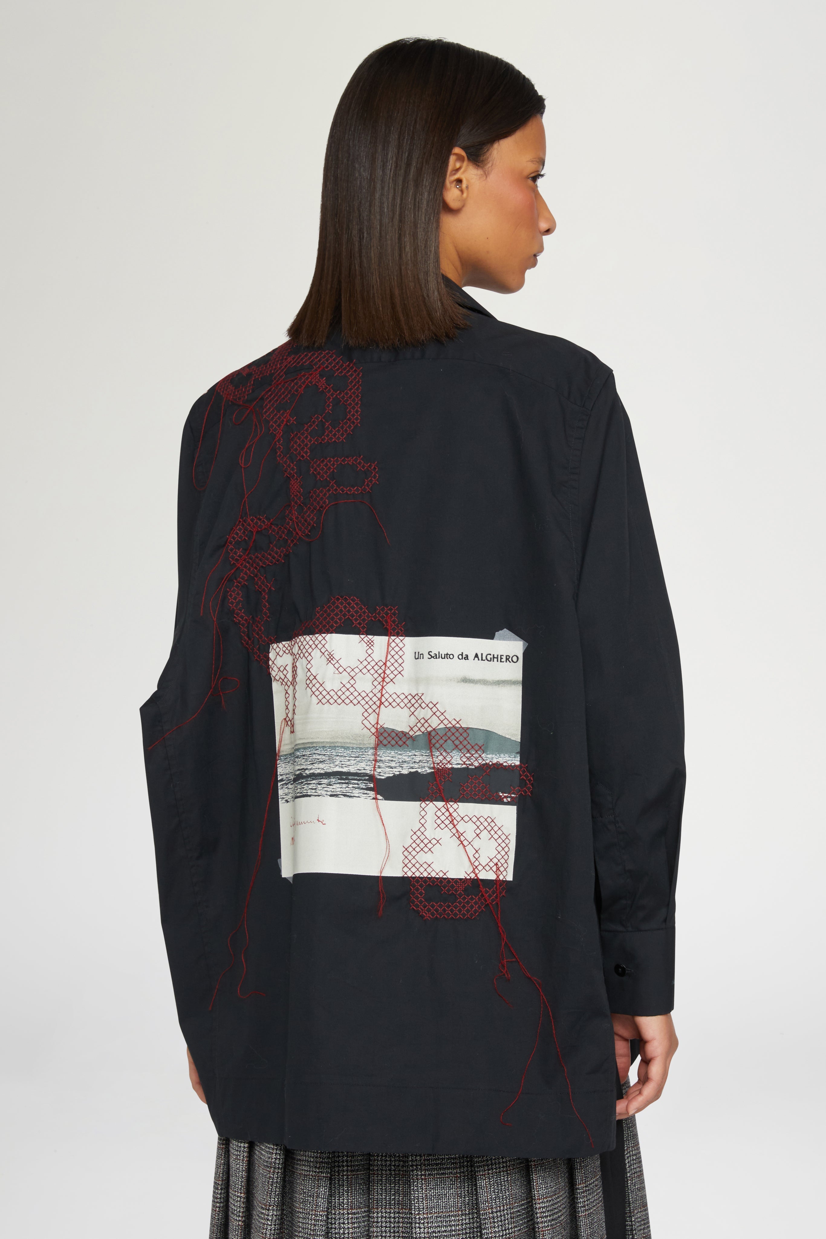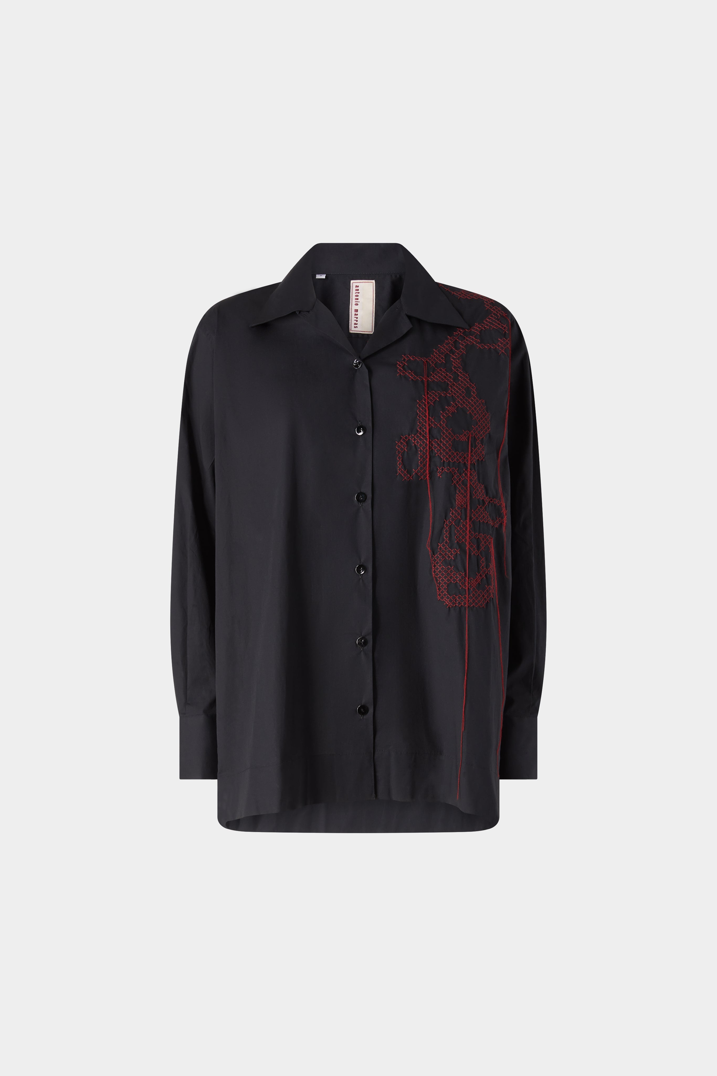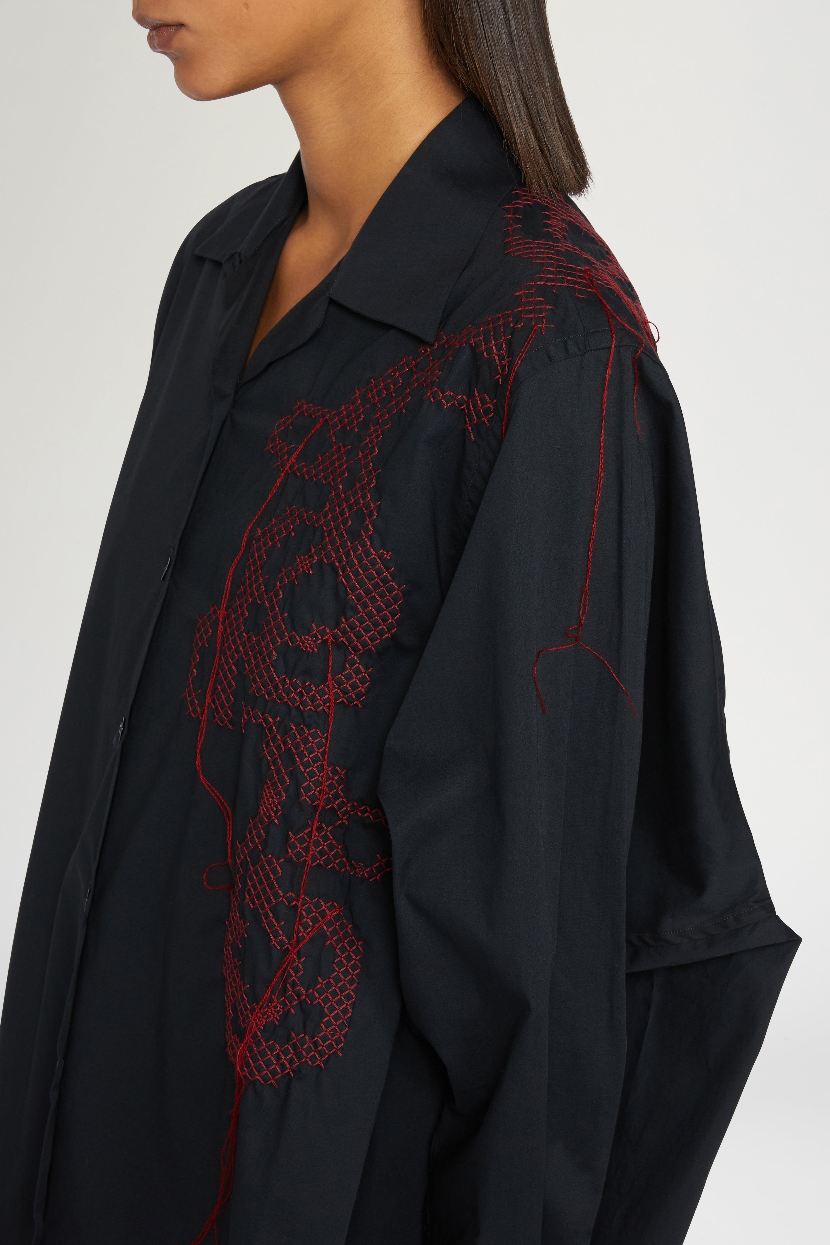 Black cotton poplin shirt featuring contrasting red embroidery on the front and back. Relaxed fit with an open collar and central button fastening. Finished with an applied printed panel on the back for a distinctive touch.