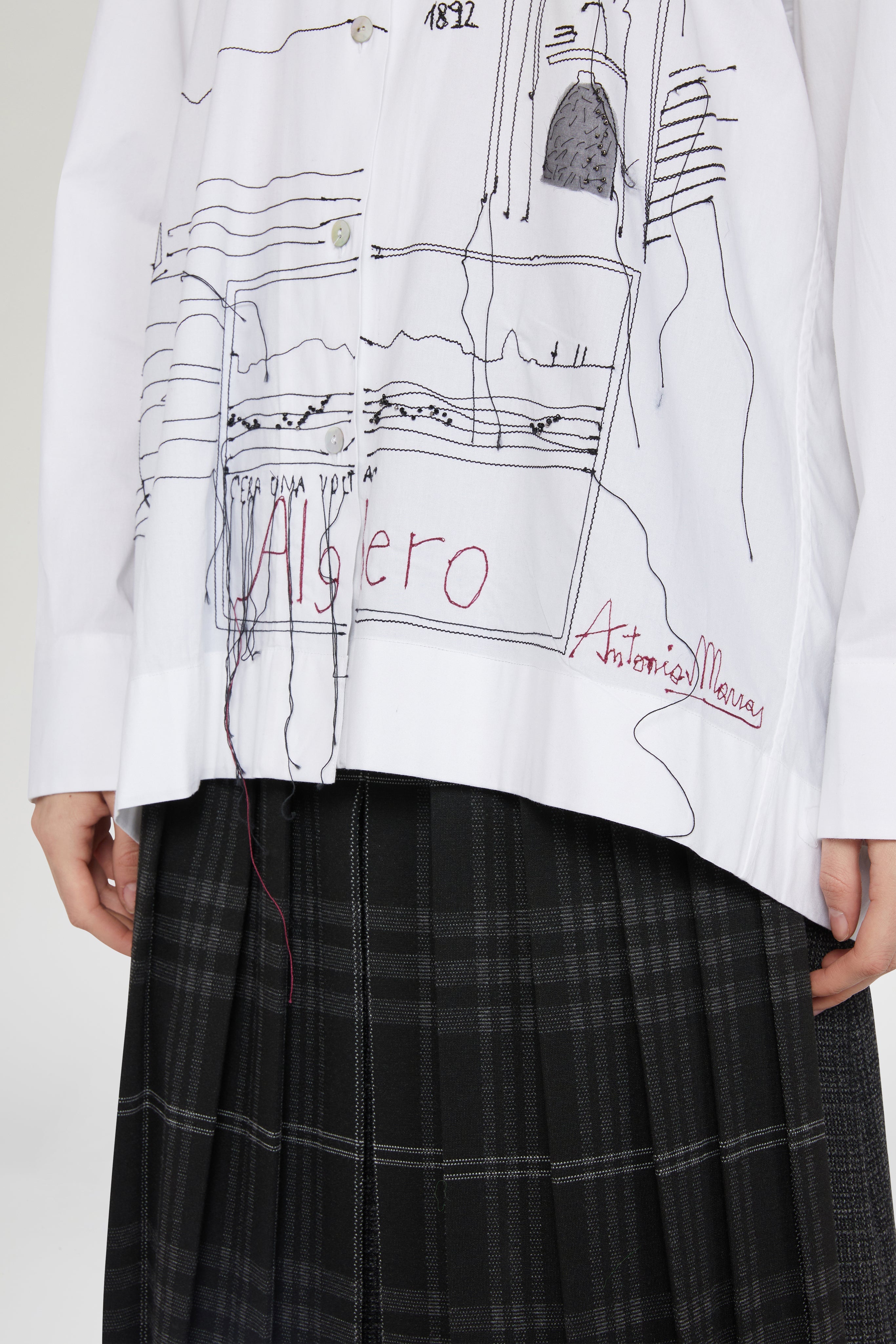 • White cotton poplin shirt featuring a hand-drawn sketch-style embroidery inspired by Alghero. Designed with a relaxed silhouette, open collar, and front button closure. Signature contrasting threads add a distinctive, artisanal finish.