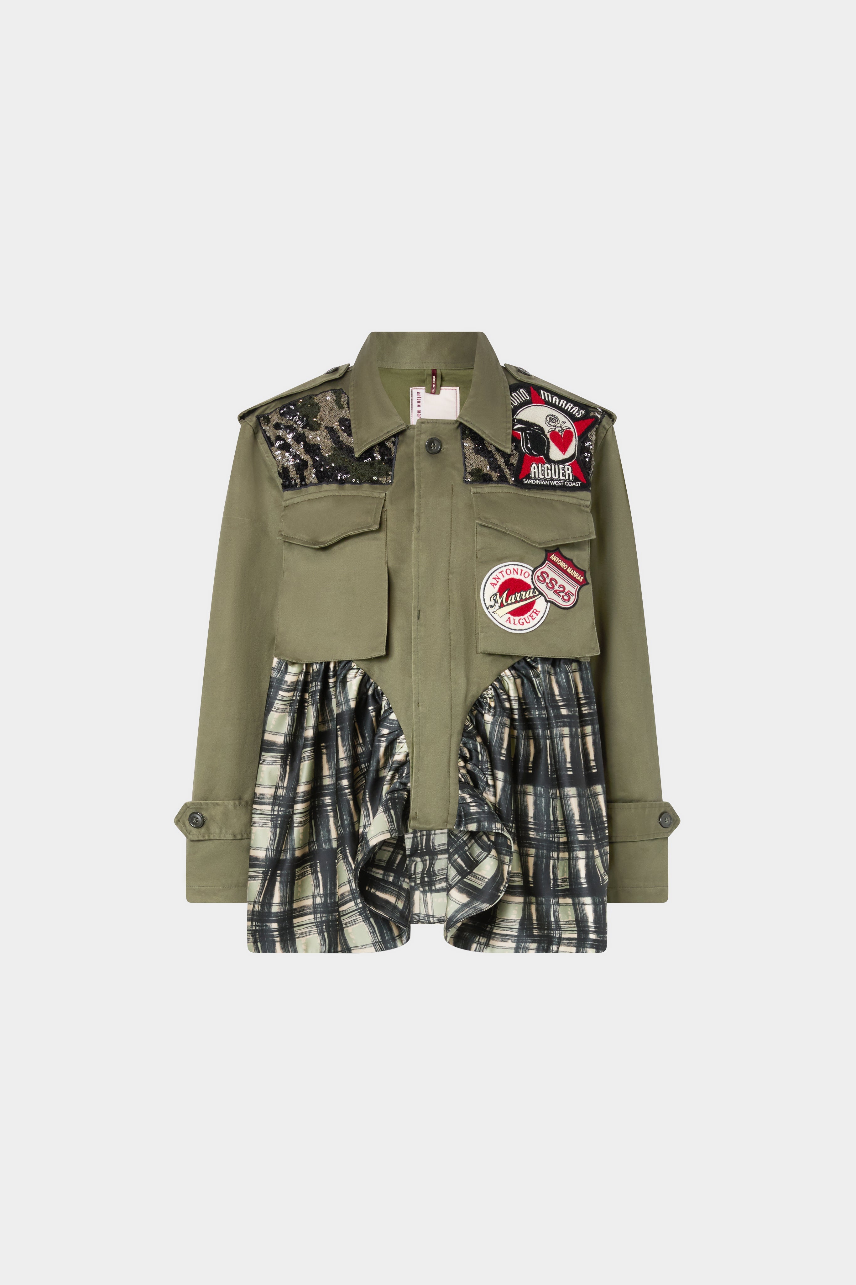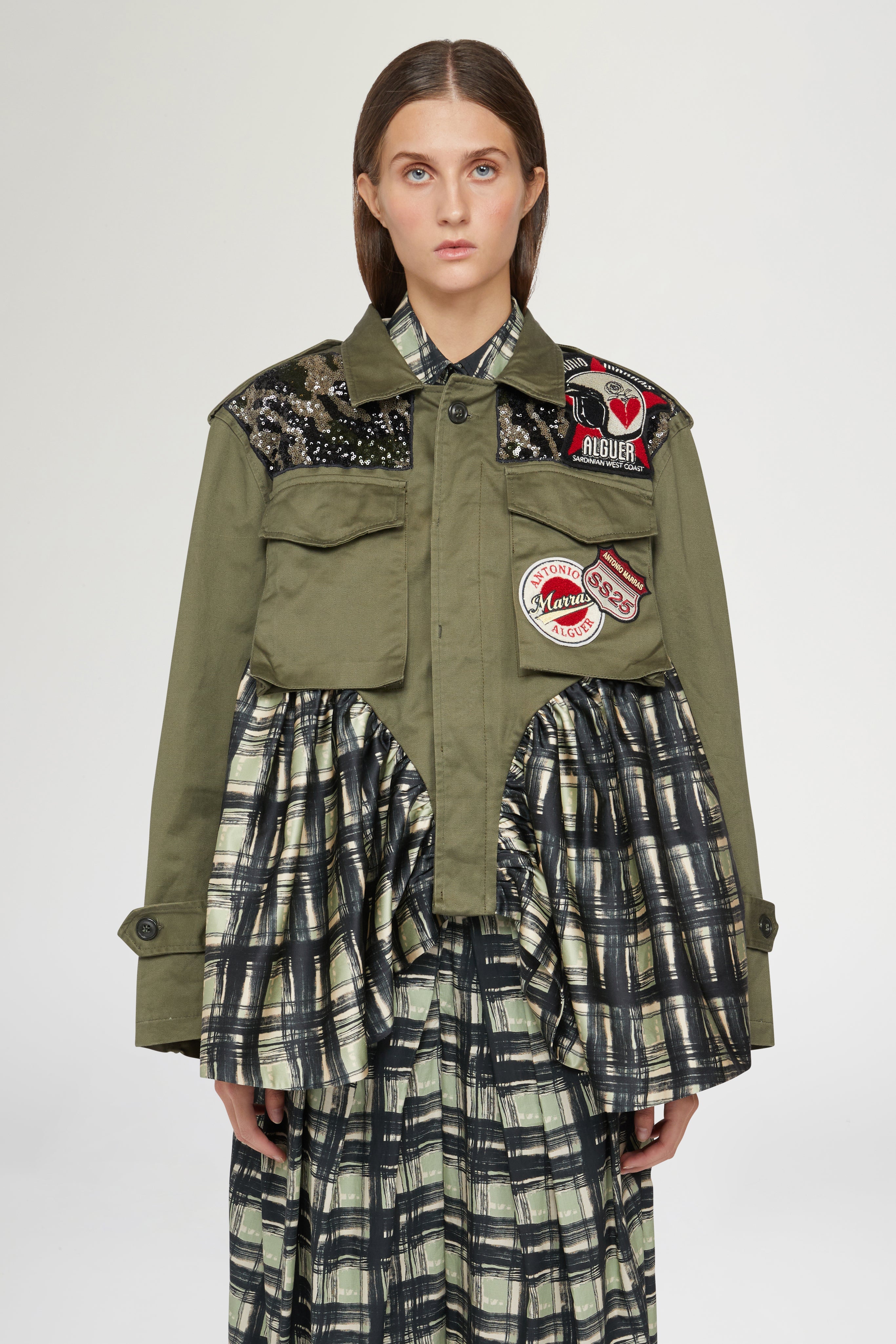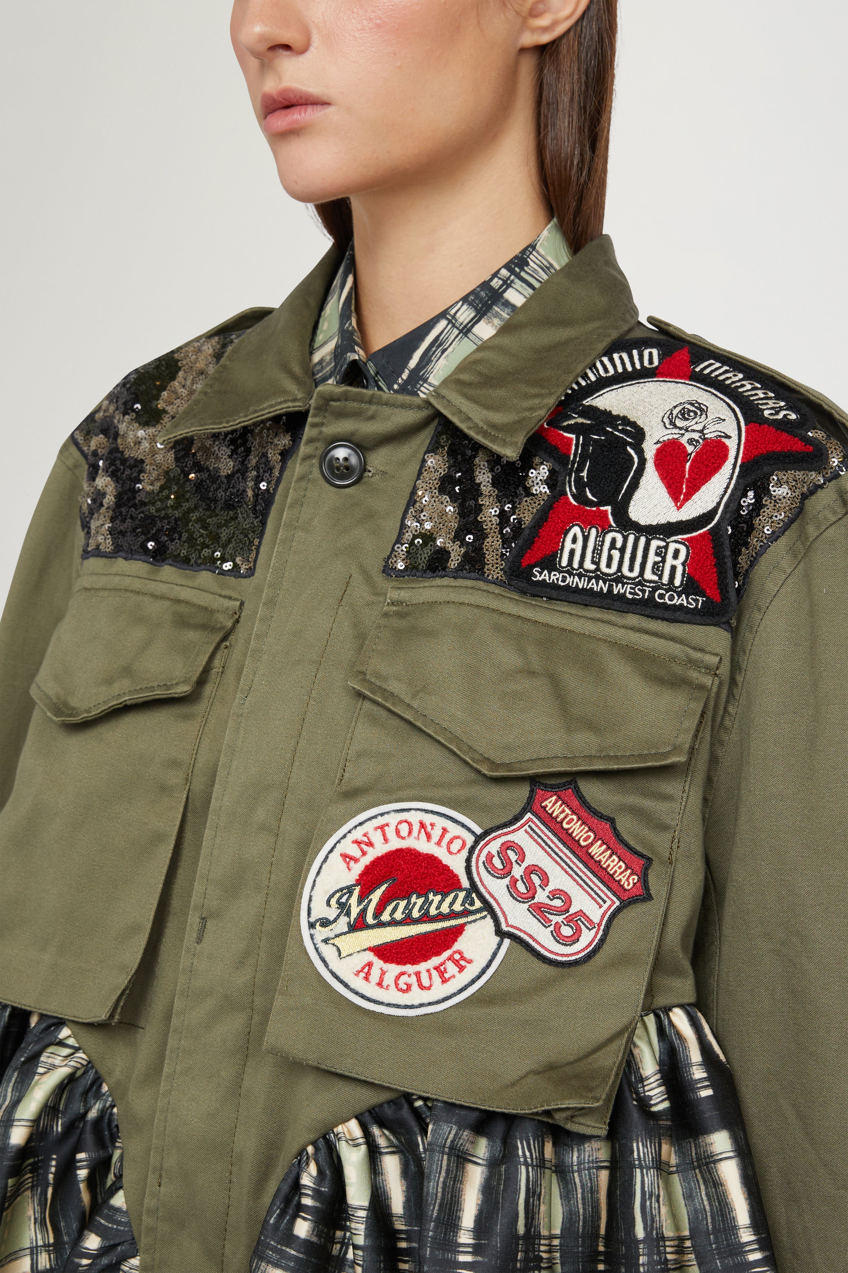 • Military green parka with sequin-embroidered shoulders, decorative patches, and a draped plaid fabric insert at the back. A bold fusion of military style and eclectic details.