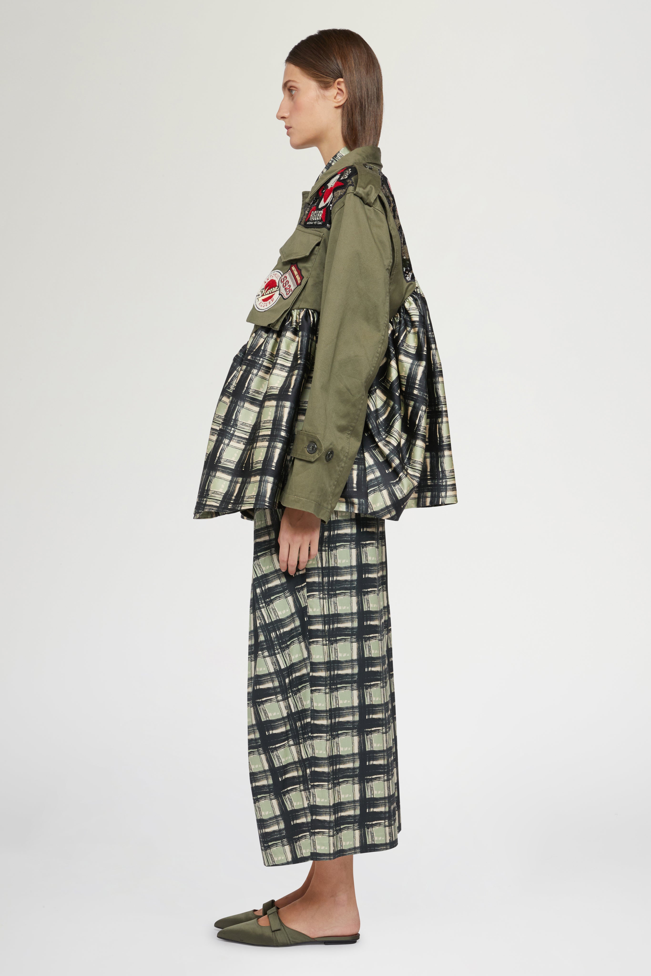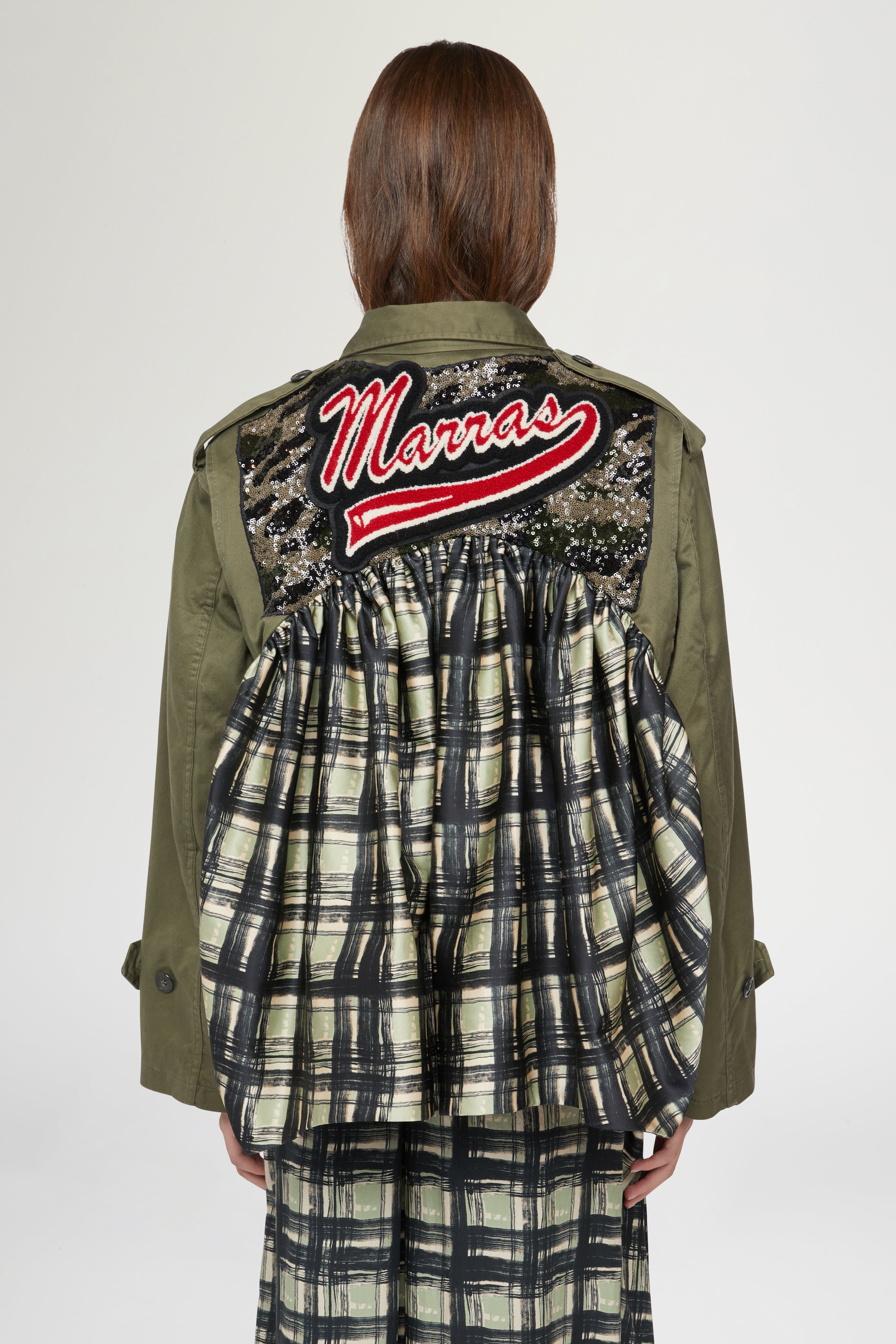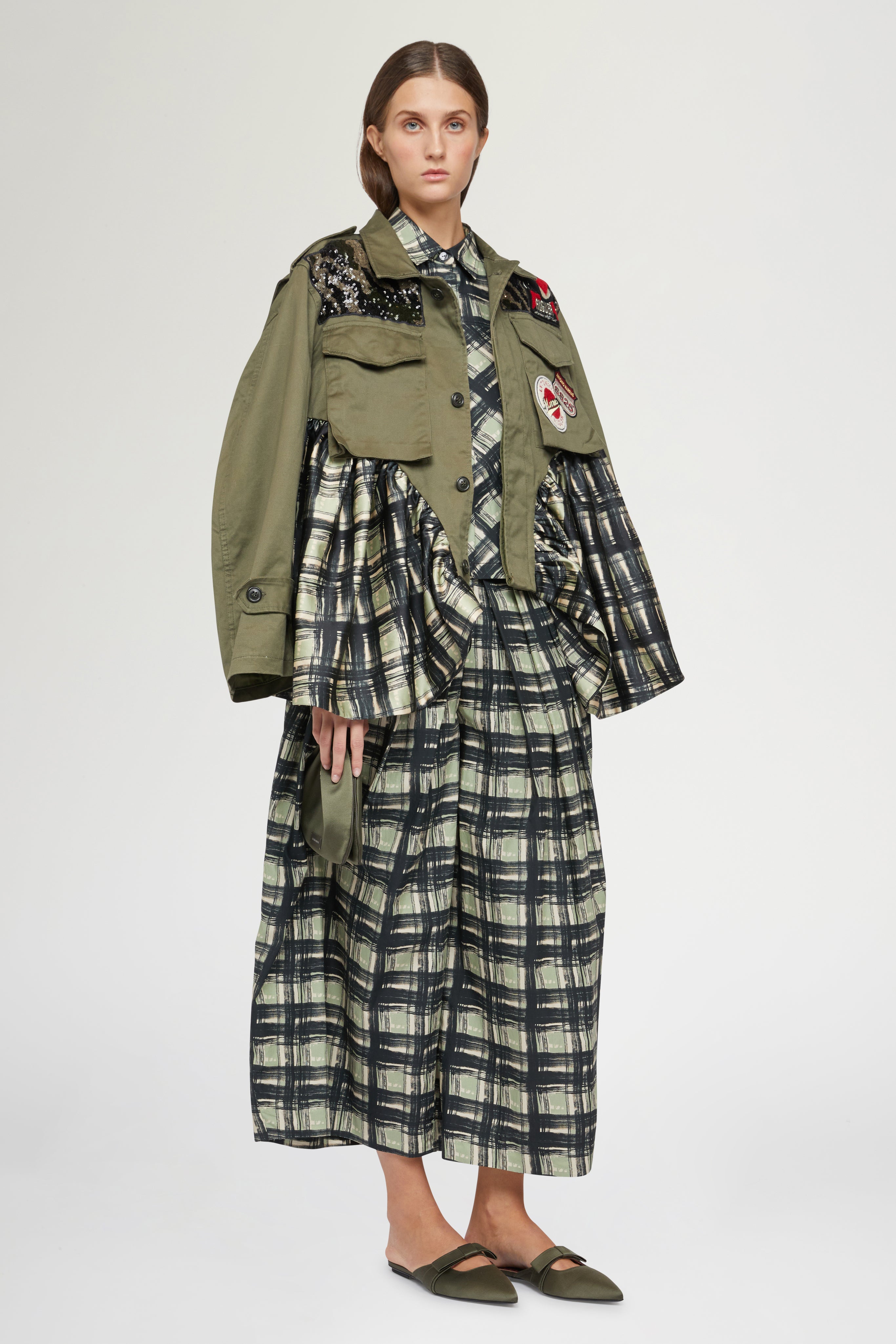 • Military green parka with sequin-embroidered shoulders, decorative patches, and a draped plaid fabric insert at the back. A bold fusion of military style and eclectic details.