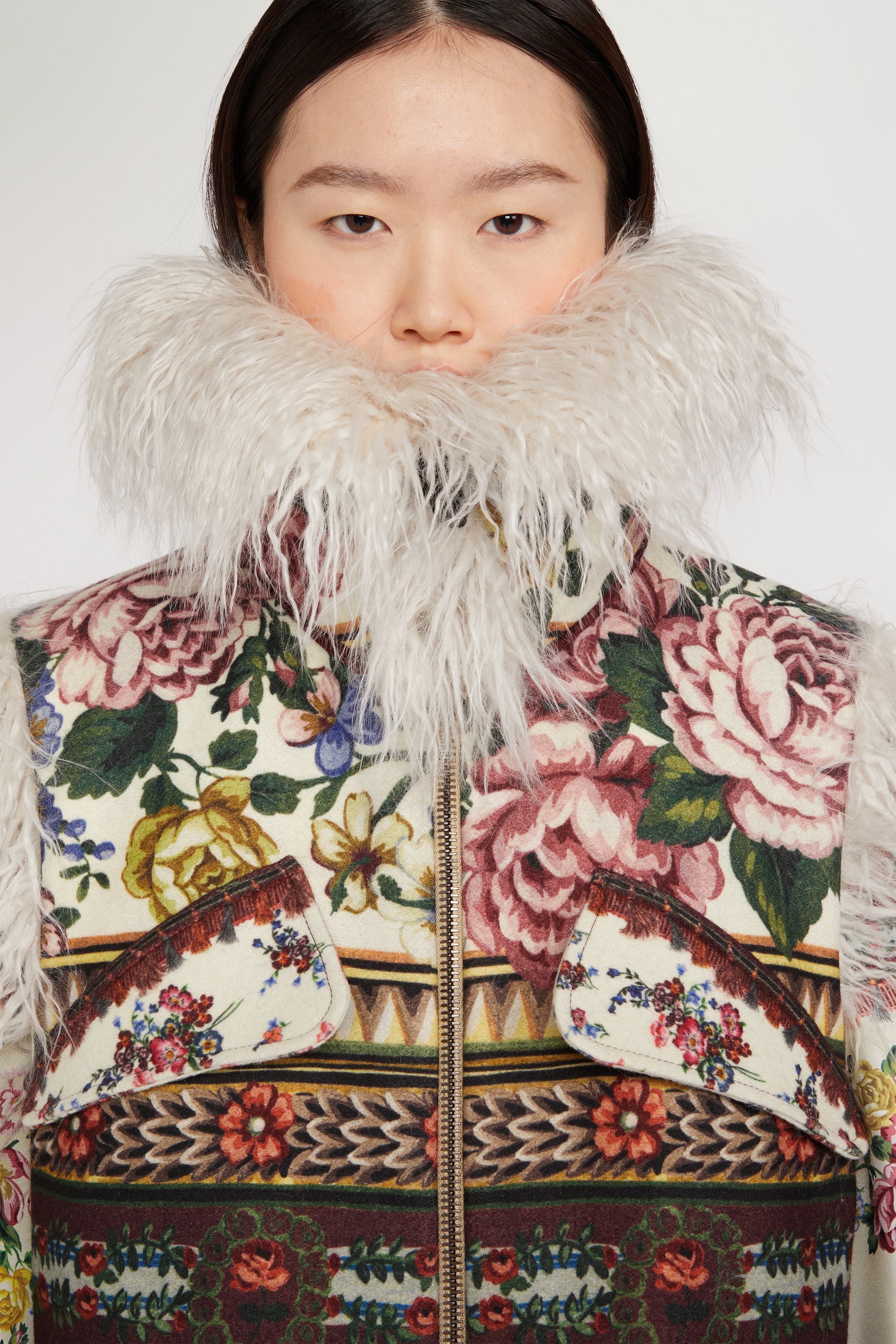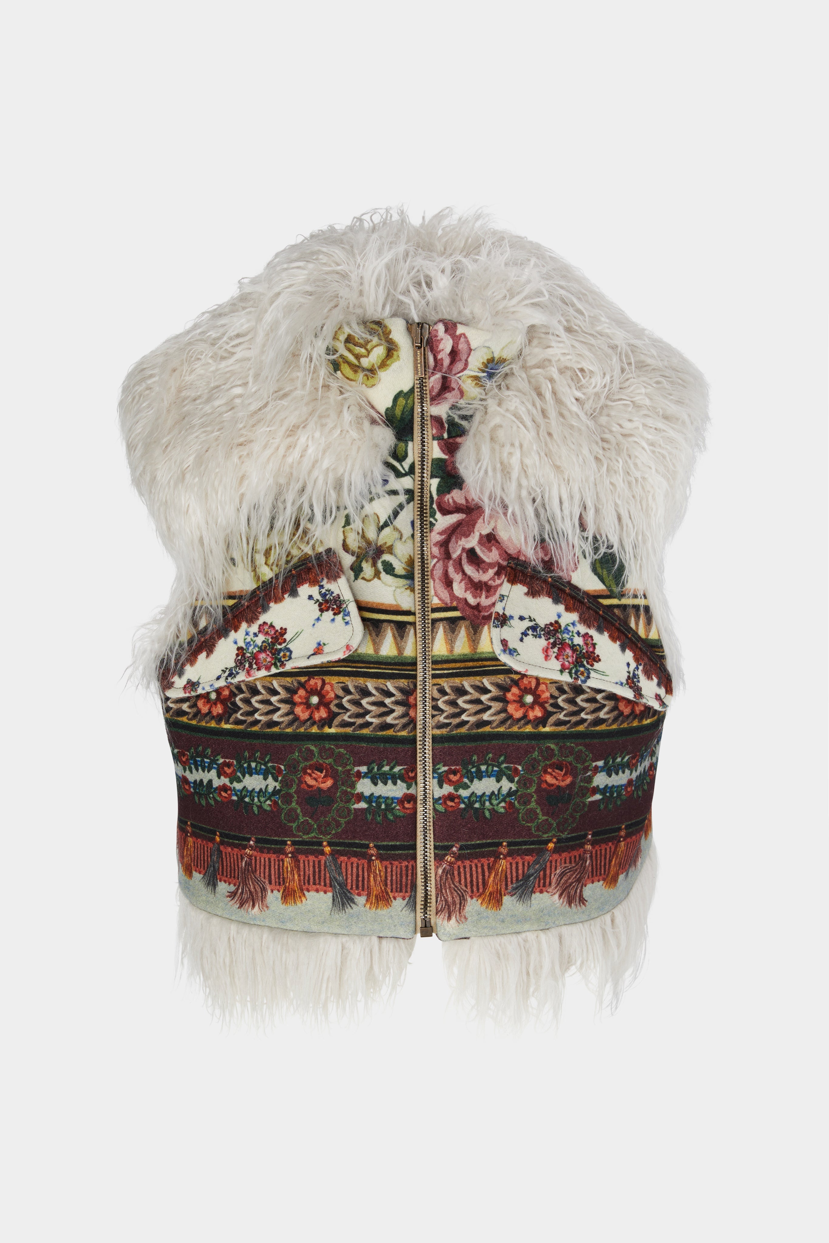 • Sleeveless vest in floral jacquard with ethnic-inspired motifs, enriched by soft faux fur trims for a bold, tactile statement. A fusion of folk charm and contemporary flair.