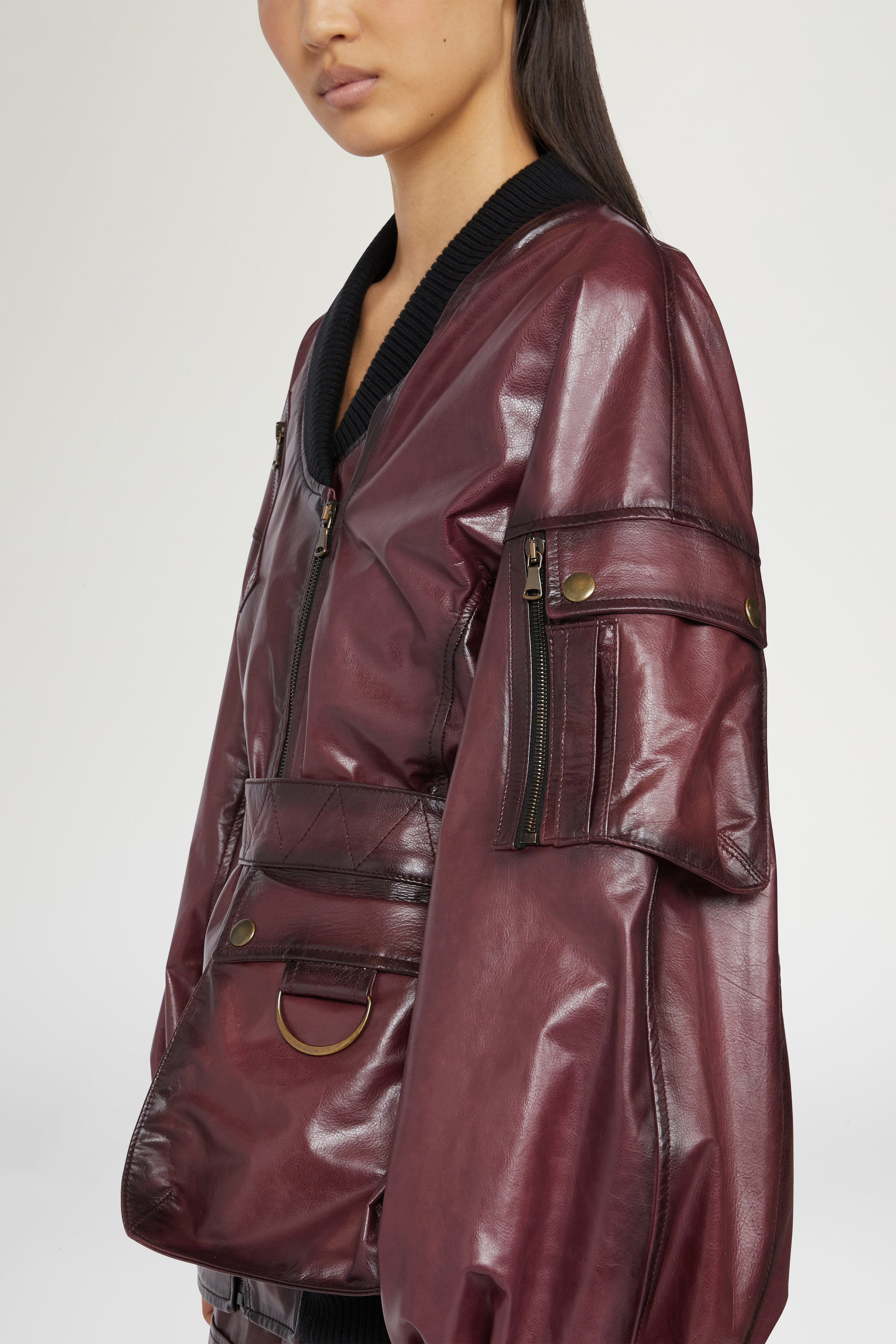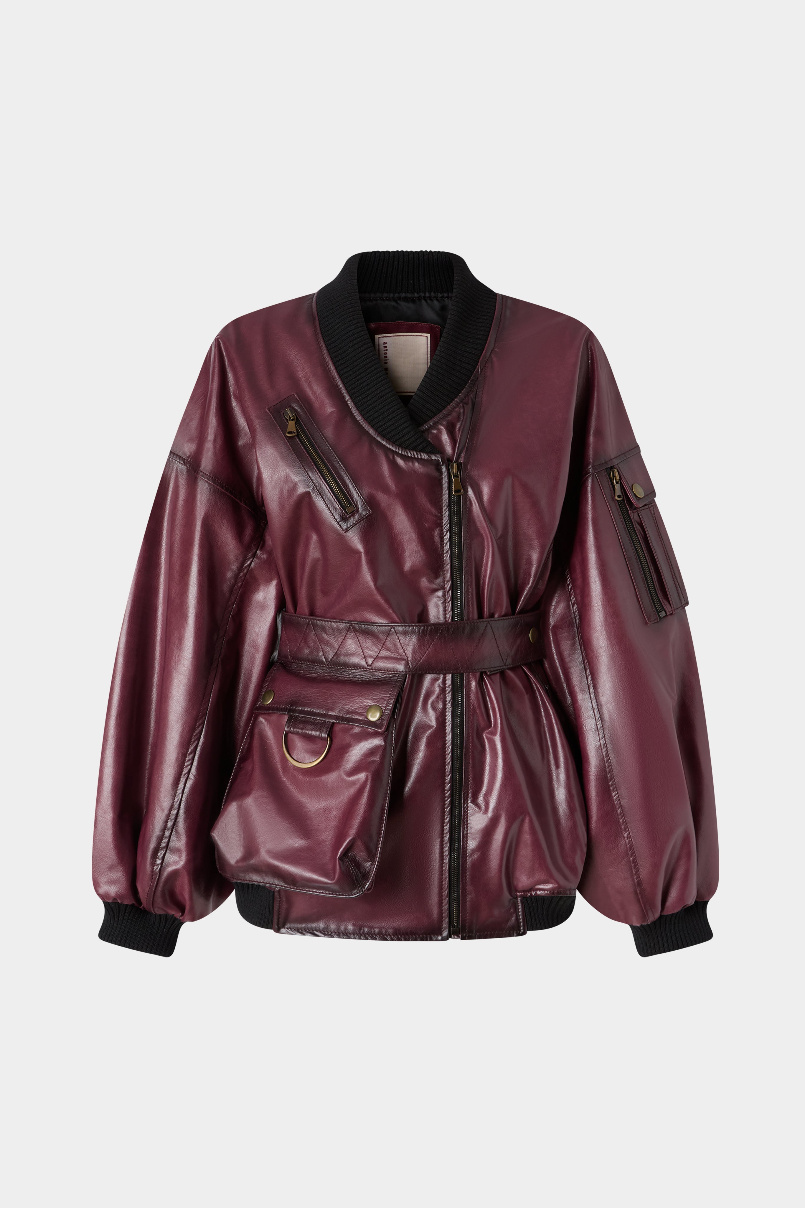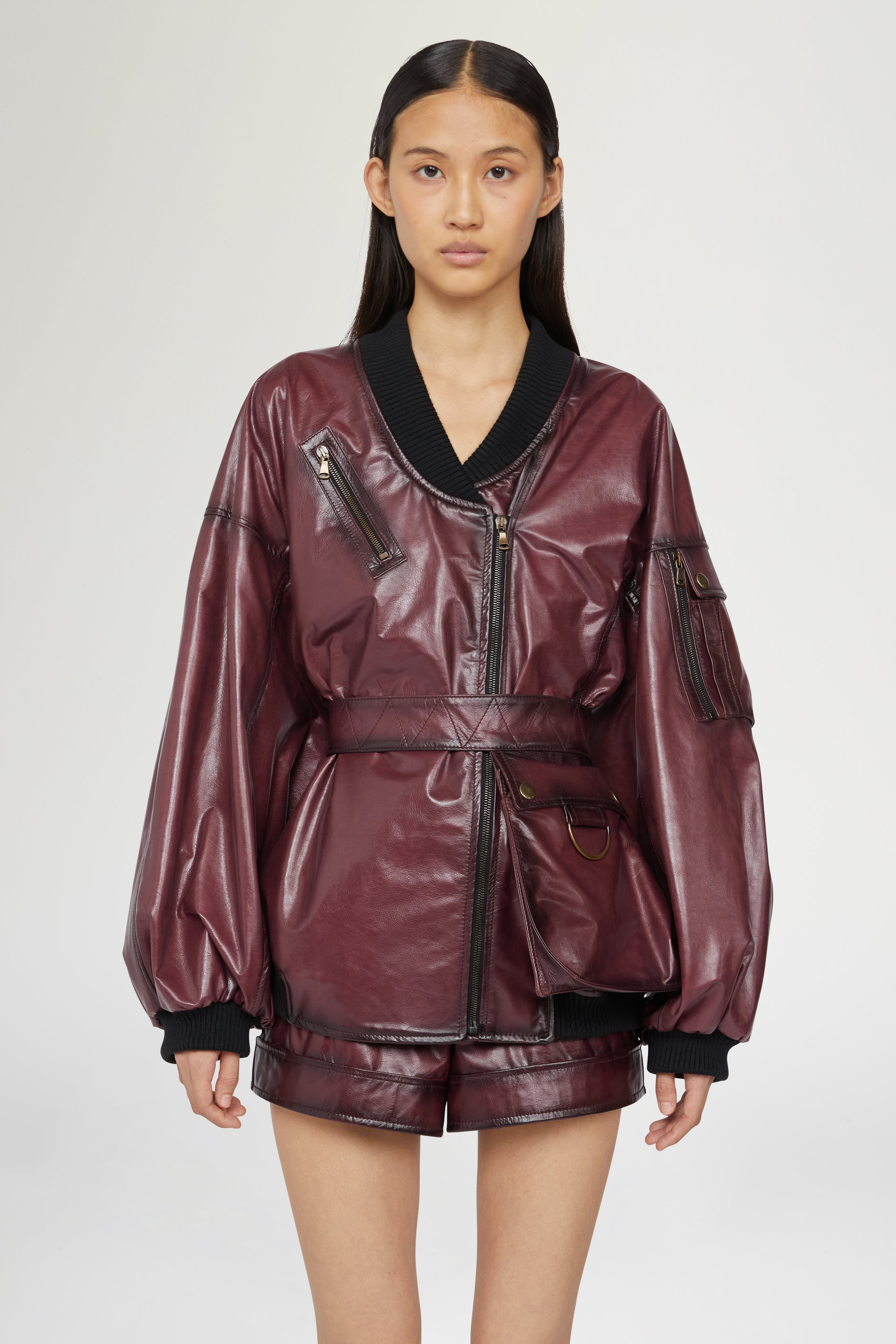Bordeaux leather bomber-style jacket with oversized sleeves, ribbed cuffs, and utility-inspired zip and pocket details. Features a belted waist and an asymmetrical zip closure for a bold, structured silhouette.