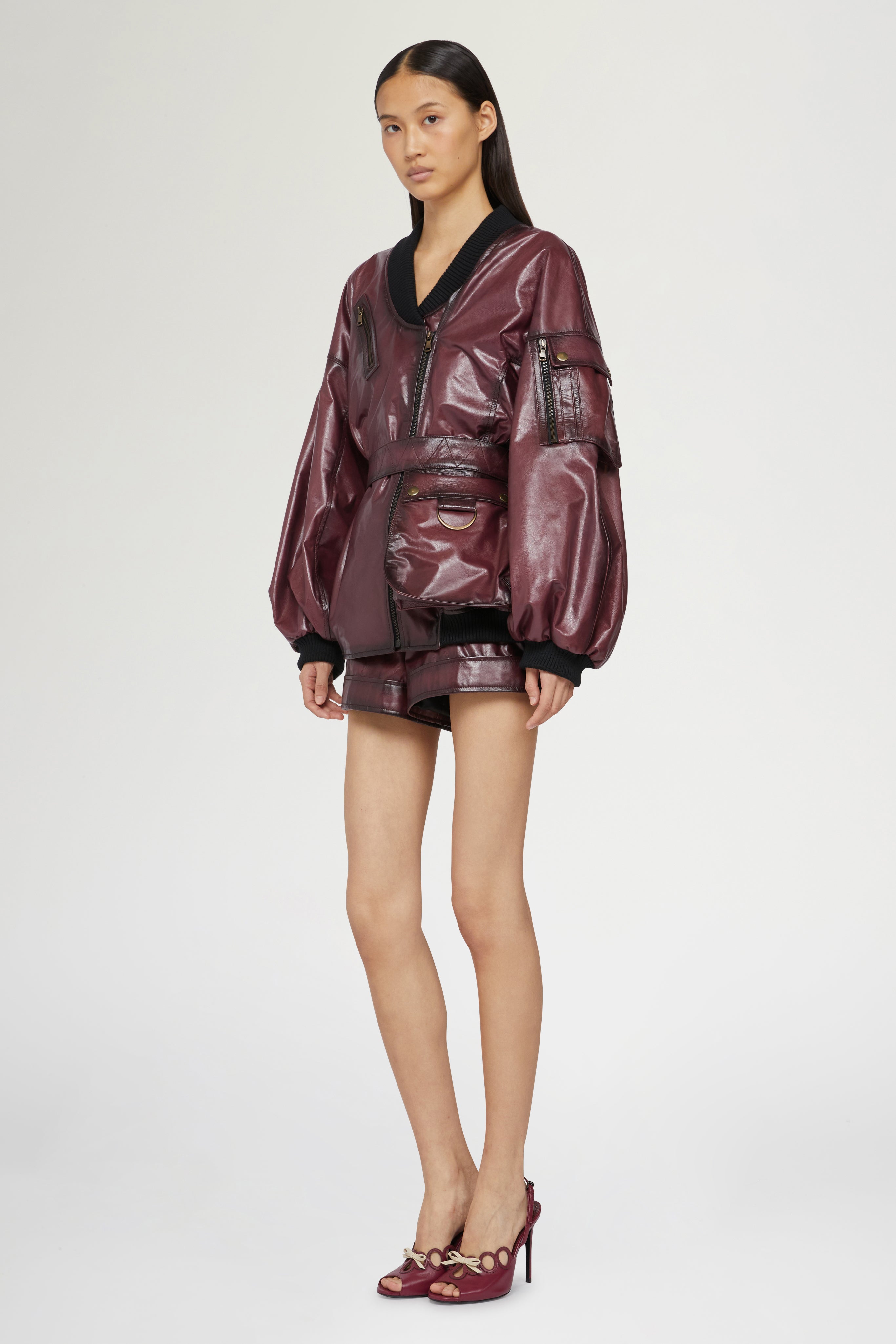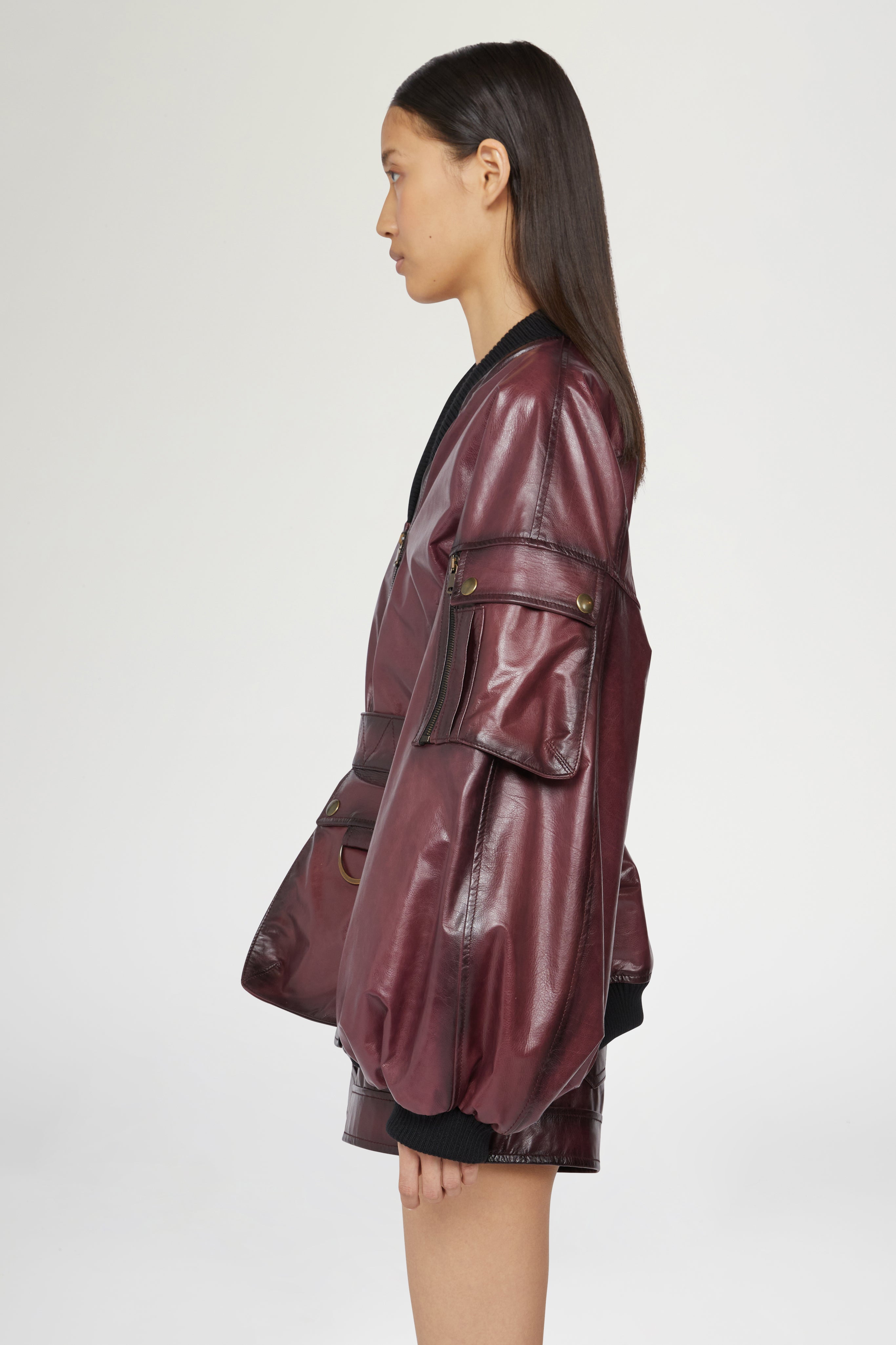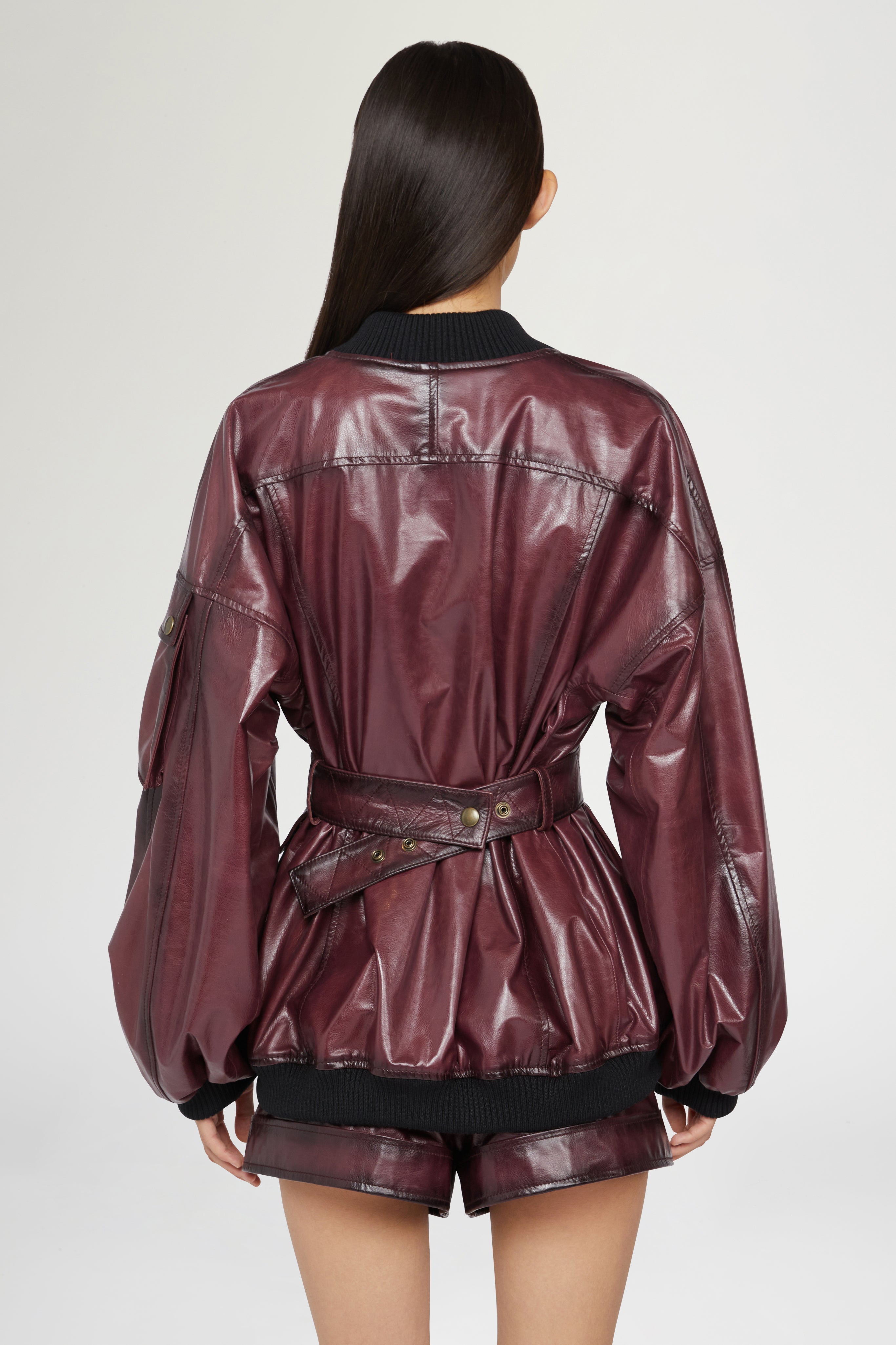 Bordeaux leather bomber-style jacket with oversized sleeves, ribbed cuffs, and utility-inspired zip and pocket details. Features a belted waist and an asymmetrical zip closure for a bold, structured silhouette.