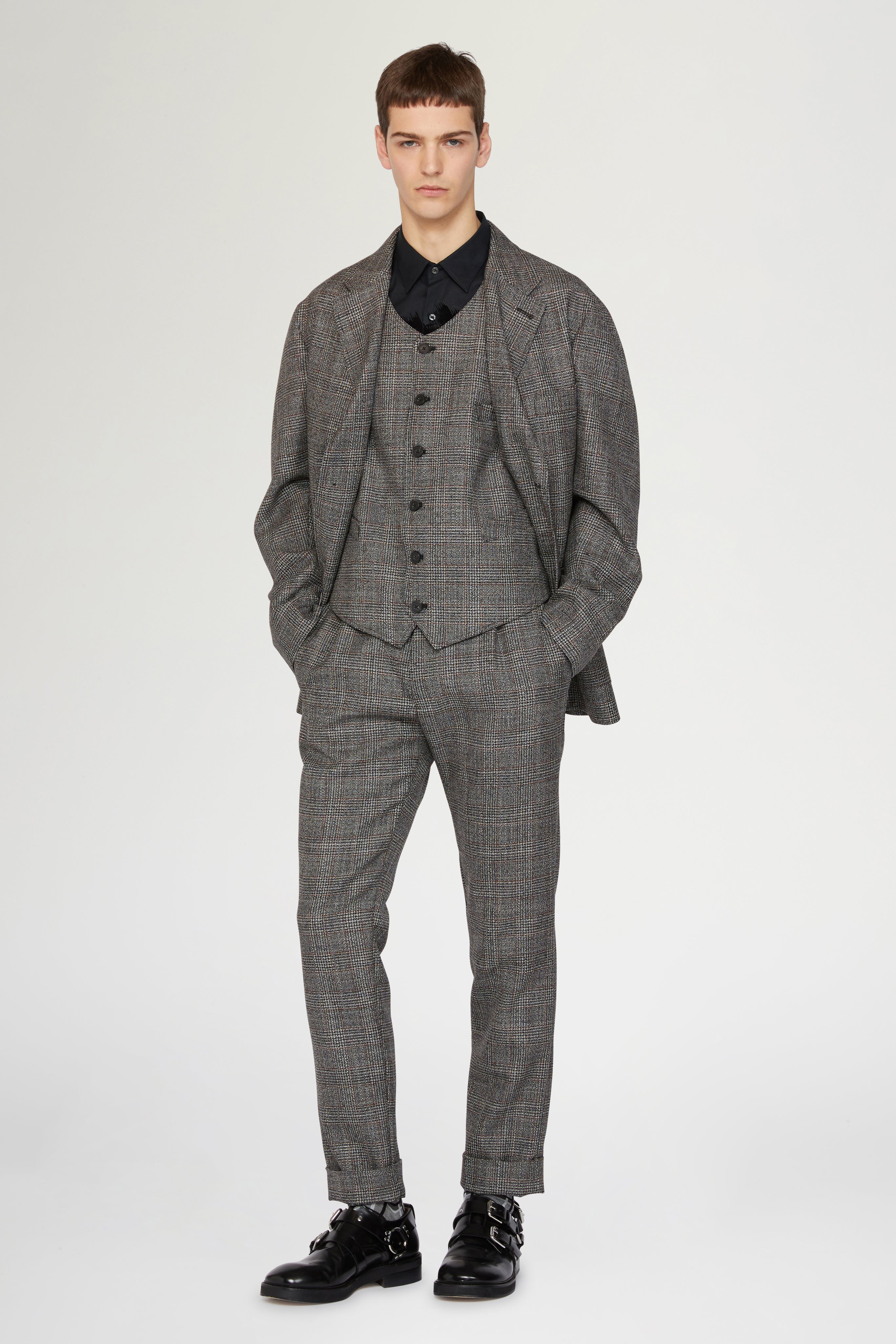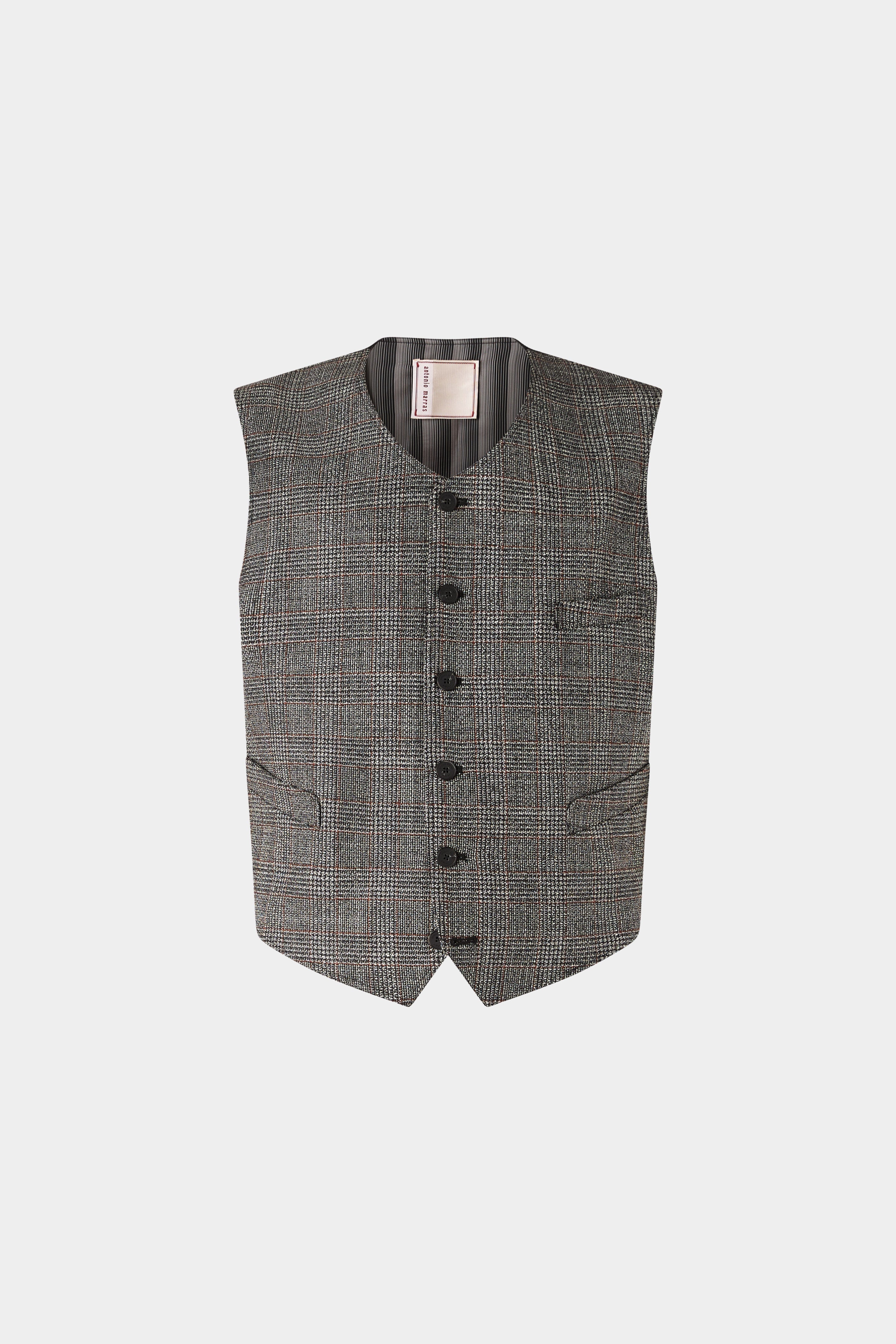 Tailored wool vest in a refined Glen check pattern, featuring a button front, welt pockets, and adjustable back strap. A timeless layer that completes both formal and casual looks with understated elegance.