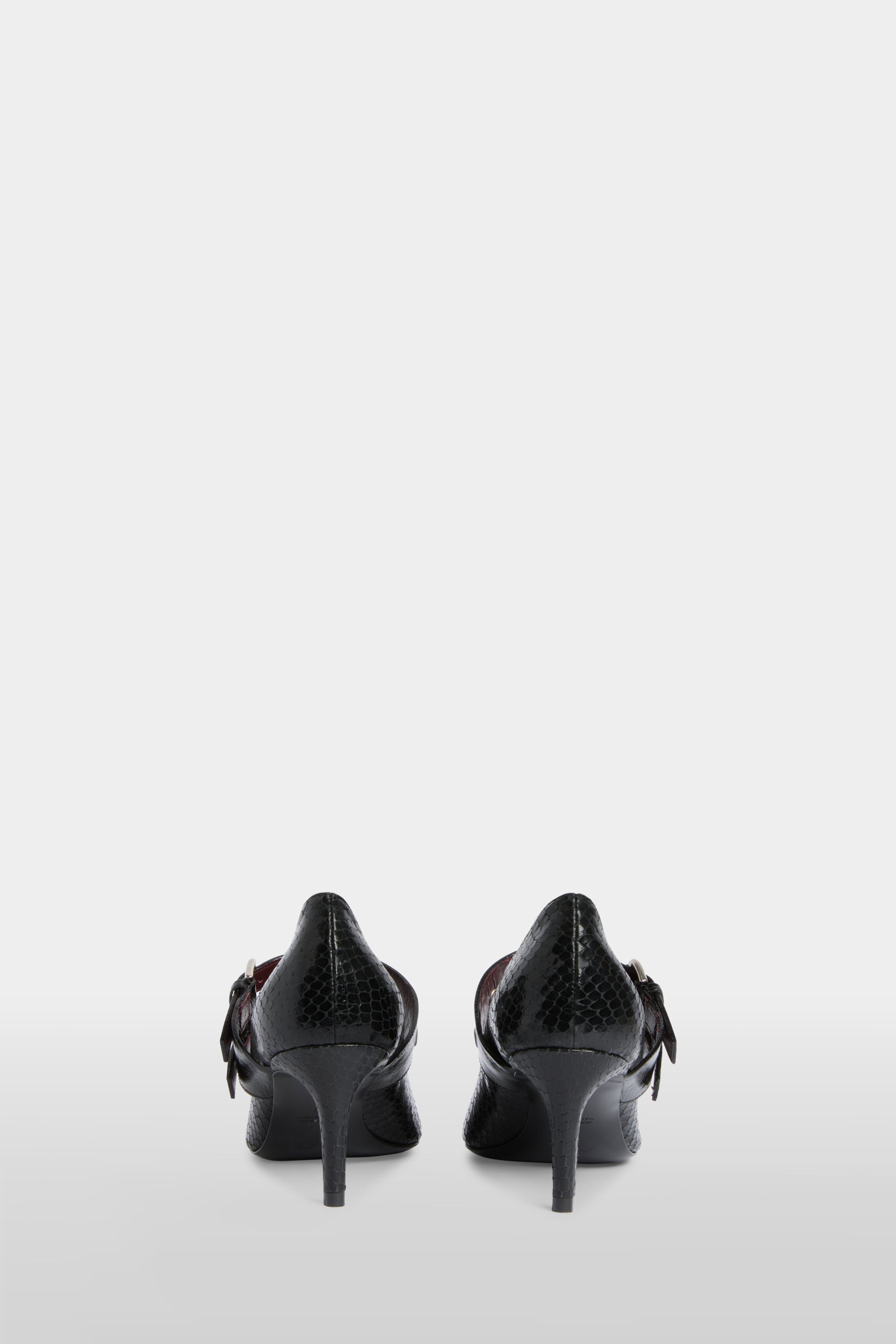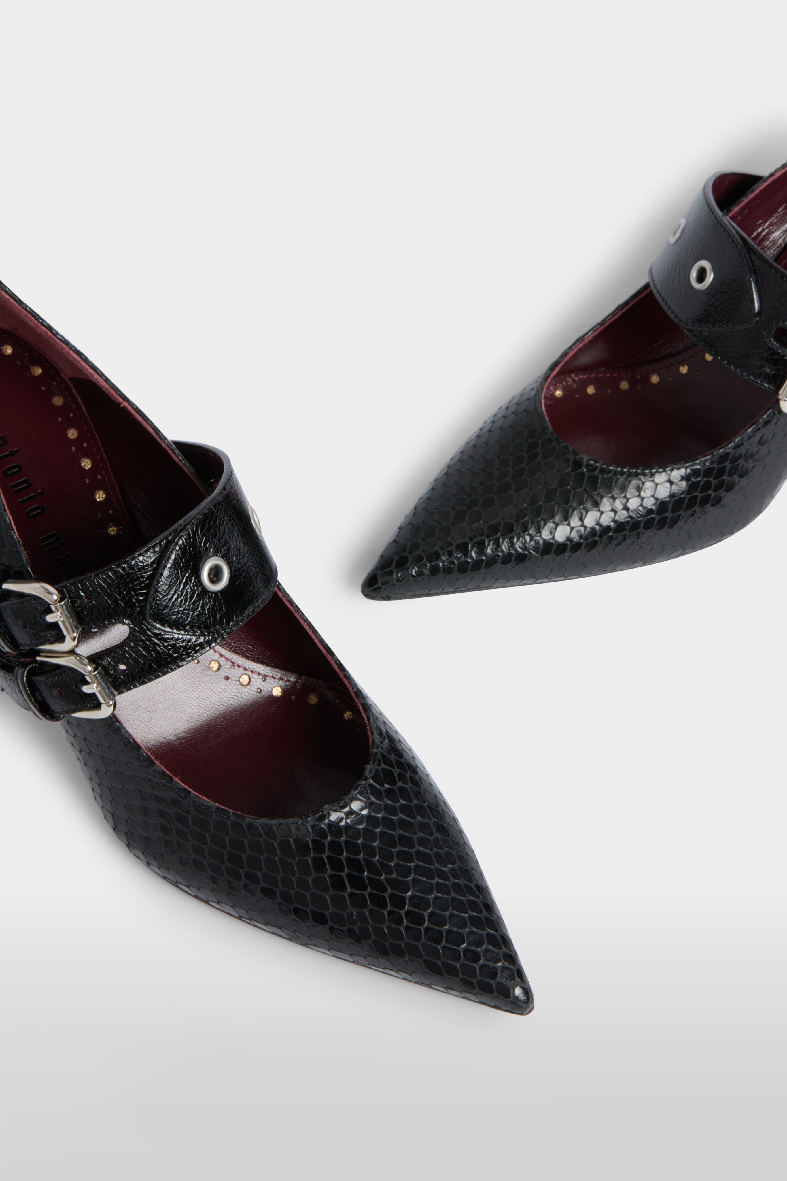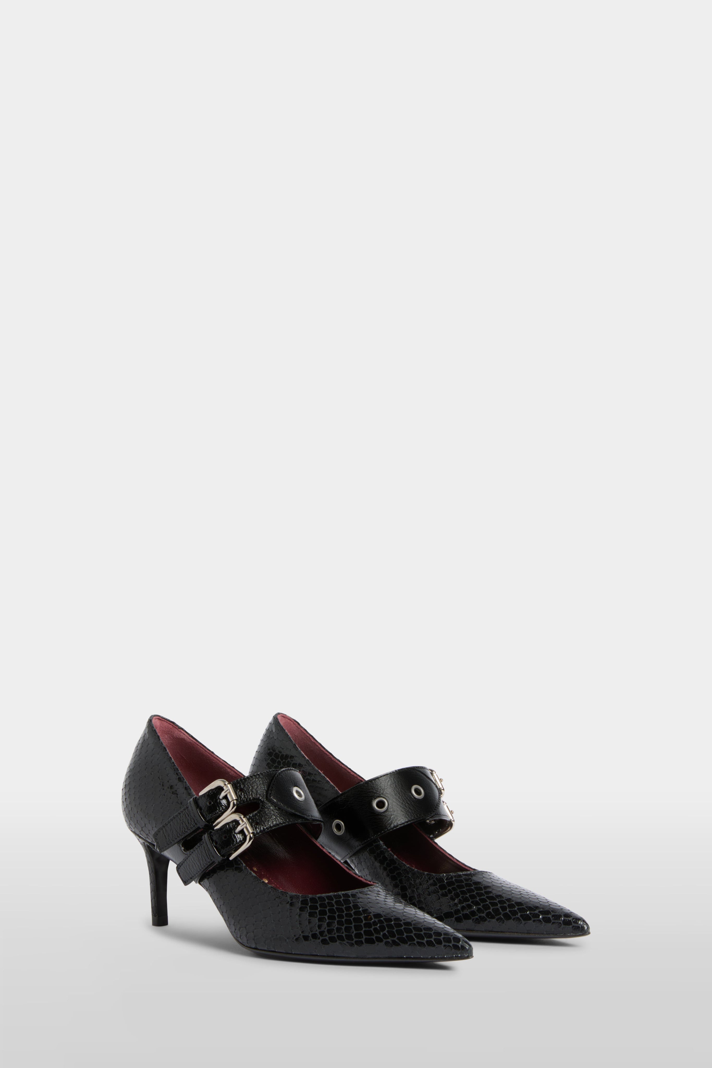 • Mary Jane pumps crafted in 100% goat leather with a glossy snakeskin effect. Featuring a pointed toe, mid-heel, and double buckle straps with eyelet details. A sophisticated design that blends classic elegance with modern edge.