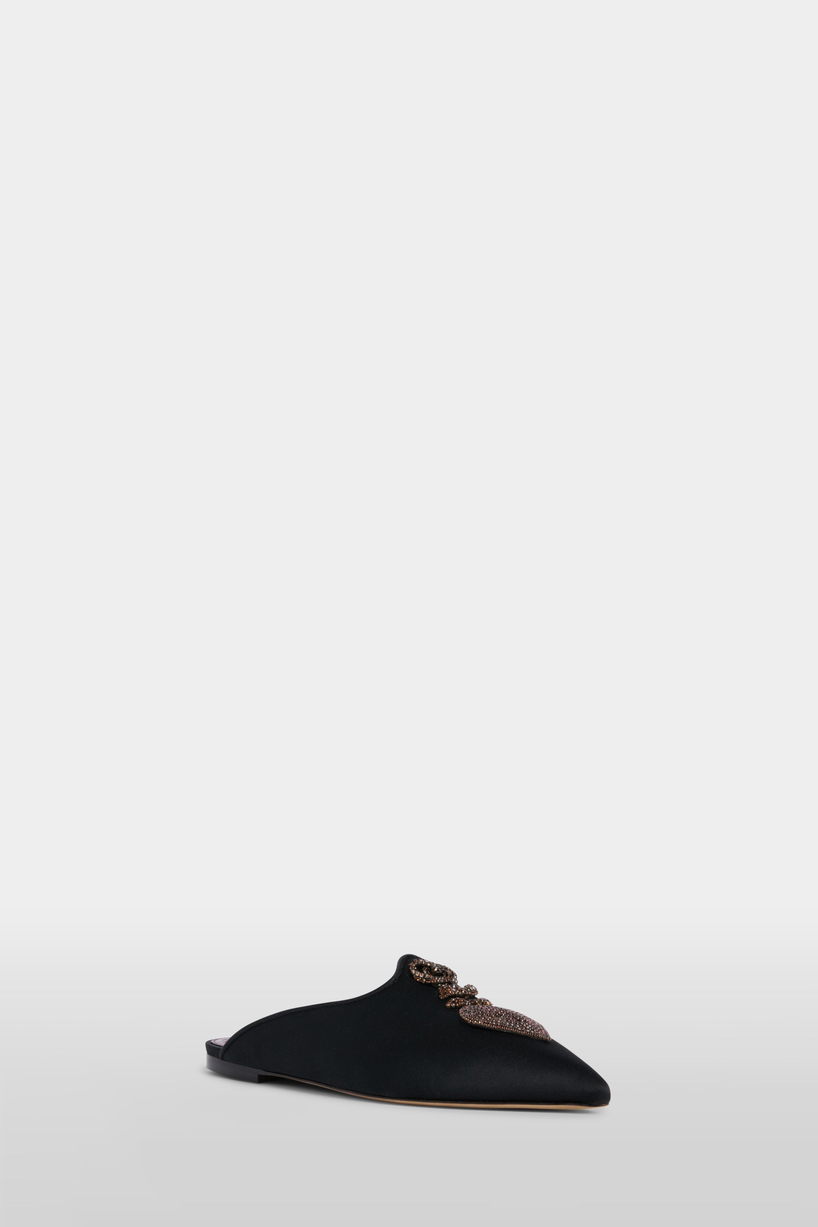 • Pointed satin mules embellished with a hand-applied beaded rose and heart motif. Clean lines and a low, slip-on silhouette create an elegant, effortless style. A refined statement piece for day-to-night looks.