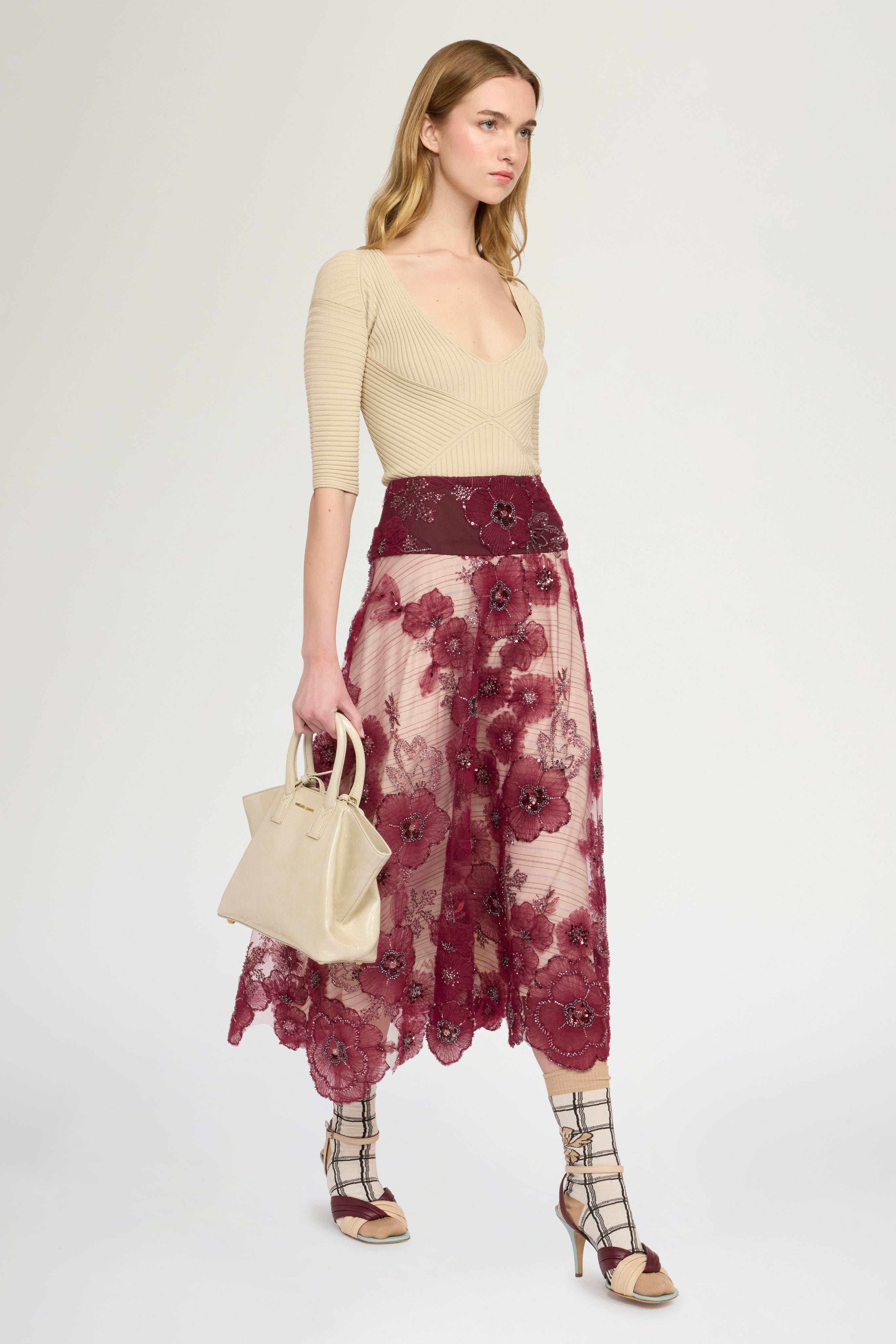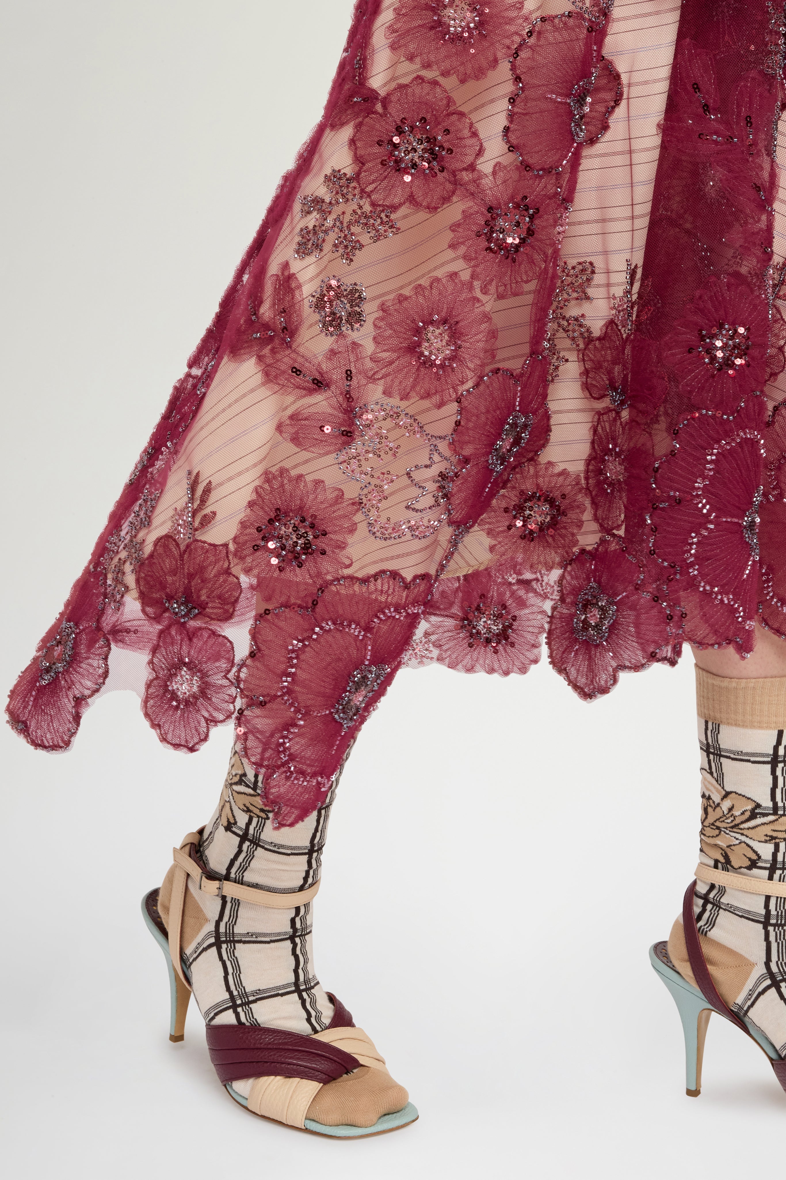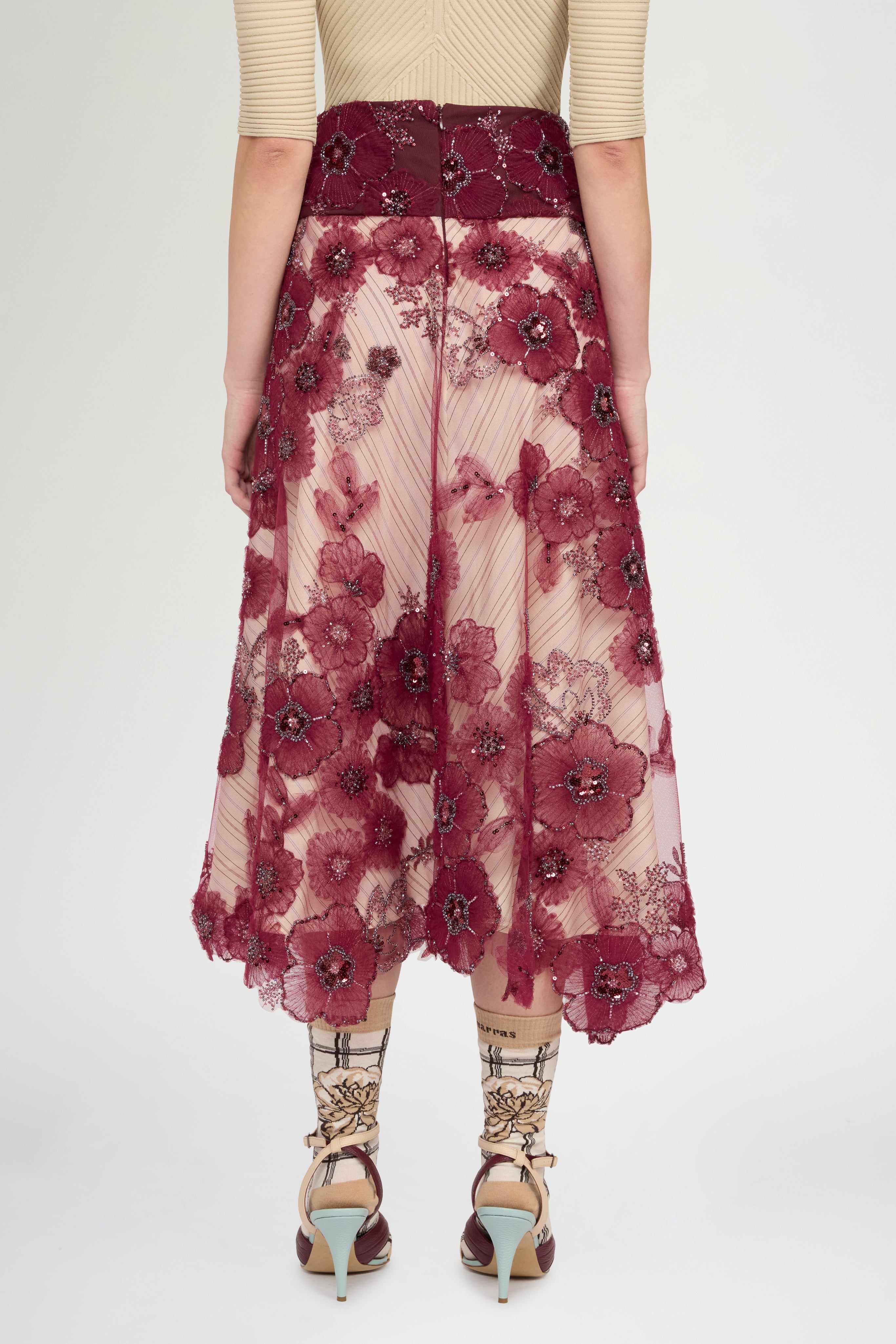 Circle skirt in embroidered tulle with flowers, beads, and ramage‑effect sequins. Structured basque and contrasting ivory striped lining underskirt. Regular fit and above‑ankle length.