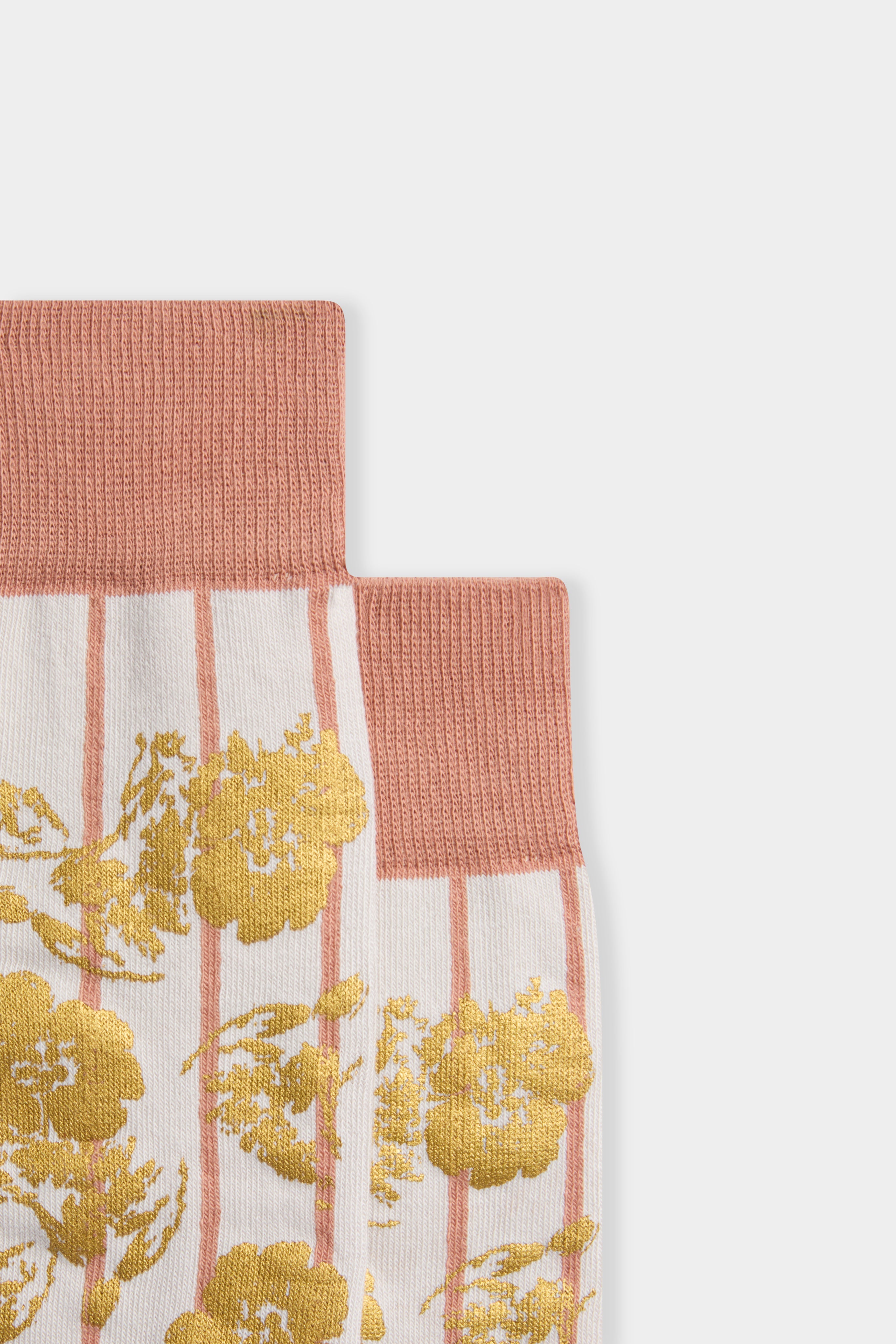 Knee-high socks with a striped base and golden floral jacquard motif. Finished with contrast ribbed cuffs, heel and toe in a soft rose hue. A refined accent to elevate everyday looks.