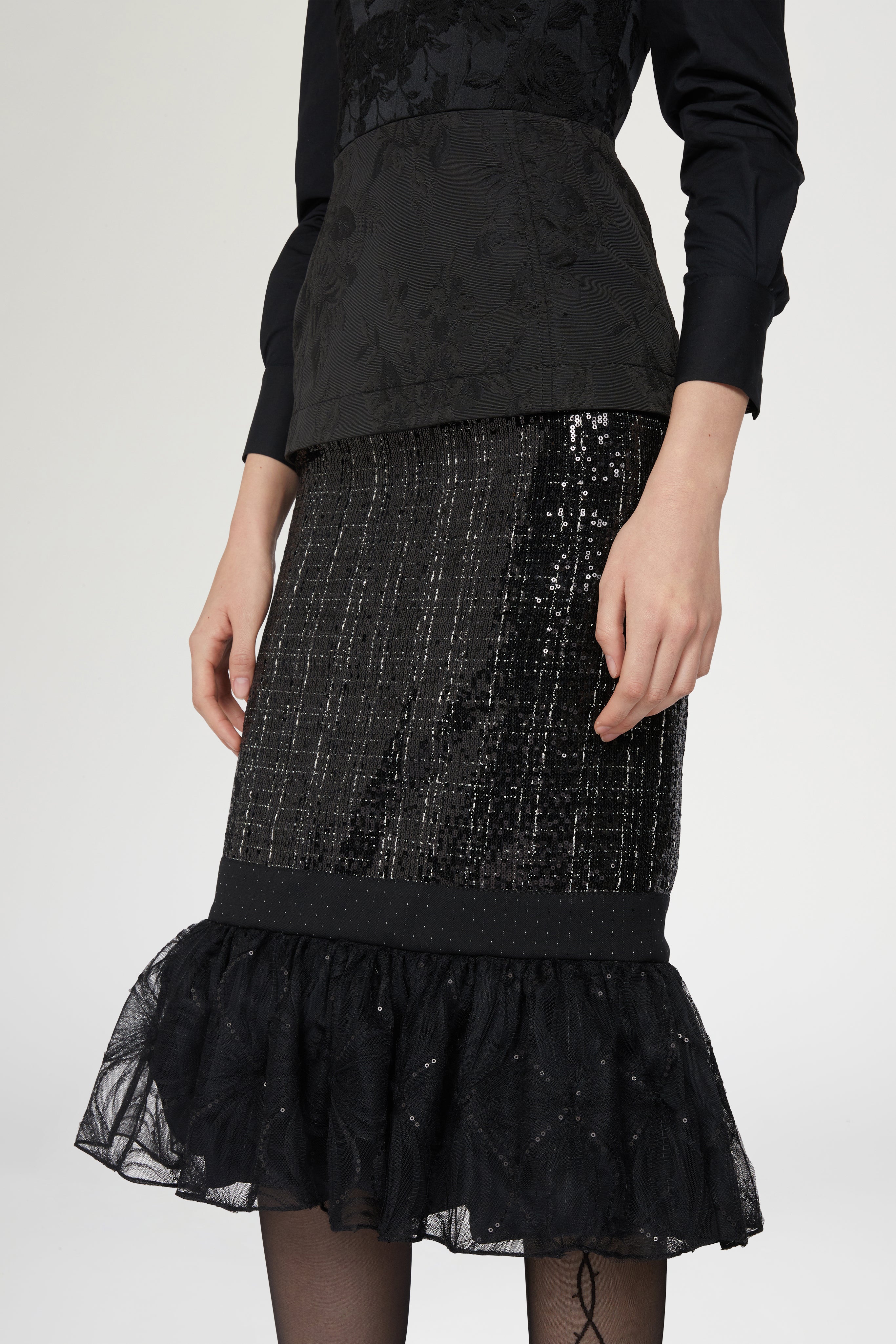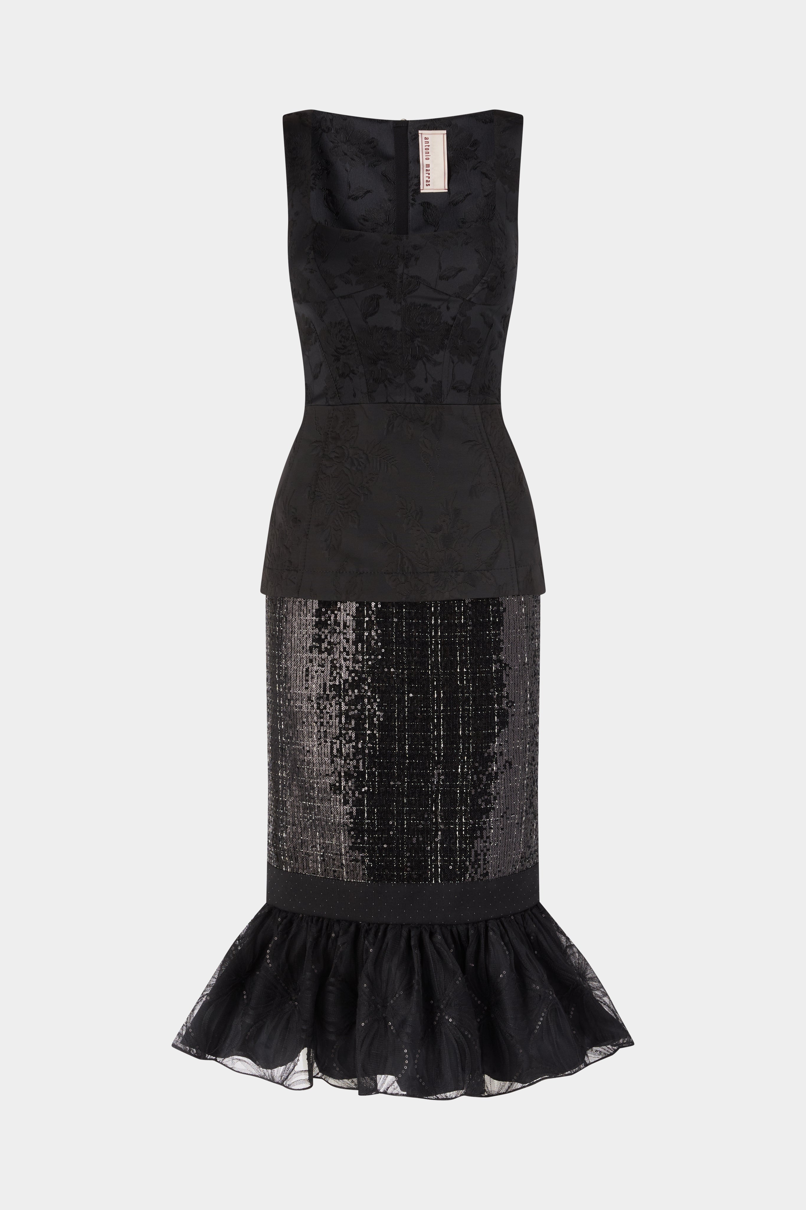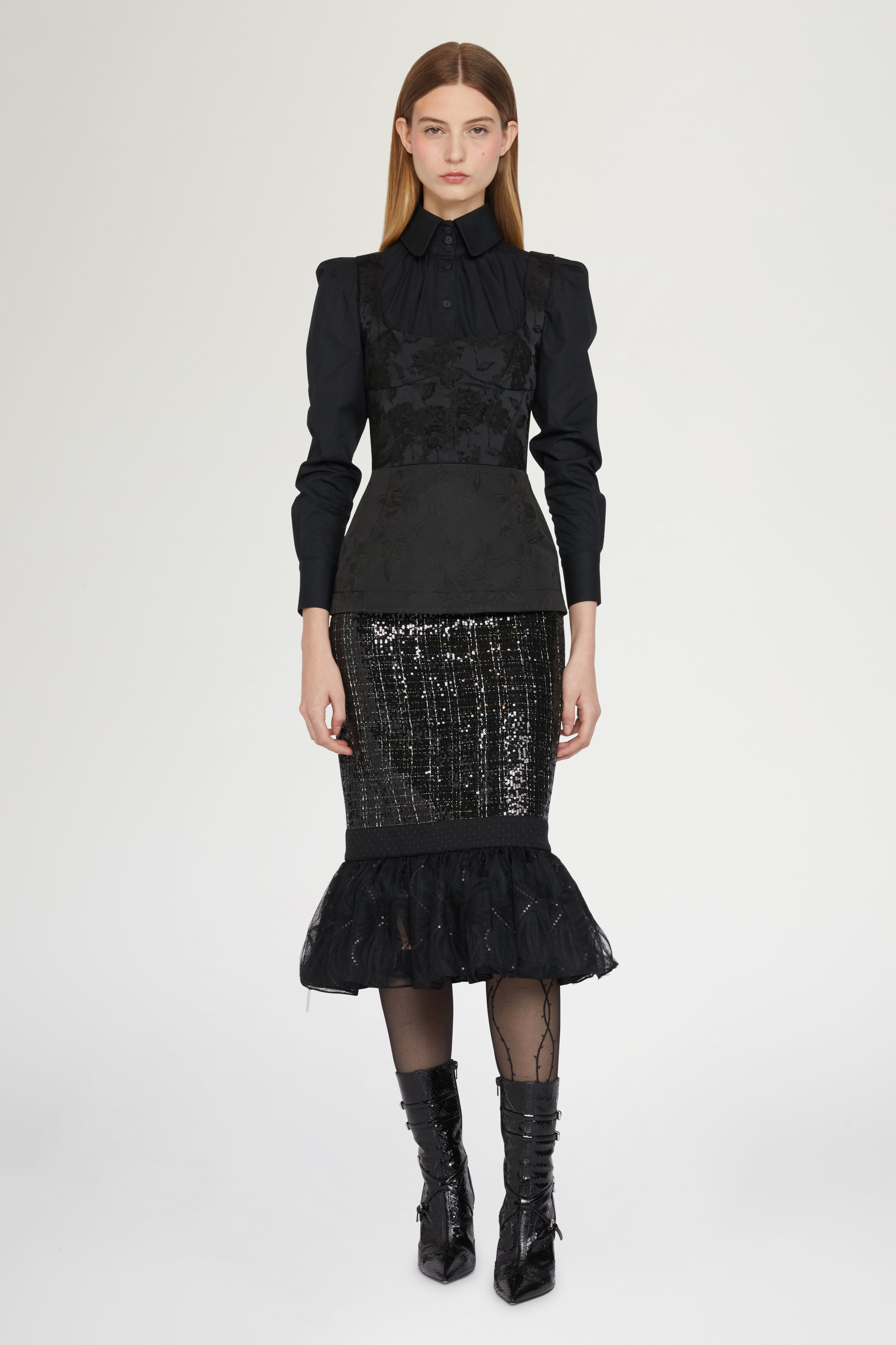 • Black bustier midi dress with jacquard bodice and sequin skirt, finished with a flared tulle hem. Features a fitted silhouette that enhances the waist and creates a feminine, structured shape.