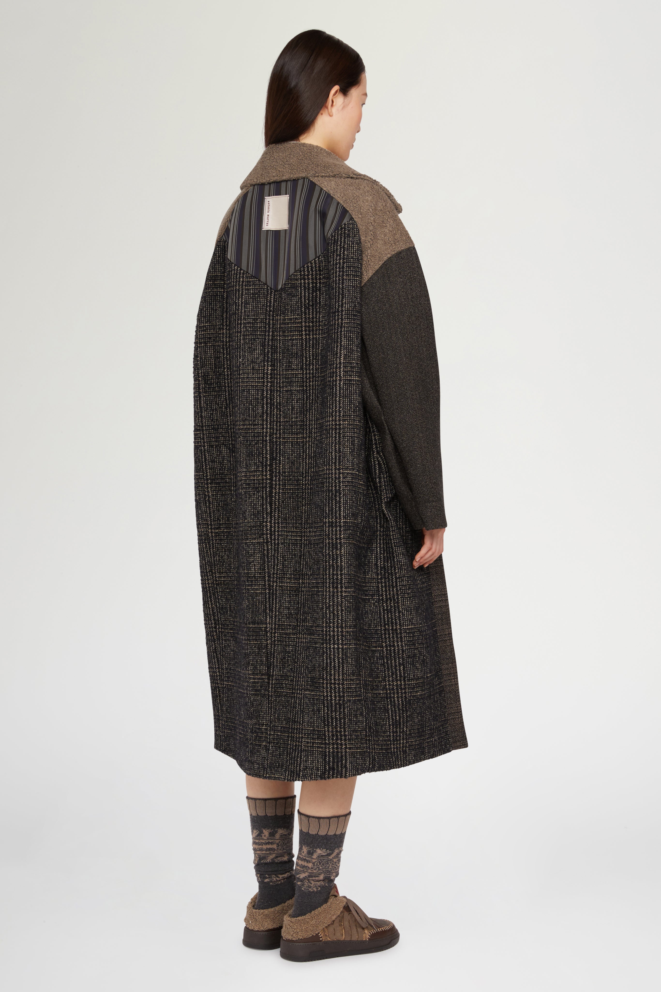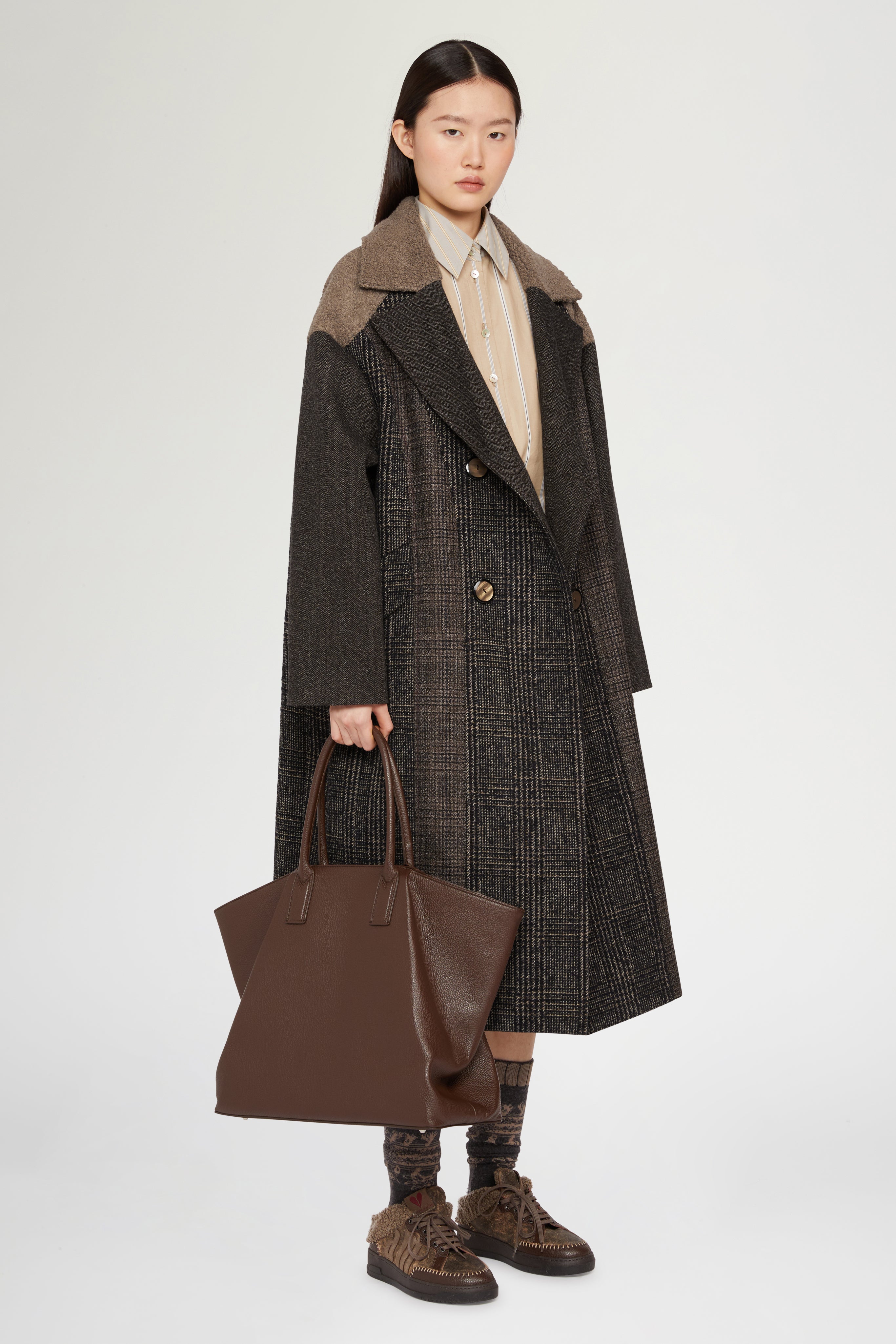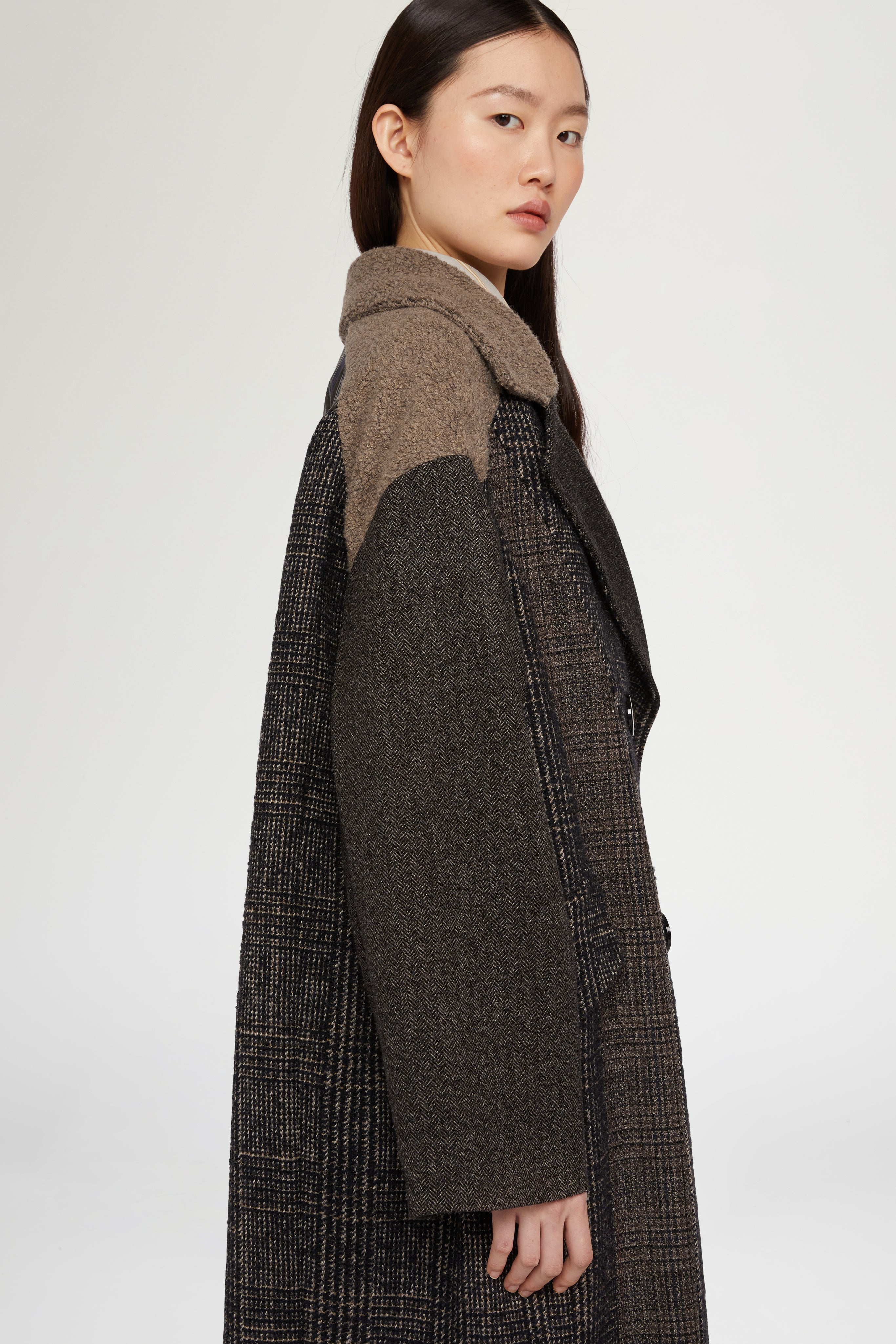 Wool-blend coat with a tailored design, featuring a mix of check and herringbone panels enriched with shearling-style bouclé details. The oversized silhouette and double-breasted cut combine elegance and comfort.