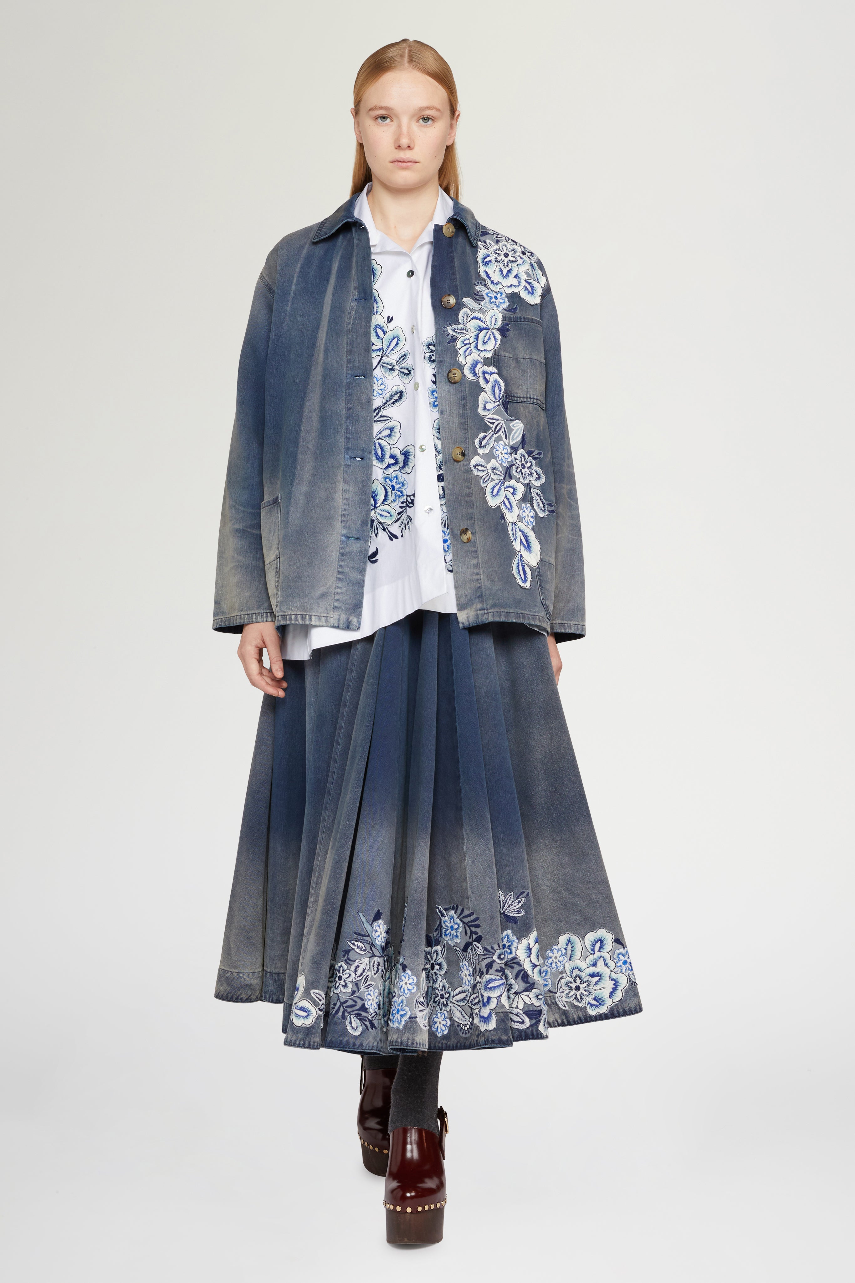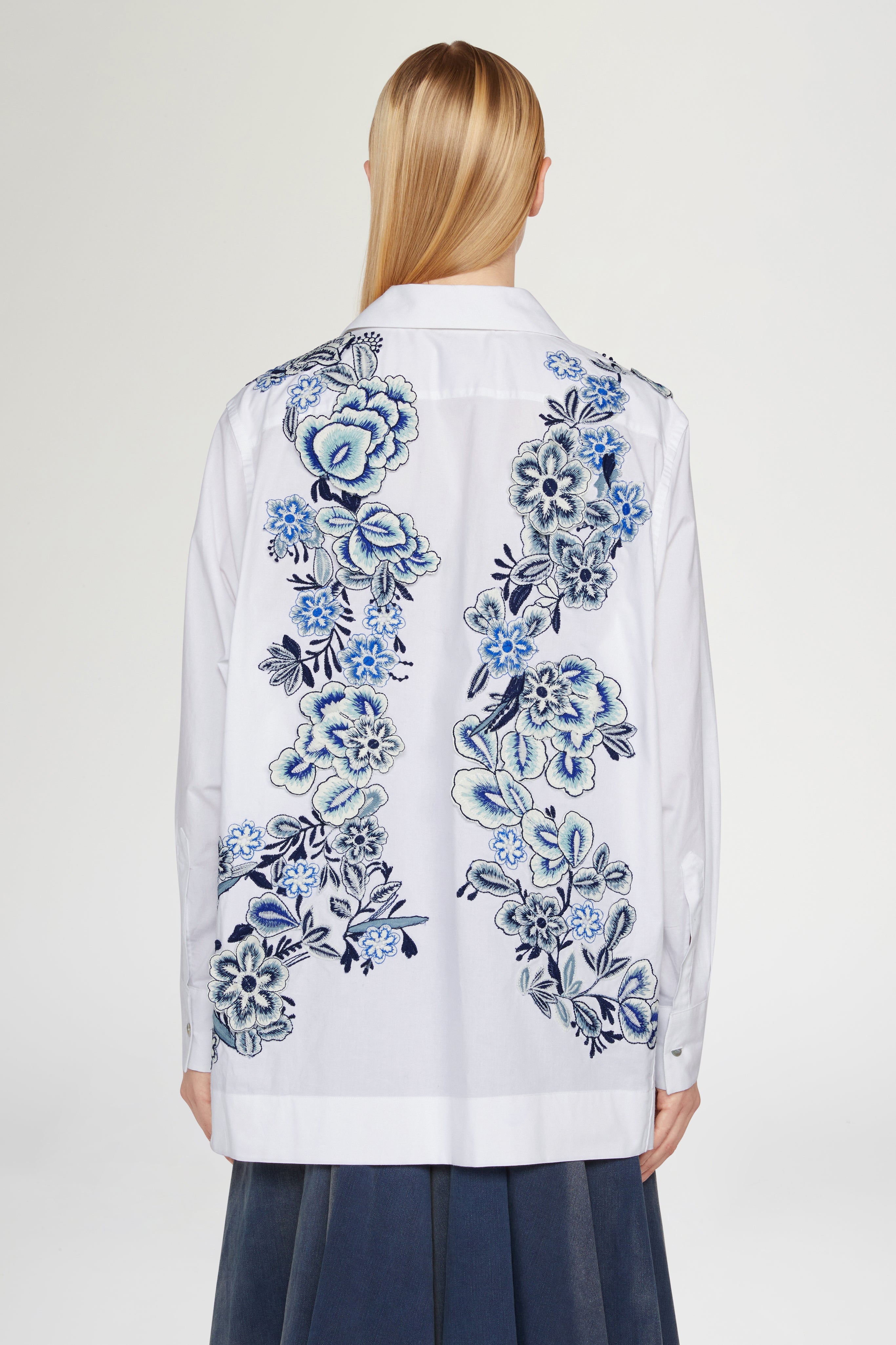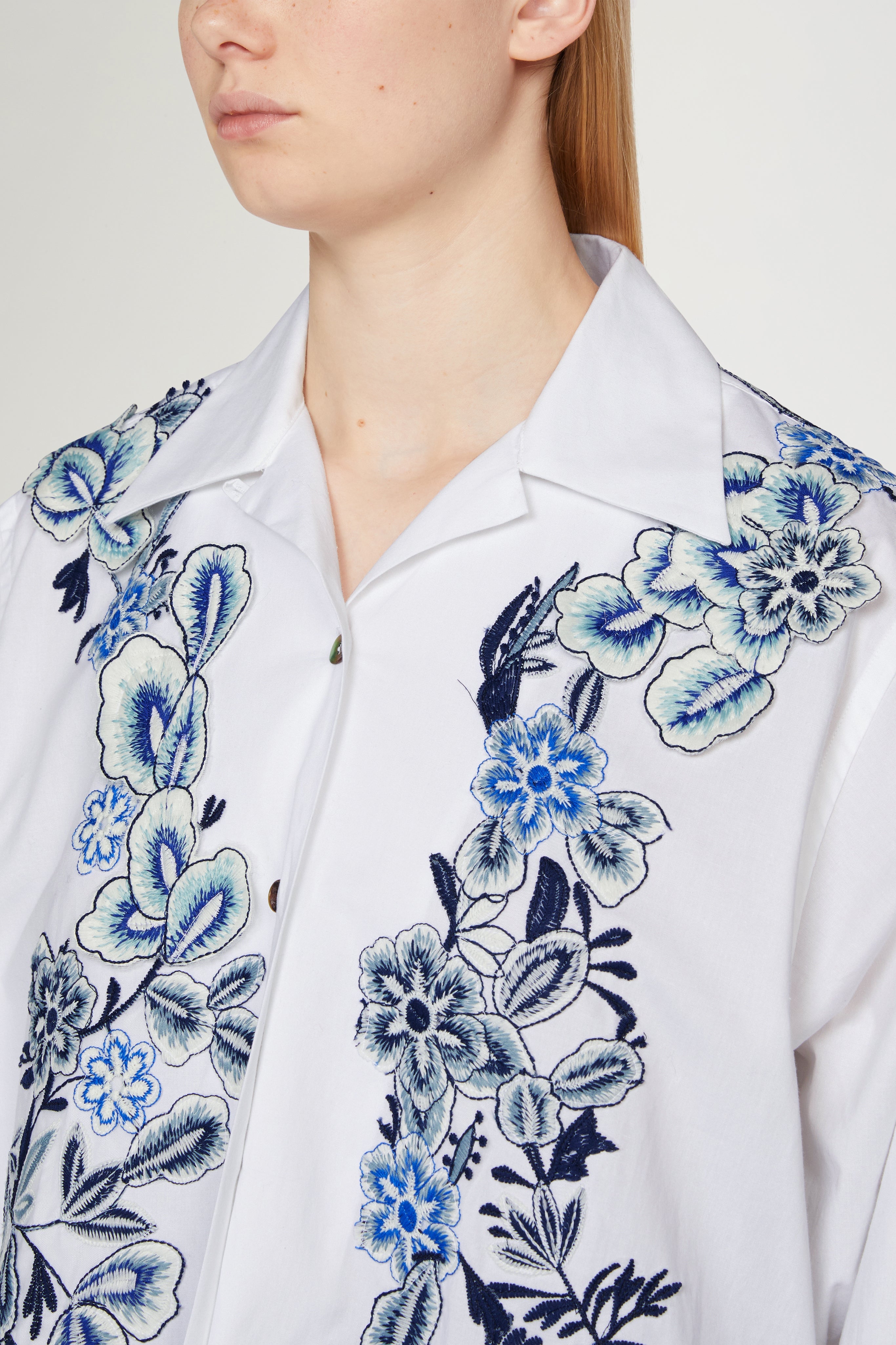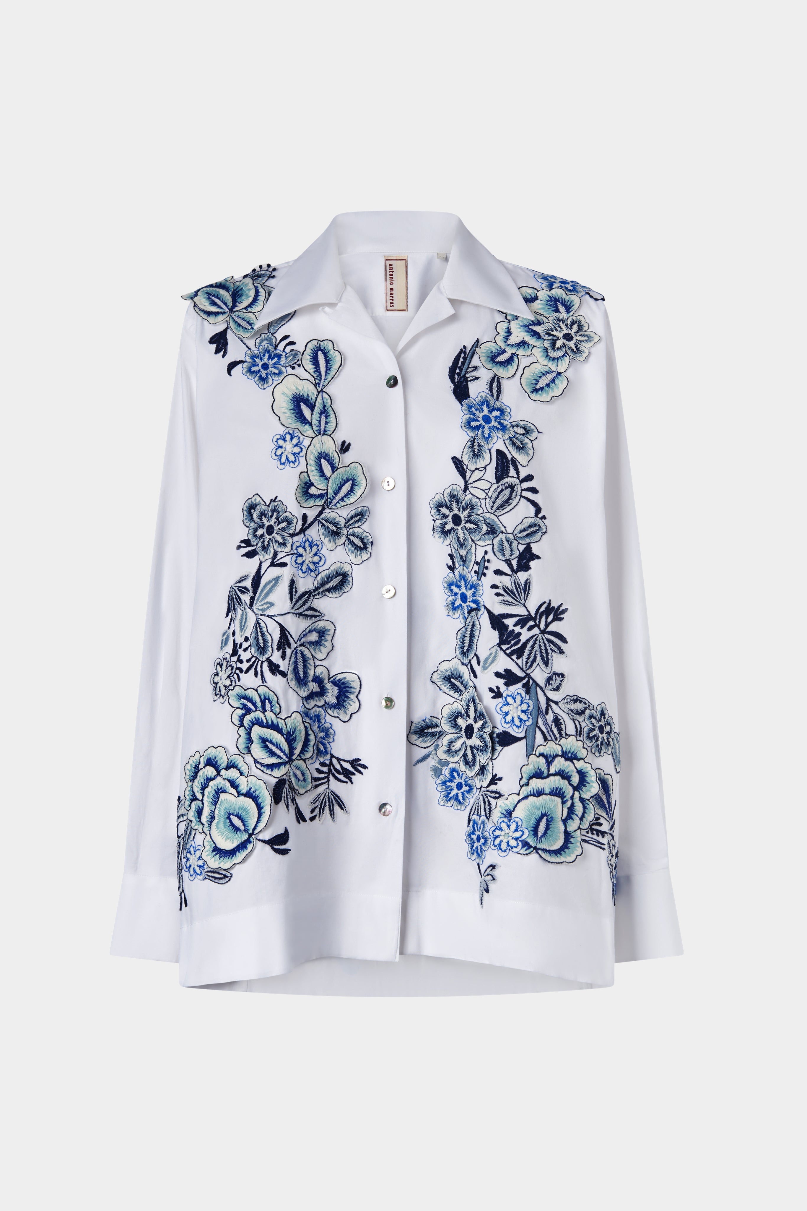 • White embroidered shirt with intricate floral motifs in shades of blue. Crafted from crisp cotton, it features a relaxed silhouette, combining timeless elegance and artisanal detail.