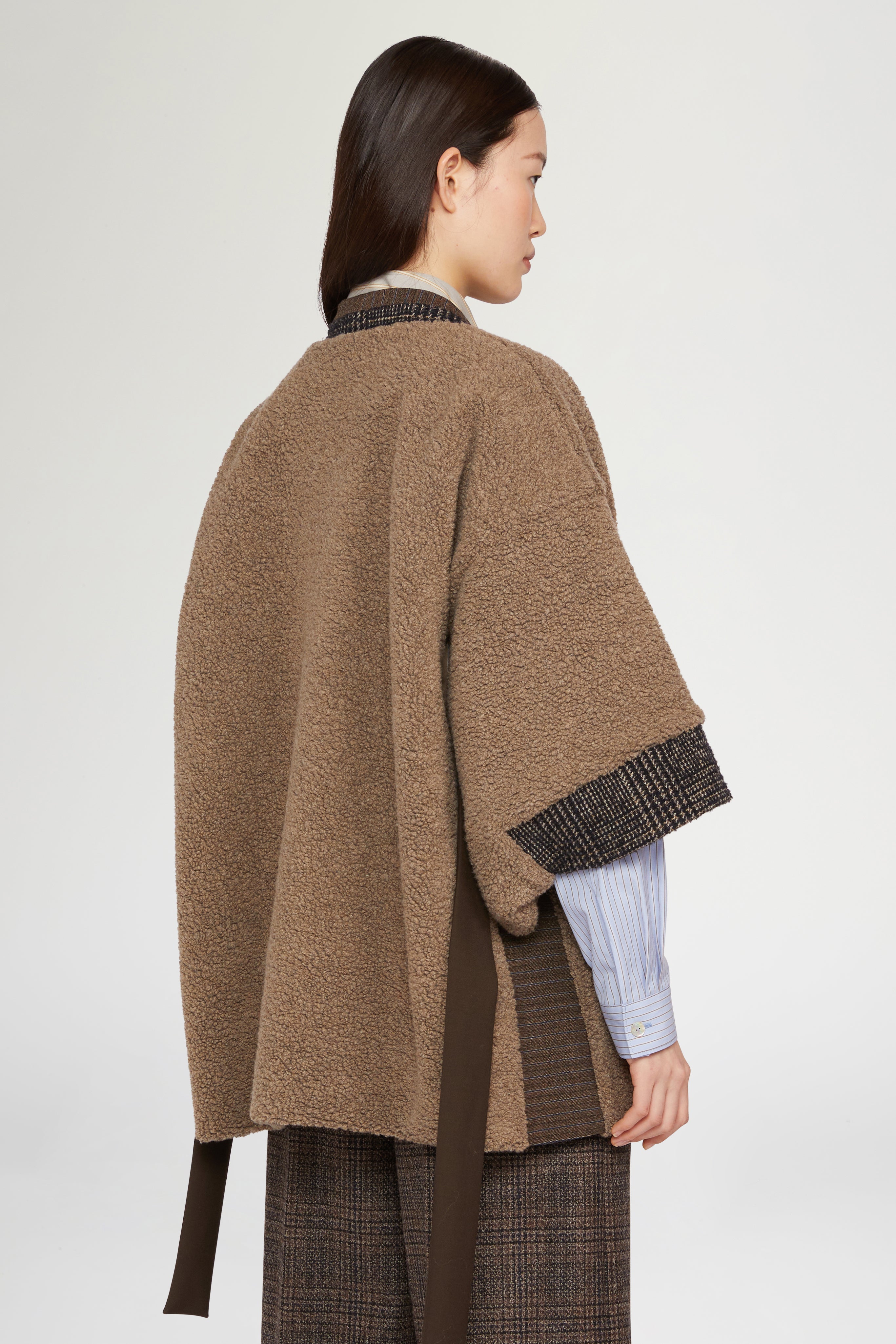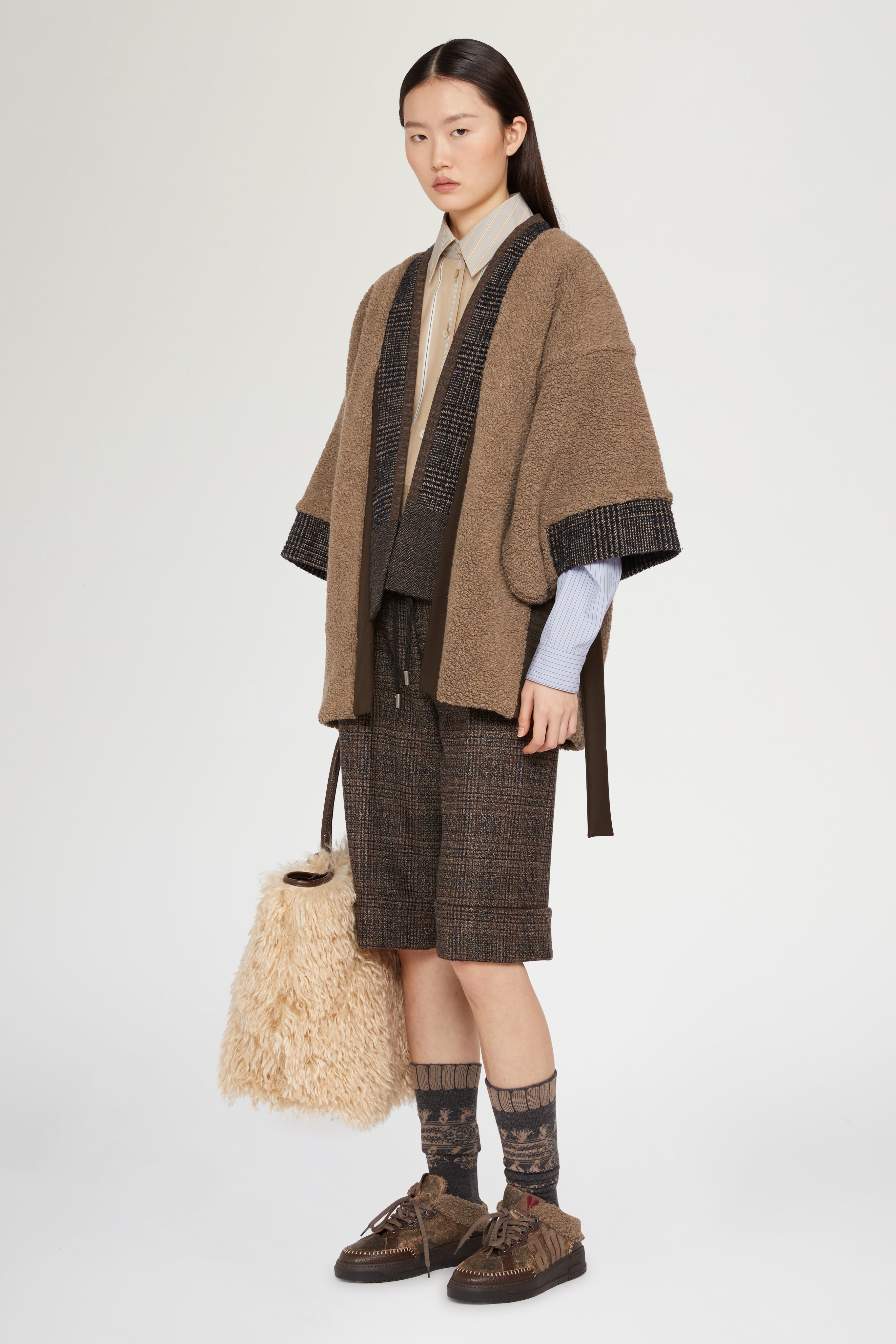 This women's kimono features a soft wool and cashmere blend, enhanced by checked trims and quilted lining. The relaxed silhouette and belt closure offer comfort and versatility. A tactile layering piece with refined contrast.