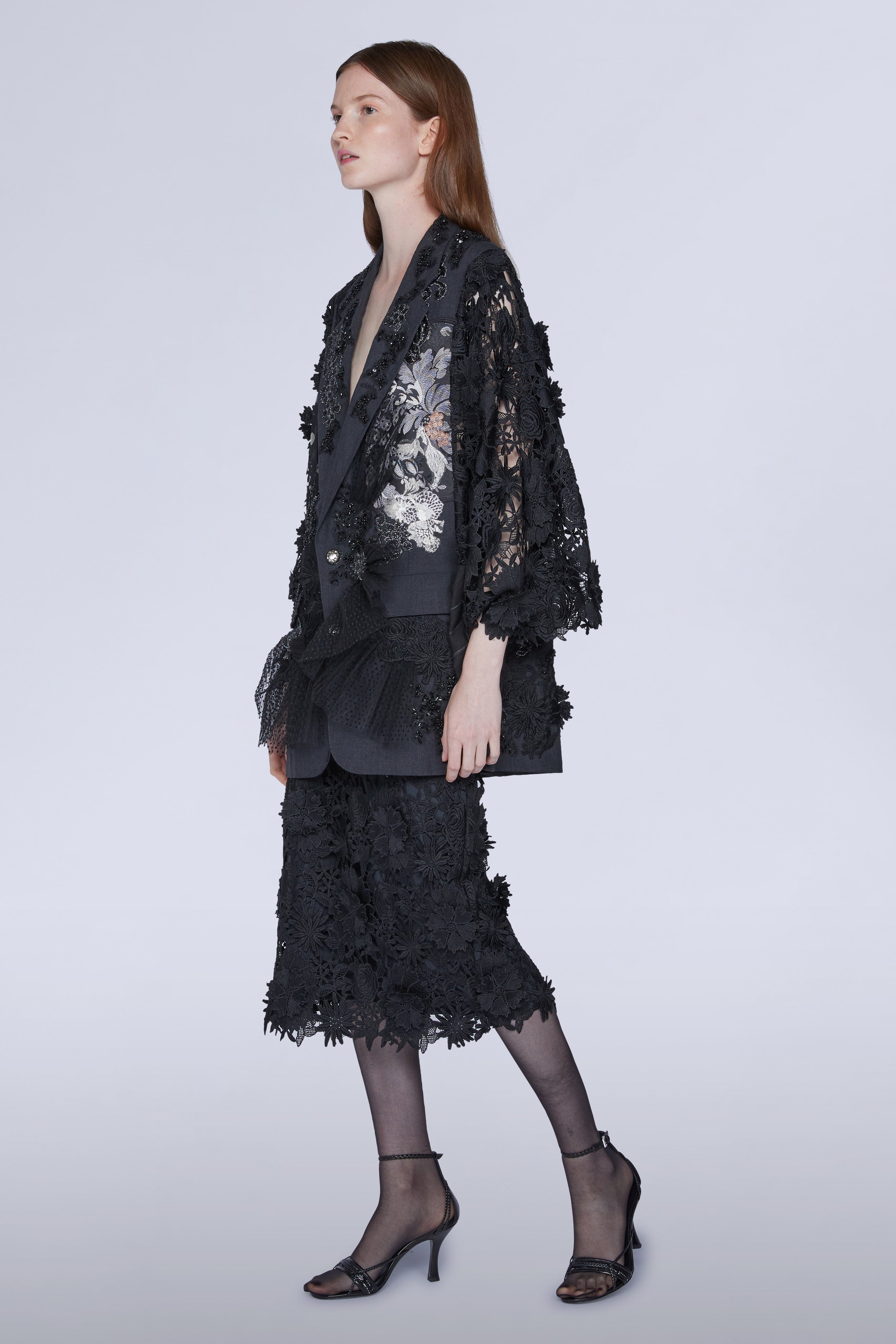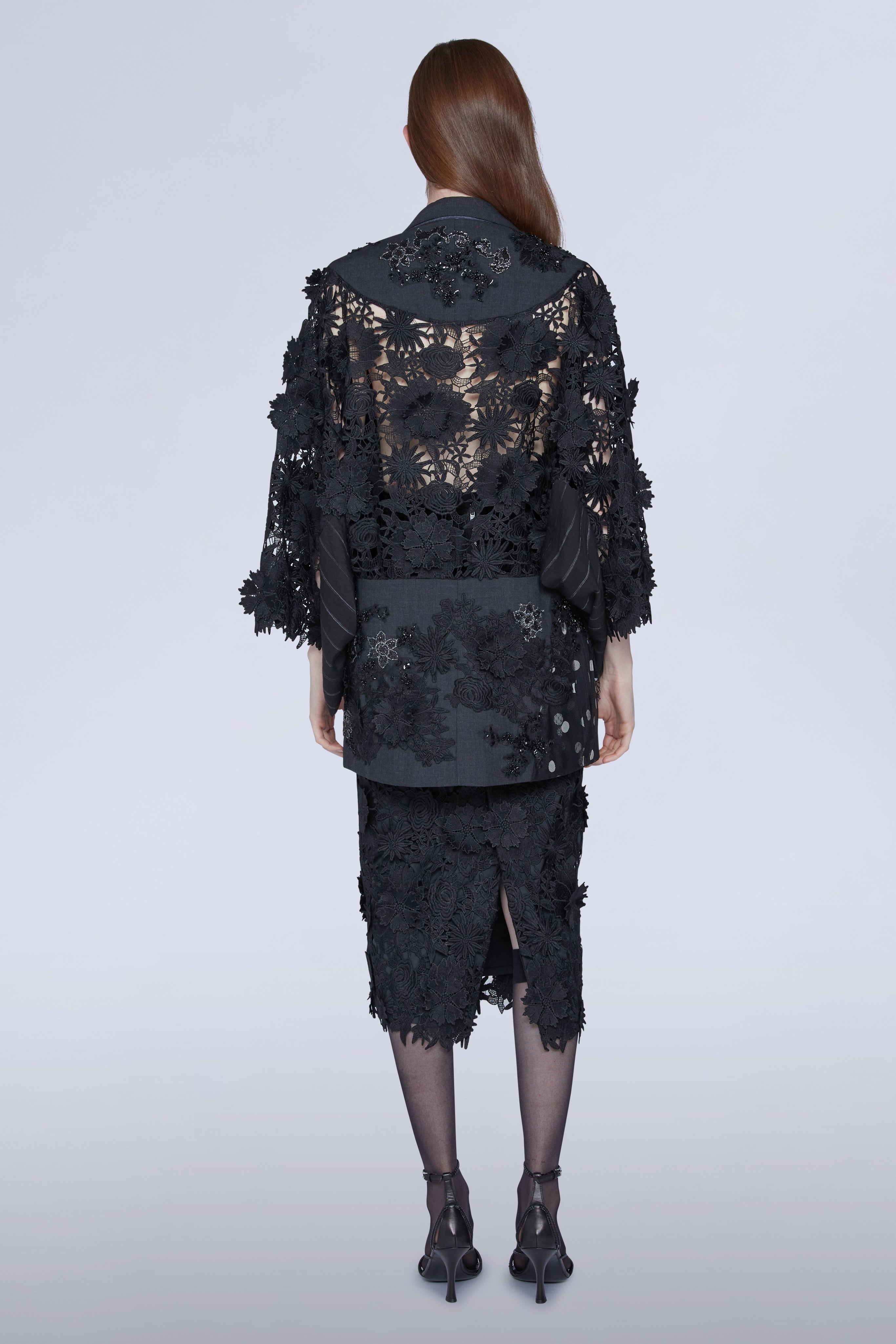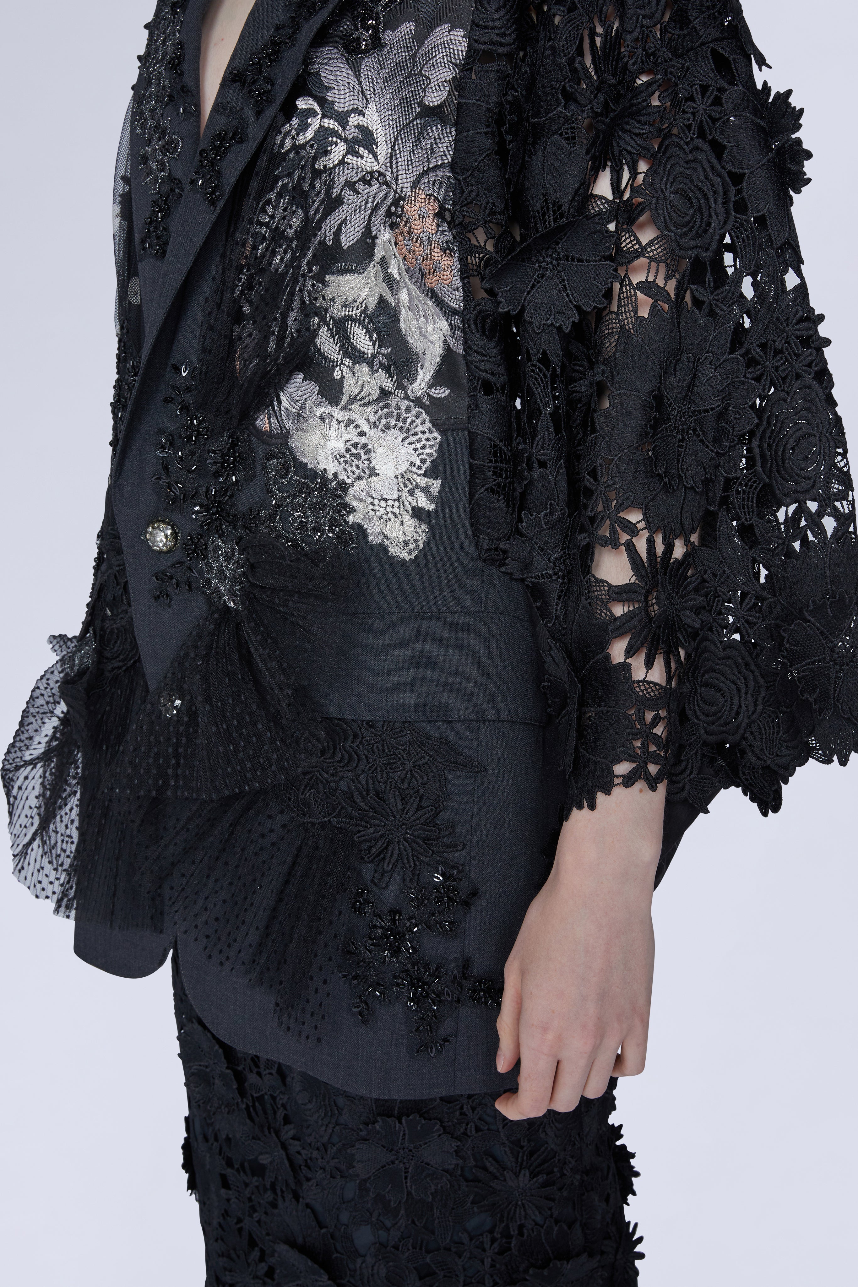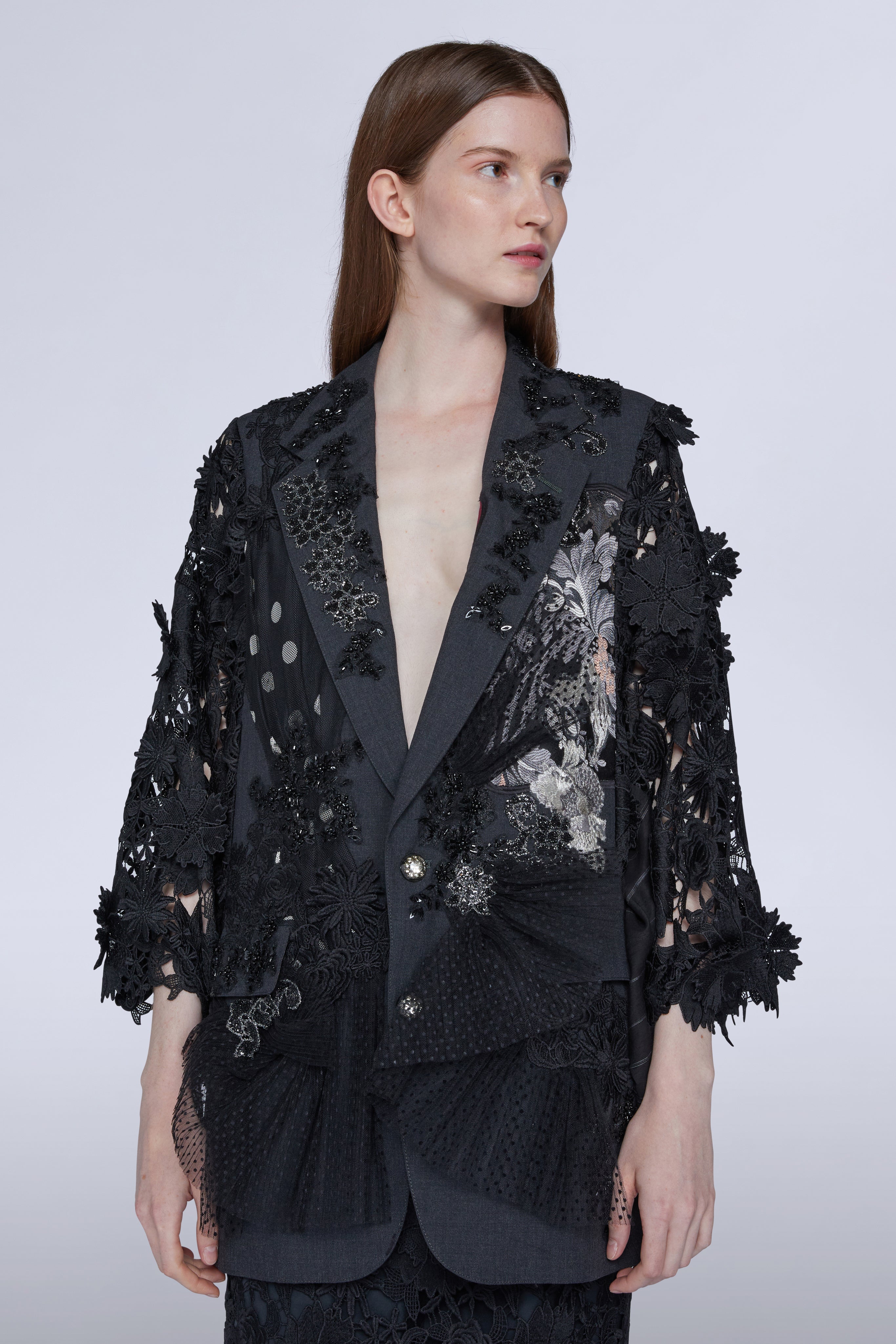• Tailored black blazer with intricate floral embroidery and sparkling embellishments, complemented by lace sleeves.