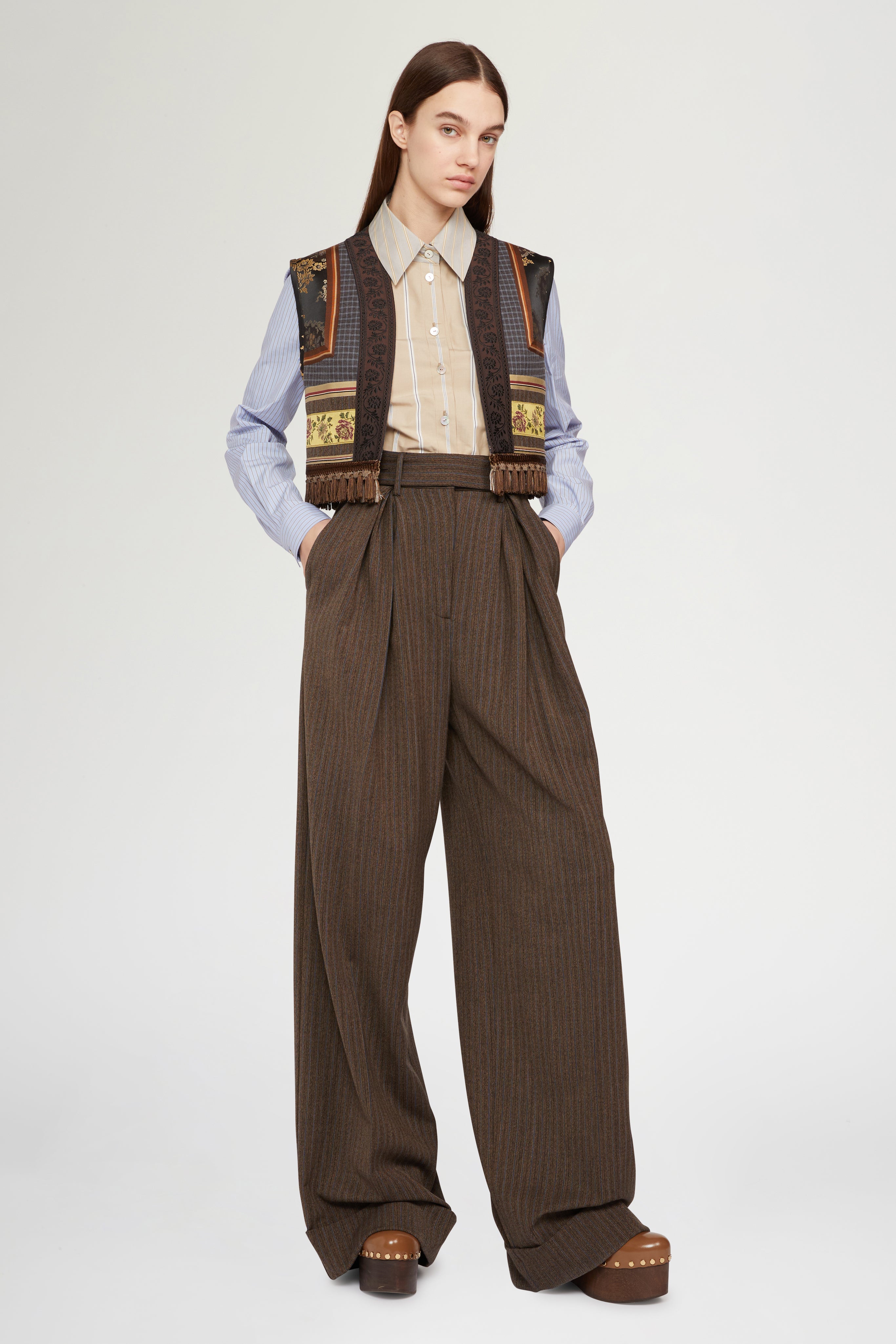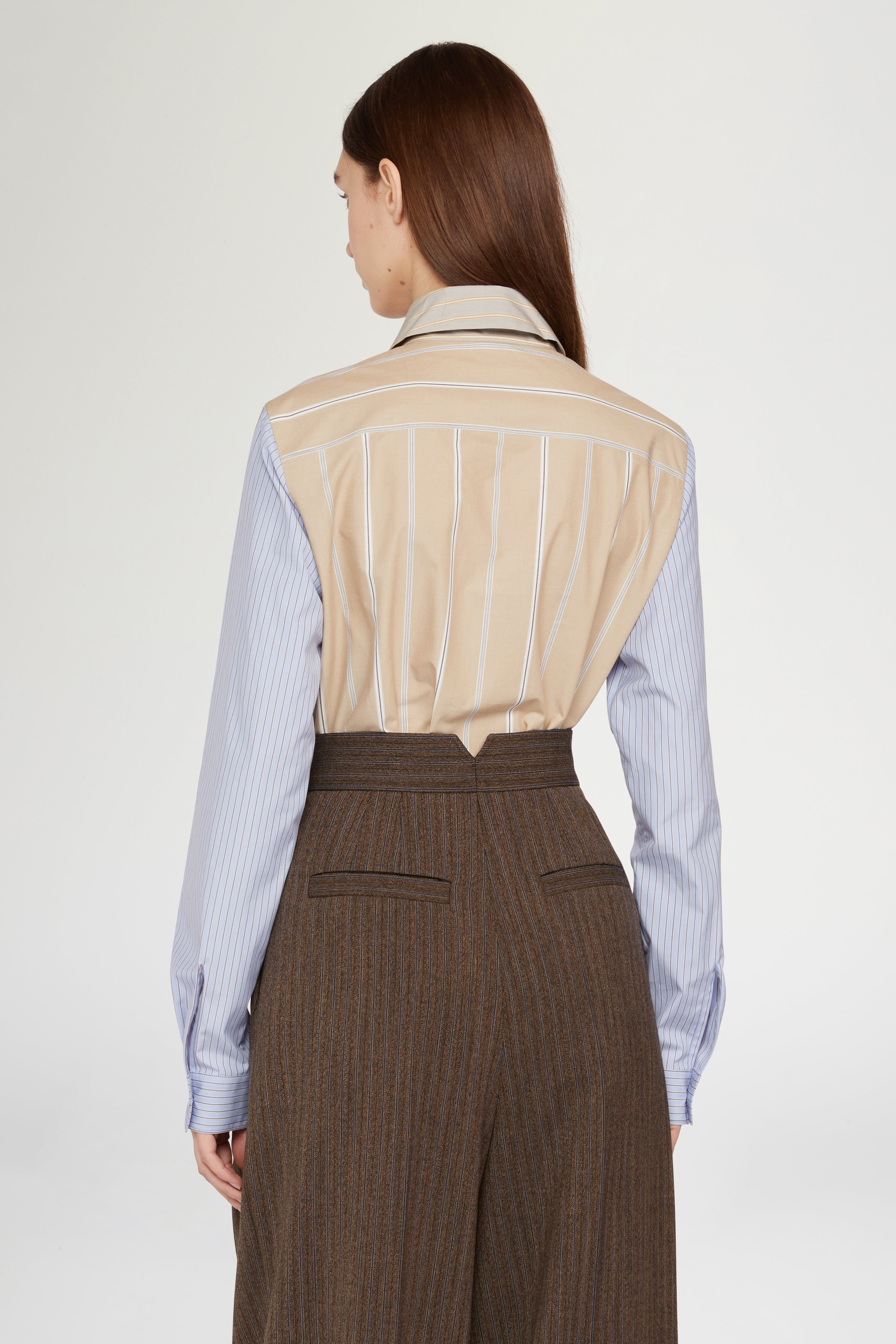 Slim-fit women’s shirt crafted from 100% cotton, featuring a contrasting striped design with beige front panel and blue sleeves. A refined take on classic shirting with a contemporary twist.