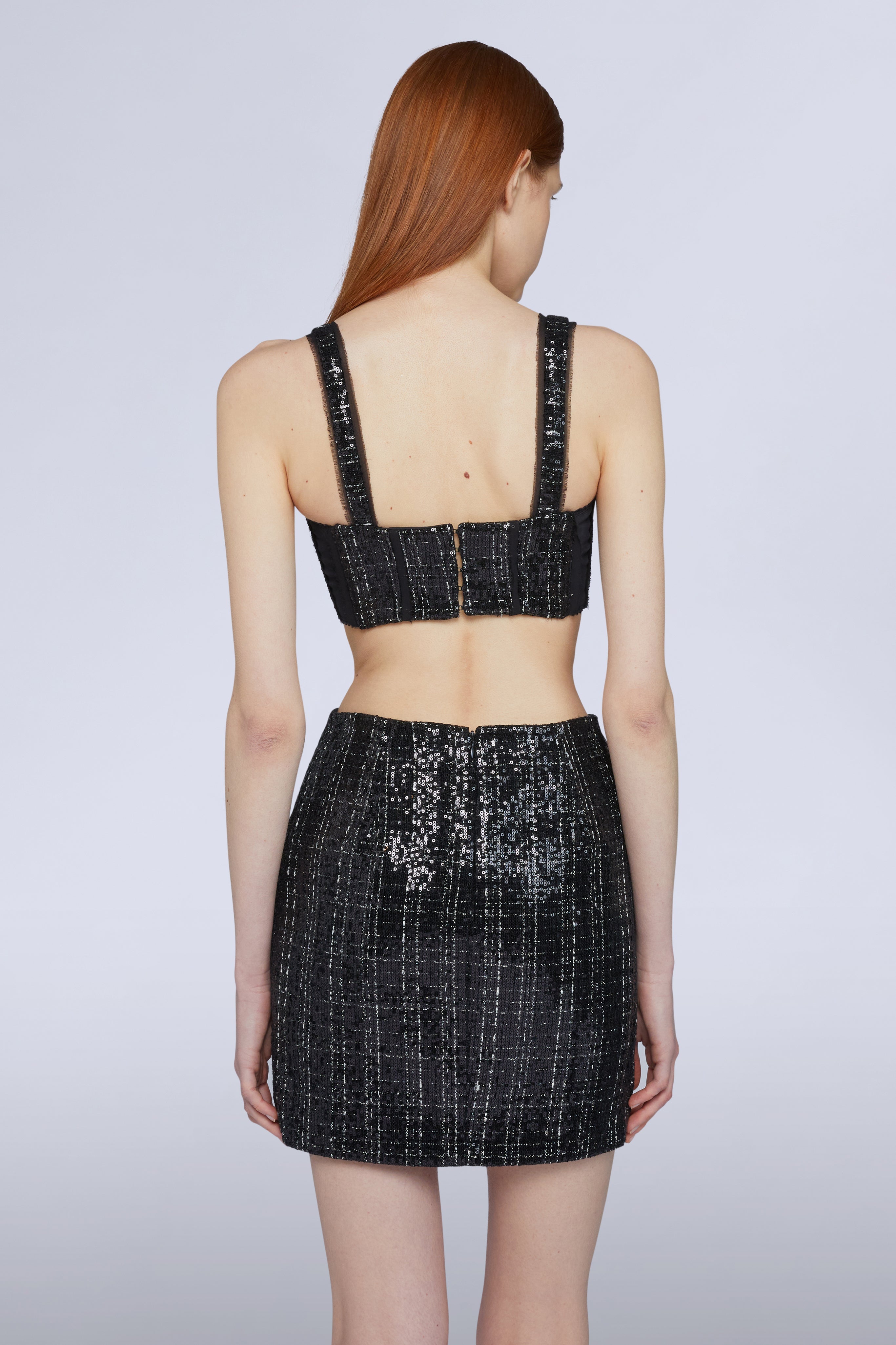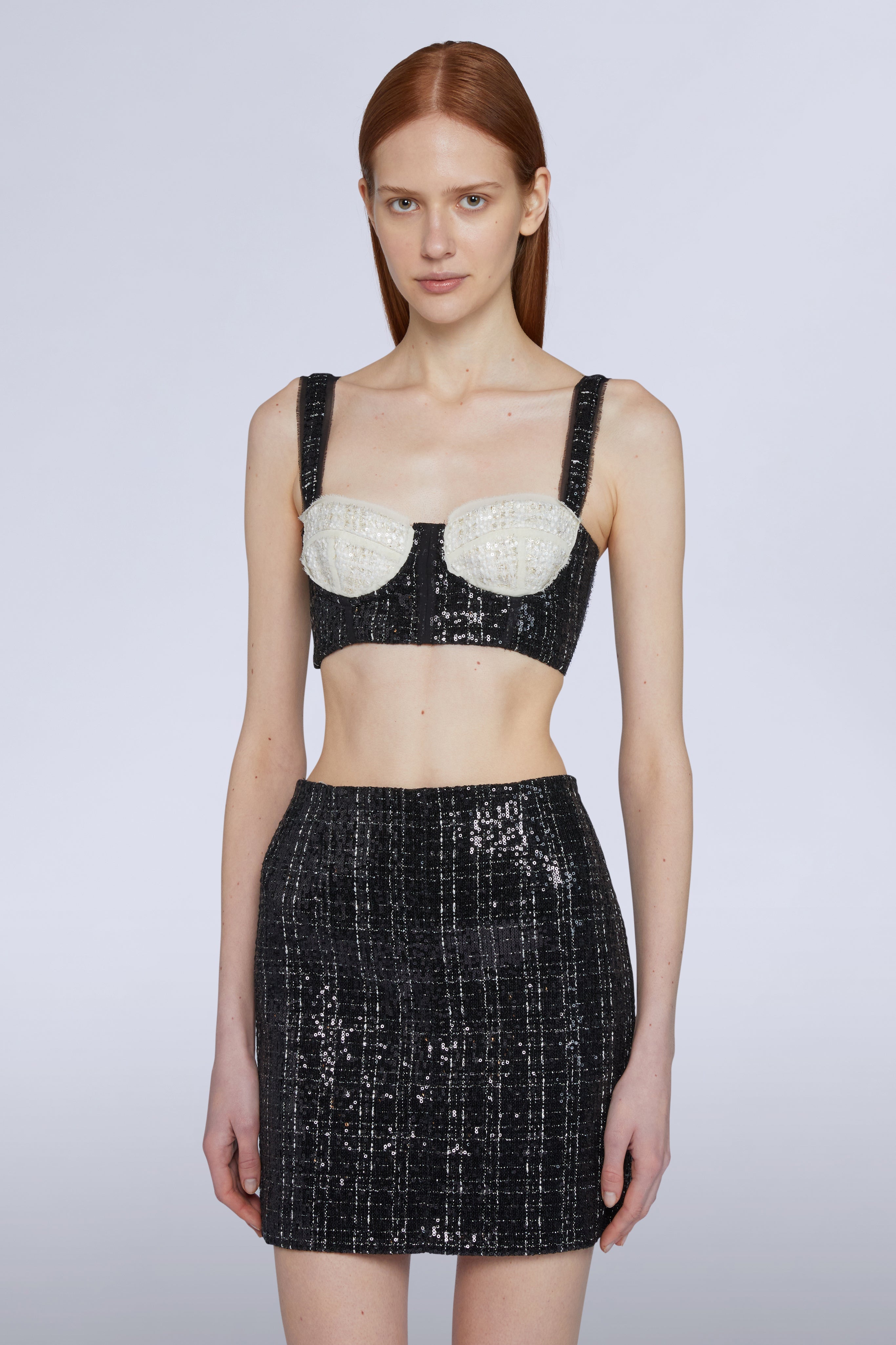 • Structured bra top crafted from black and ivory tweed with tonal sequins. Features contrast cups, raw edges, and wide embellished straps.