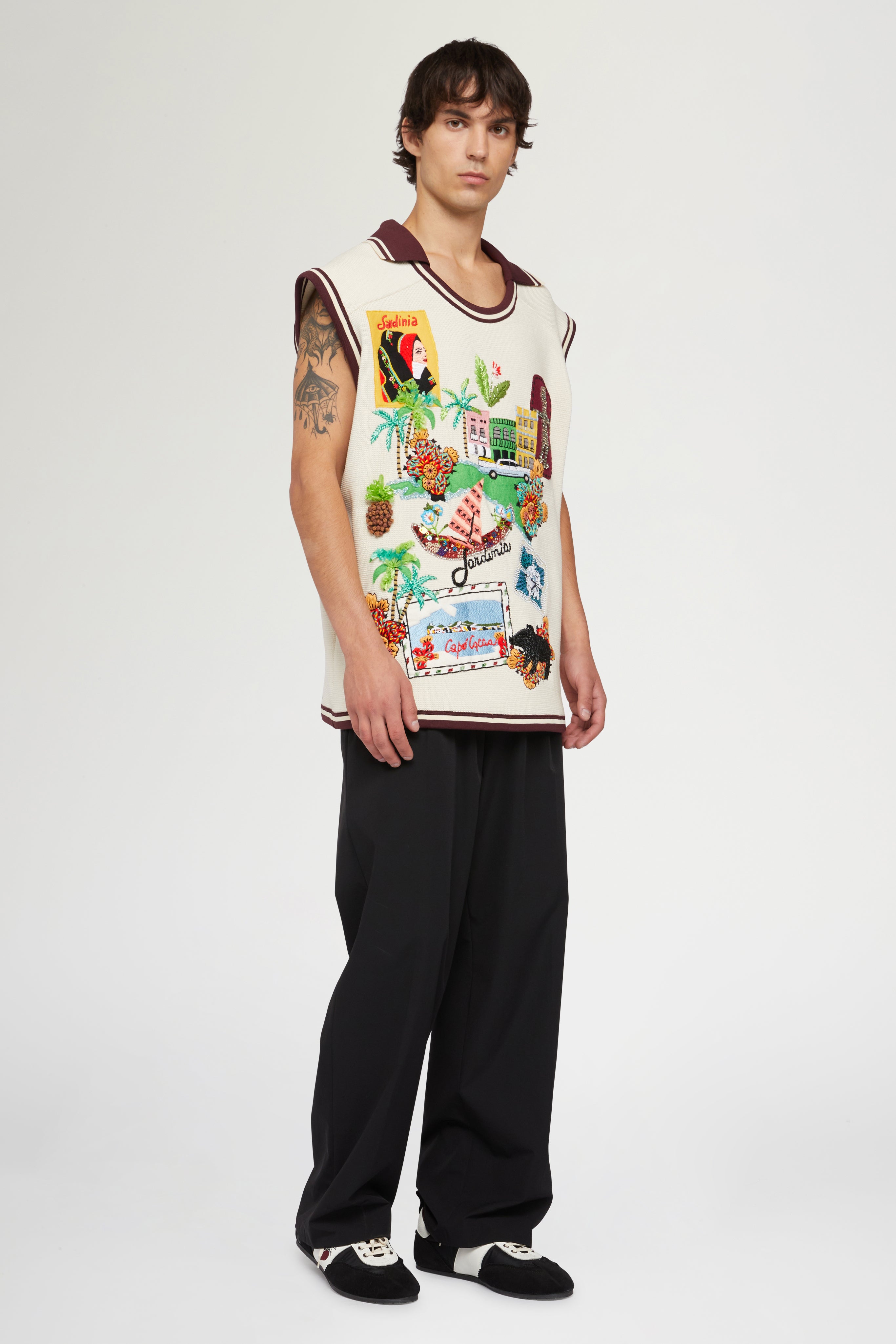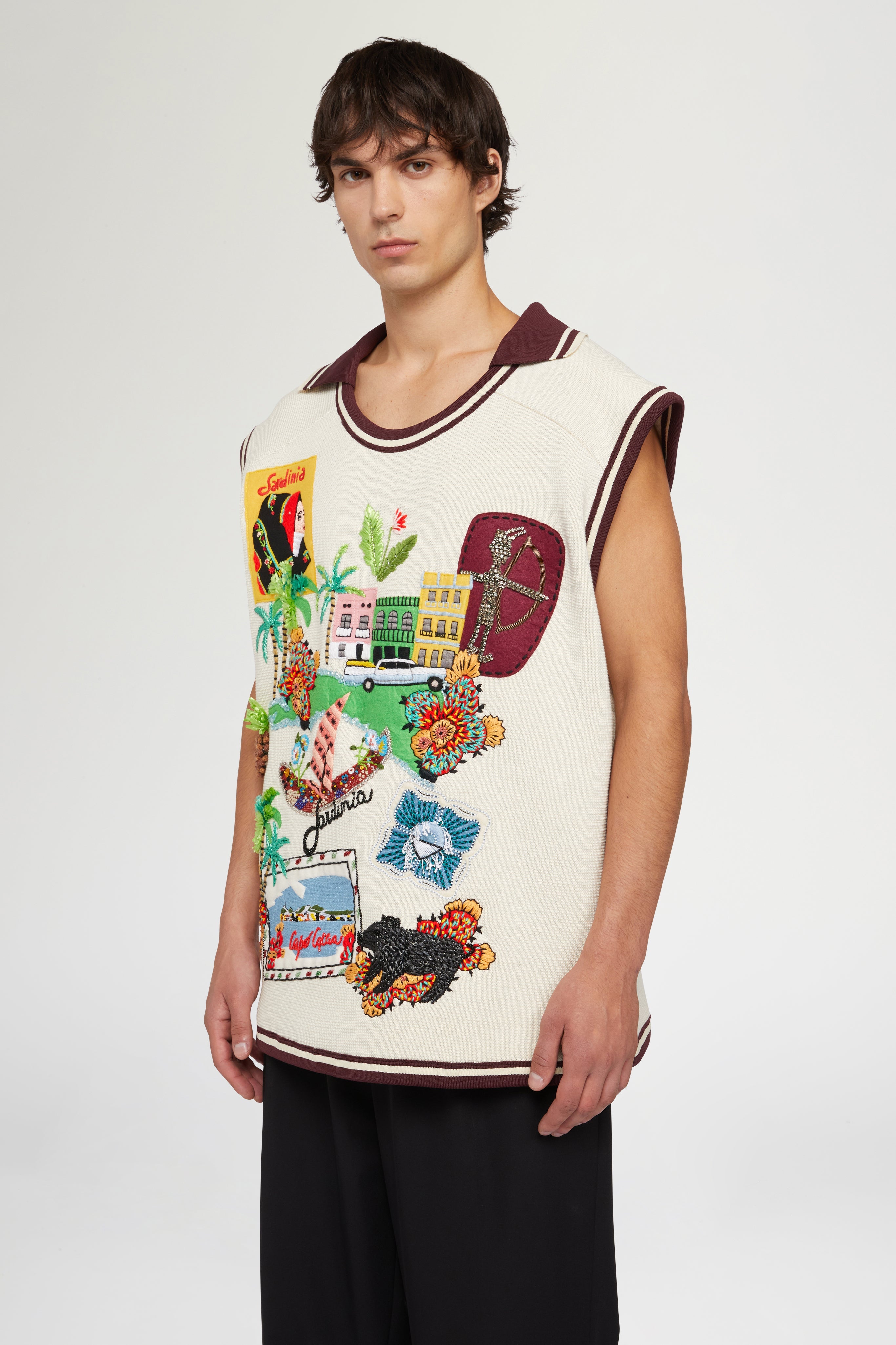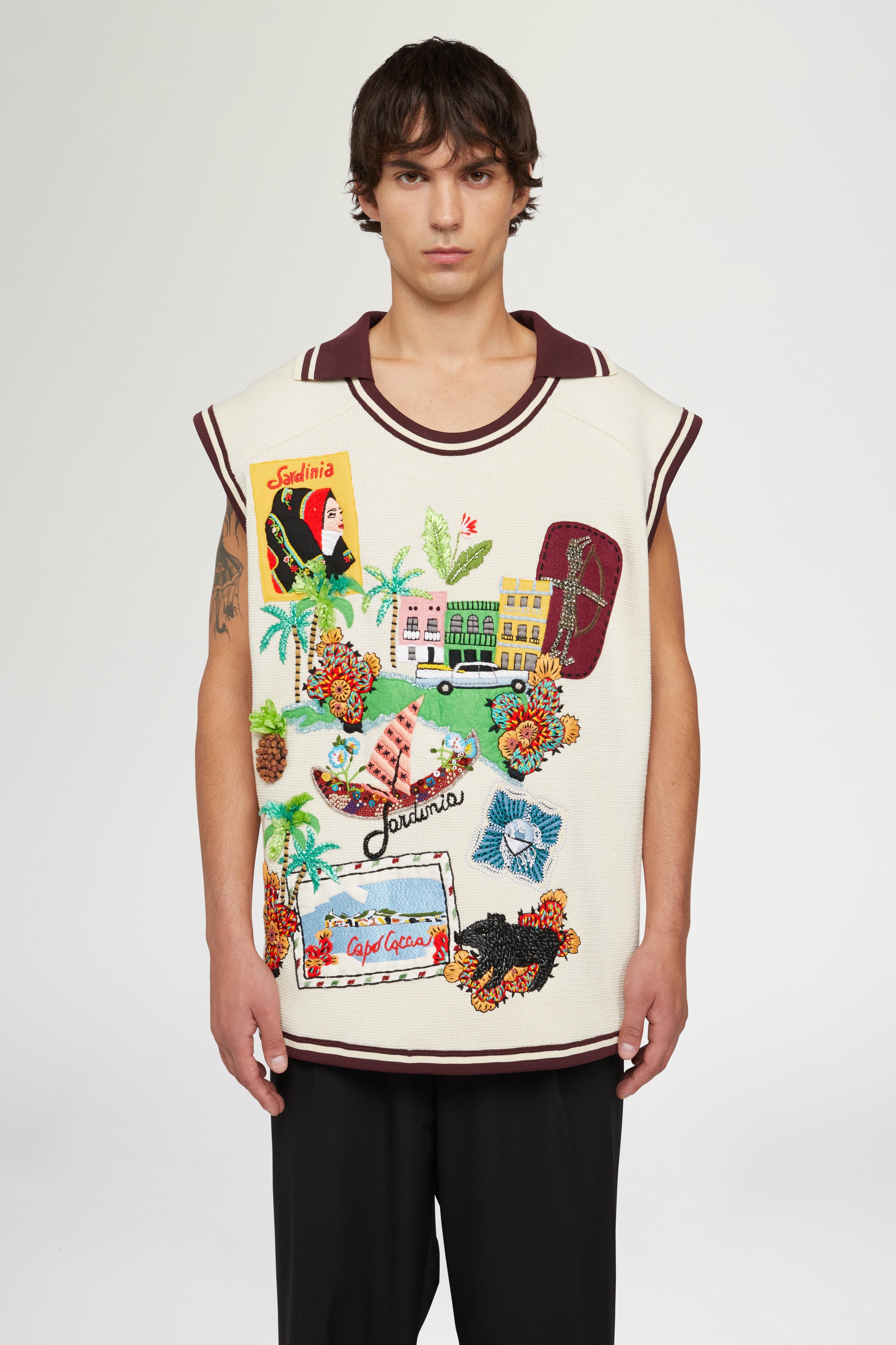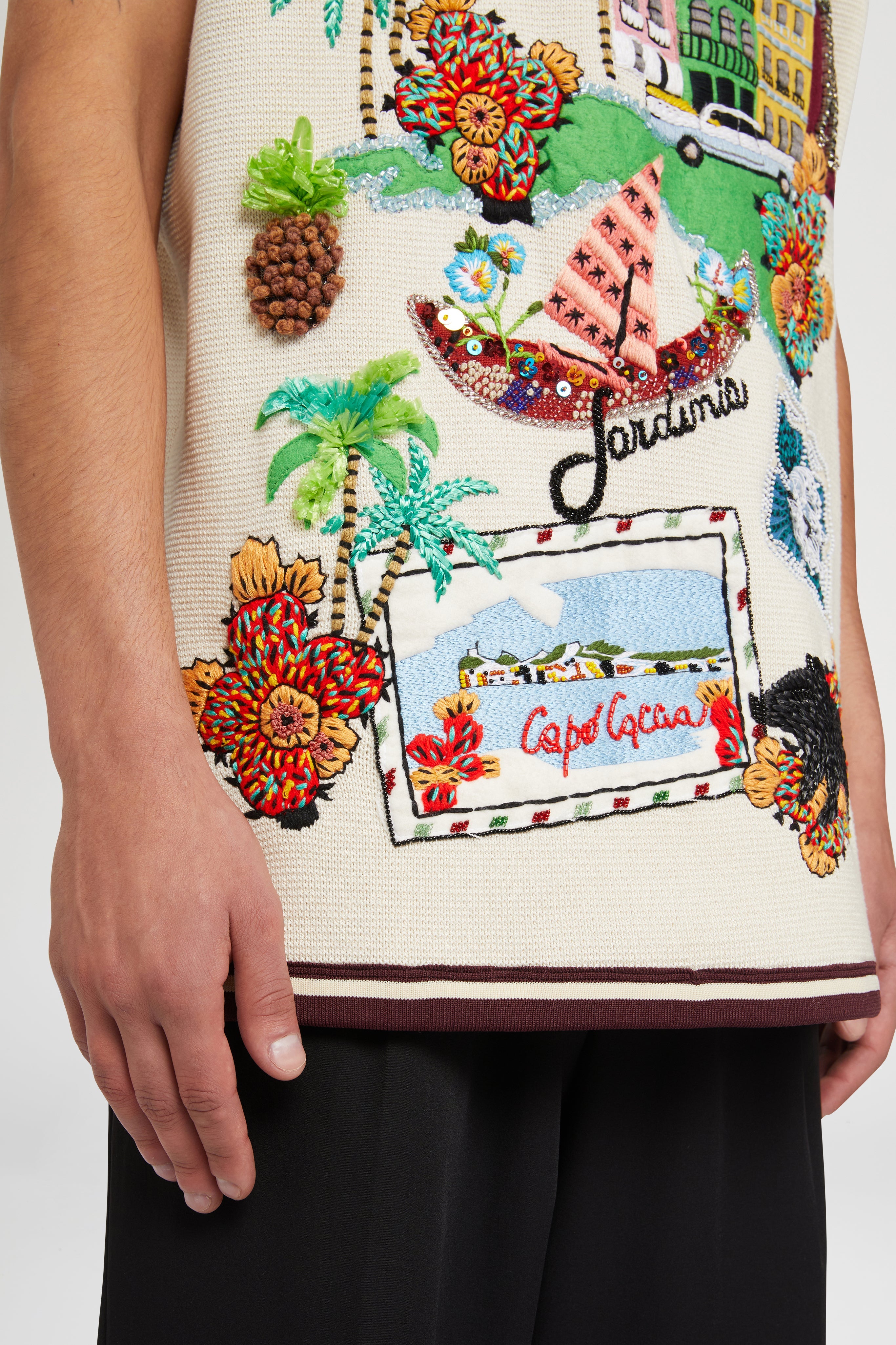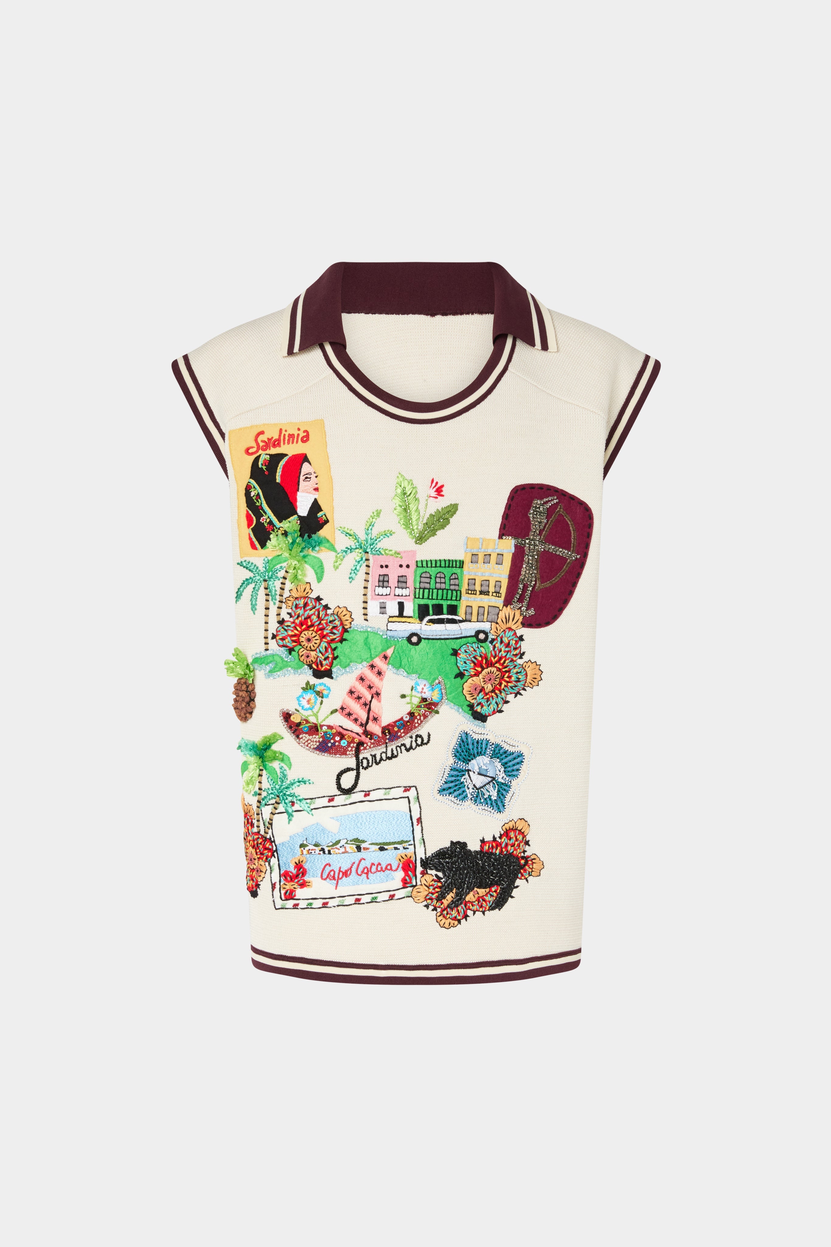 • Oversized beige cotton gilet featuring 3D appliqués and intricate embroidery inspired by Sardinia, with postcards, landscapes, and floral motifs.