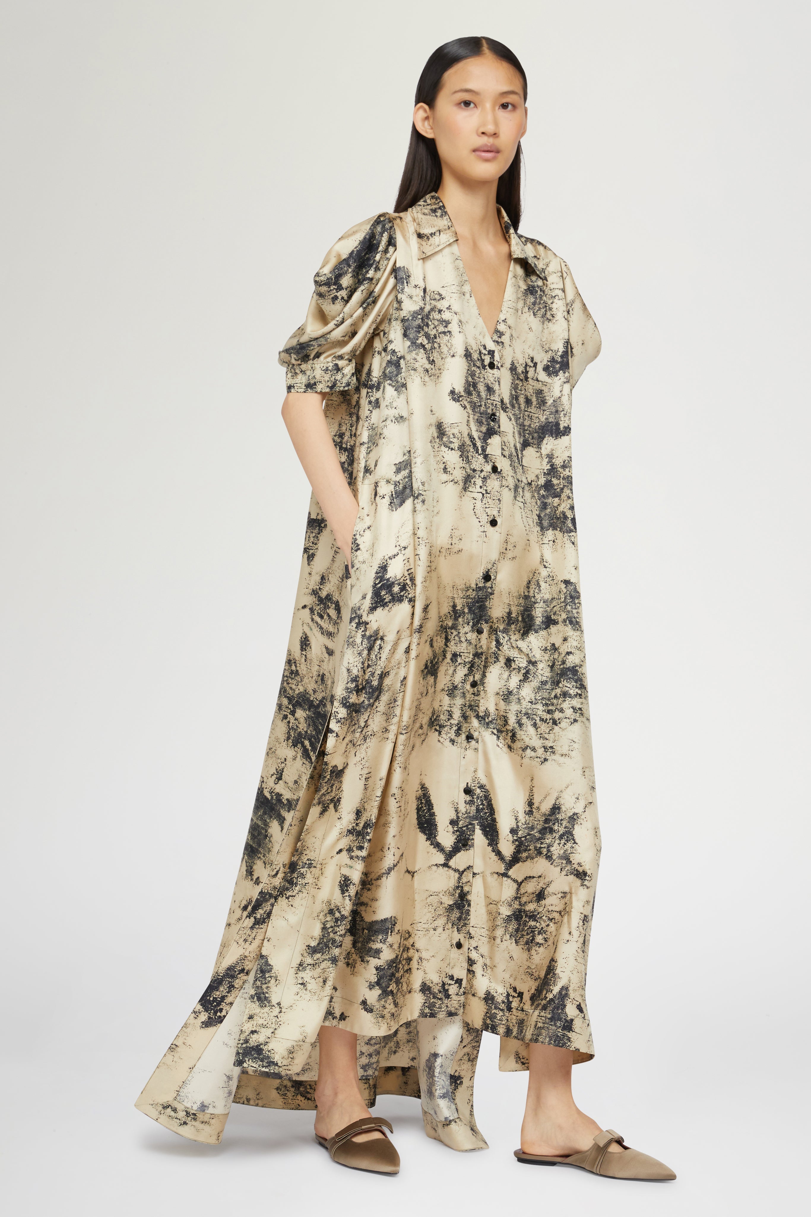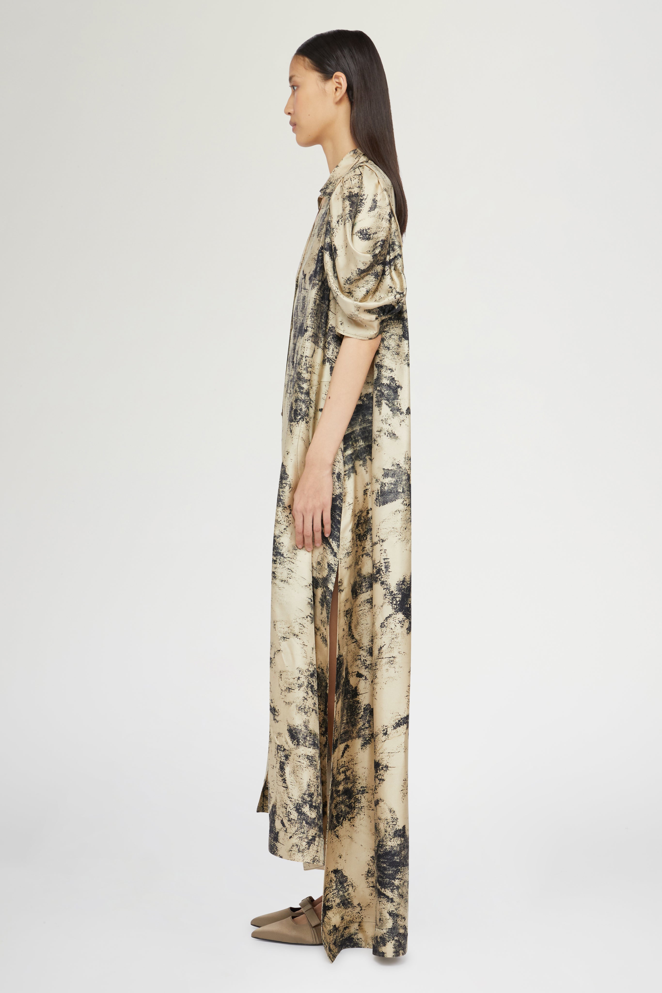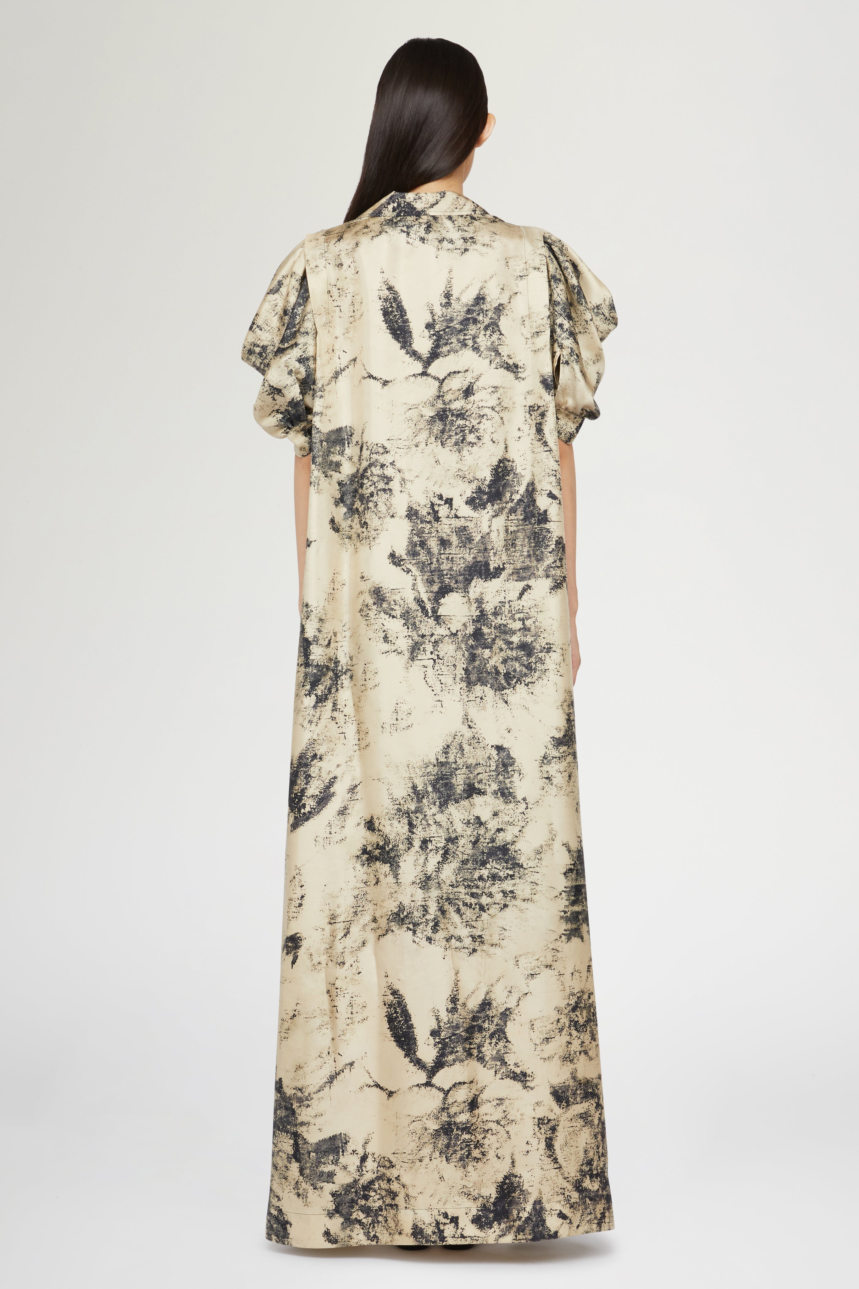 Flowy long chemisier dress in 100% luxurious silk with a tropical print.