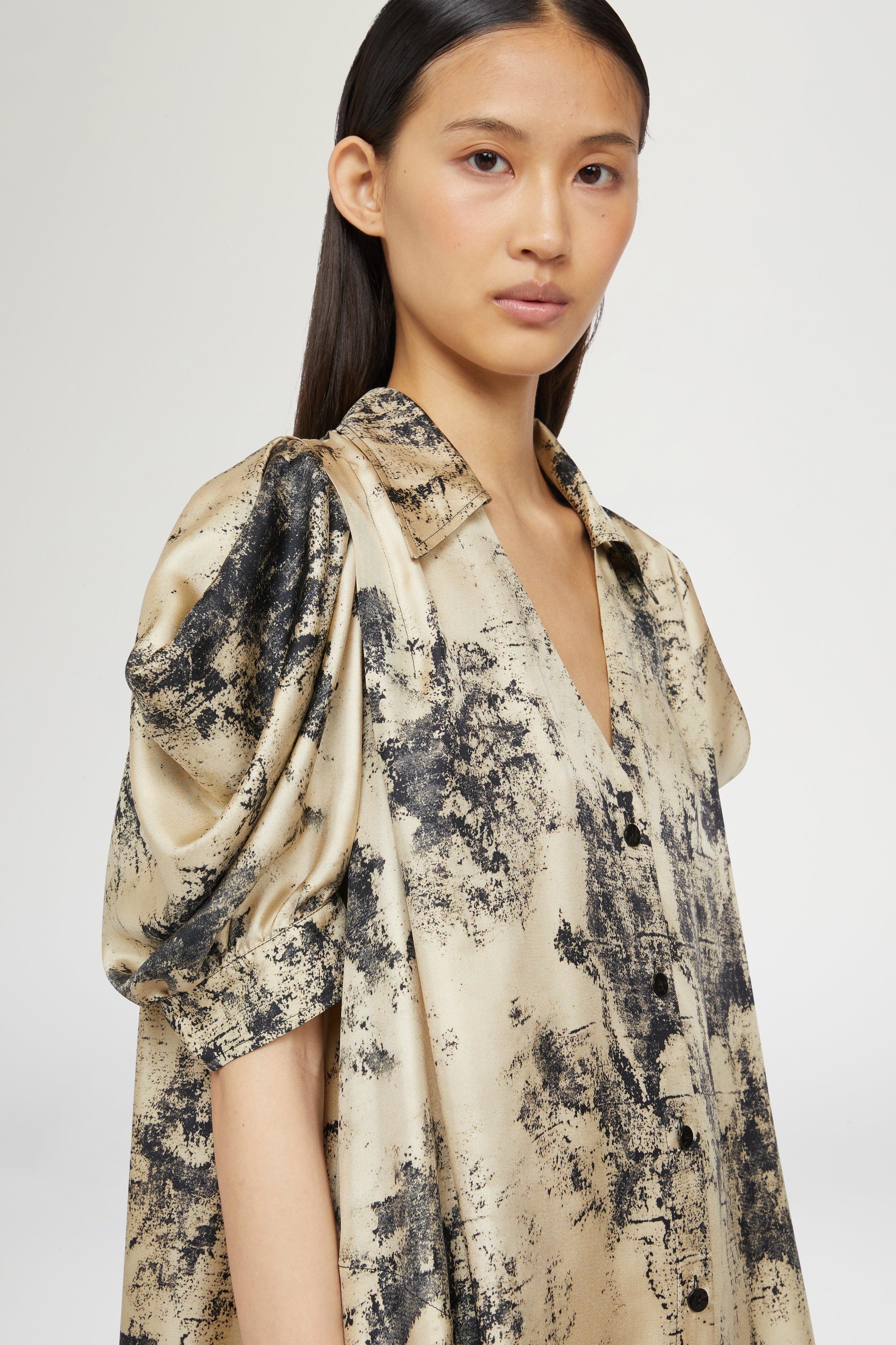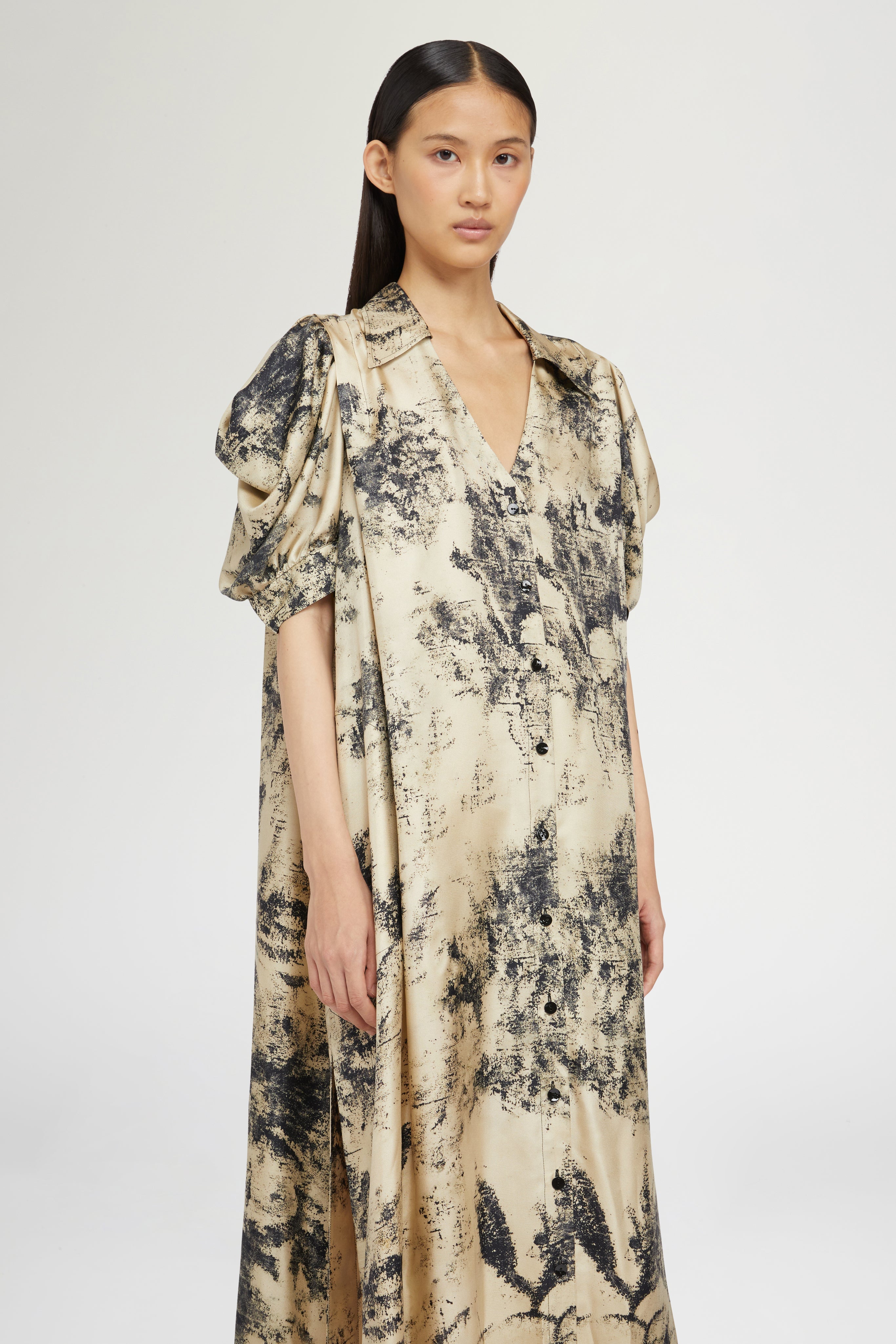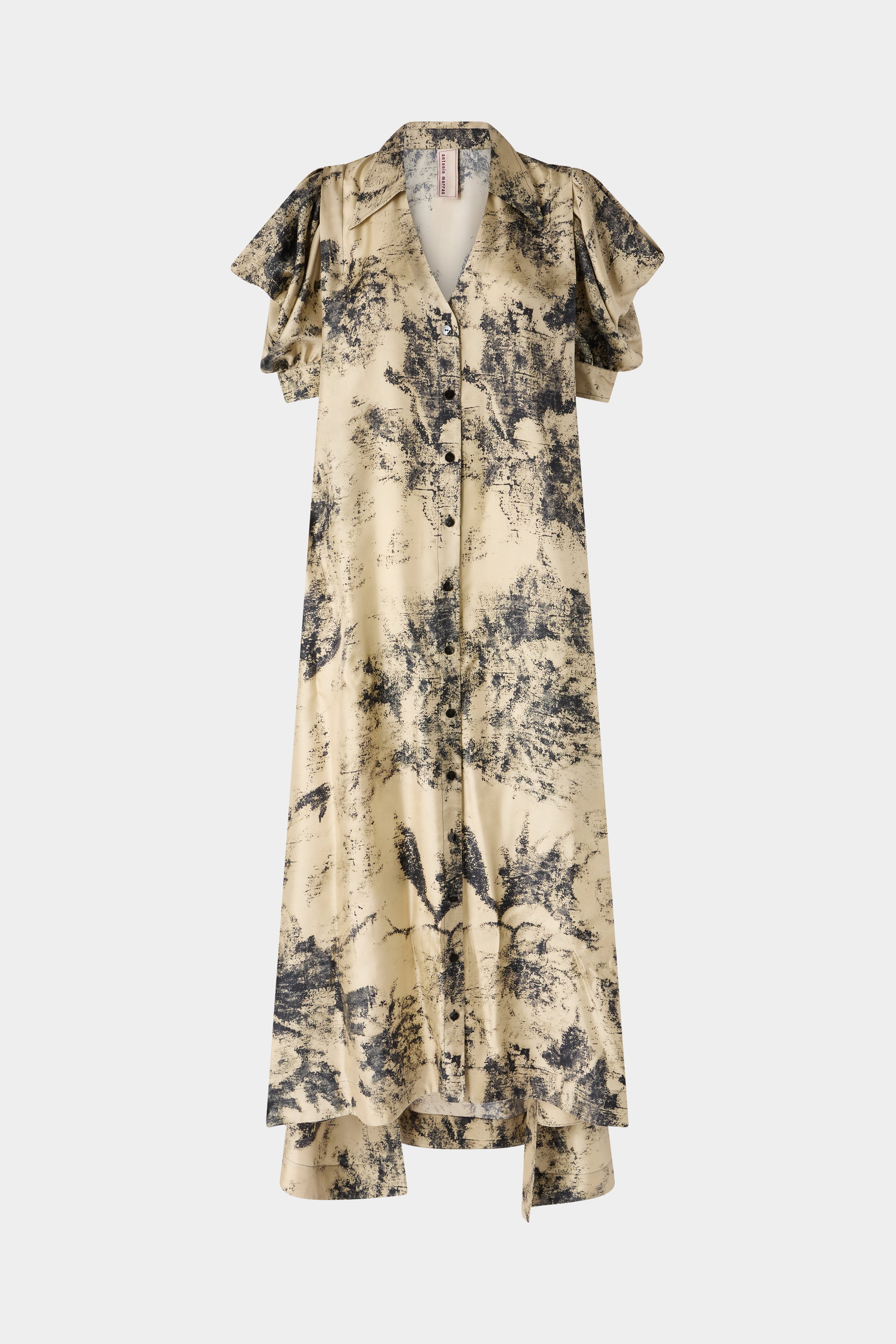 Flowy long chemisier dress in 100% luxurious silk with a tropical print.