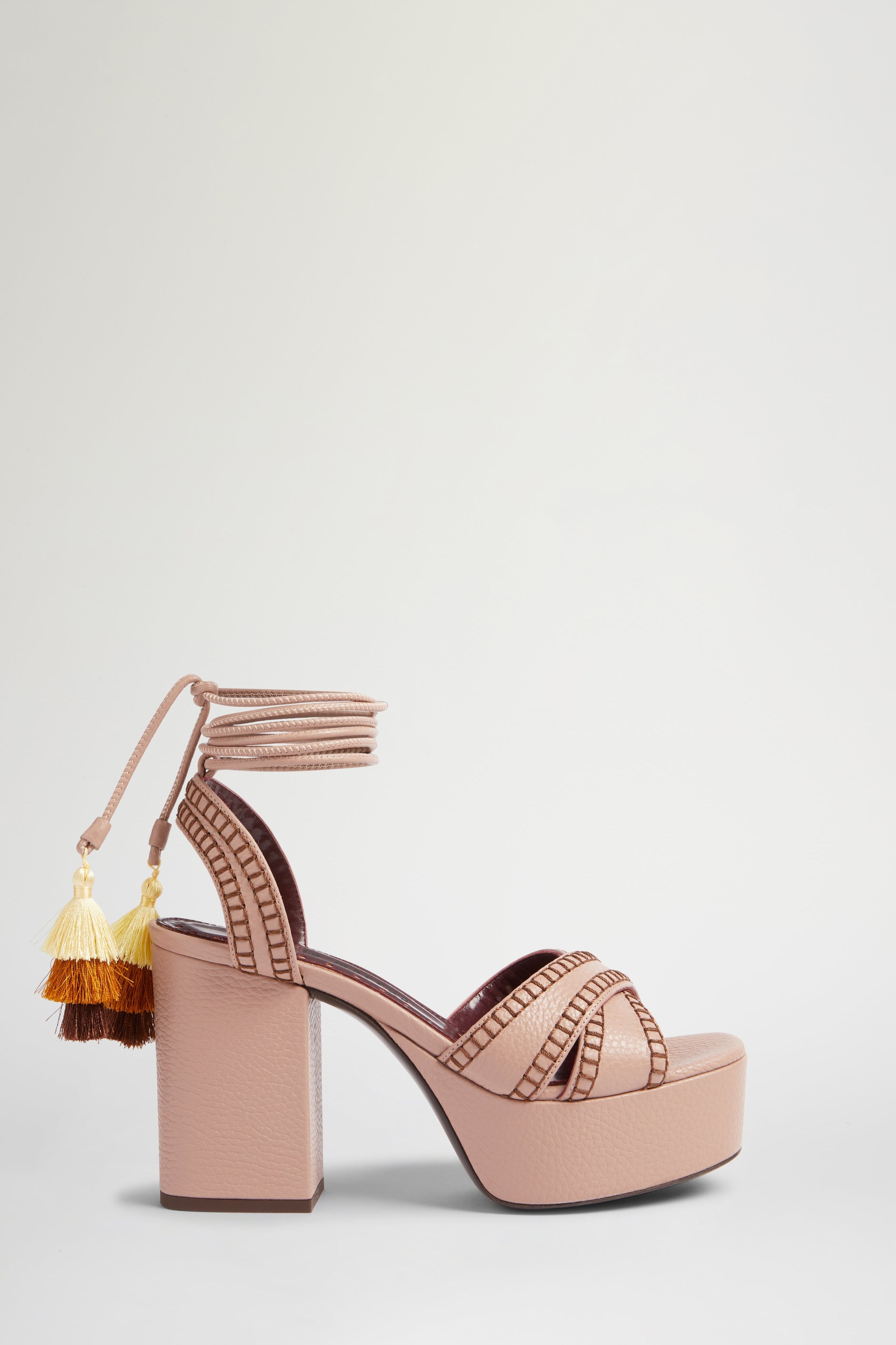 These pink heeled sandals feature a chunky platform sole and intricately stitched leather straps for a bold yet refined look. Crafted from 100% cowhide leather with a soft kidassia goat leather lining, they ensure all-day comfort. Finished with playful tassels at the ankle wrap for a unique touch.