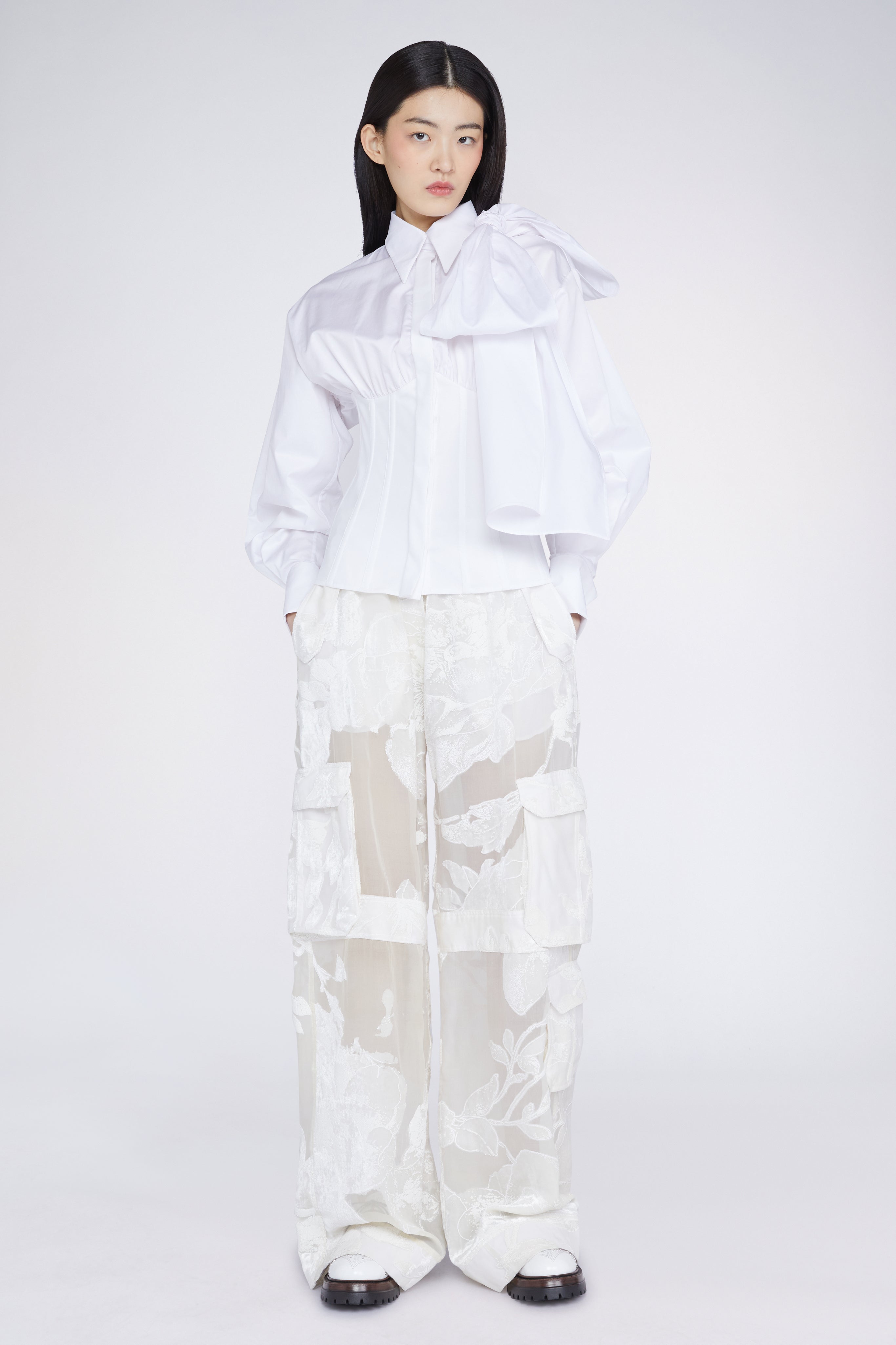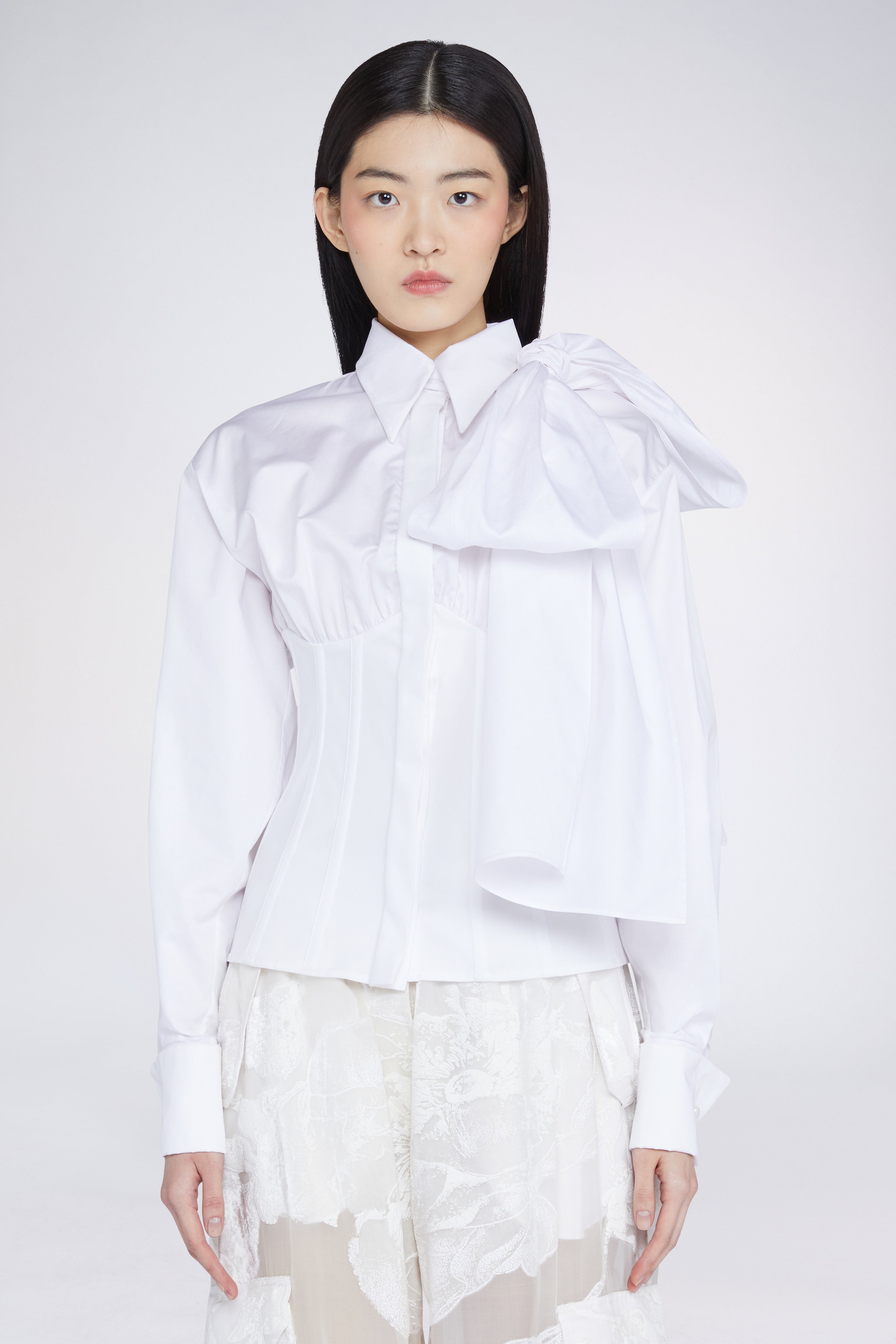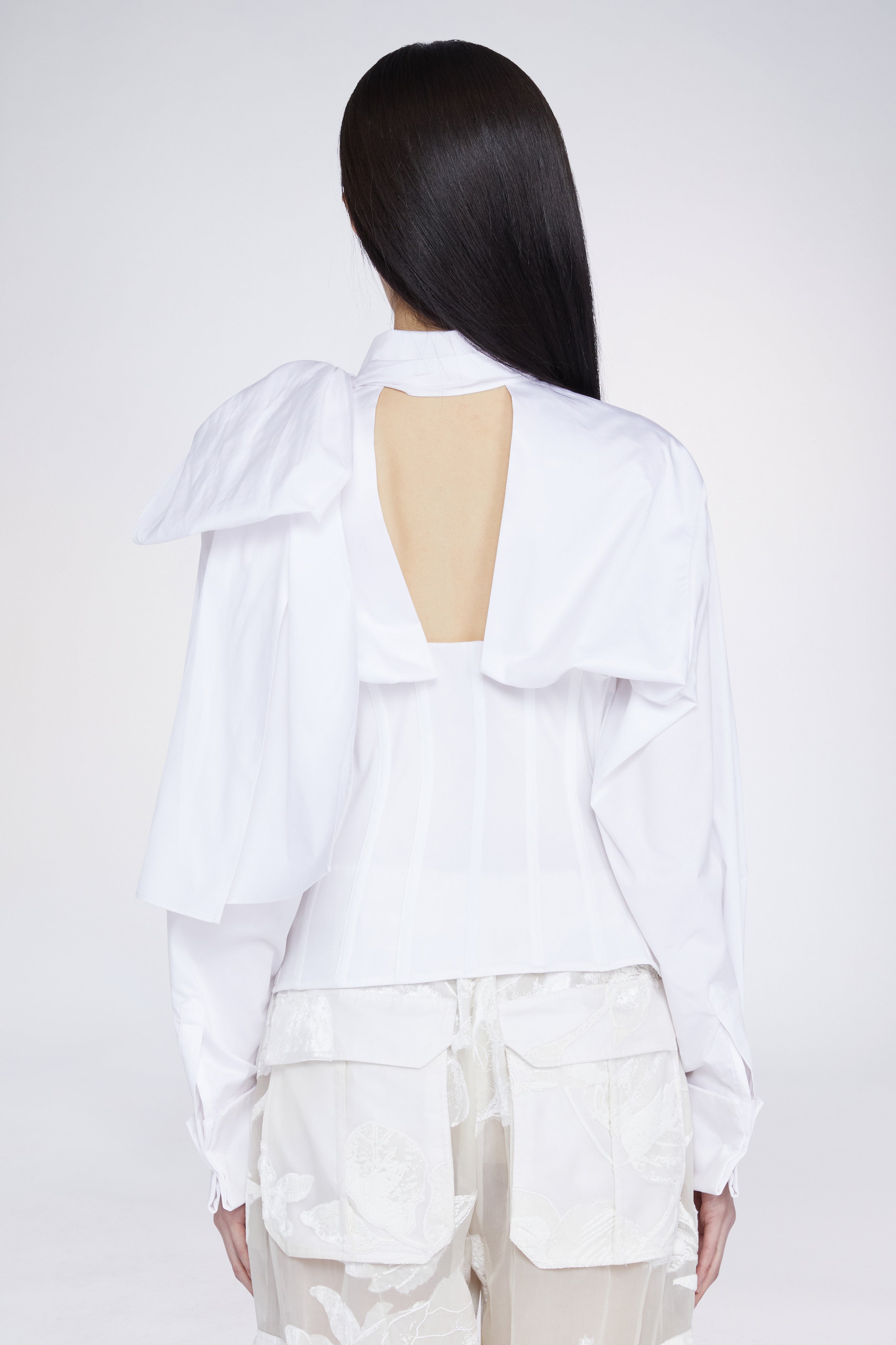 White shirt crafted from 100% cotton, featuring a corset-inspired fitted silhouette with a statement oversized bow on the neck. Designed for a structured yet feminine fit.