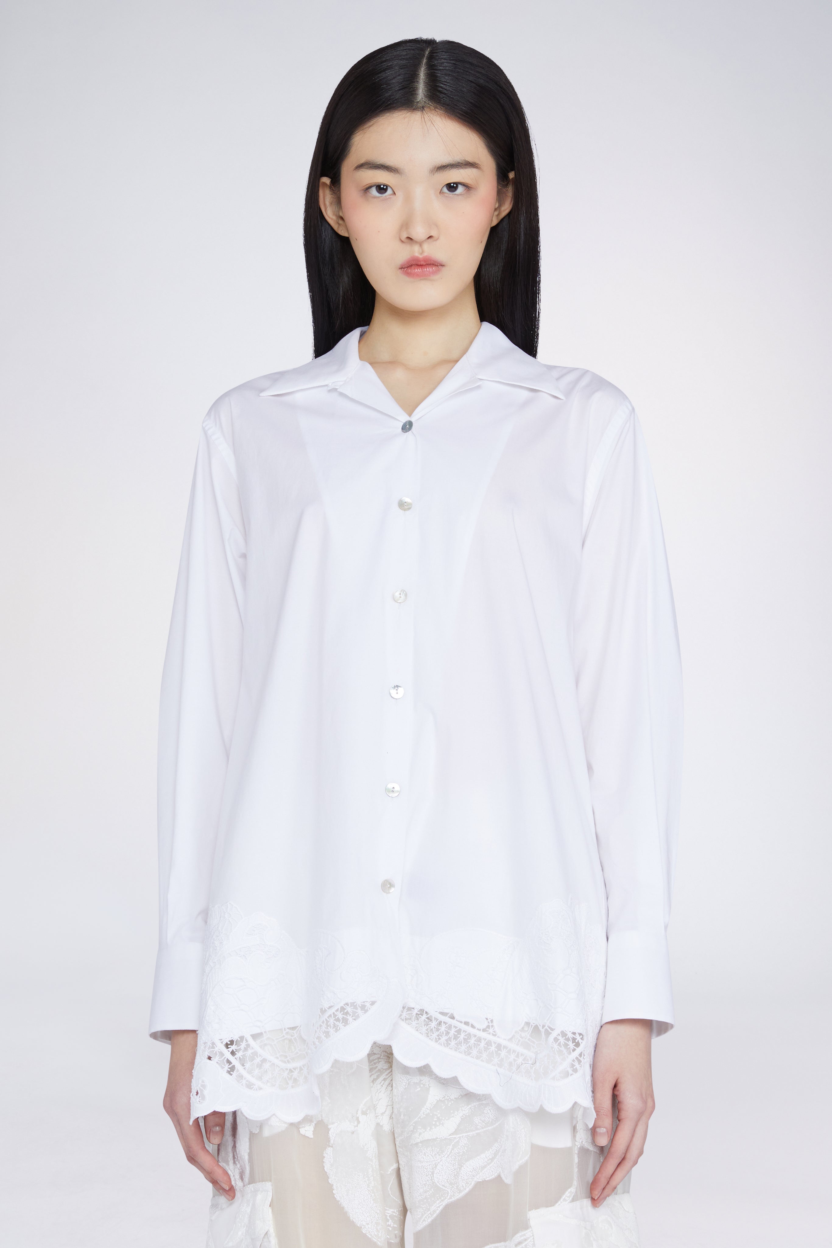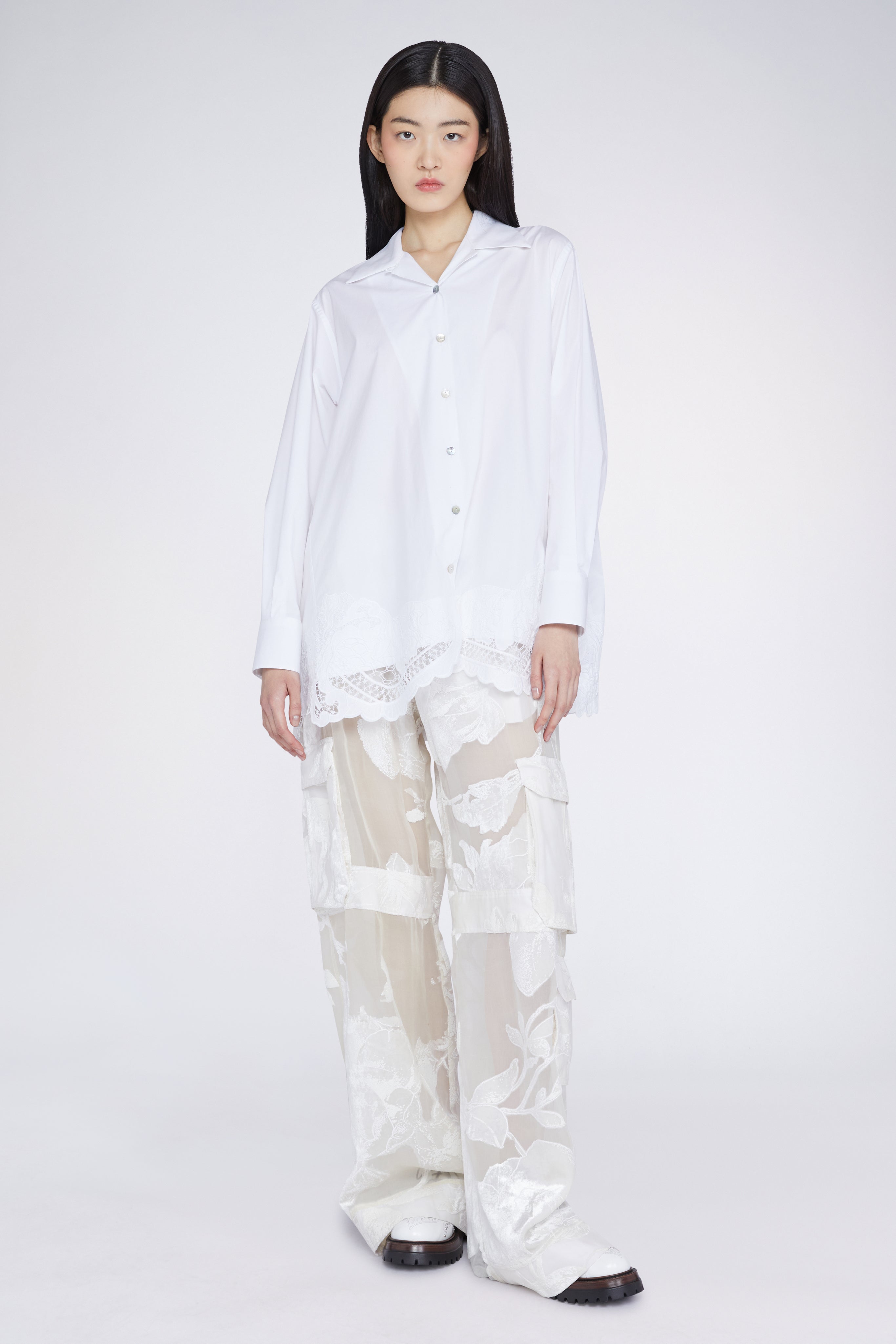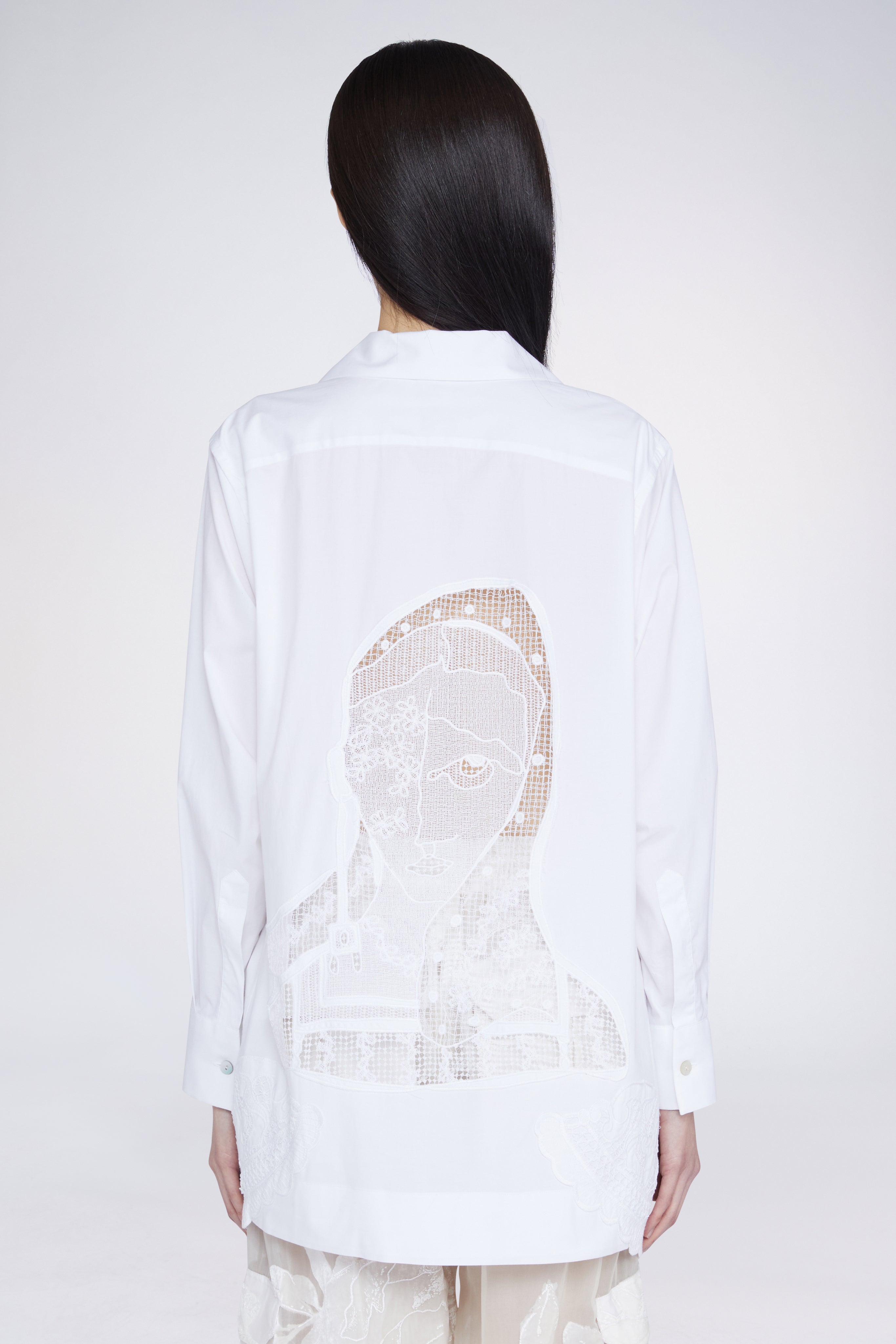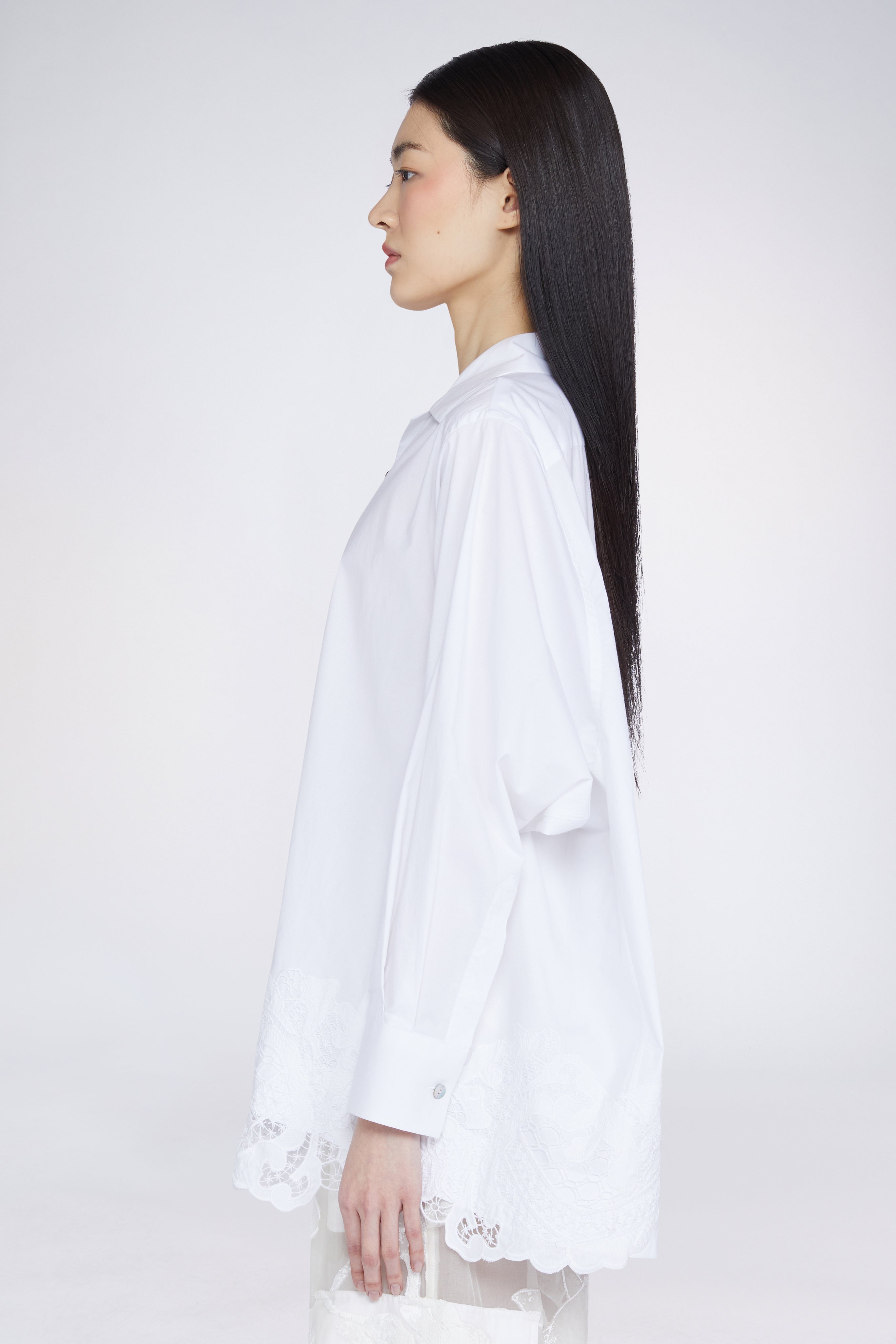Oversized shirt in 100% cotton with macramé details on the hem and on the back.