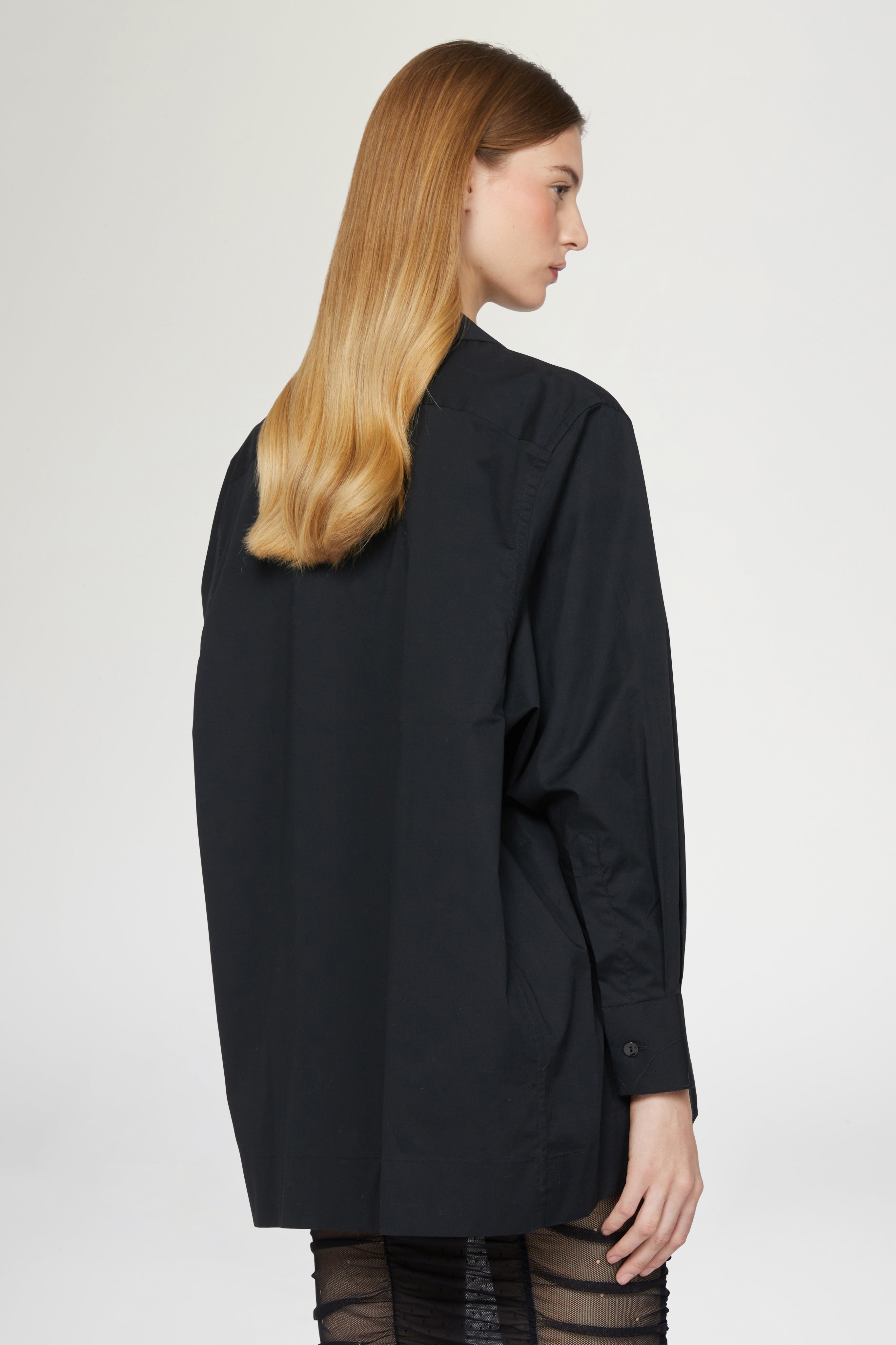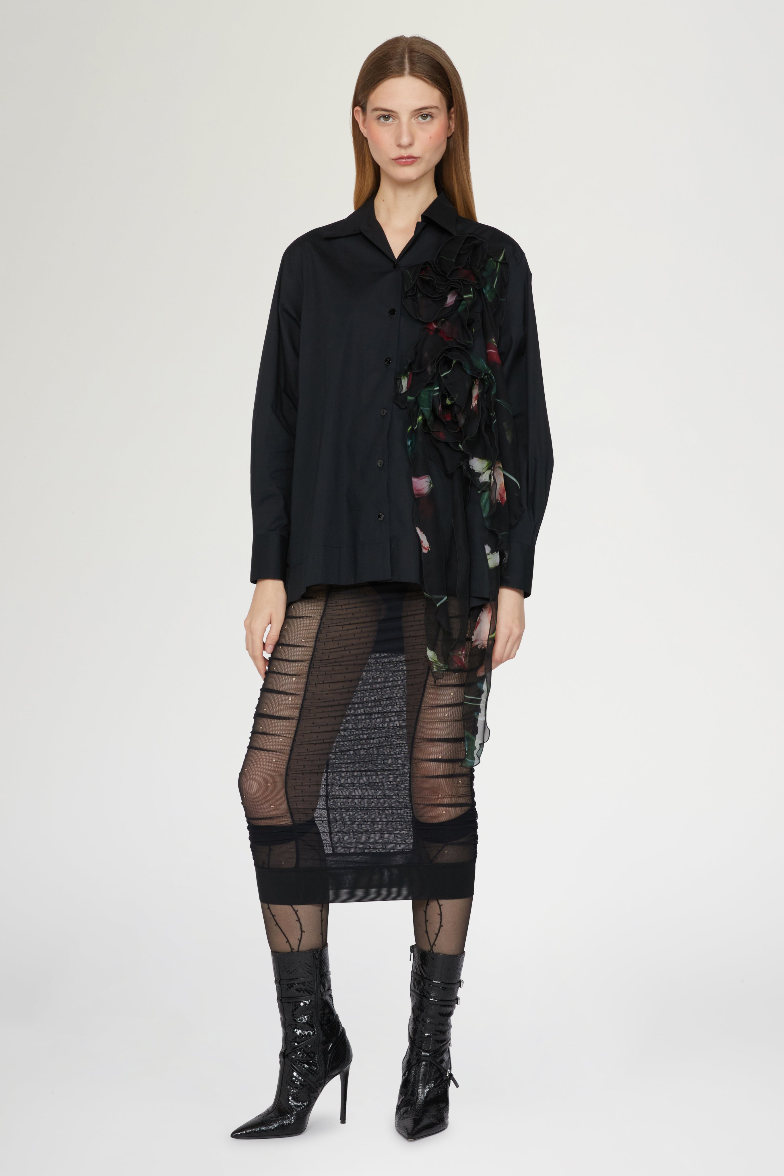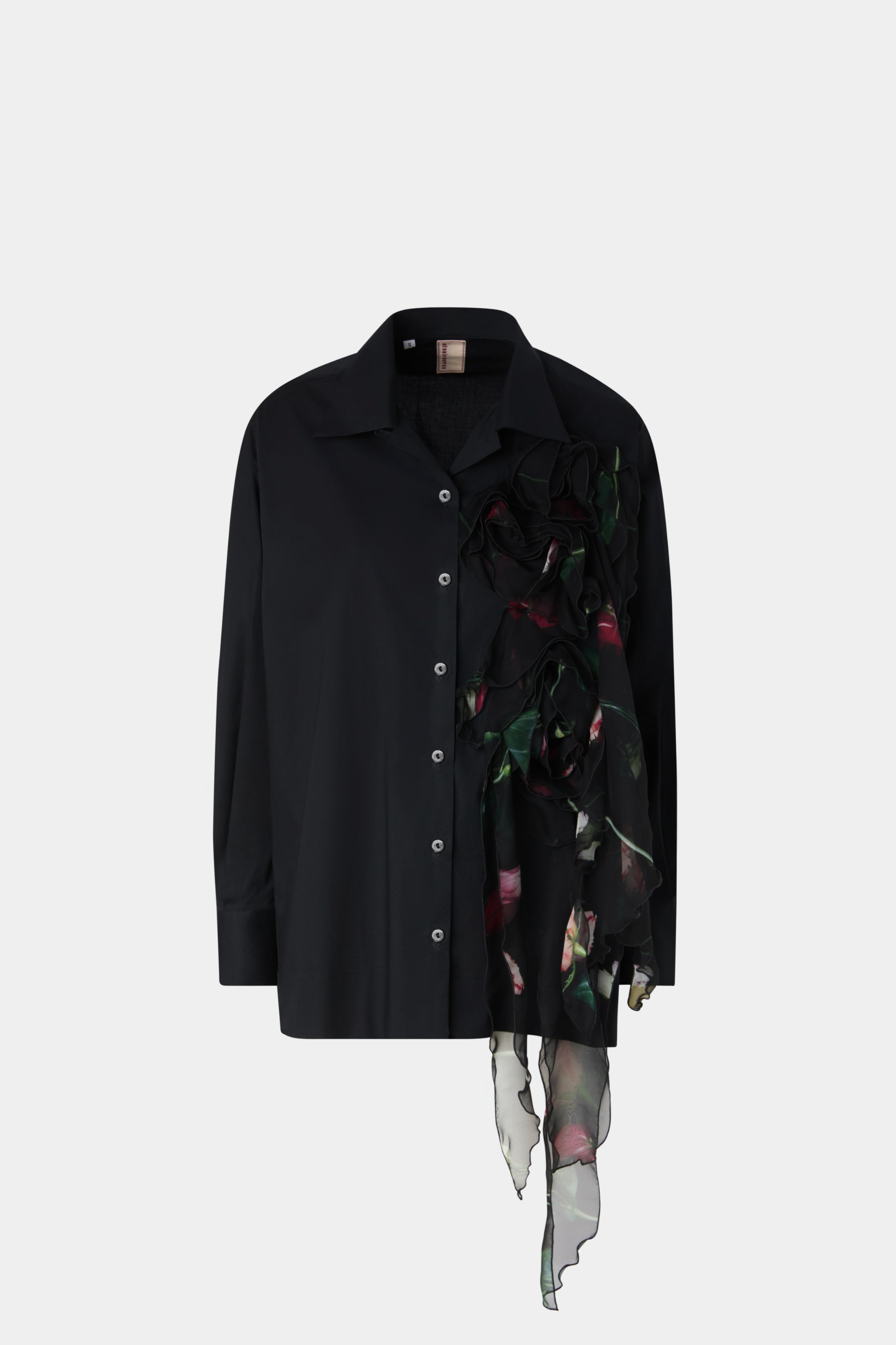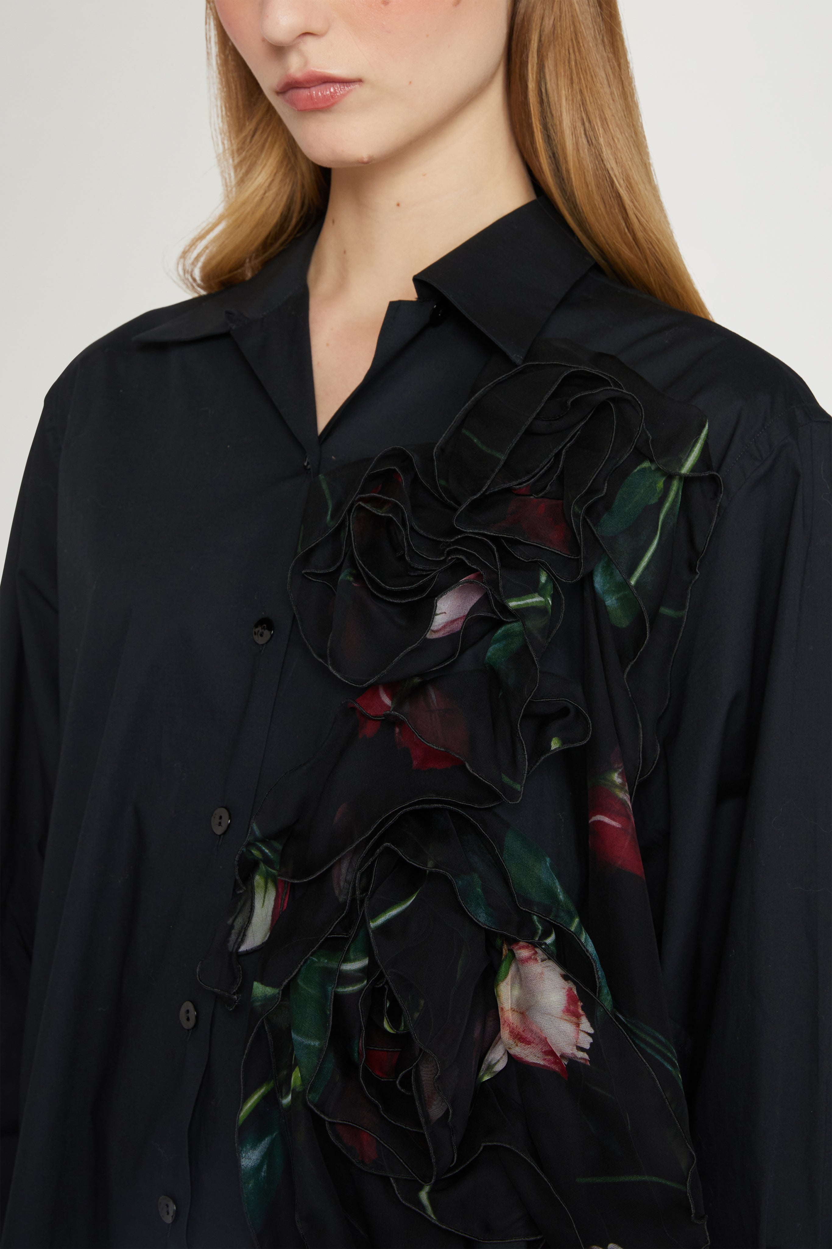 • Oversized Robespierre shirt in 100% cotton, enriched with cascading silk ruffle detail on the front. A statement piece blending tailoring and femininity.