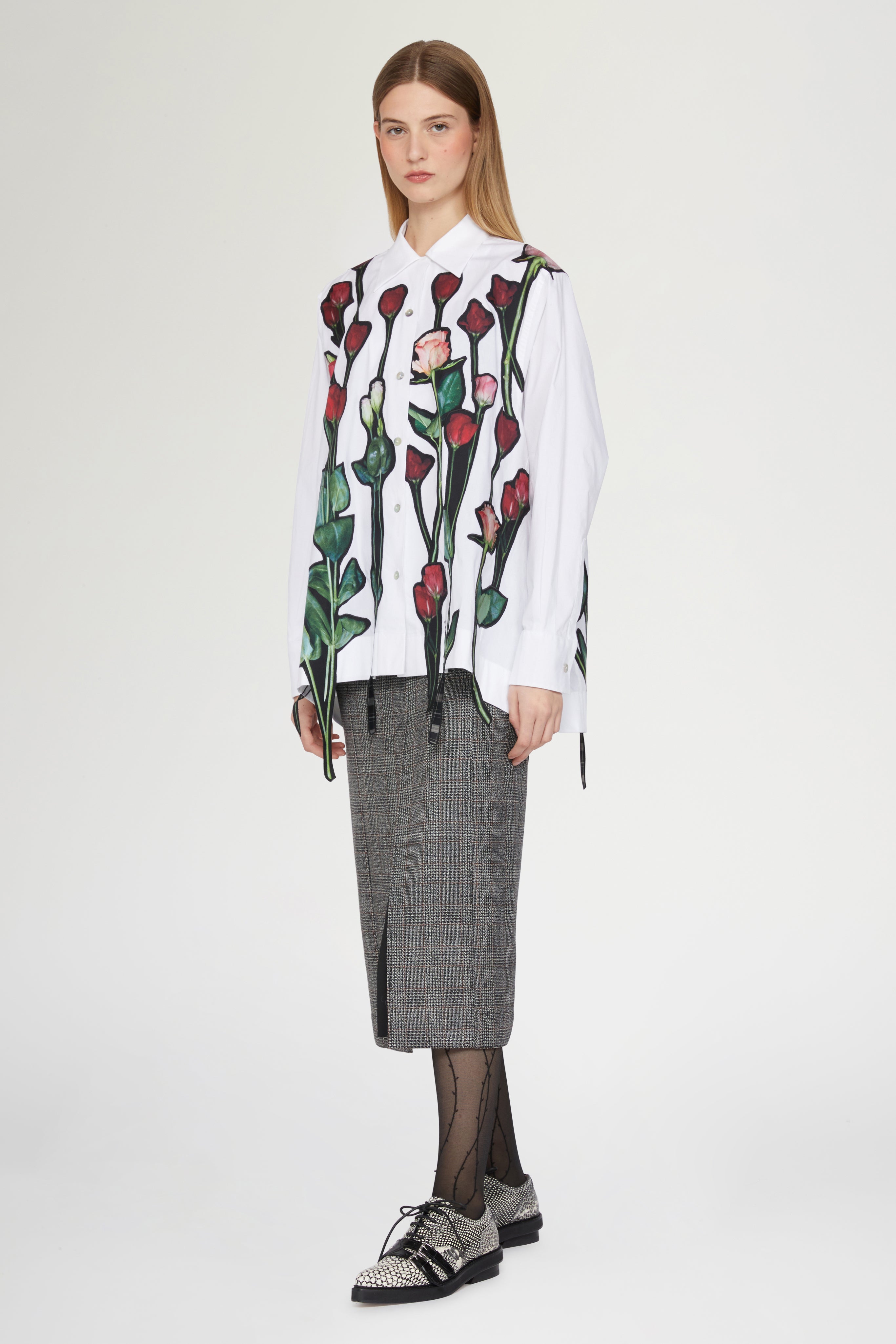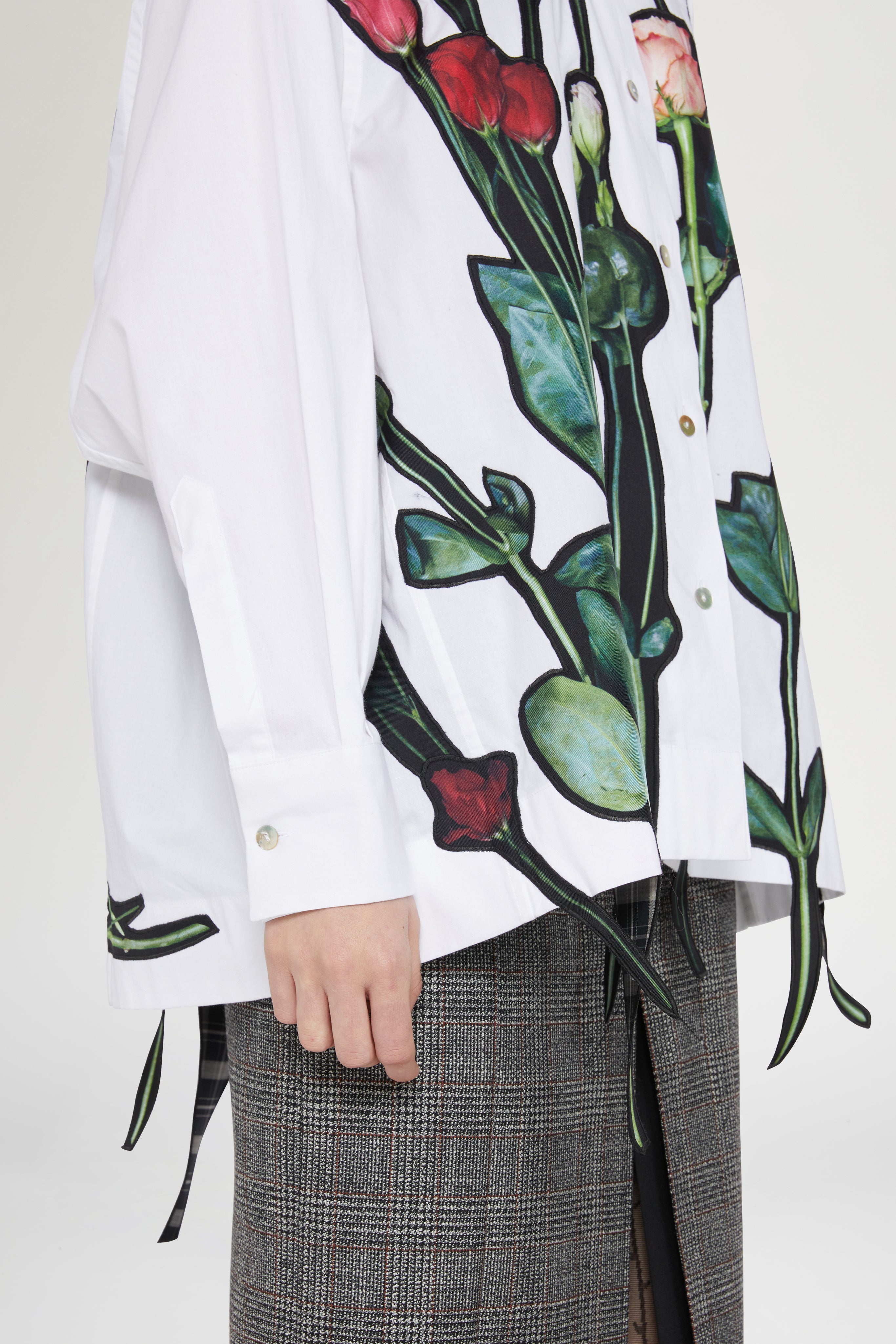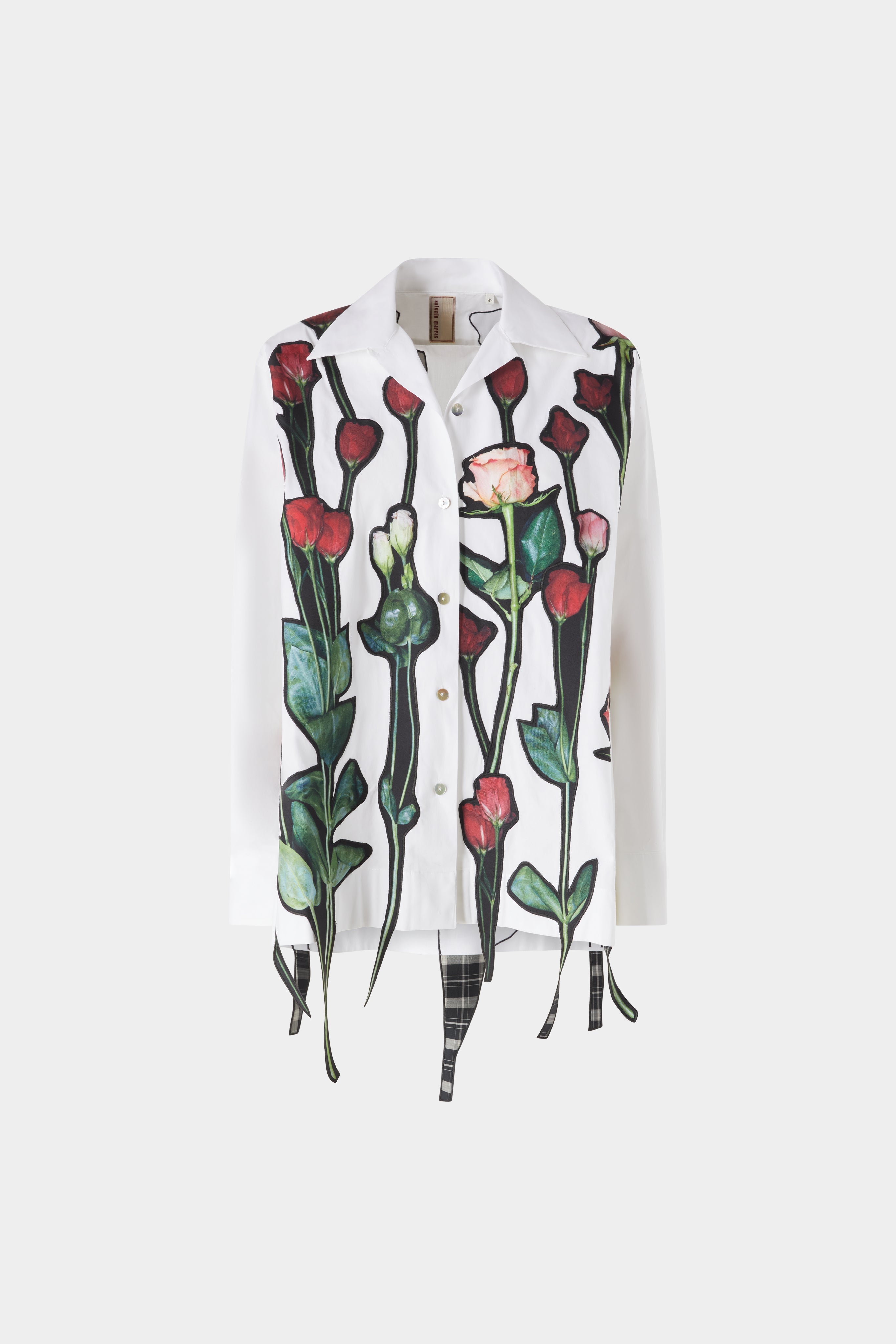 • Crafted in crisp white cotton, this oversized shirt features an intricate floral appliqué that climbs across the front and back like a poetic garden. A statement piece blending artistic expression and sartorial sophistication.