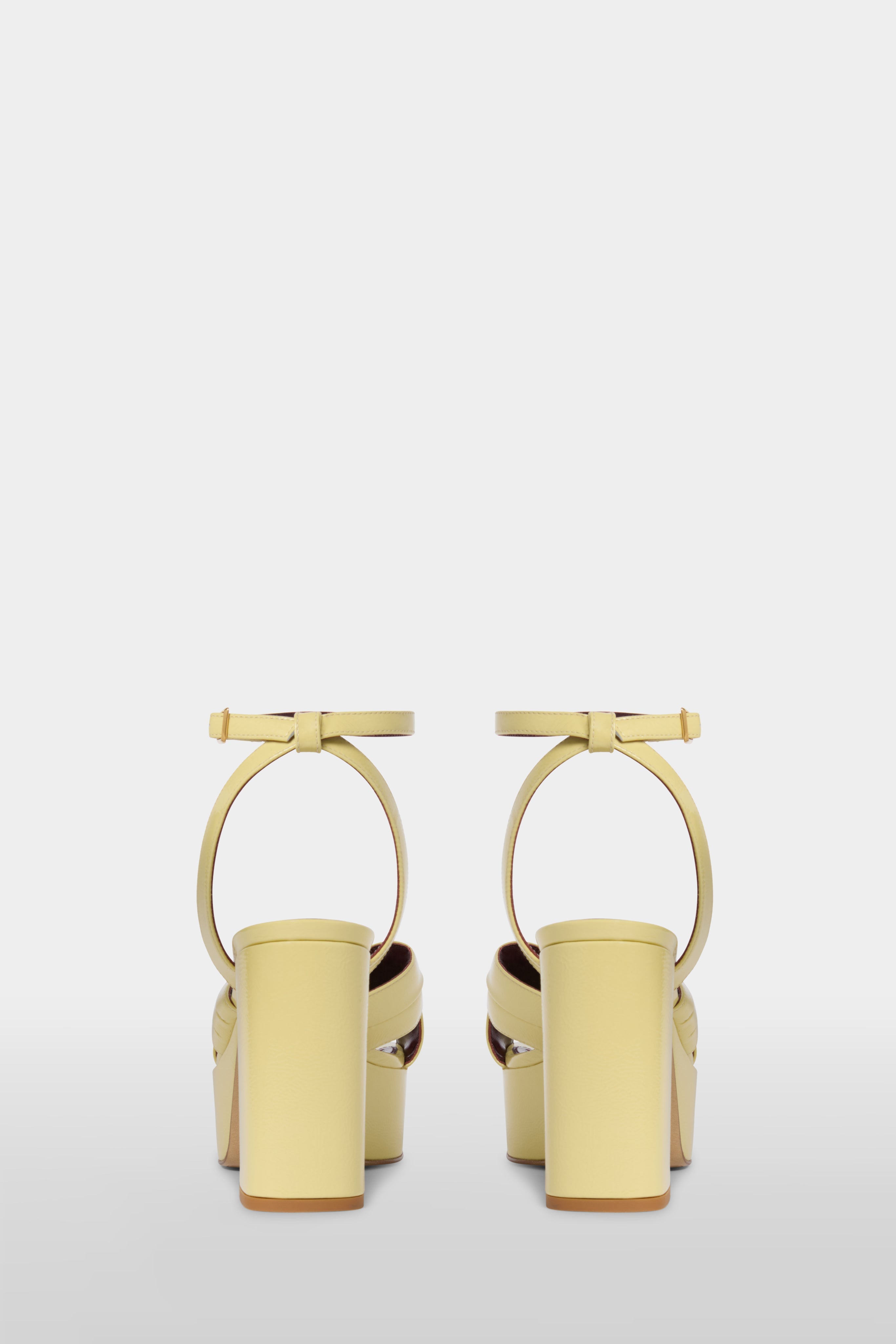 • Platform sandal in patent yellow leather with open toe and crossed straps. Chunky block heel, with adjustable ankle strap and buckle. Leather insole and sole.