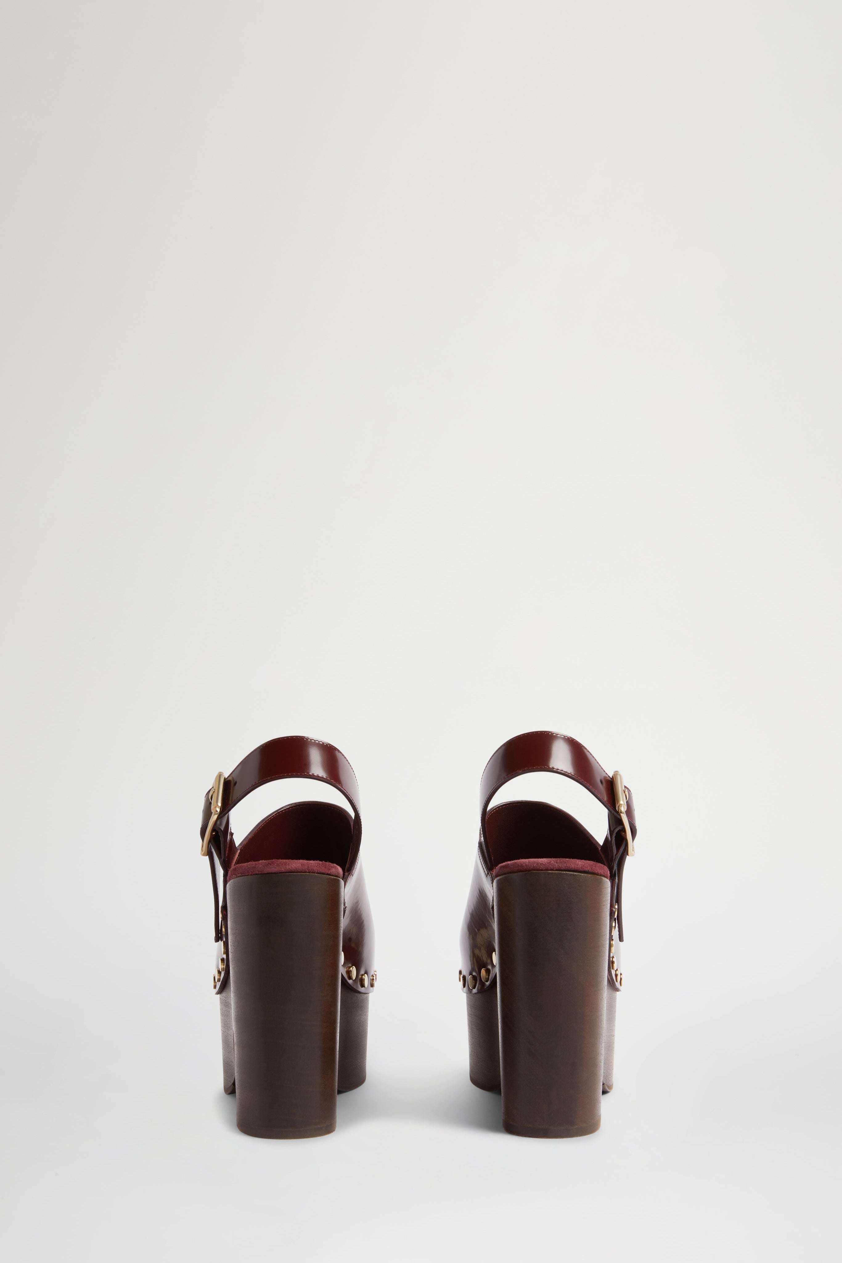 High clog mule in bordeaux leather with adjustable slingback strap and metallic studs. Set on a sculpted wooden platform with engraved heart detail for a playful touch.