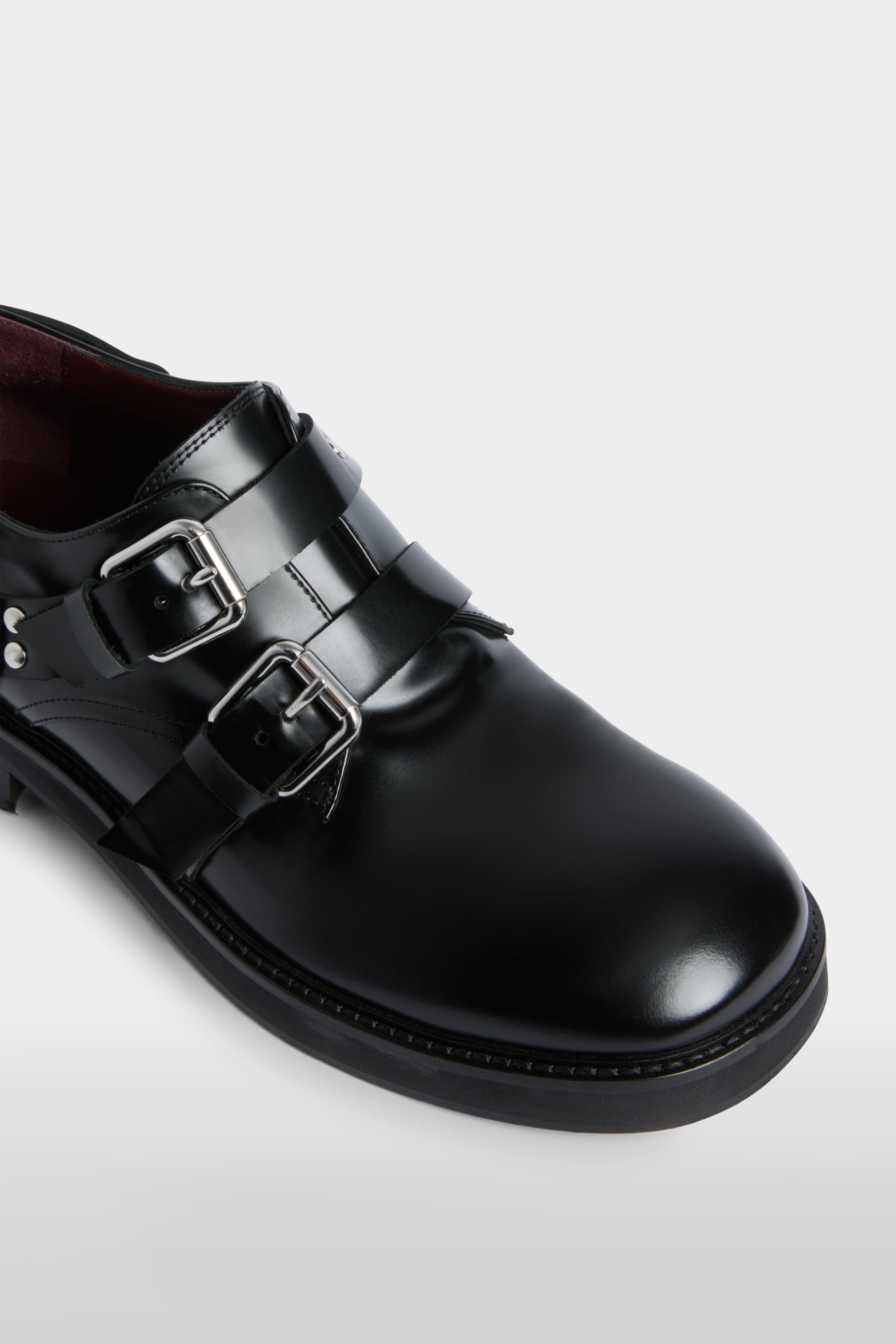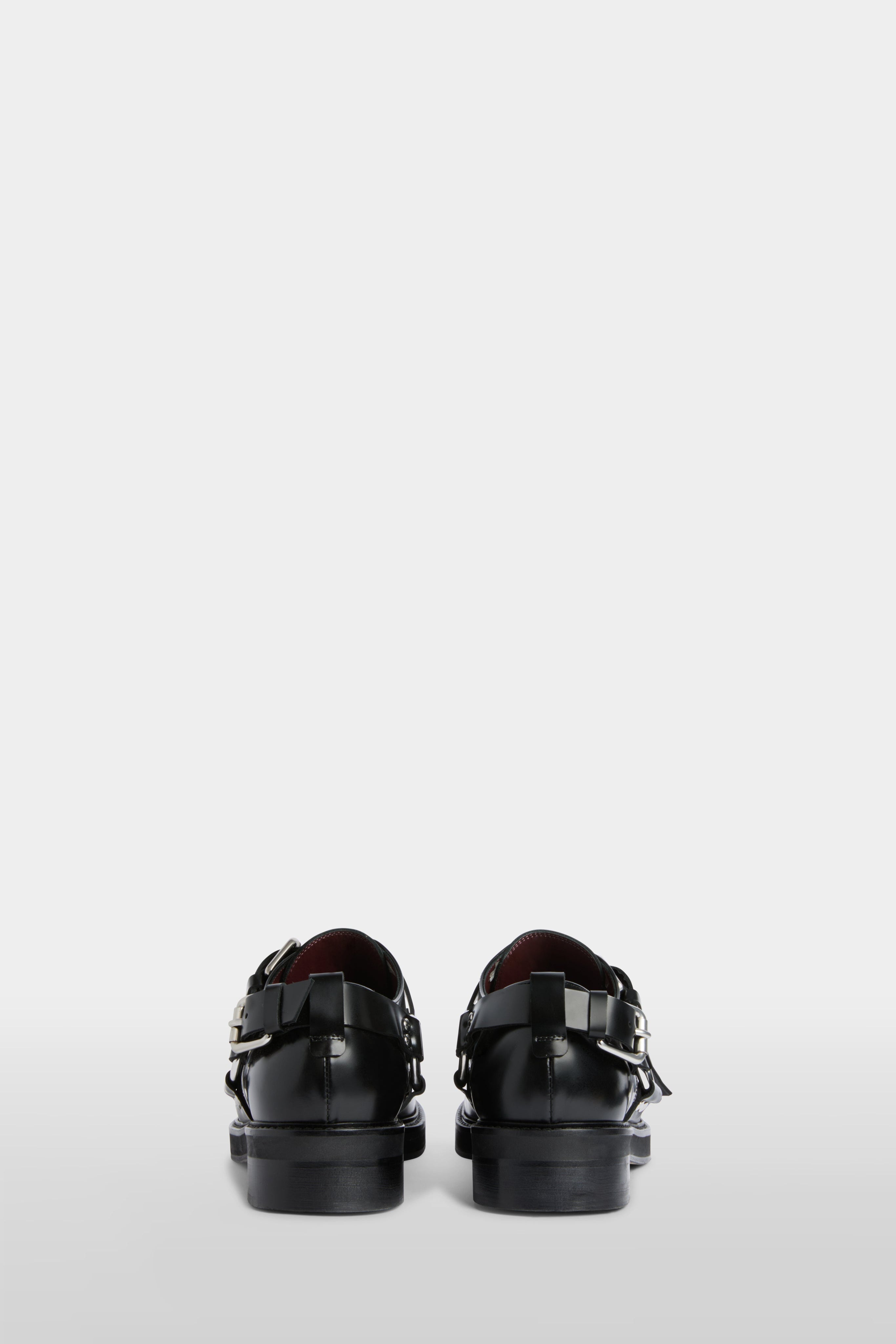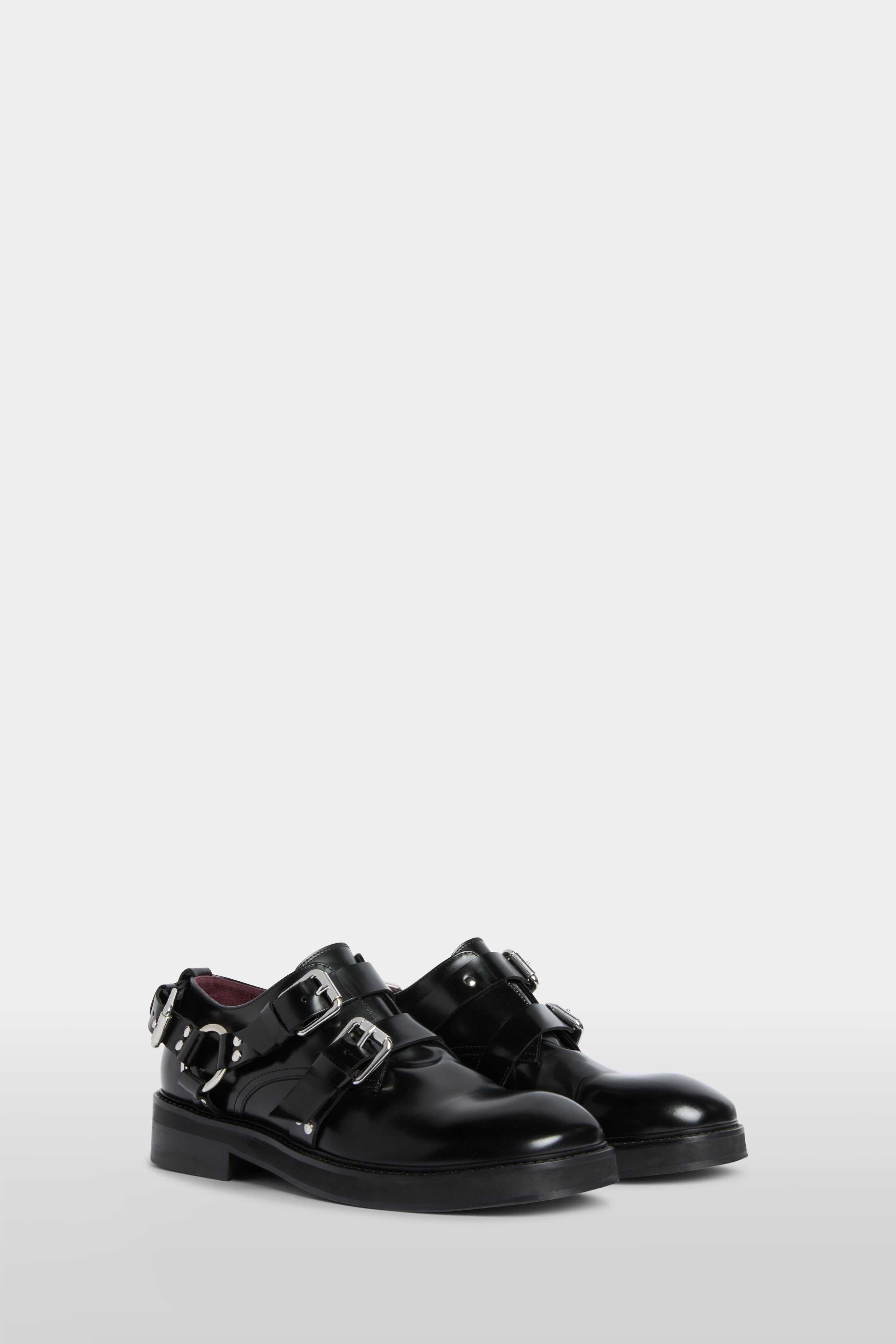 Black derby shoes crafted in 100% polished bovine leather. Featuring double buckle straps with metal hardware and side harness detail for a bold, contemporary edge. A statement design combining classic tailoring with modern attitude.