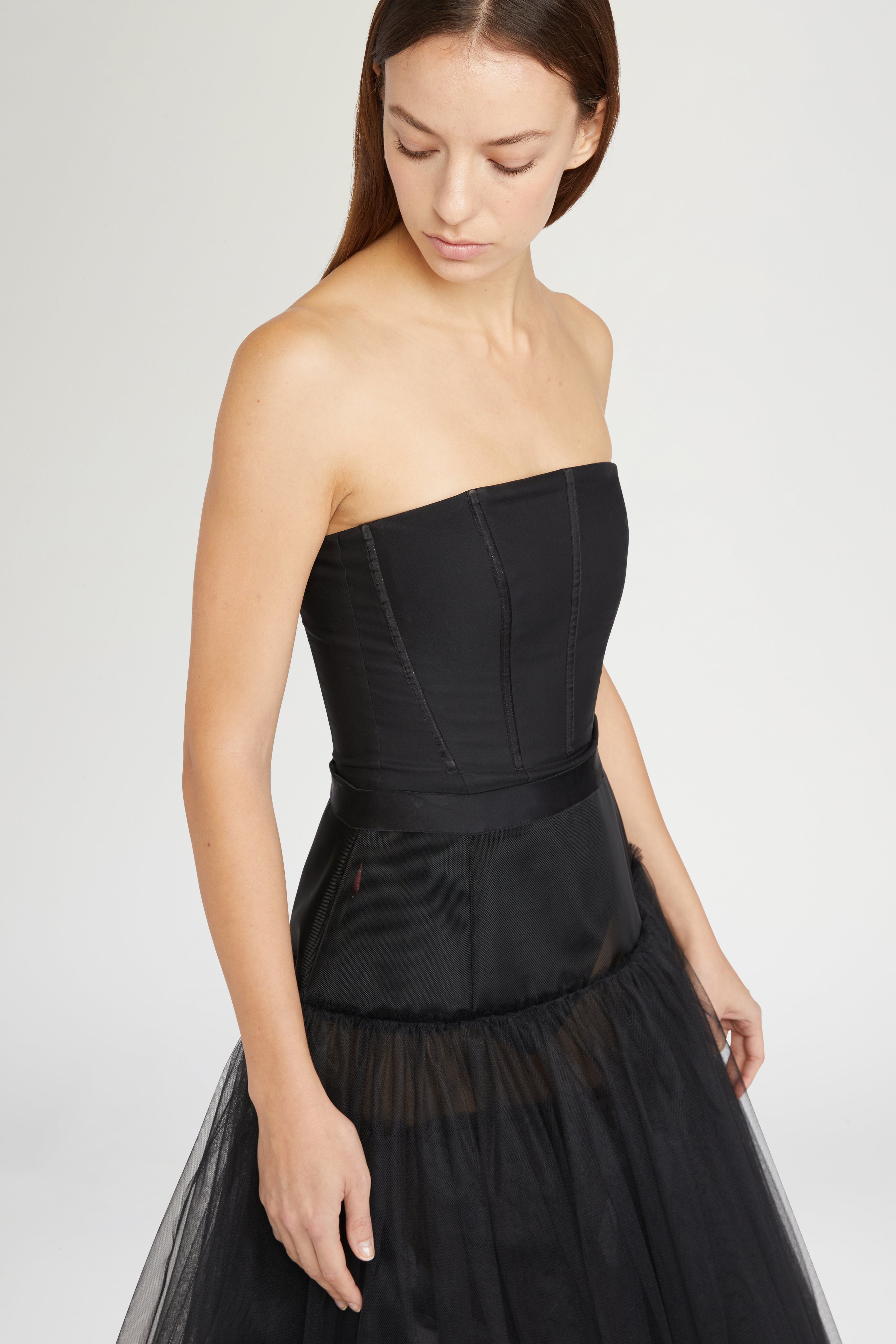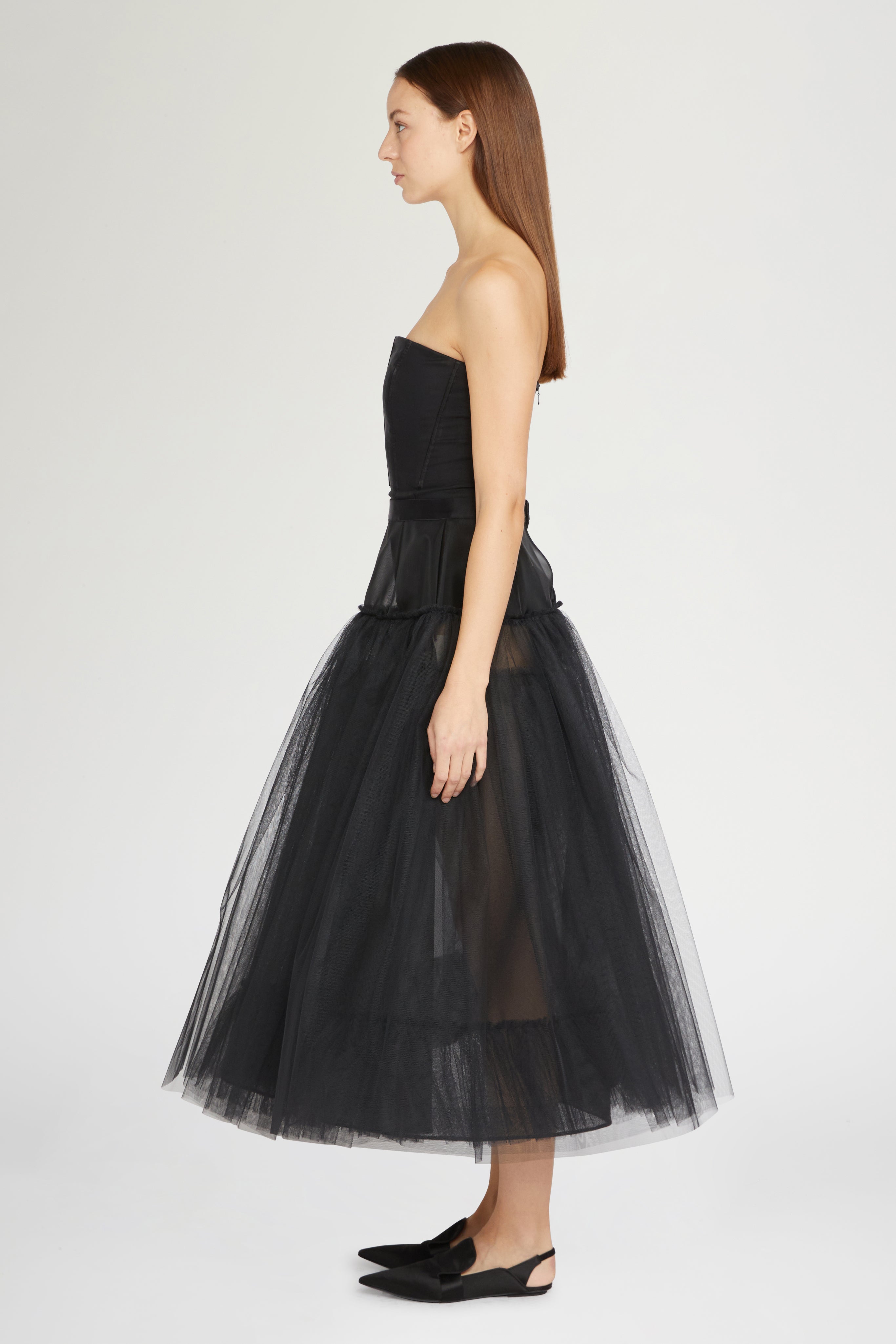 Black tulle underskirt, ankle length, featuring a contrasting waistband and a sheer organza upper panel. Perfect for adding volume and structure to dresses and skirts.