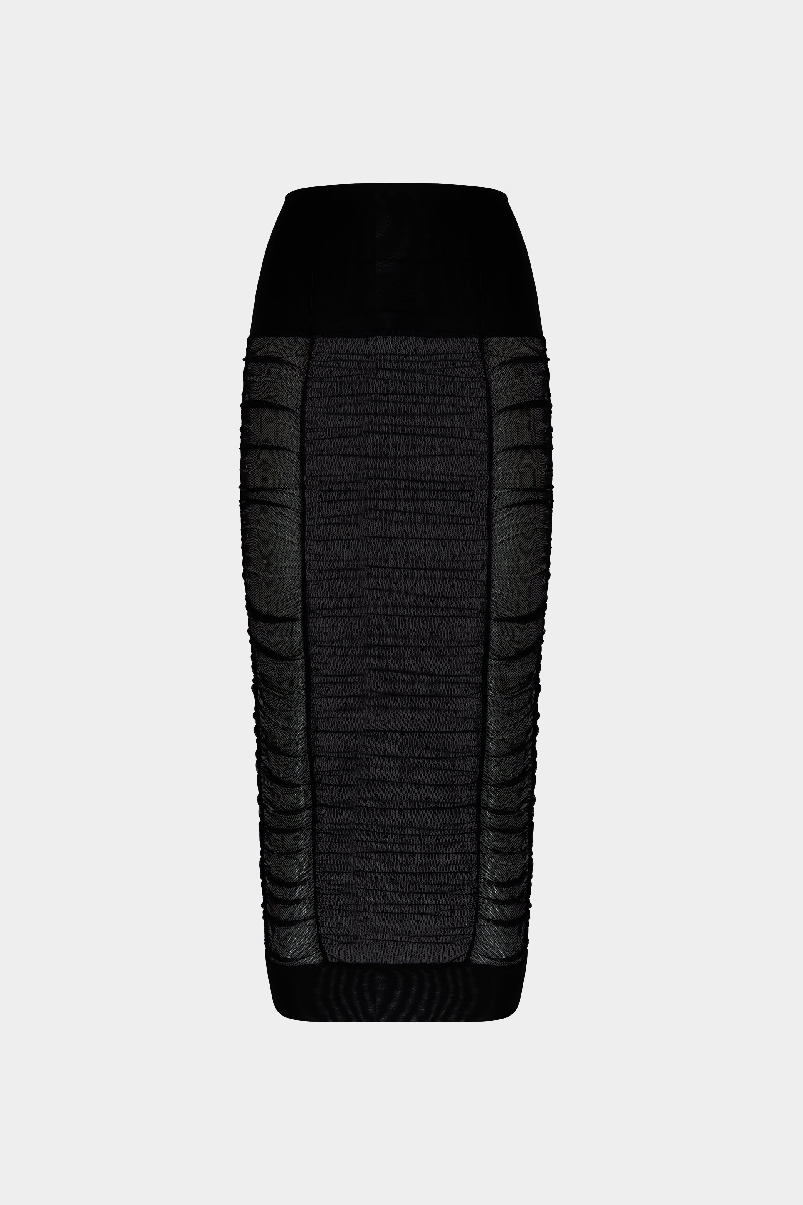 Black midi skirt in sheer polka-dot tulle with ruched detailing for a flattering, body-contouring fit. Features a semi-transparent effect with contrast paneling for a bold, modern look. Perfect for evening wear or statement styling.