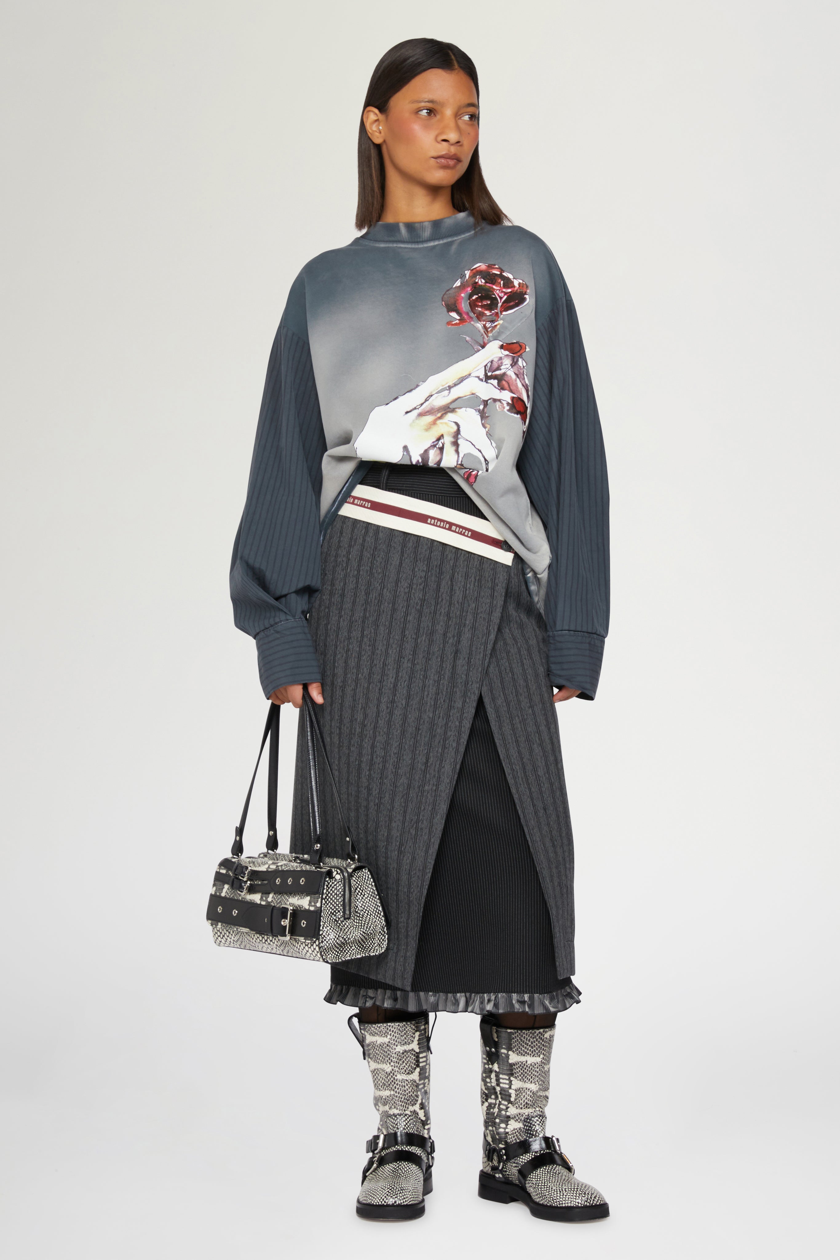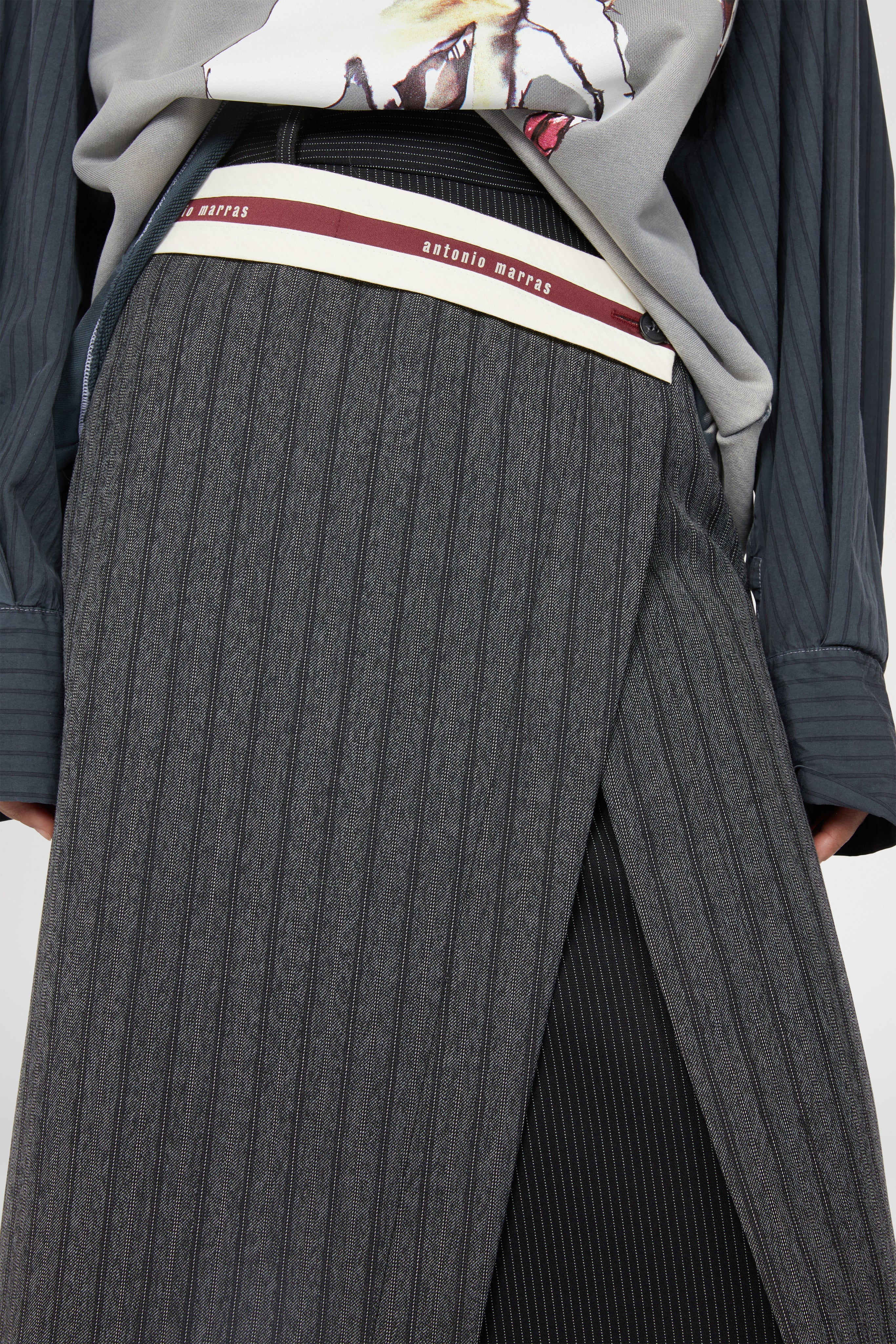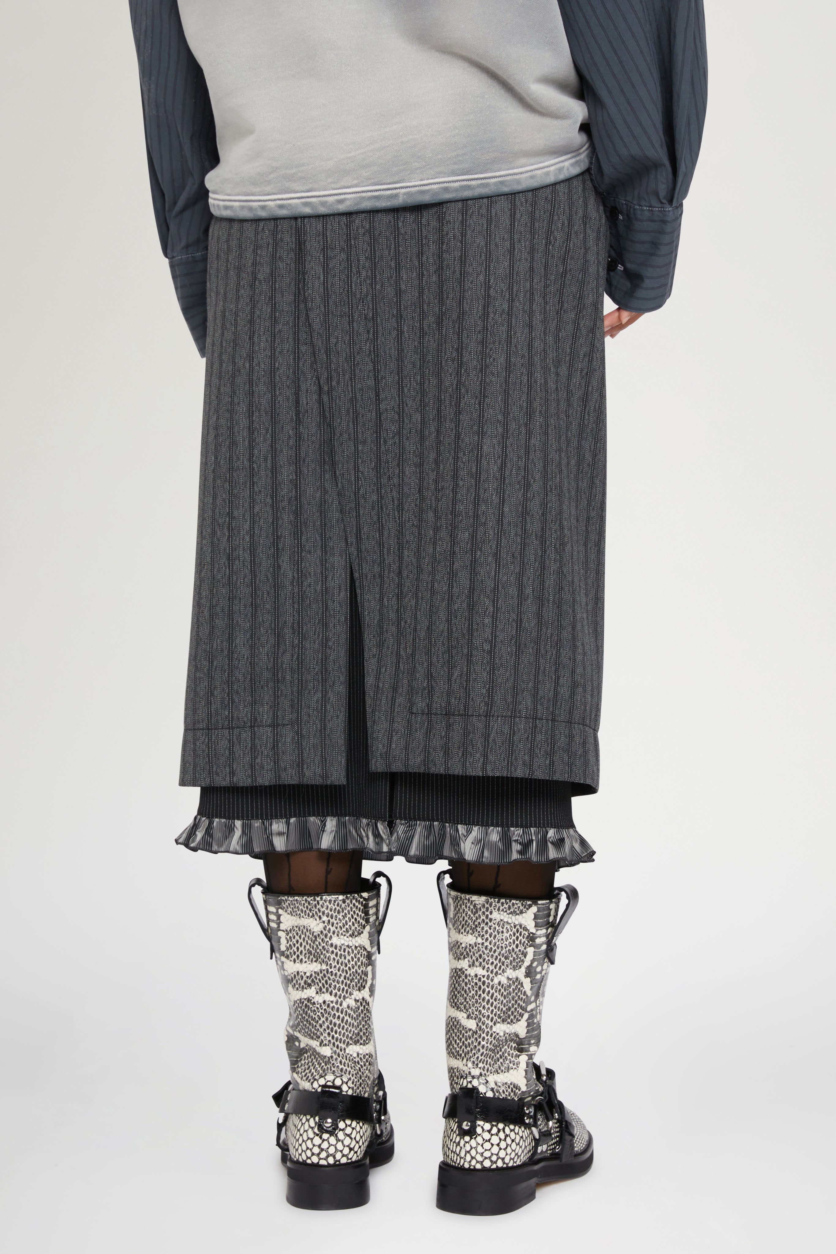 Pinstripe midi skirt with asymmetric wrap design and branded waistband. Layered construction with pleated insert and ruffled hem adds movement and contrast. A refined fusion of tailoring and contemporary edge.