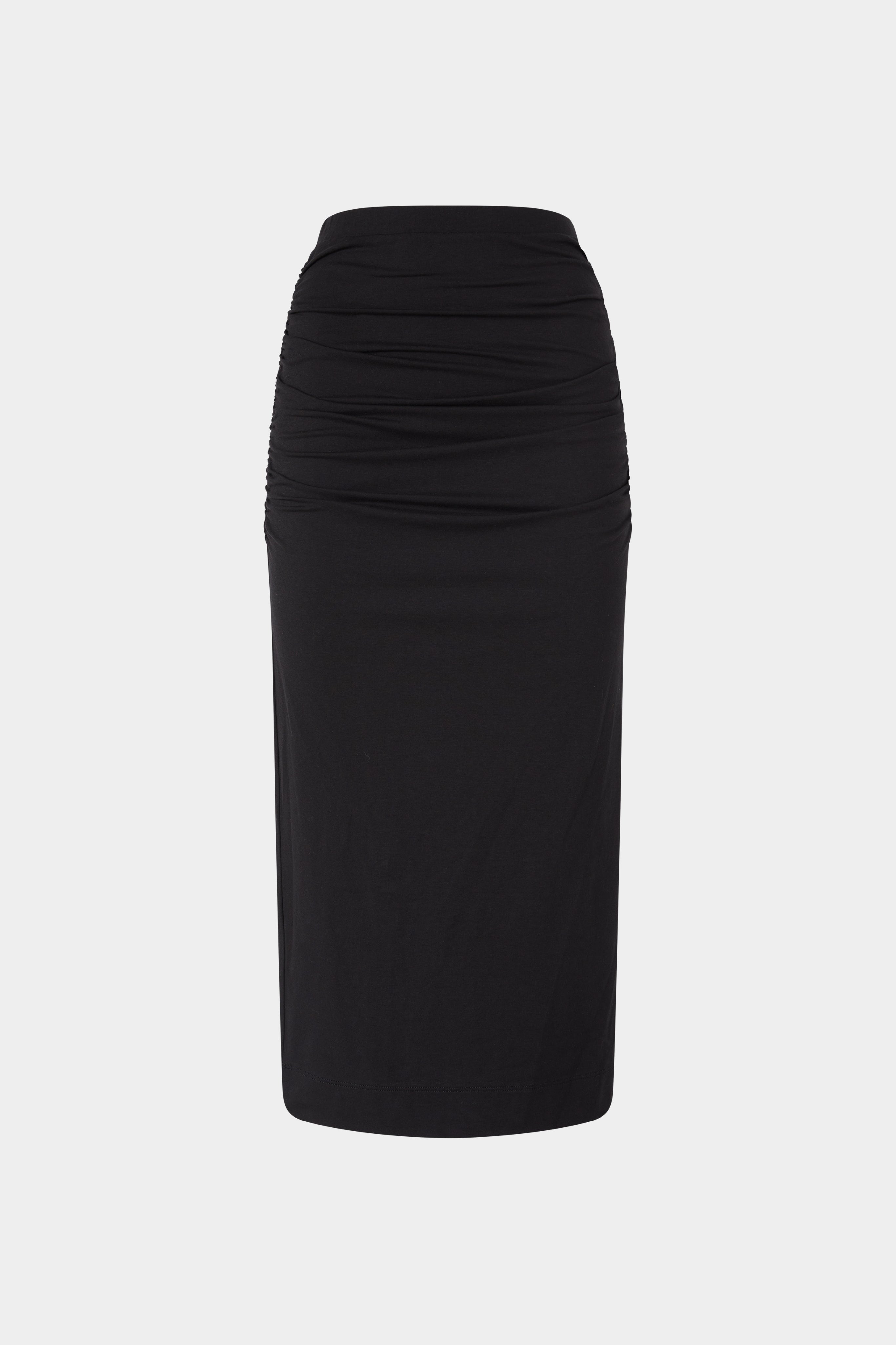 Fitted jersey midi skirt in black color, designed to gently hug the silhouette.