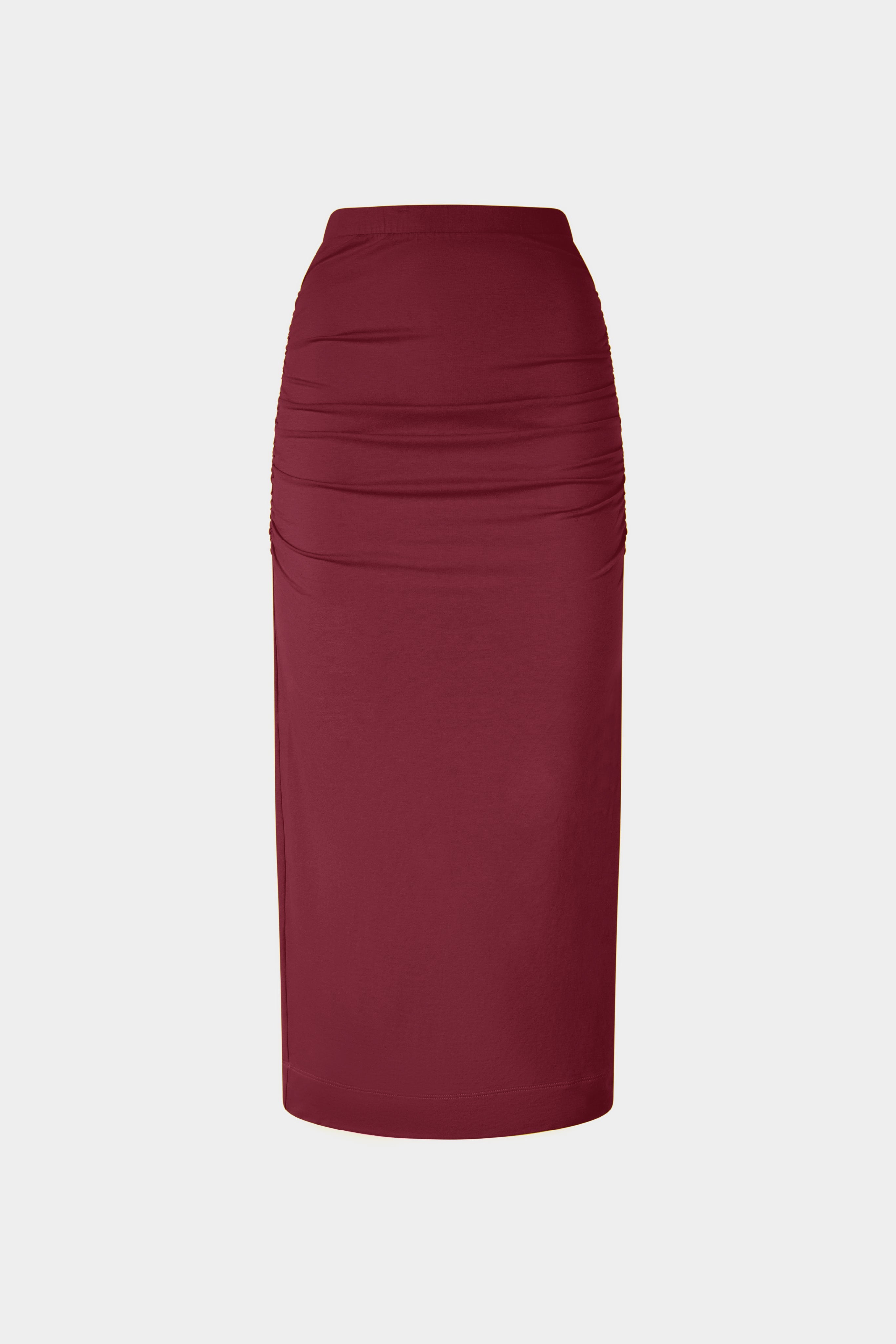 Fitted jersey midi skirt in bordeaux color, designed to gently hug the silhouette.