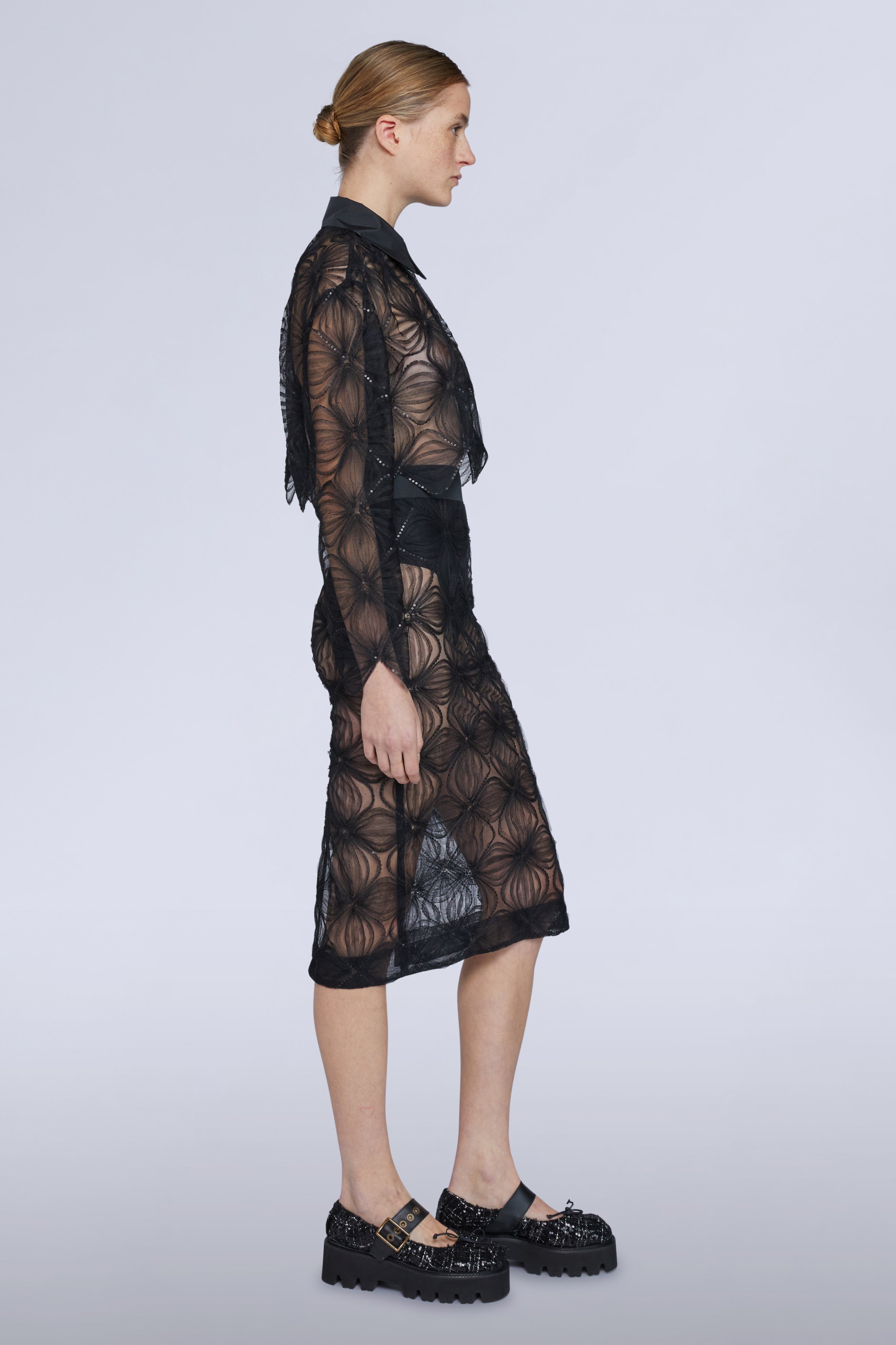 • Fitted midi skirt crafted from black lace with a sheer finish. Comes with a black silk lining.