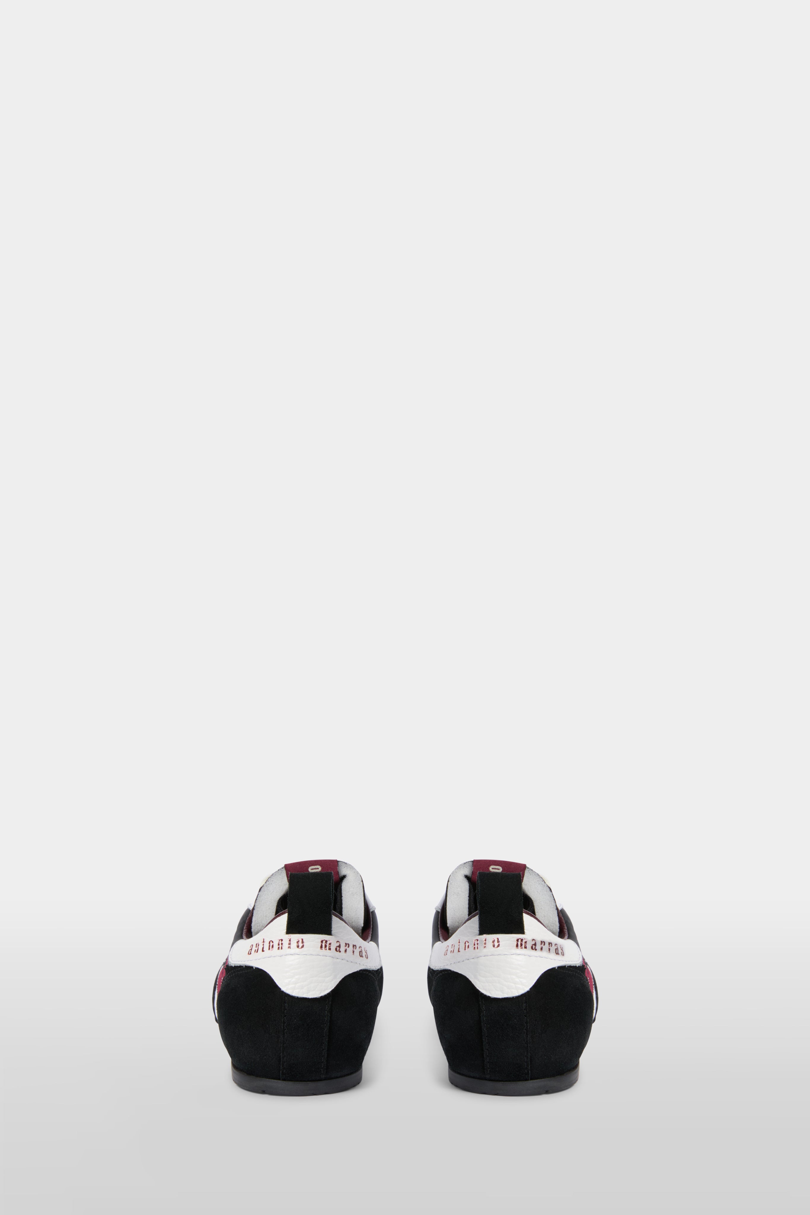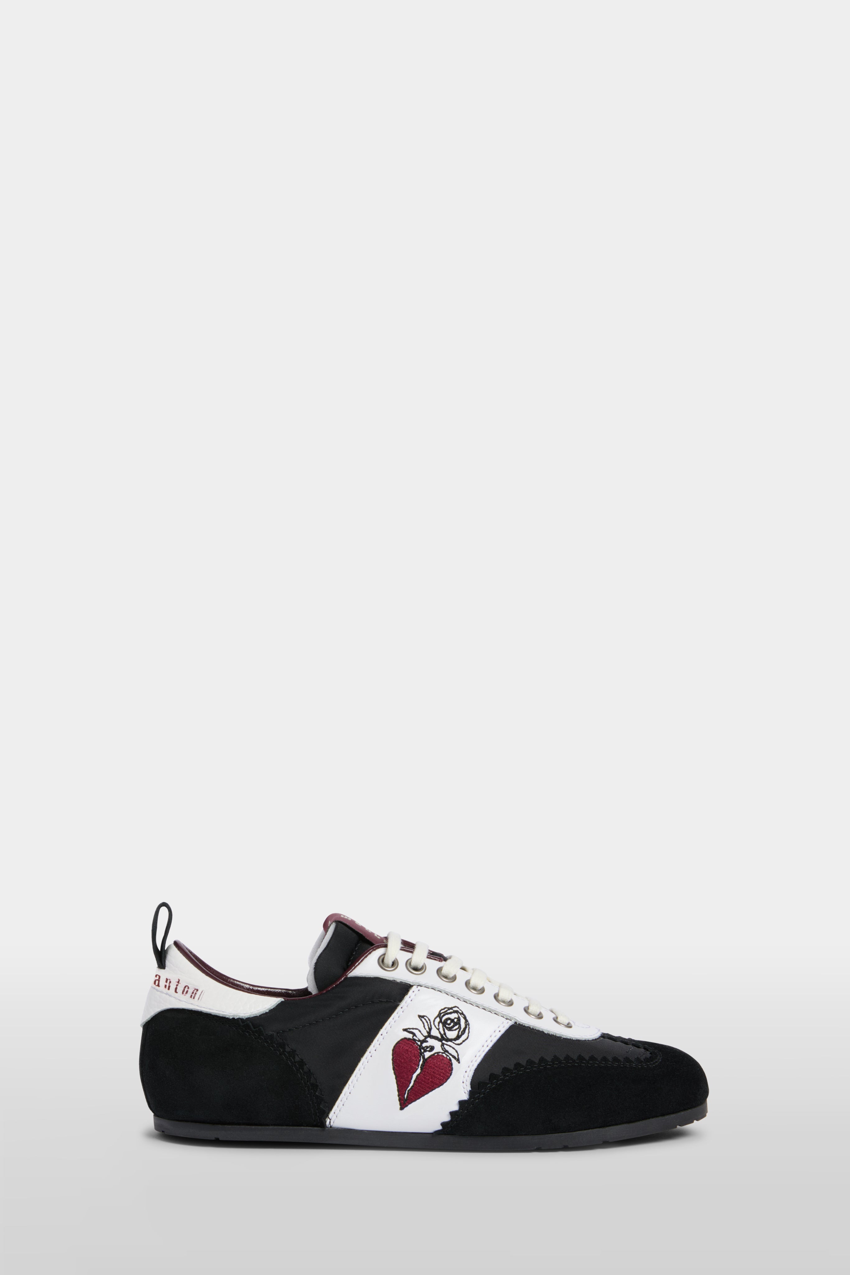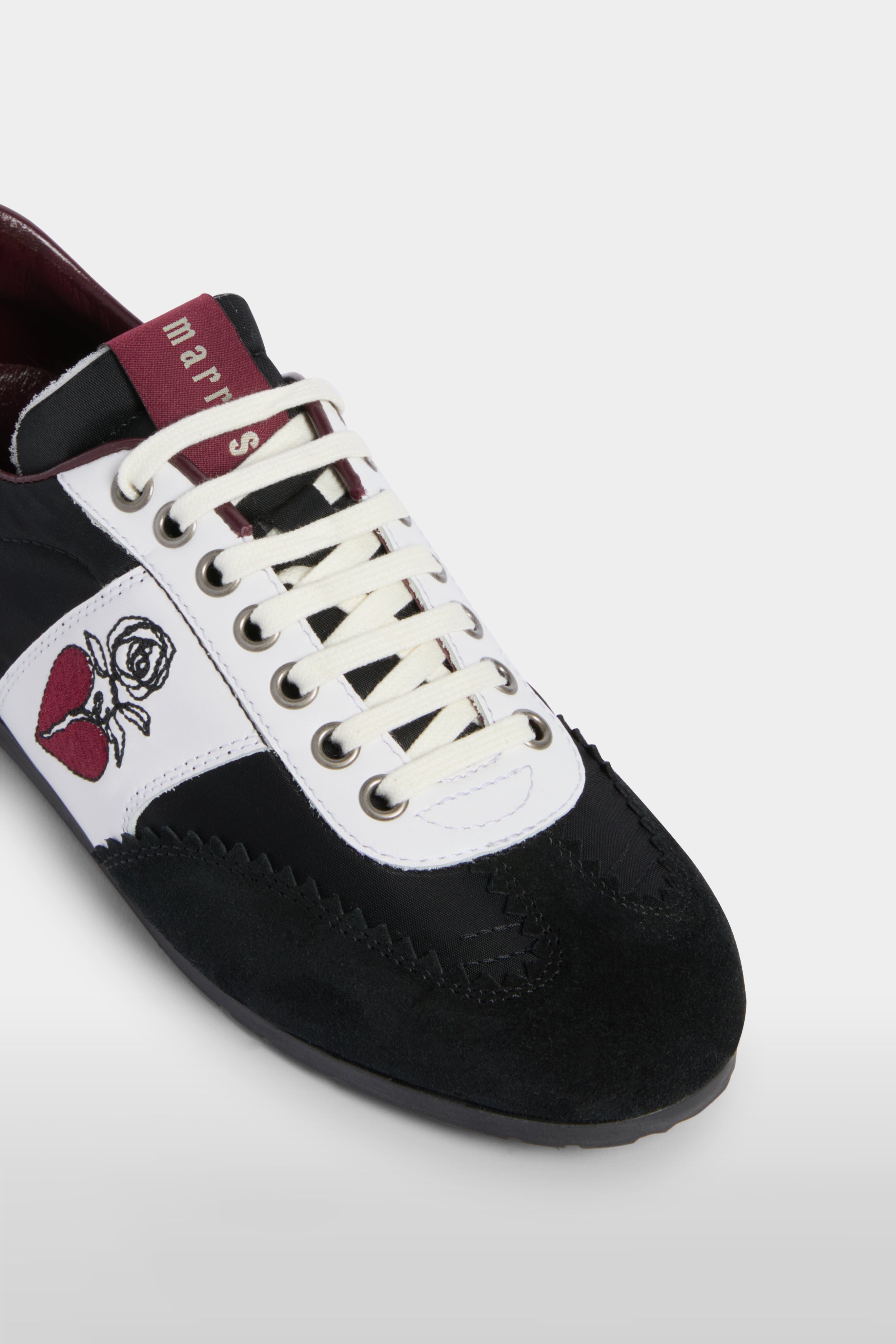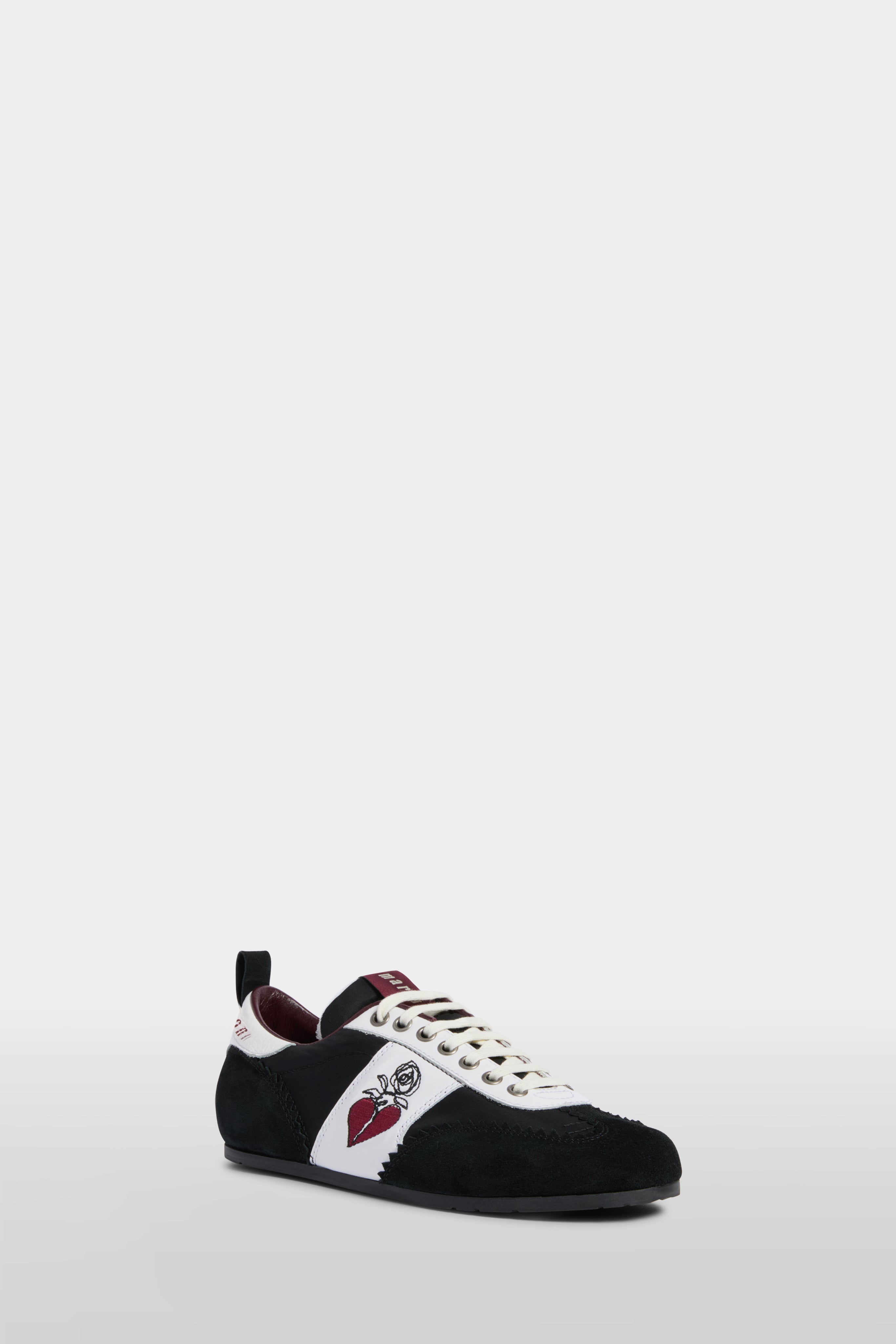 Unisex sneakers in black leather inspired by ’70s running shoes, reinterpreted with urban energy and a pop spirit. Lightweight and authentic, designed for moving with freedom and character. The embroidered heart from which a rose blooms tells a story of rebirth and passion, the signature symbol and soul of Antonio Marras.