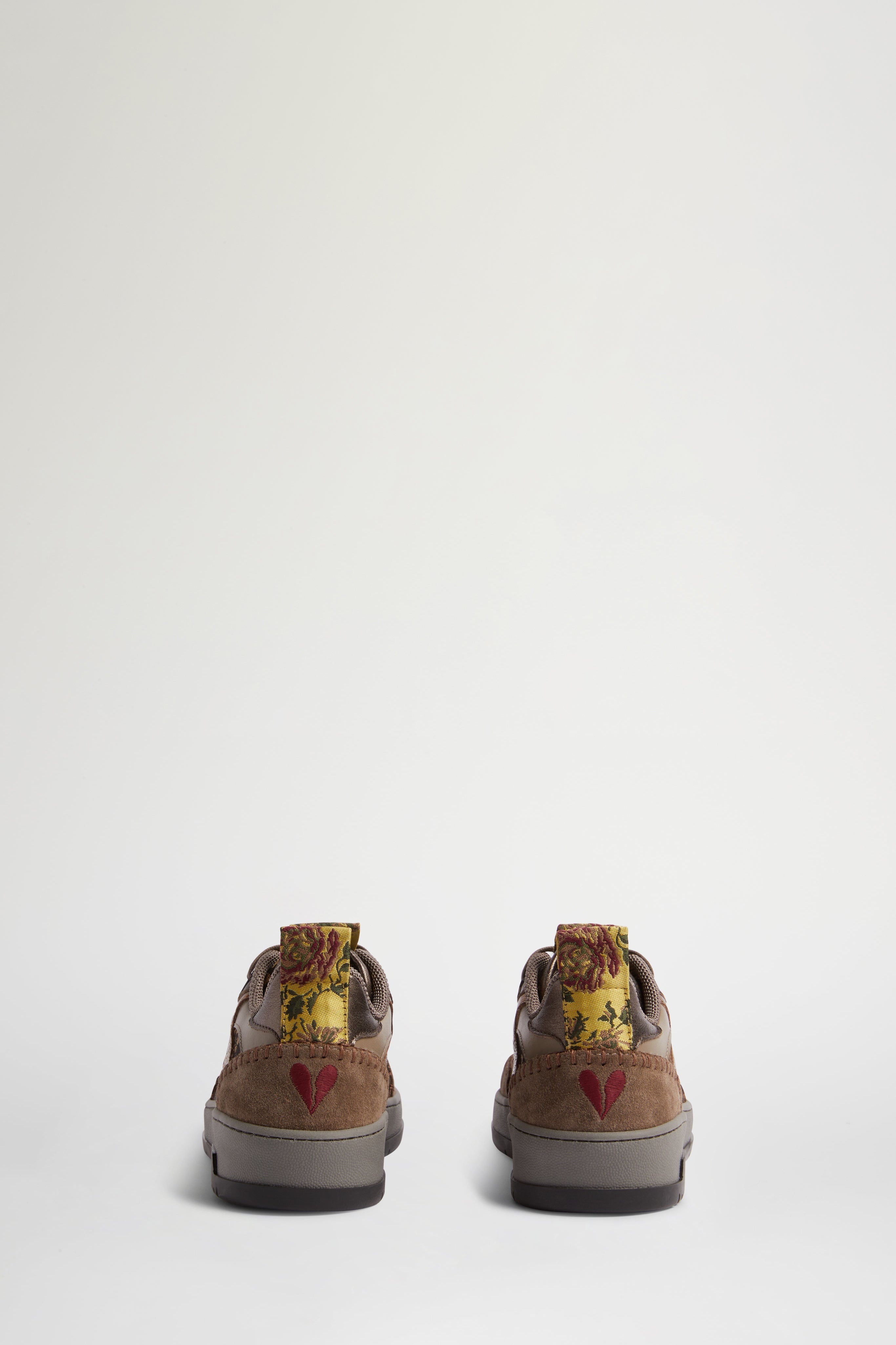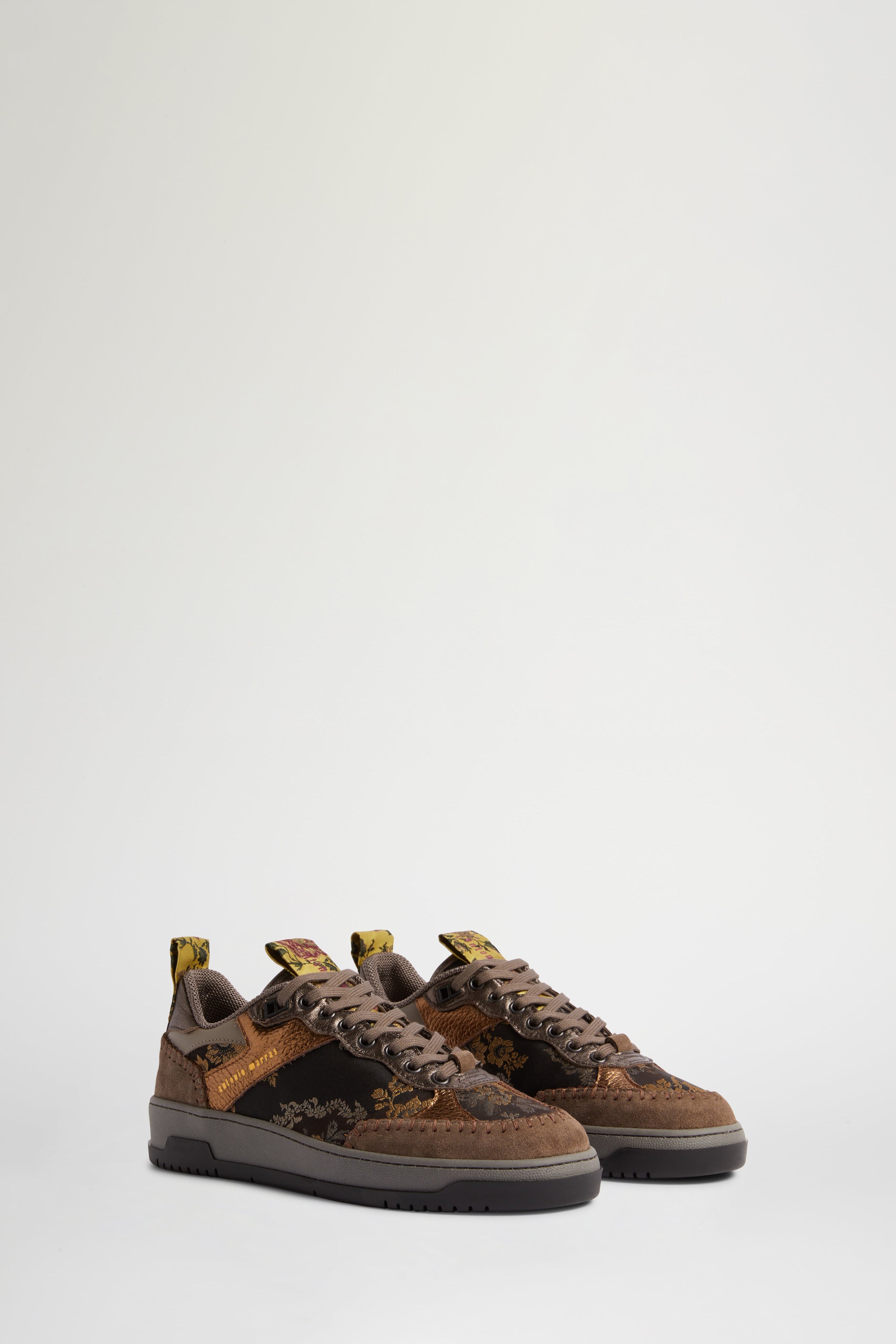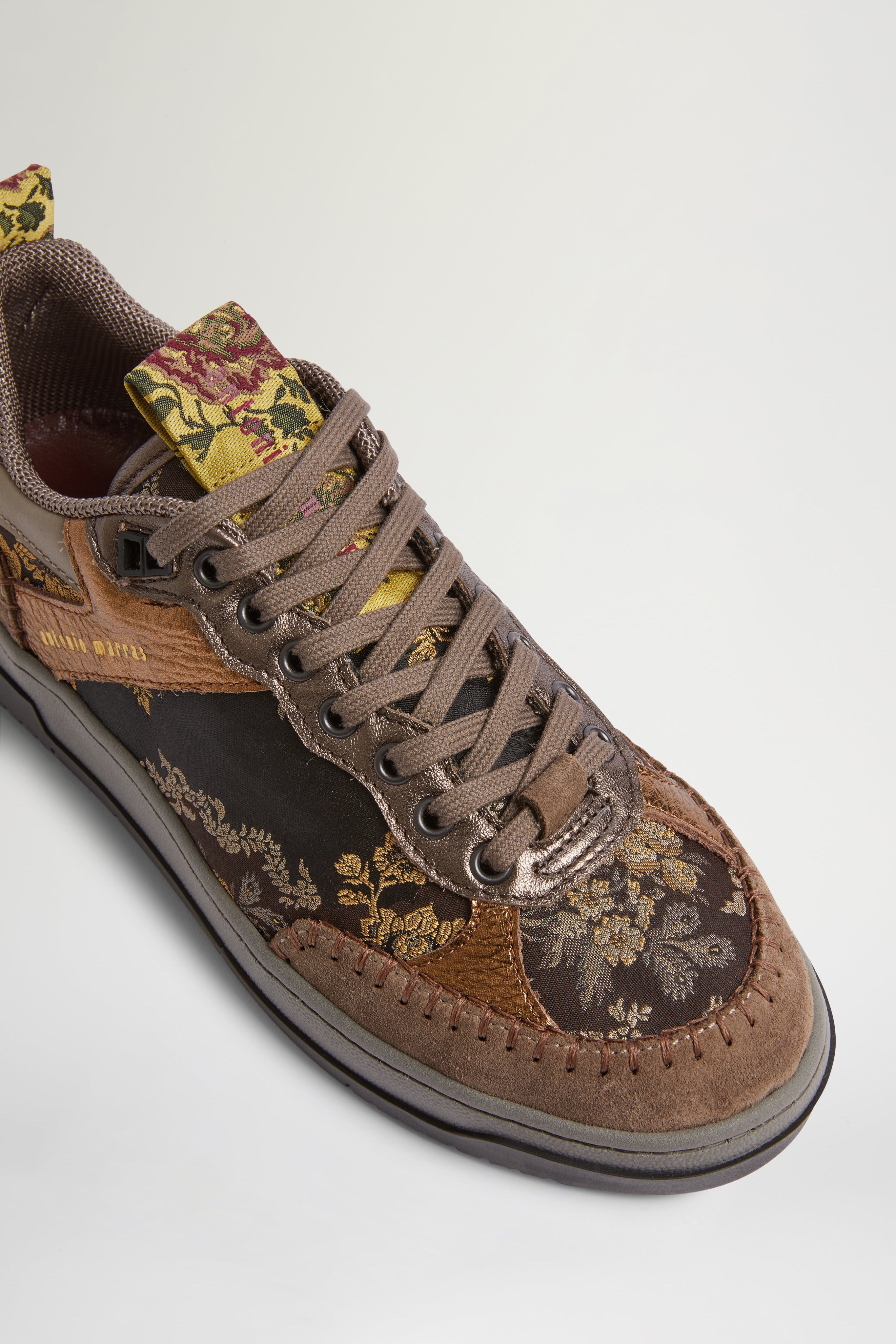 • Women's low-top sneakers with jacquard brocade panels and metallic leather inserts. An eclectic, luxe take on casual footwear with artisanal flair.