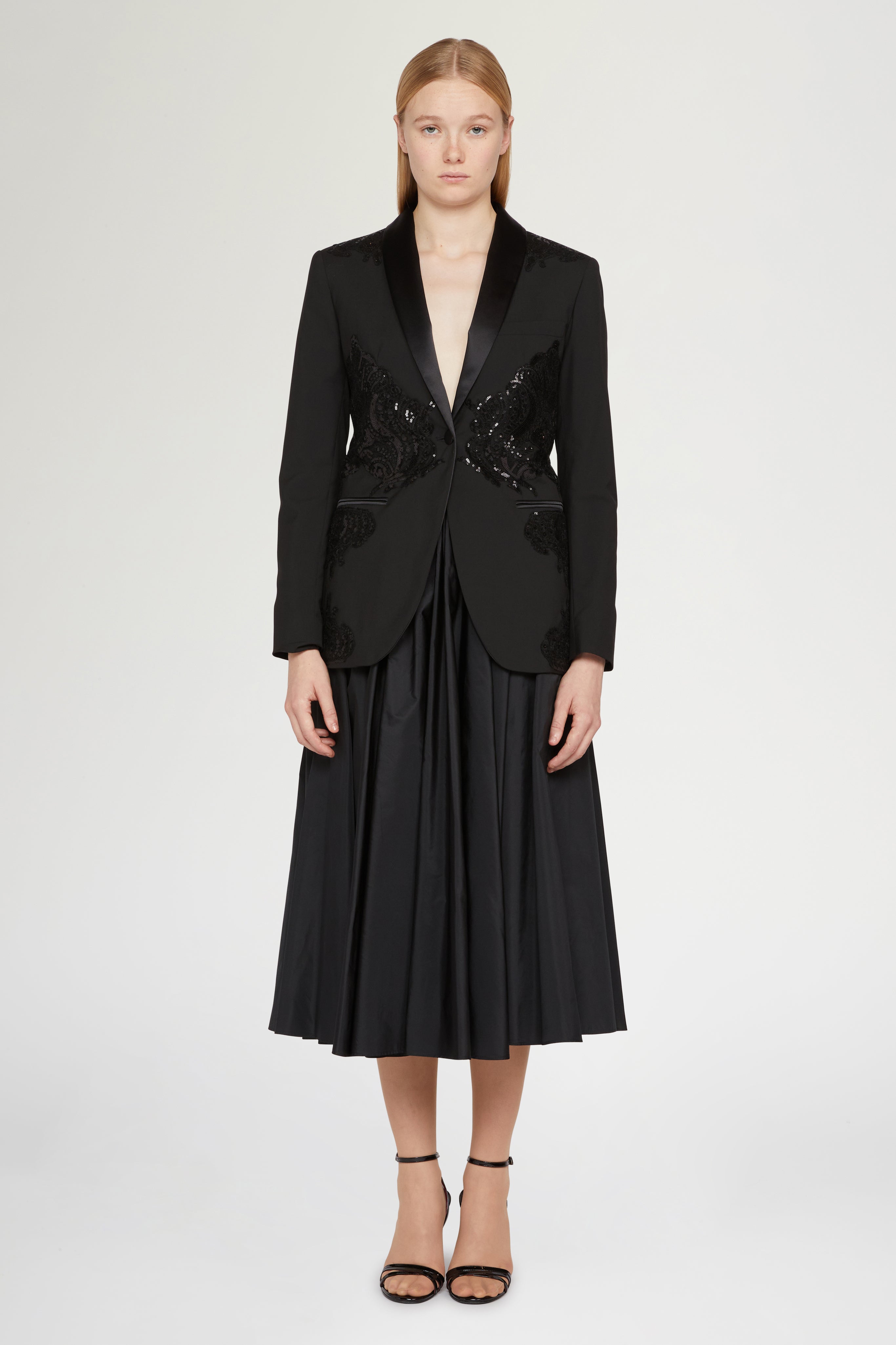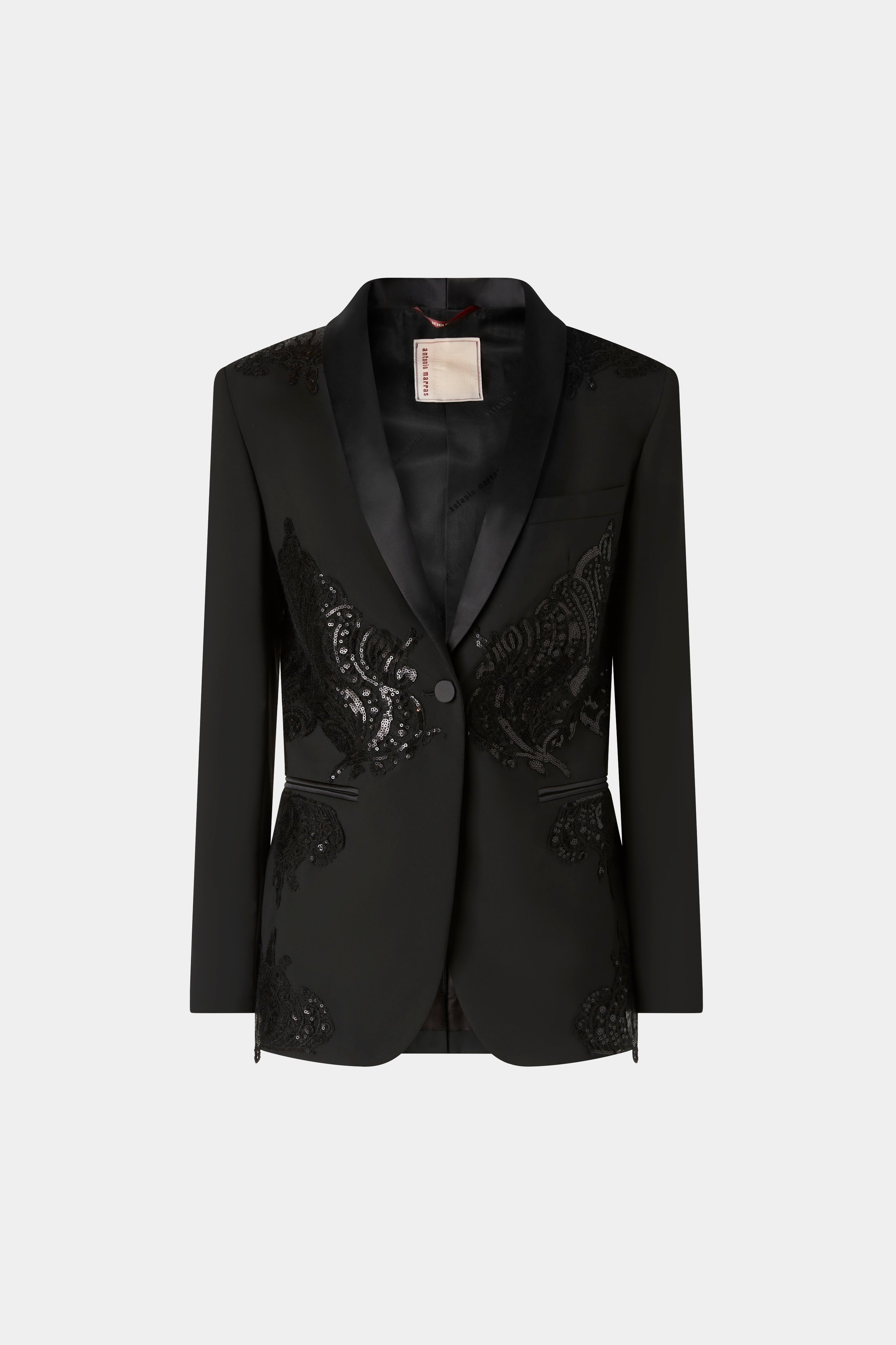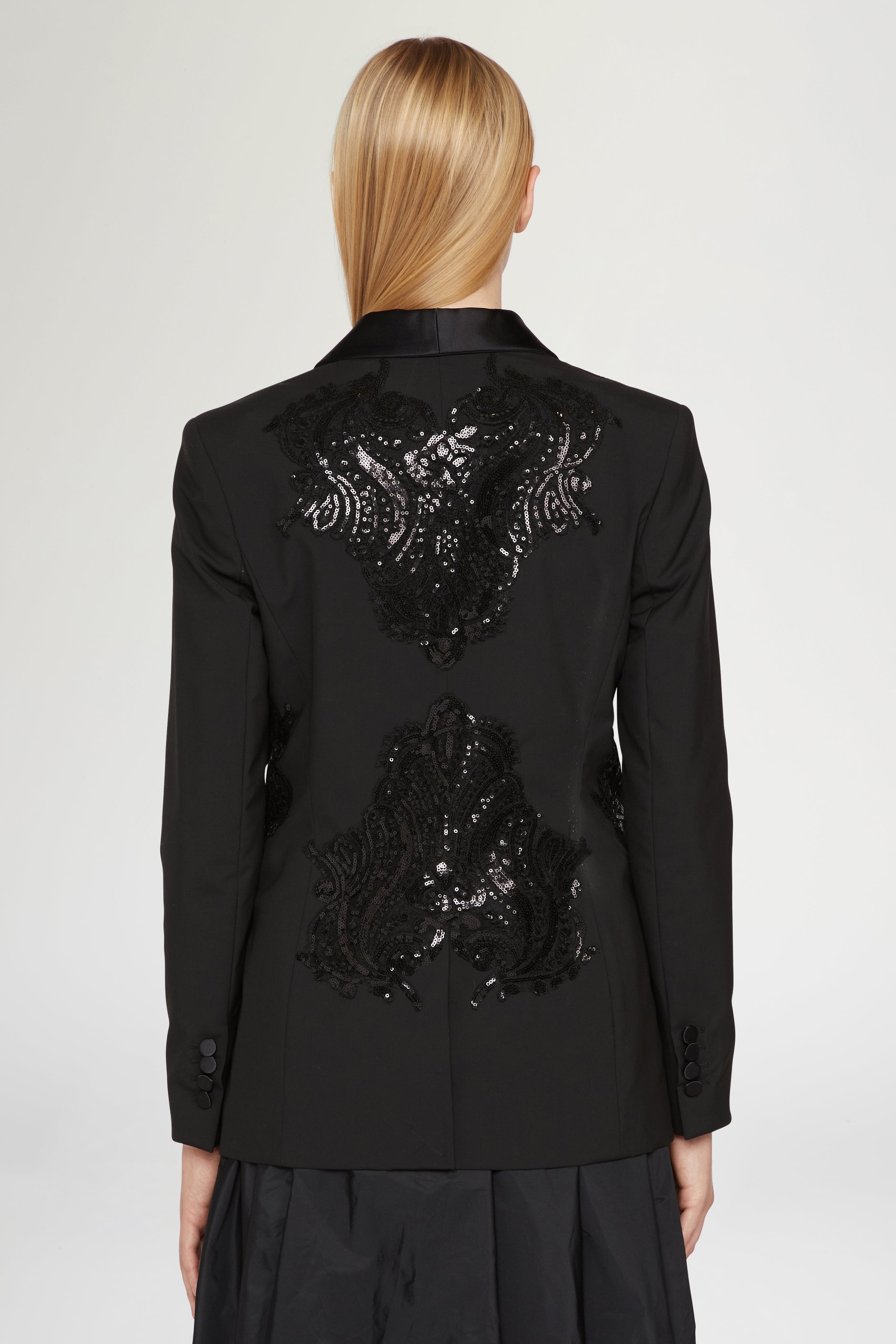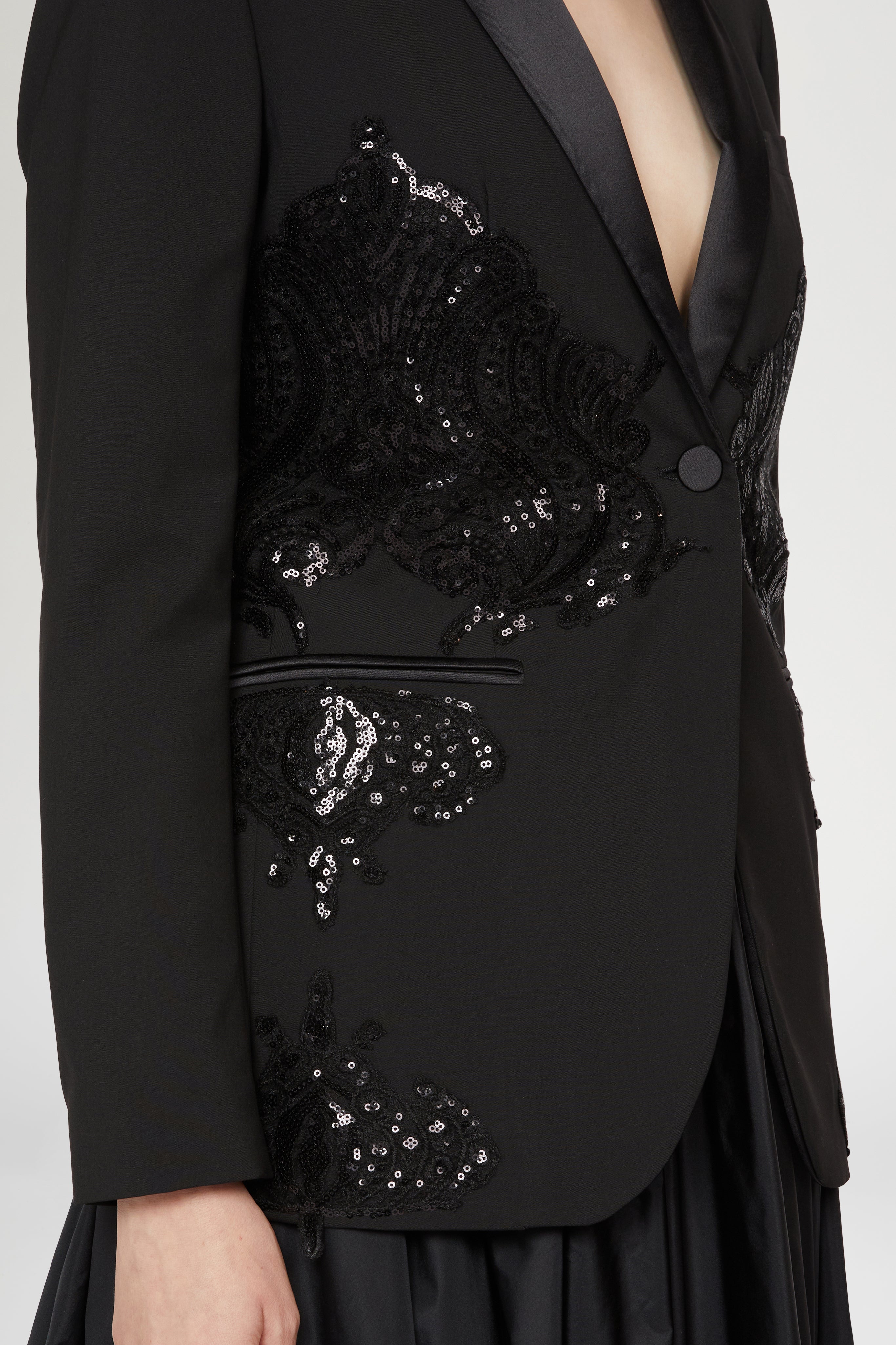 • Elegant black tailored jacket with satin lapels, adorned with intricate sequin-embellished lace appliqués.