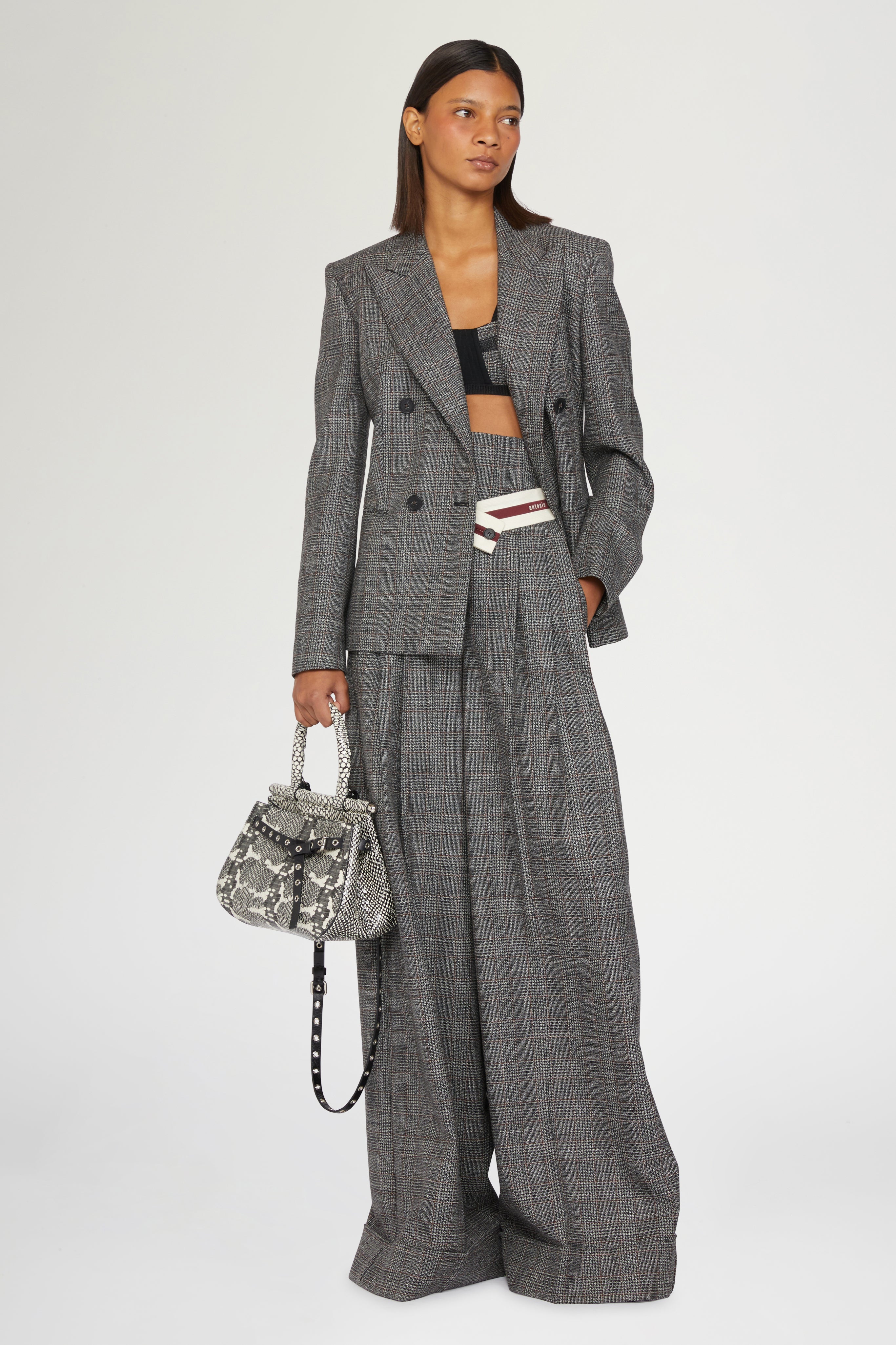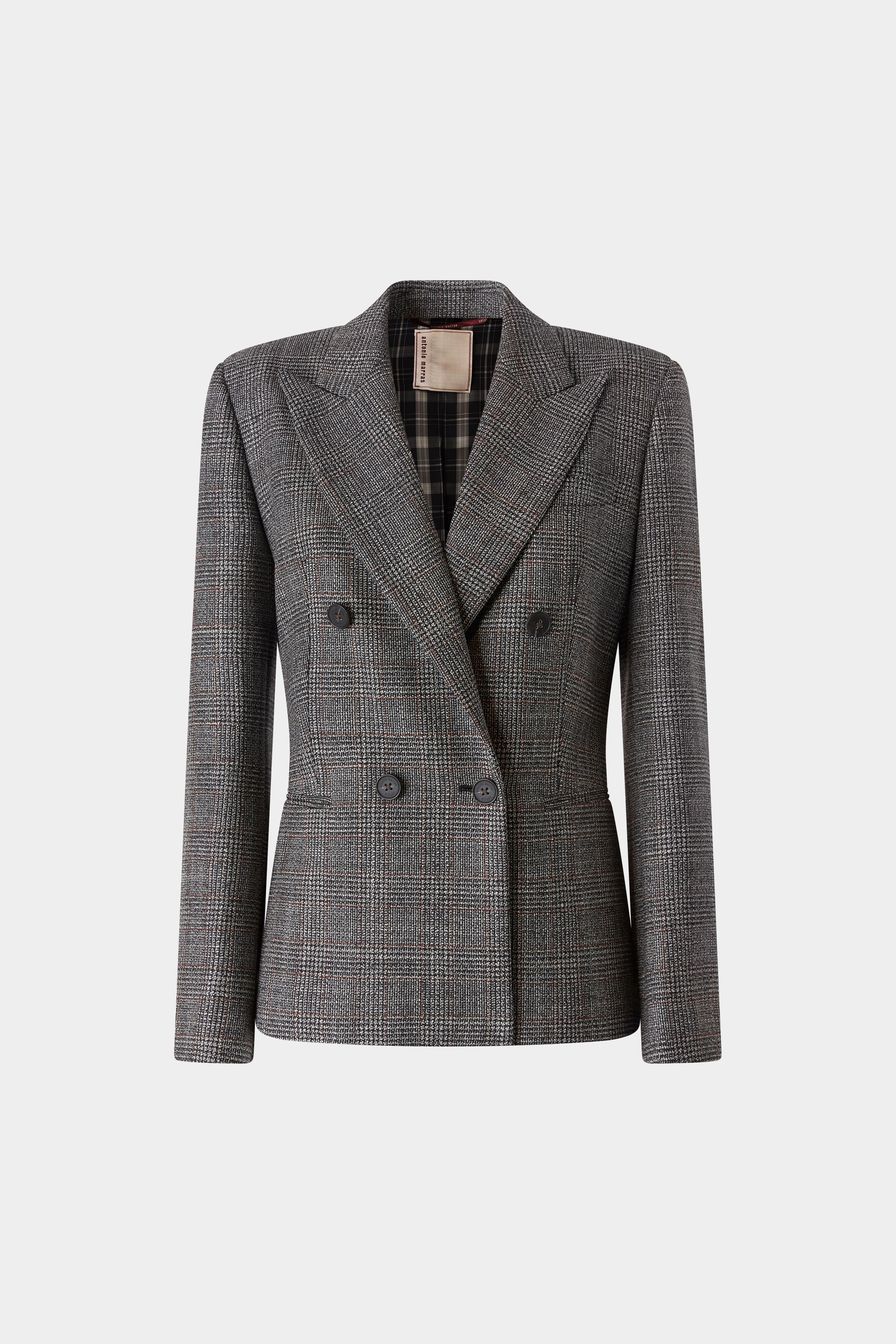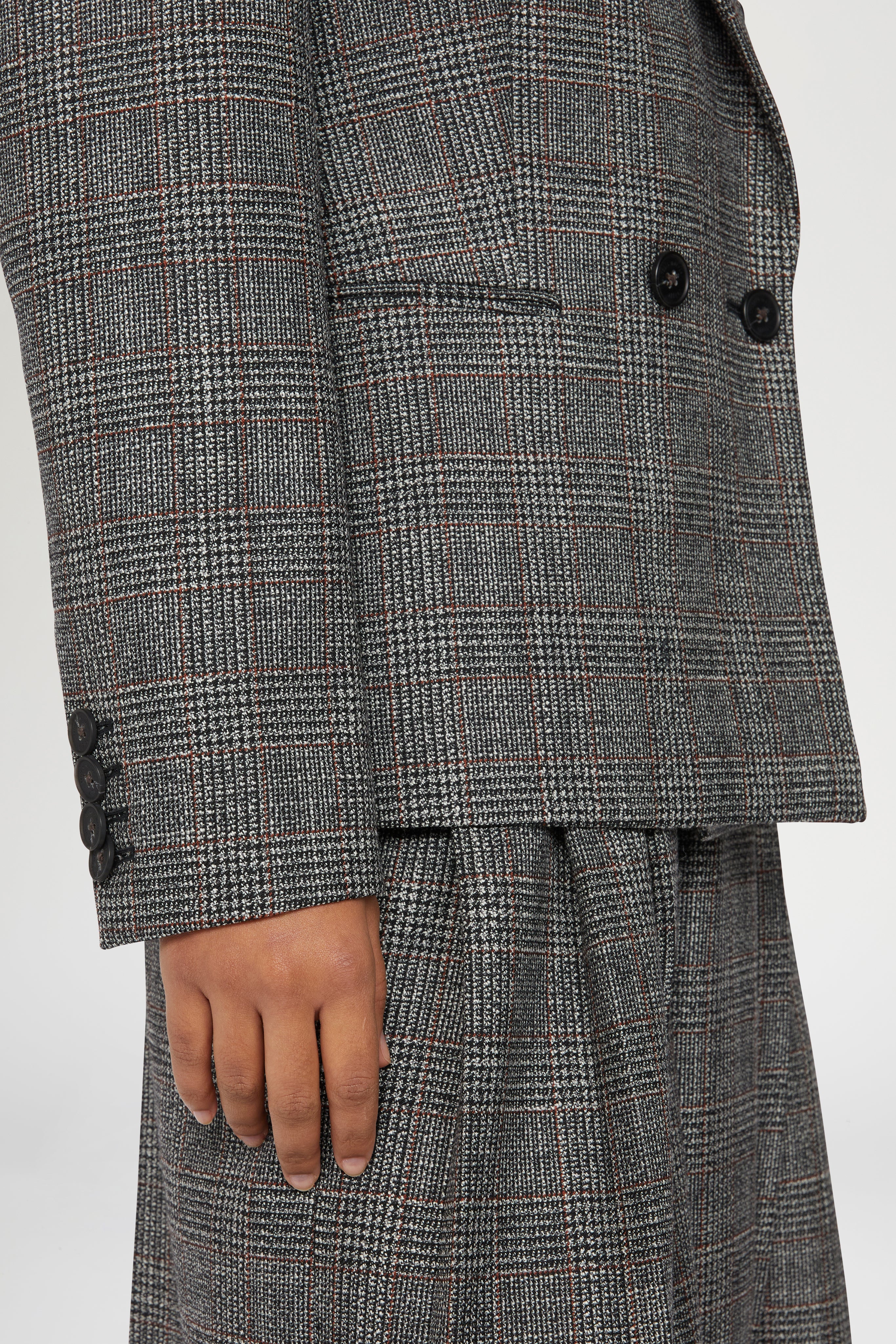 • This tailored Prince of Wales blazer is crafted from 100% virgin wool, featuring a double-breasted design and a structured, slim fit.